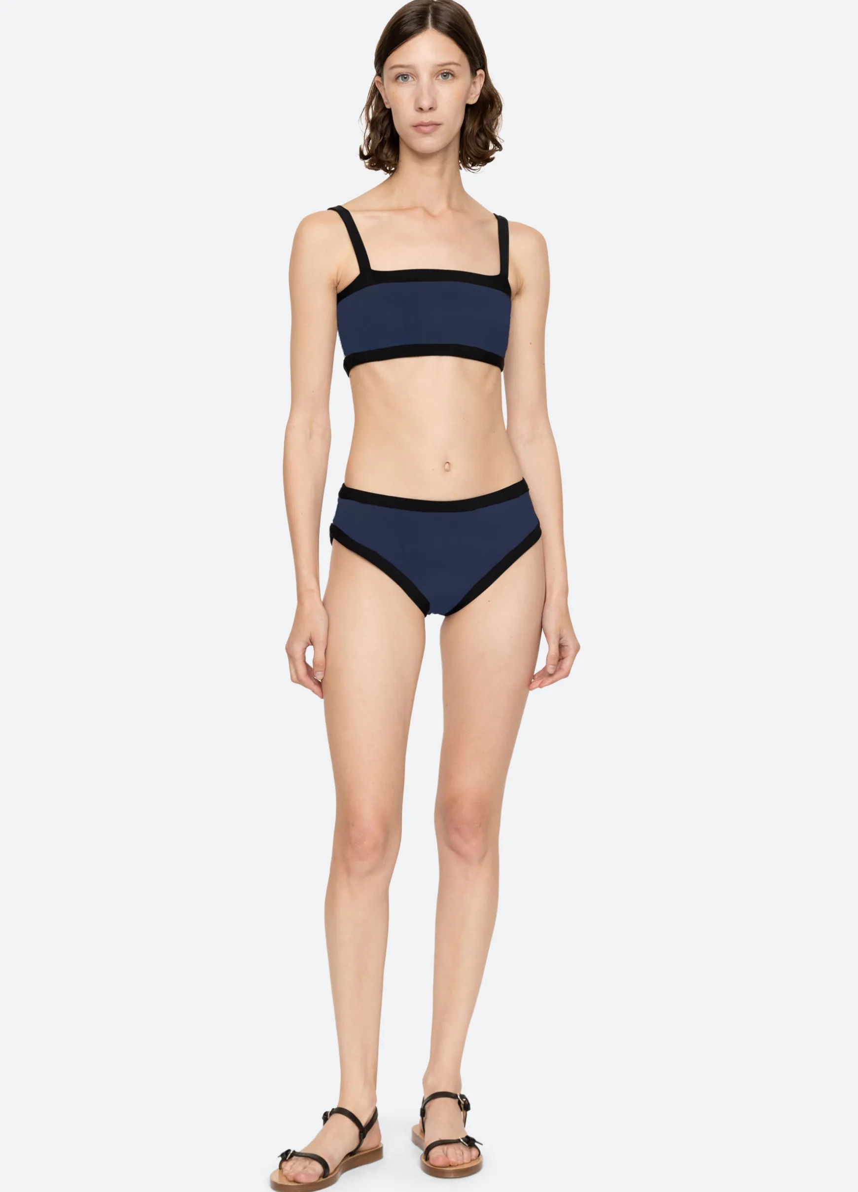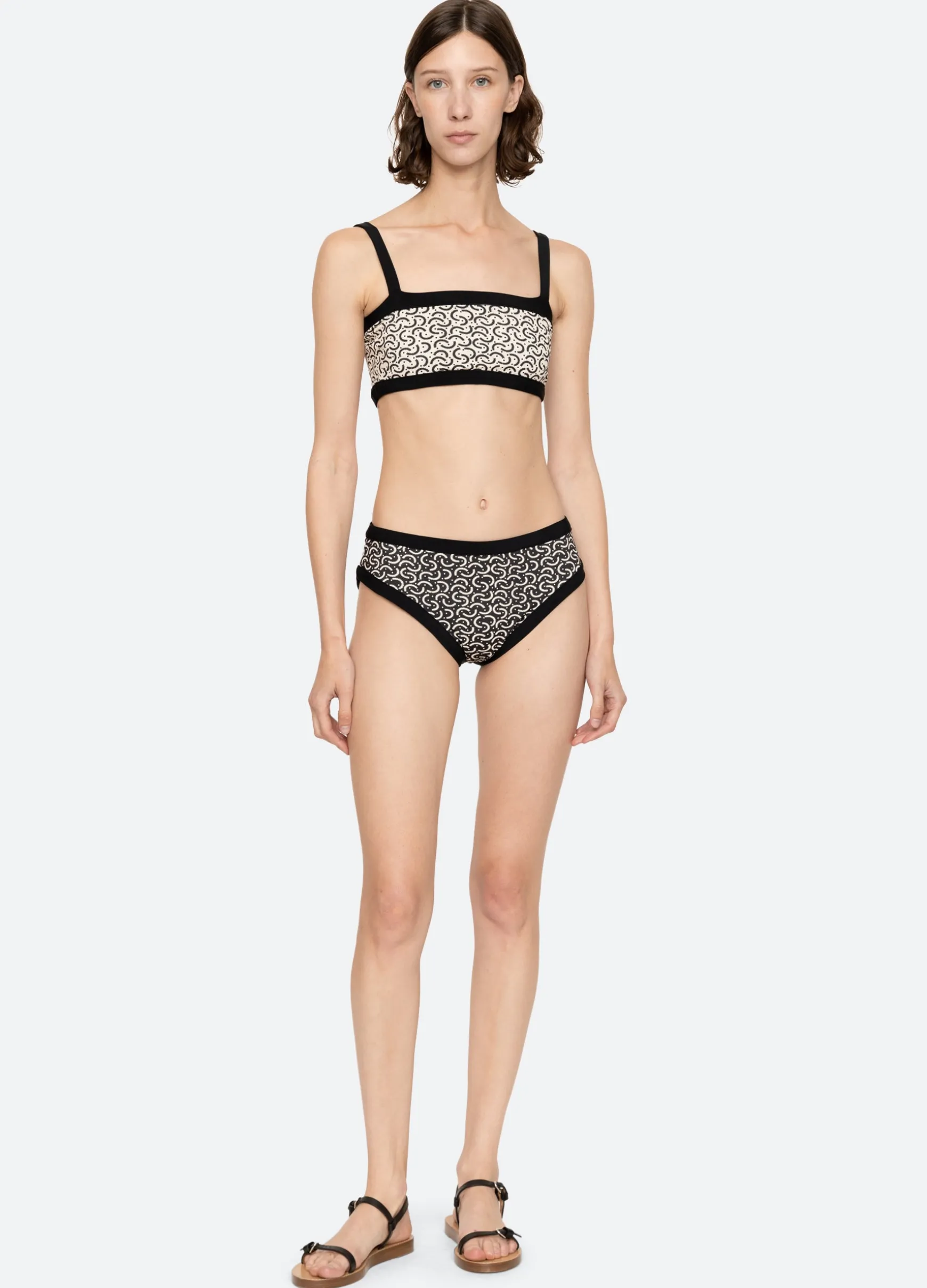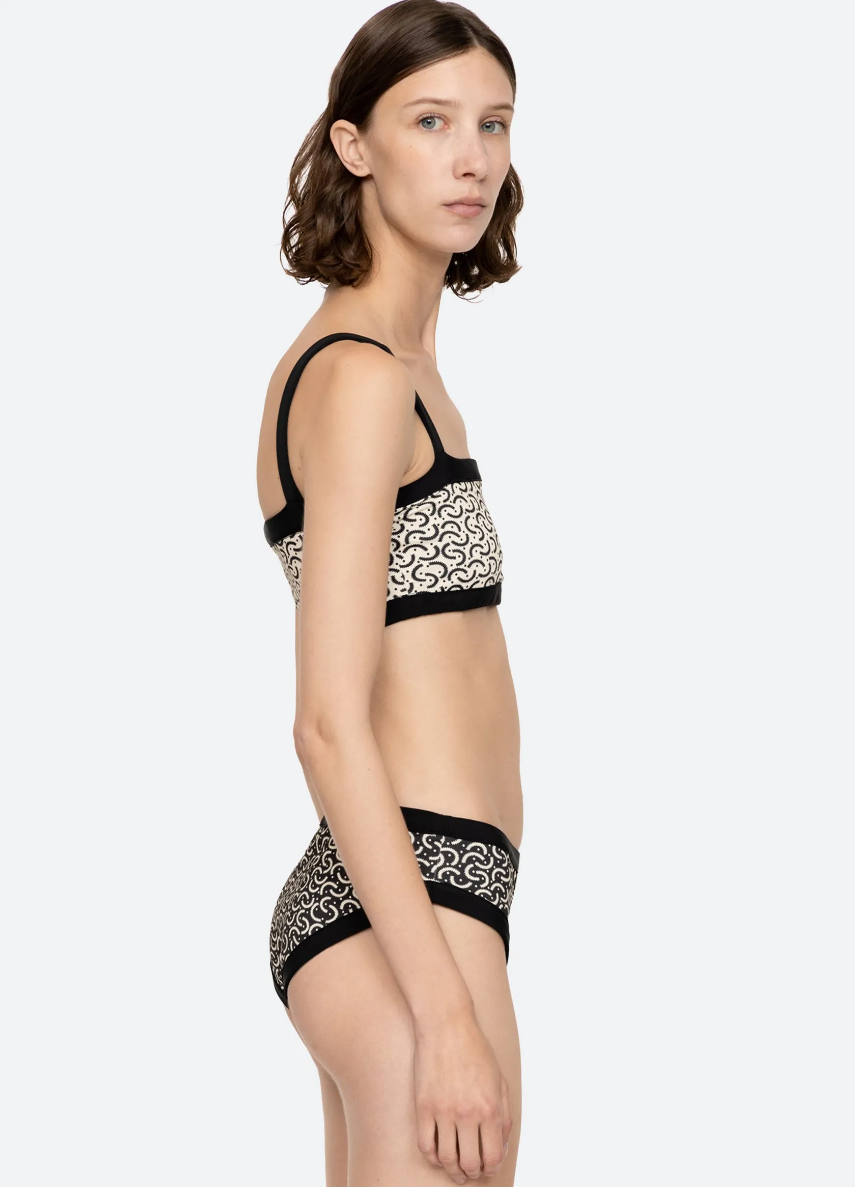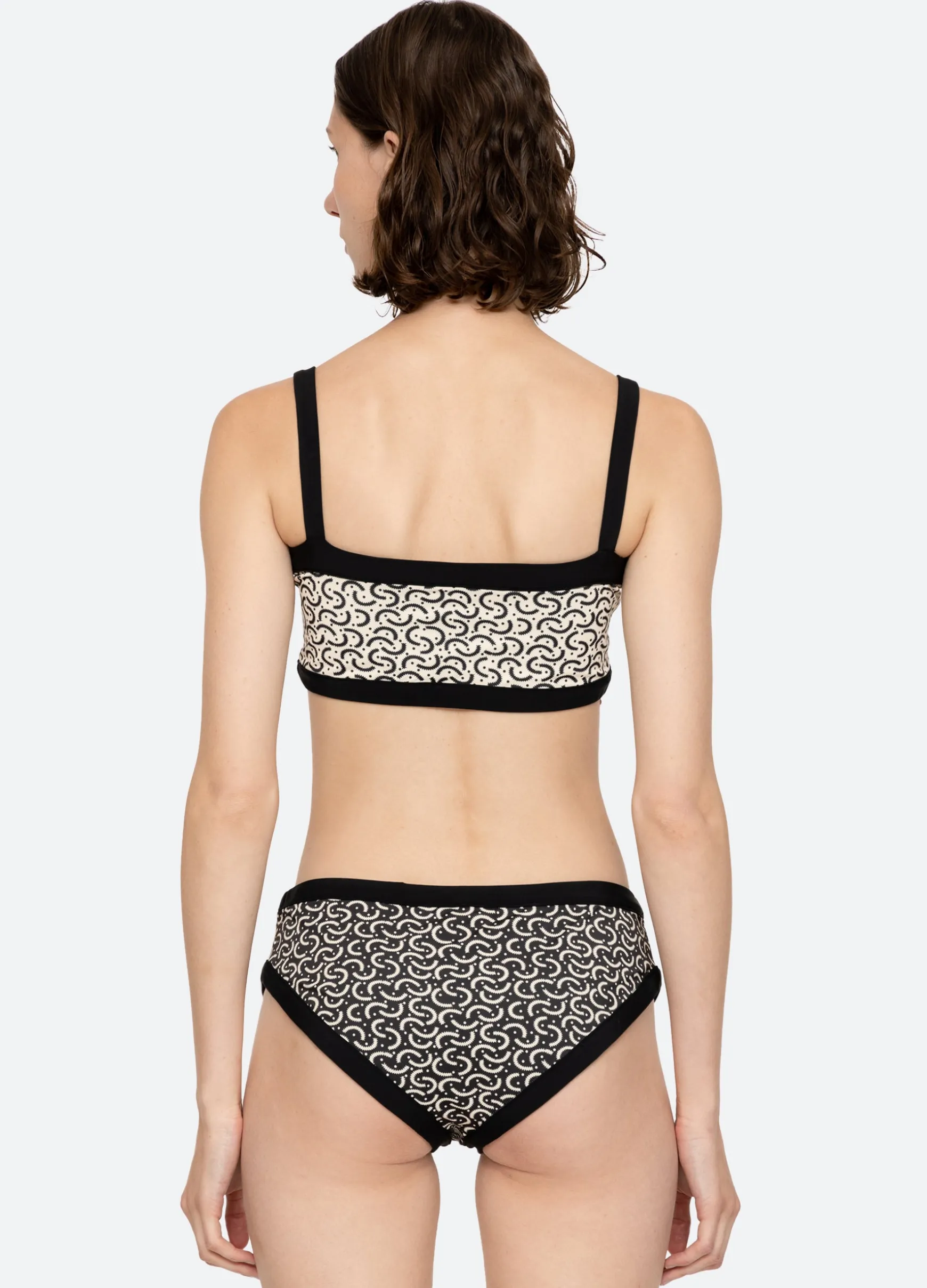 The Panna reversible bikini top features a contrasting border and a geometric print that reverses into a solid.