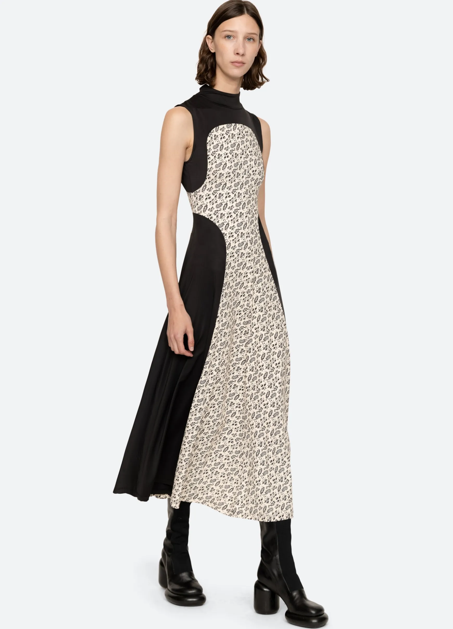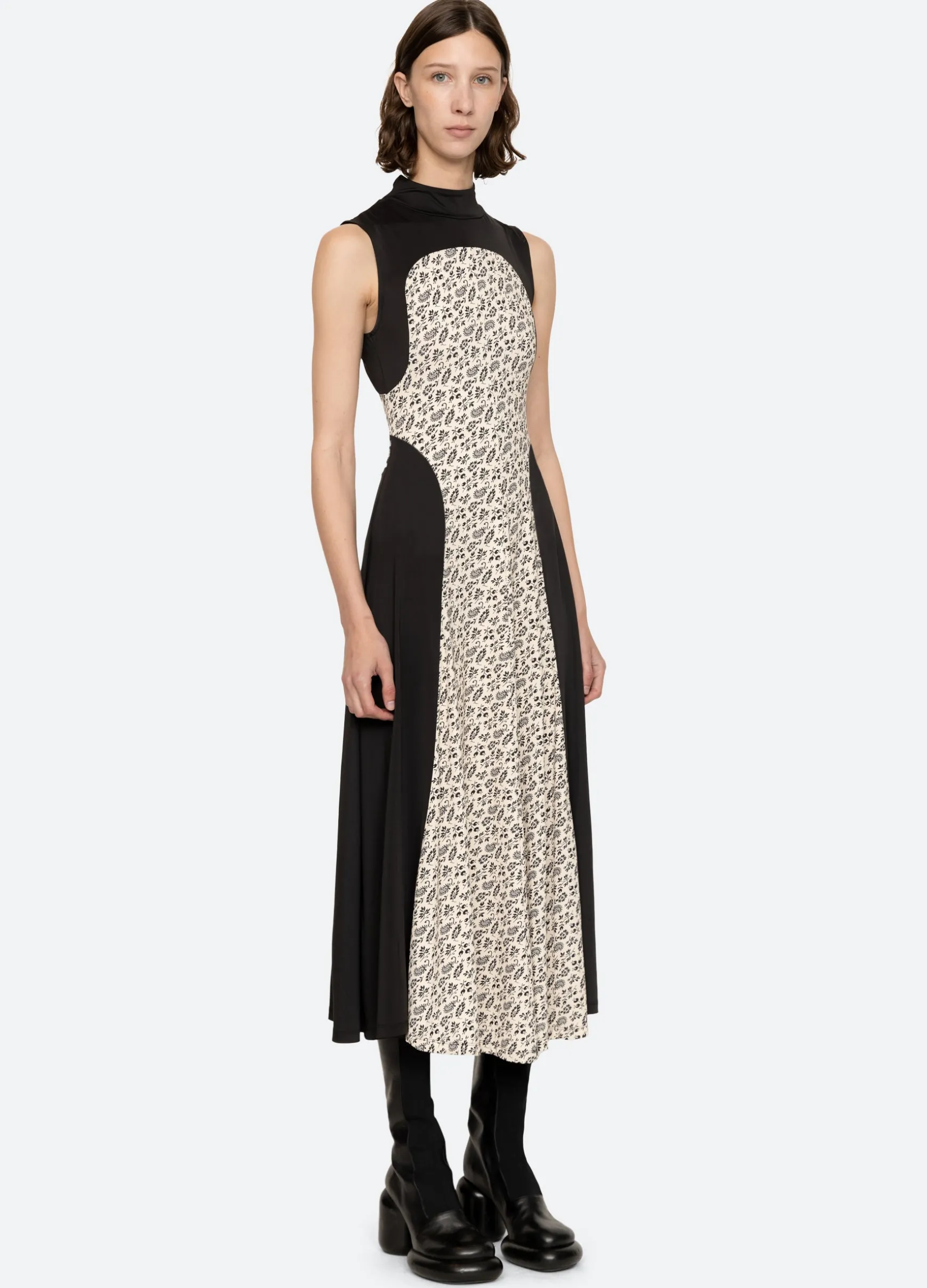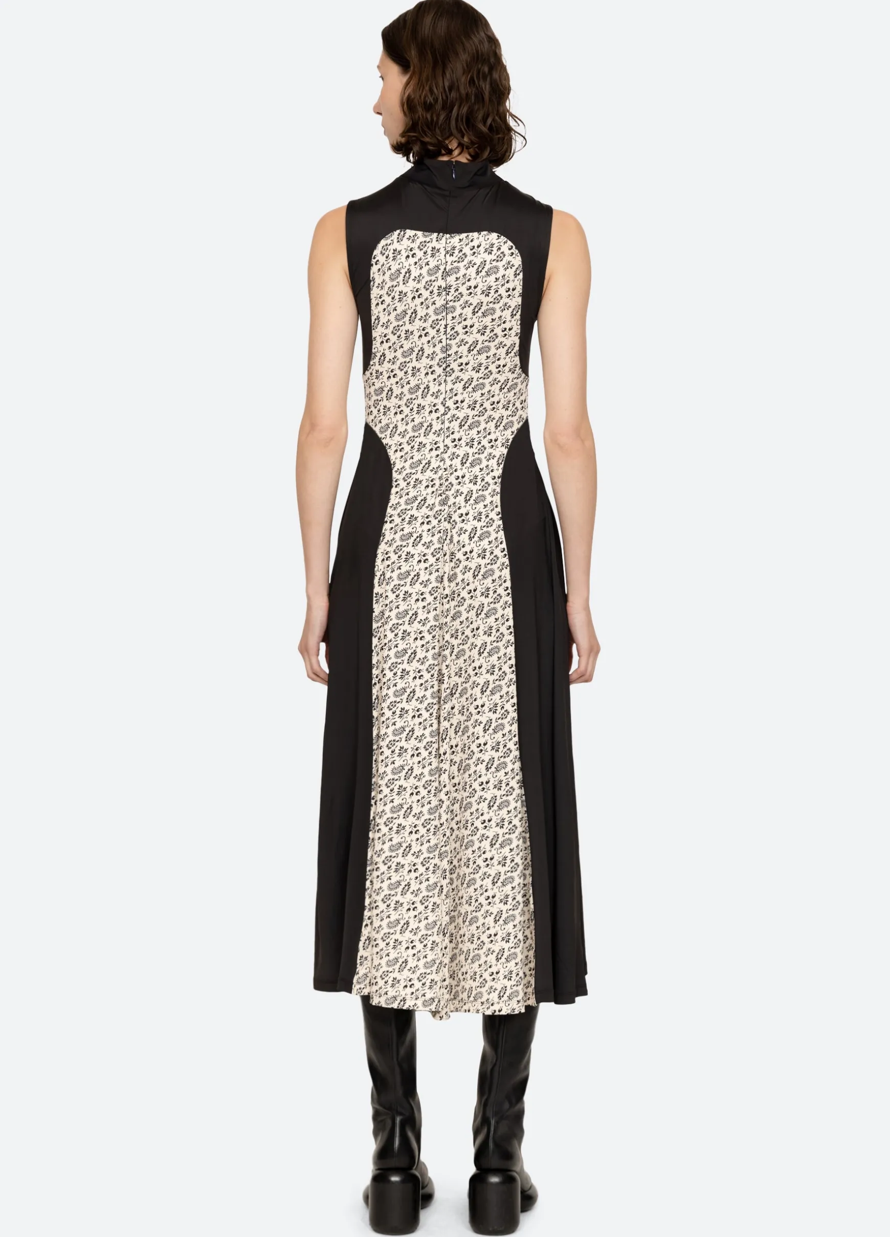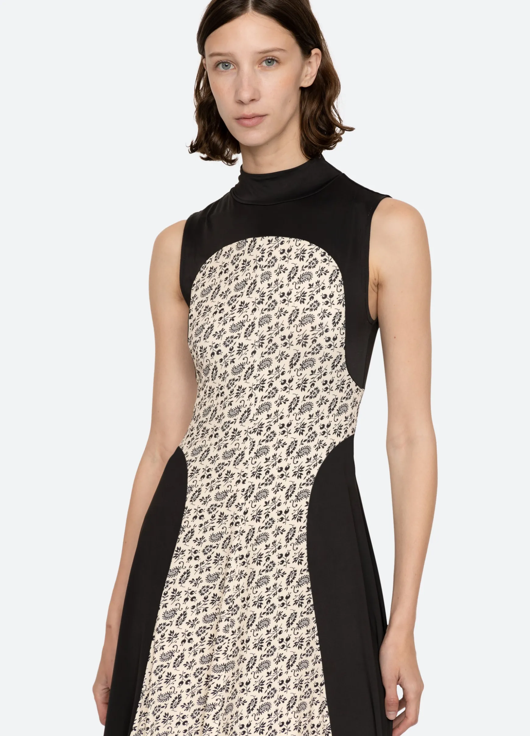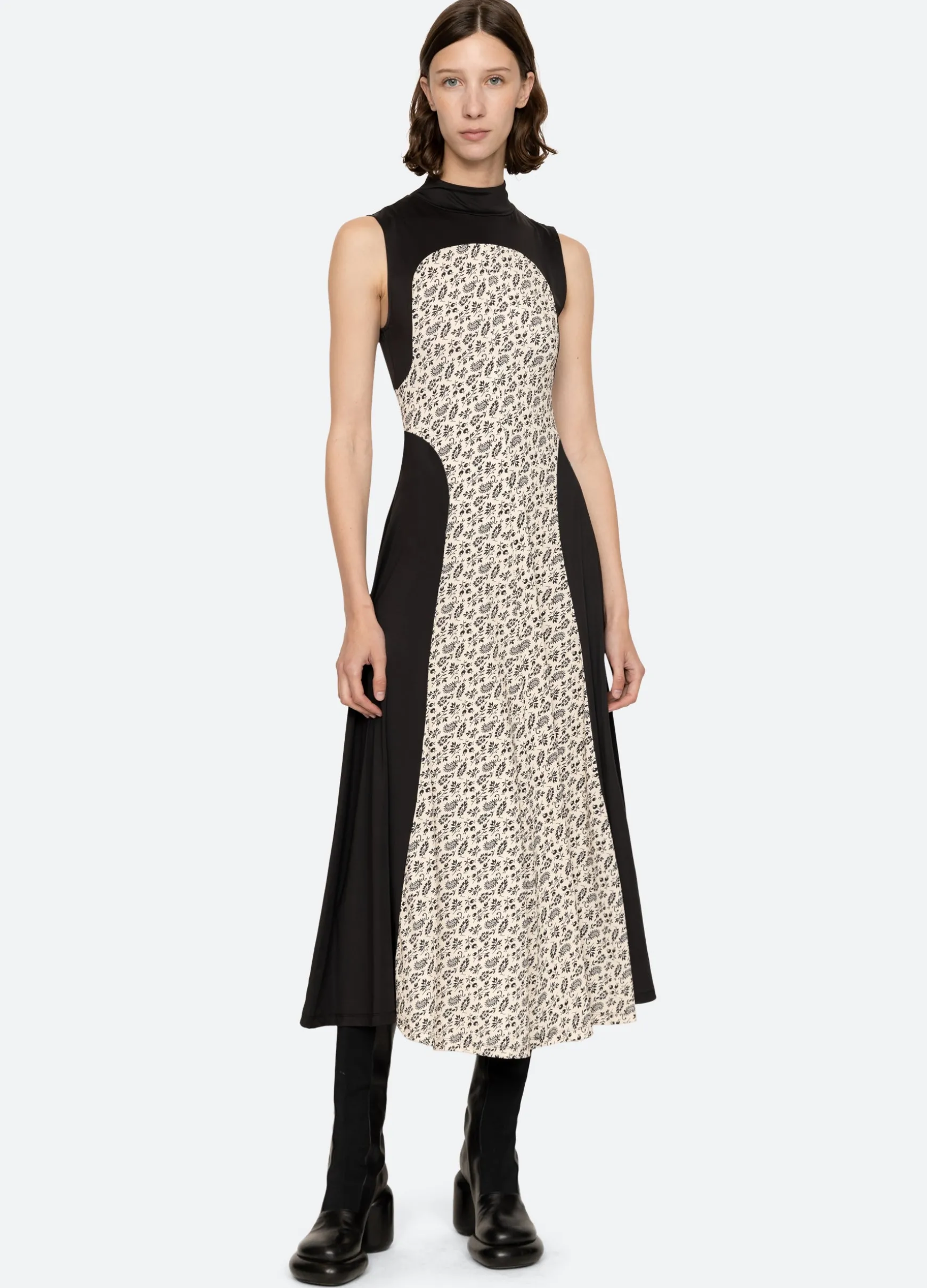 The Panna graphic print sleeveless dress features a mix of printed and solid spandex, high neck, and midi silhouette.