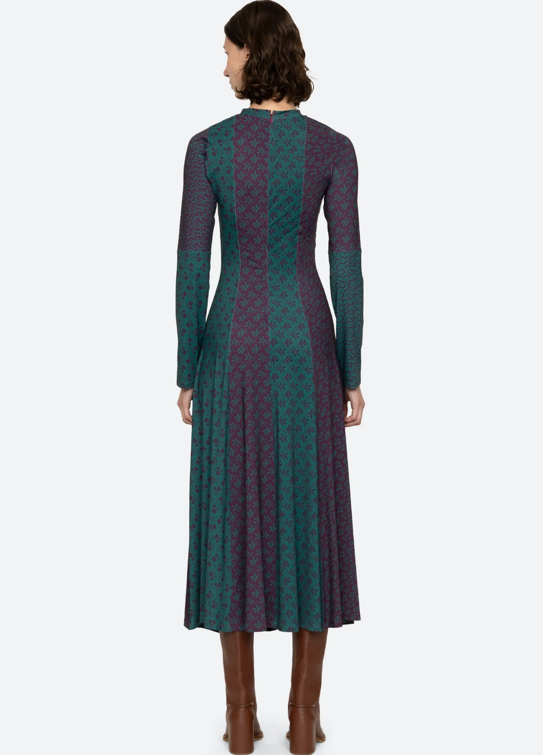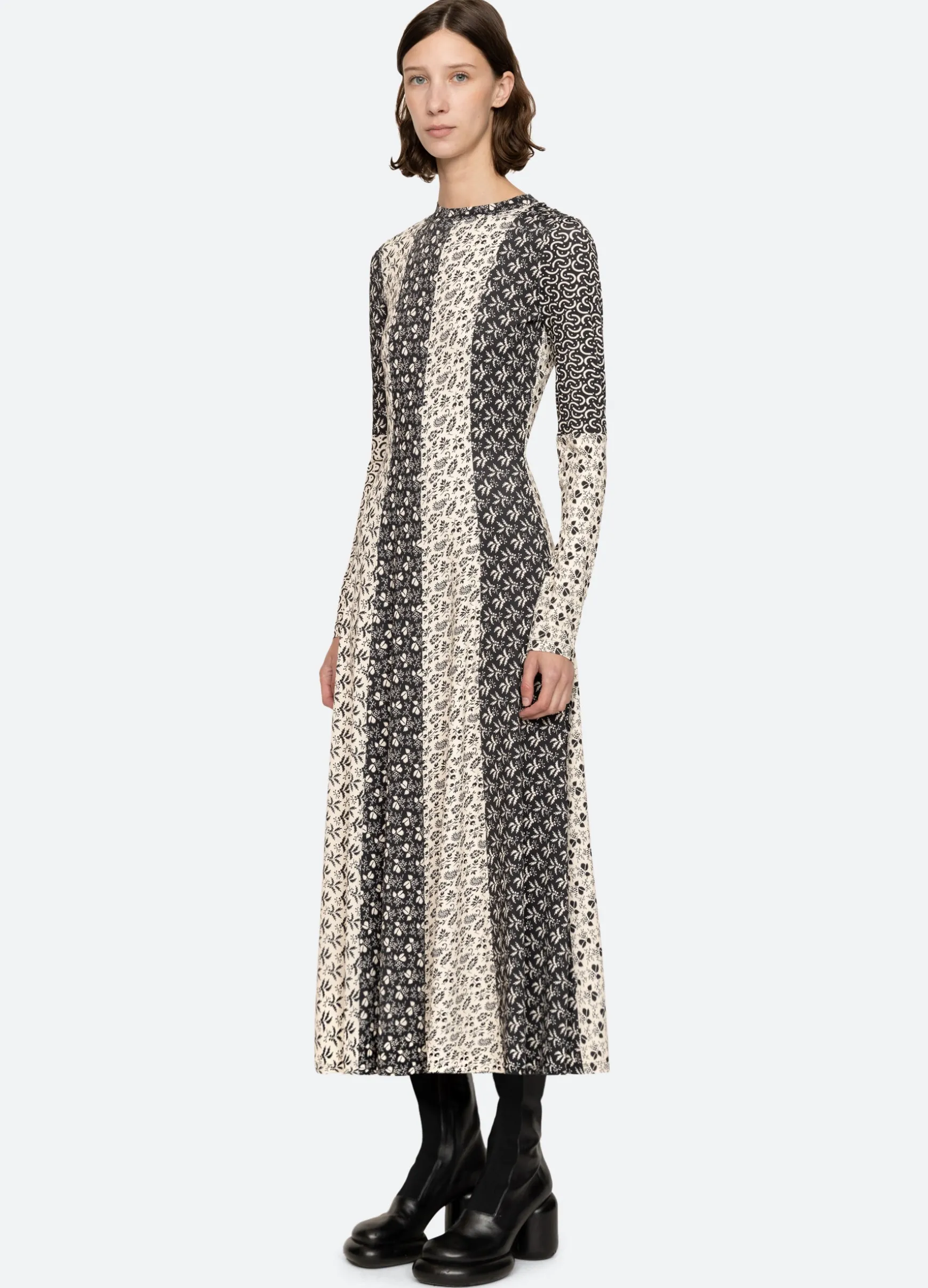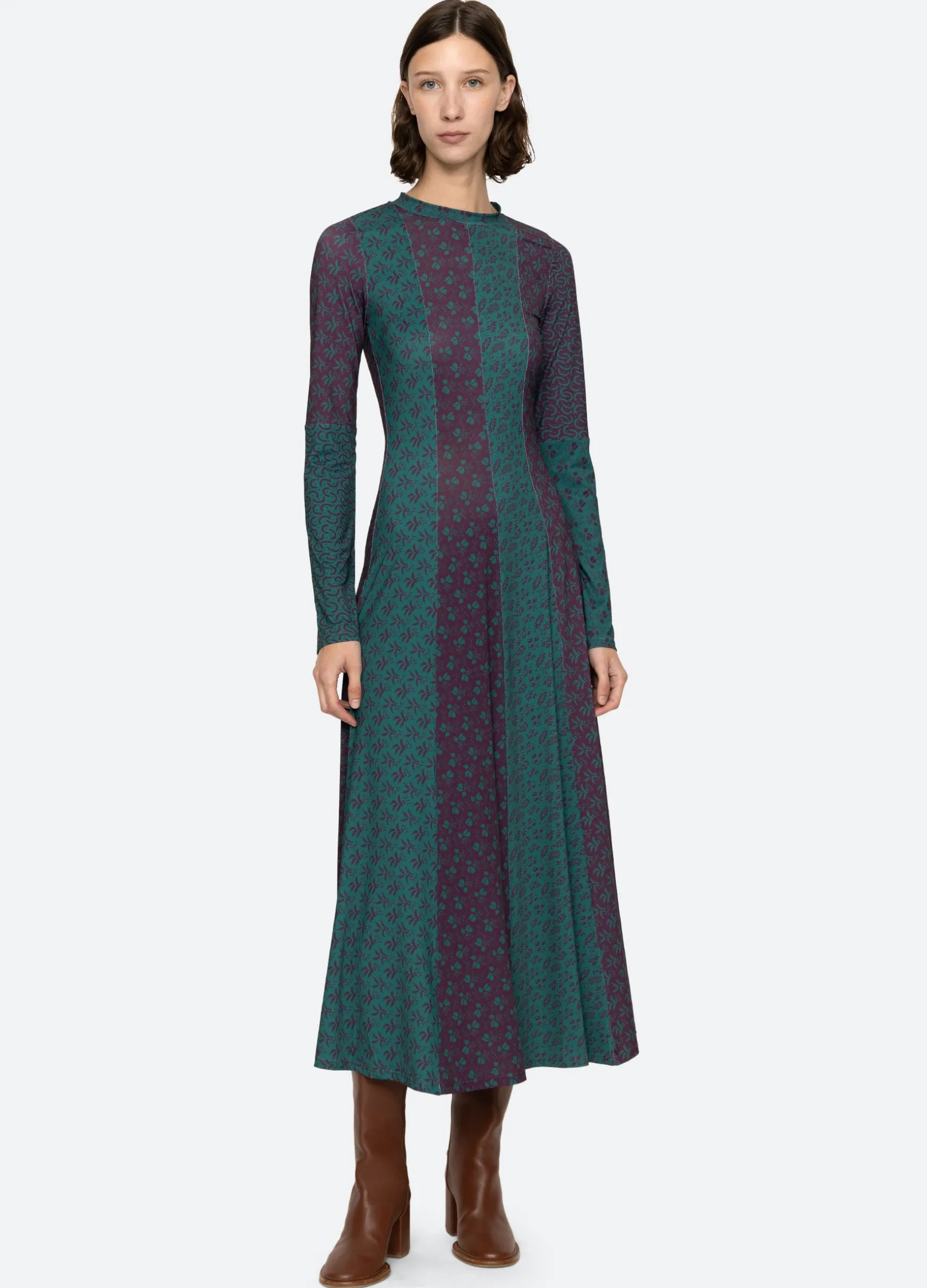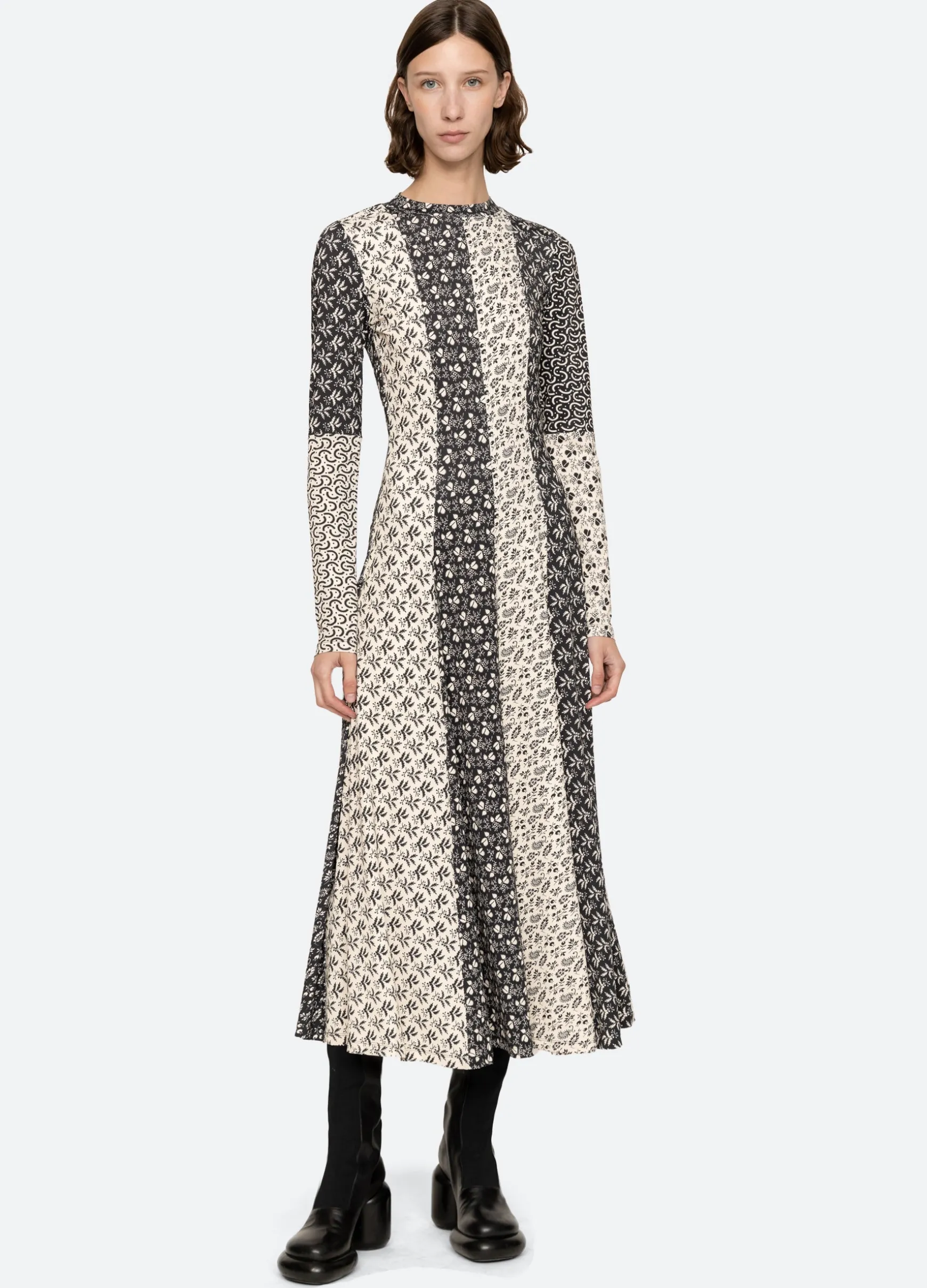 The Panna mix-up graphic print long sleeve dress features a full skirt and midi silhouette.