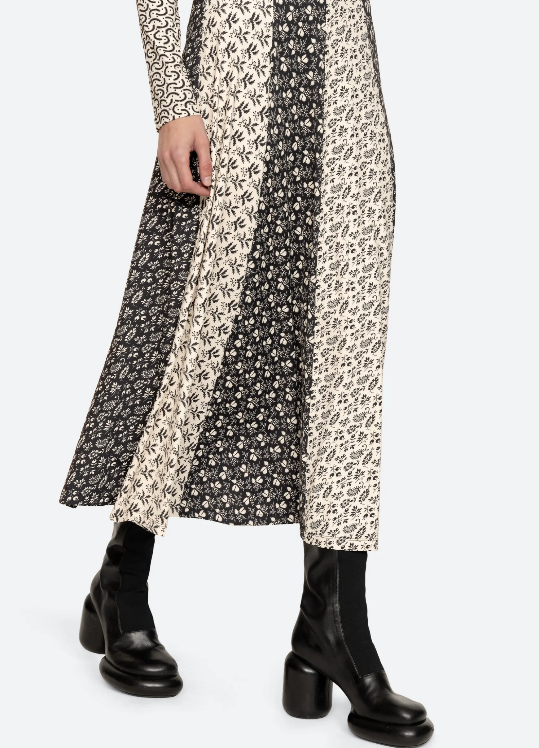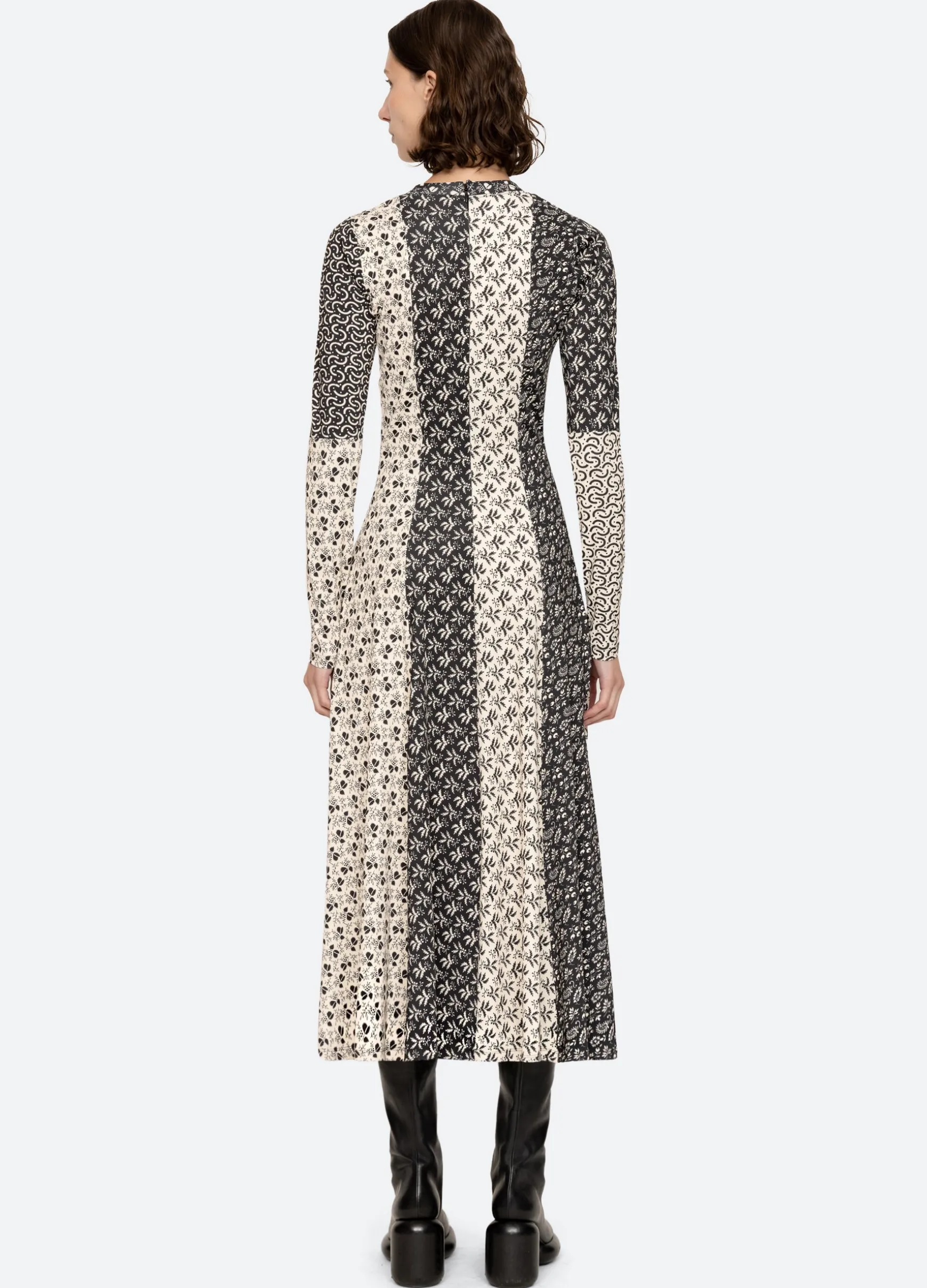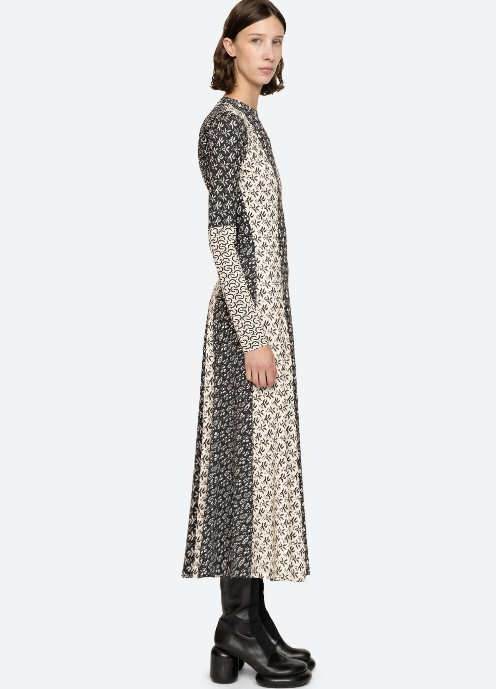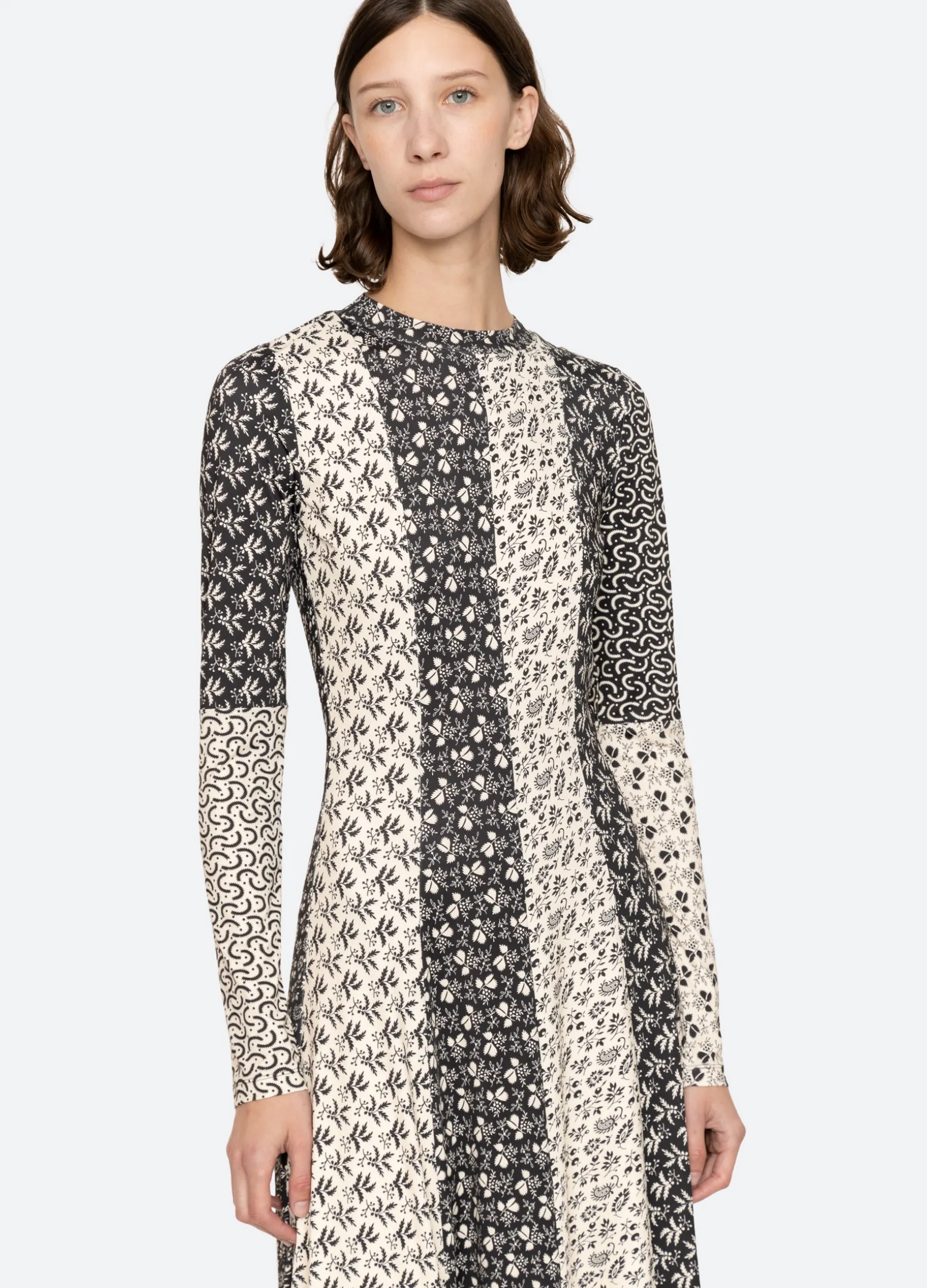 The Panna mix-up graphic print long sleeve dress features a full skirt and midi silhouette.