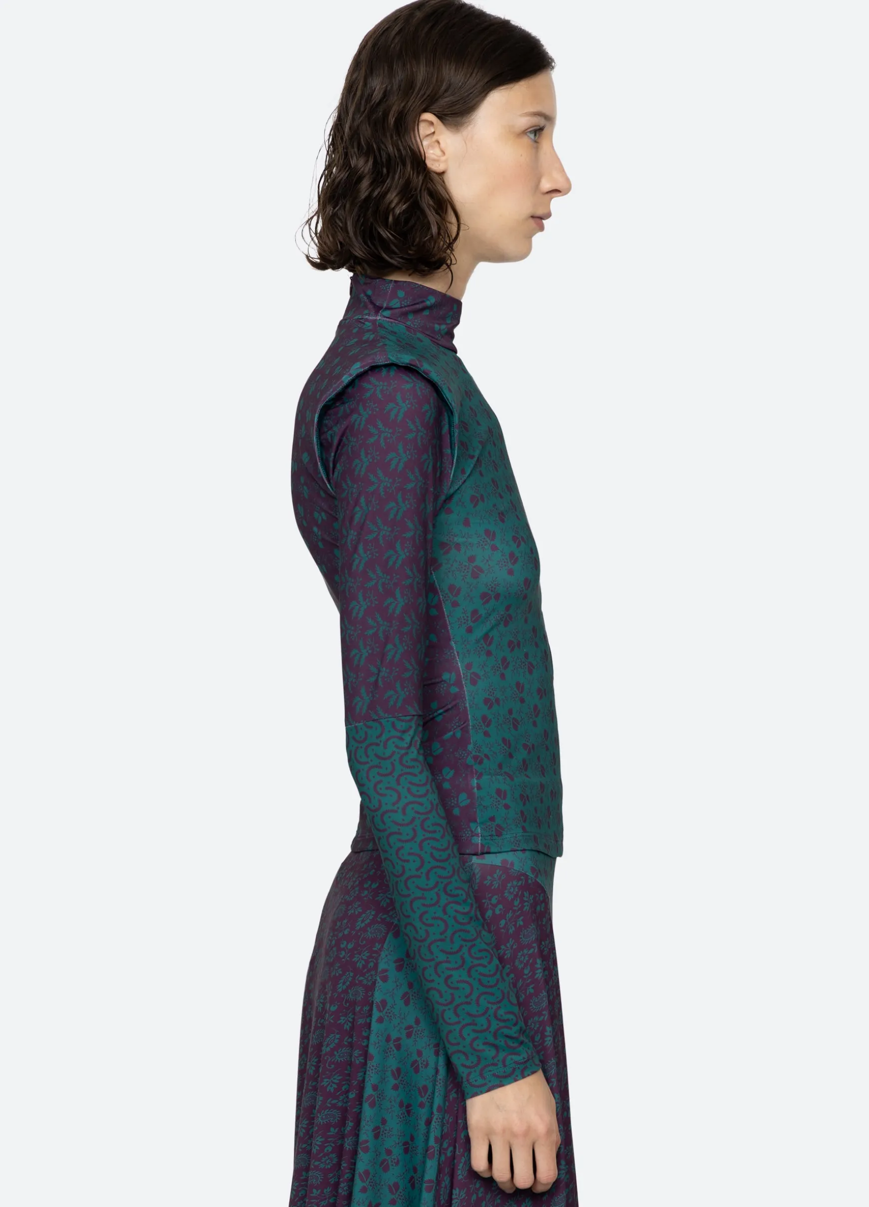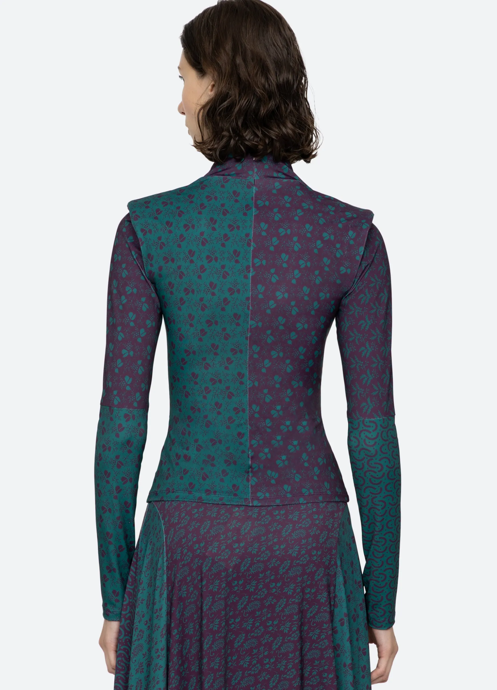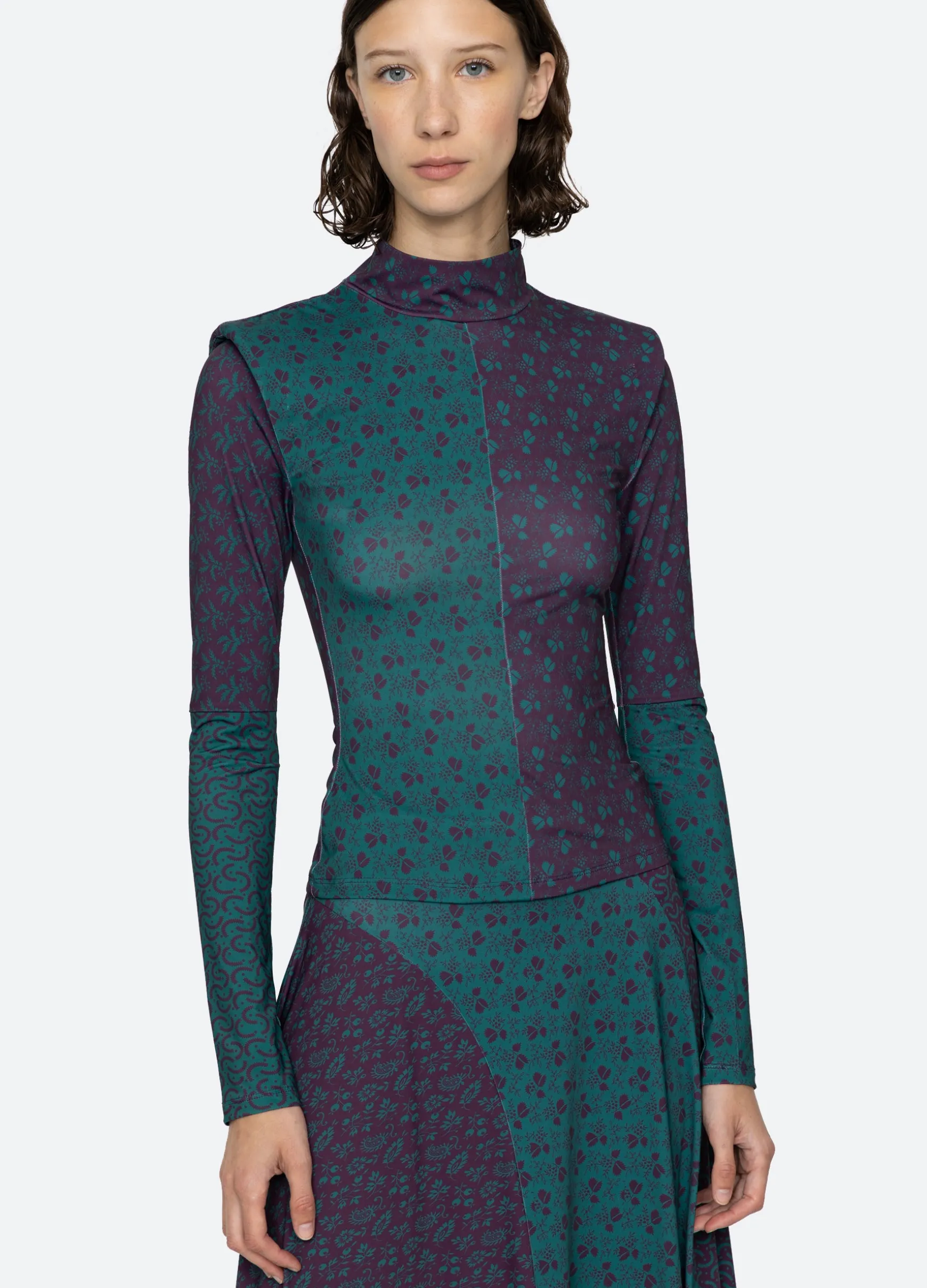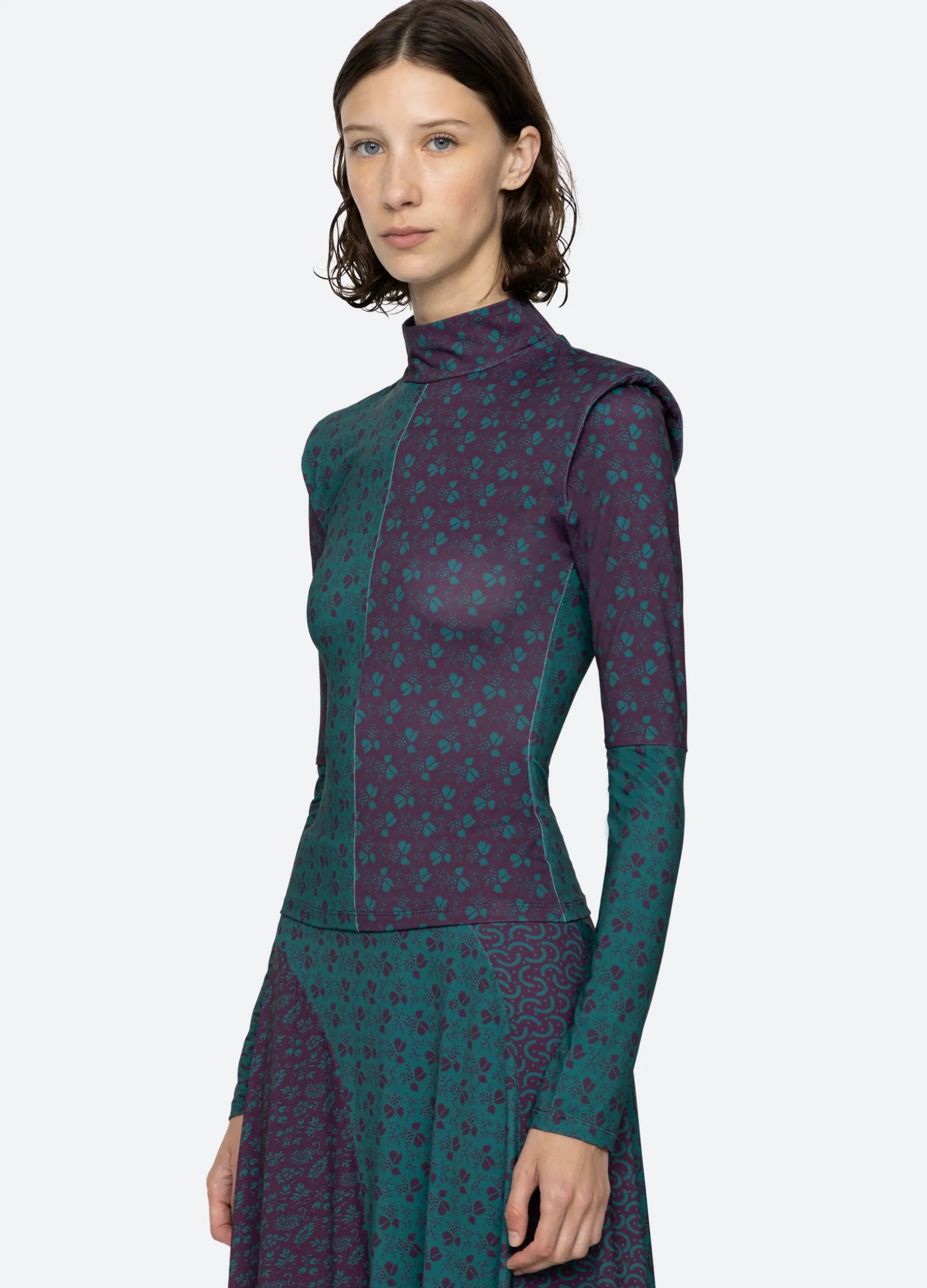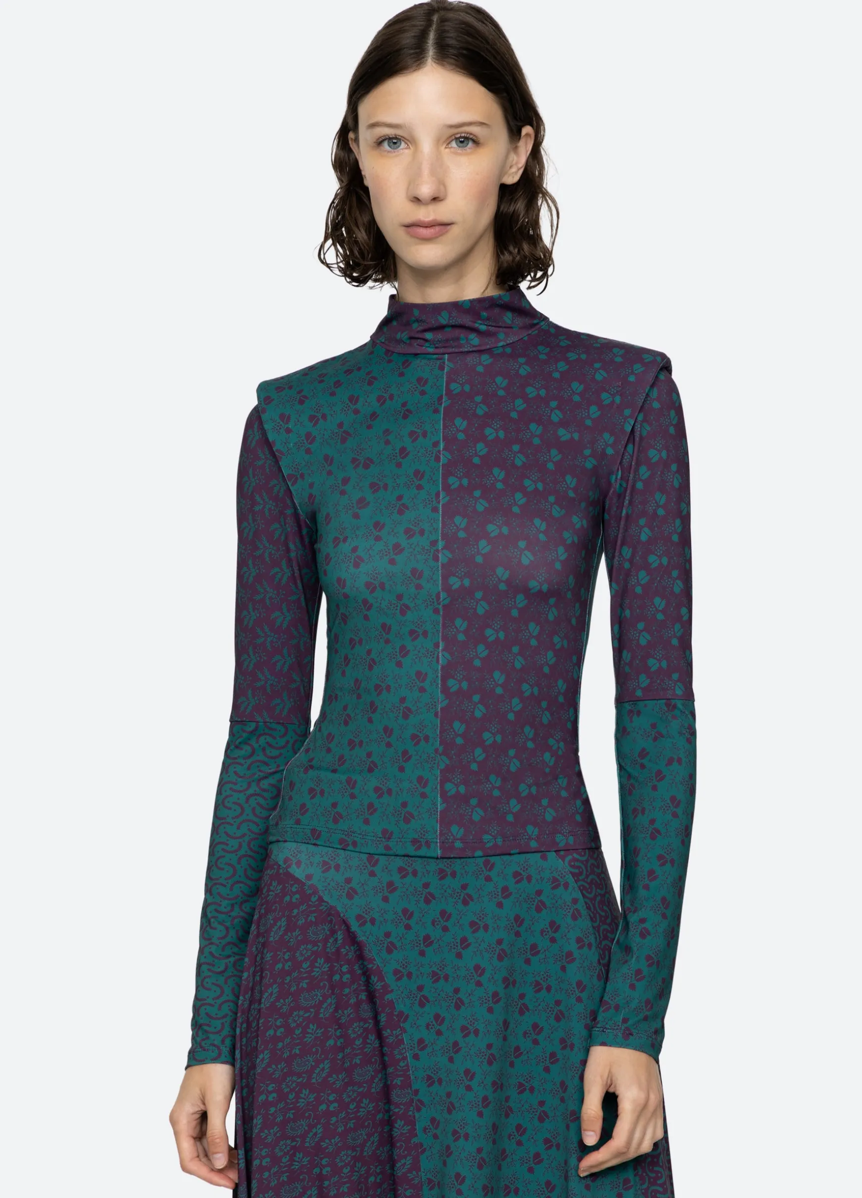 The Panna mix-up graphic print top features long sleeves, high neck and shoulder pads.