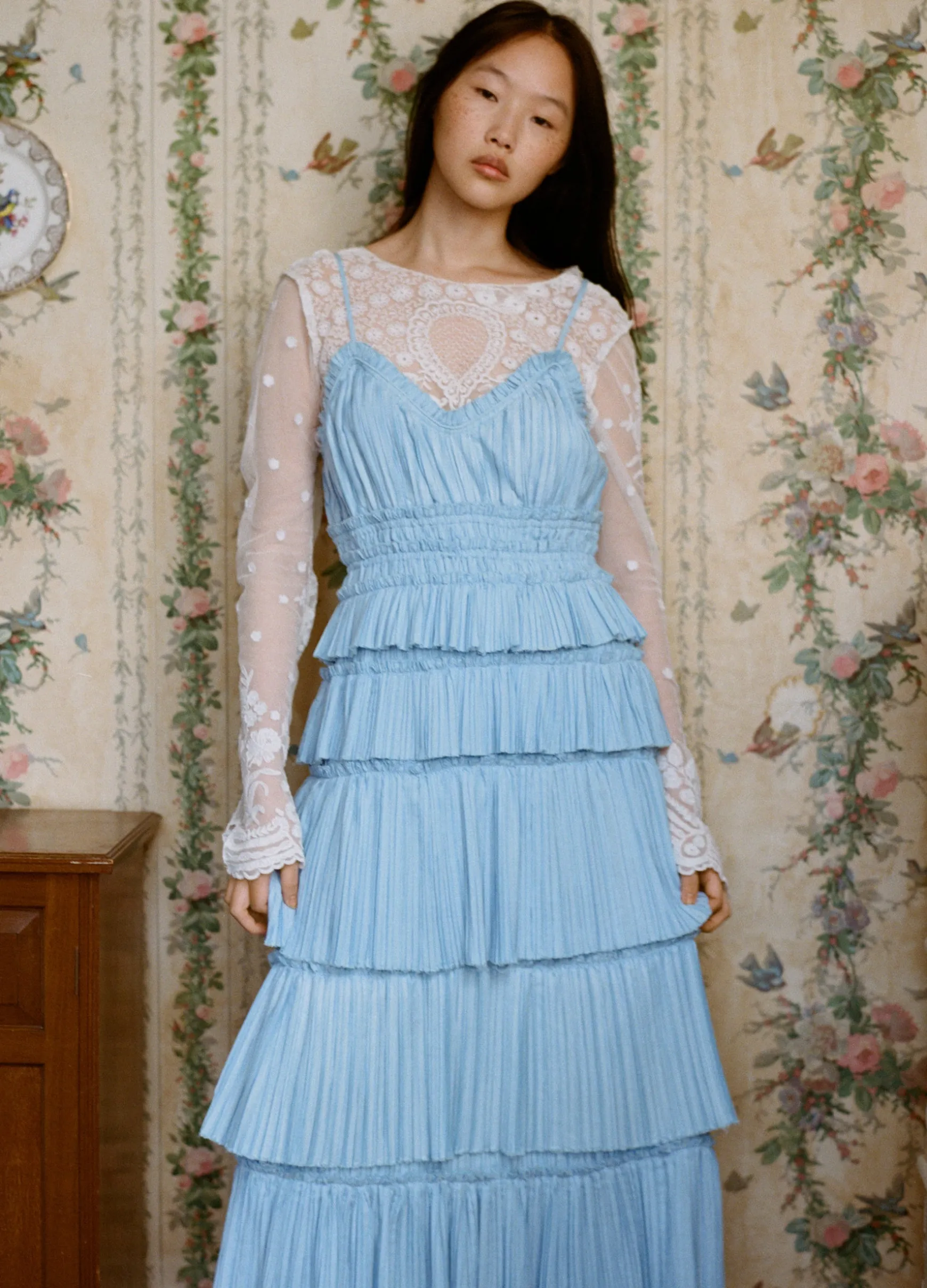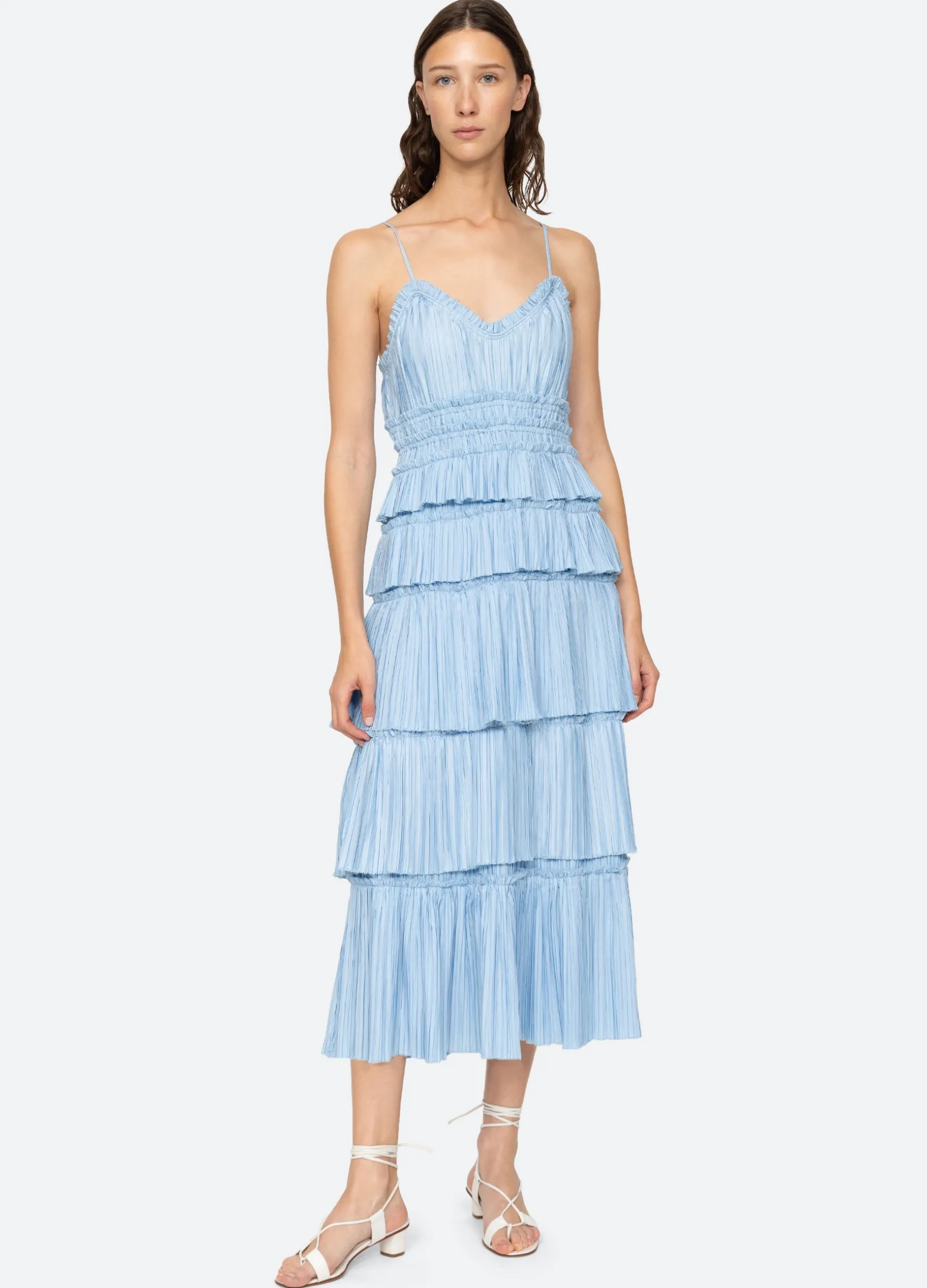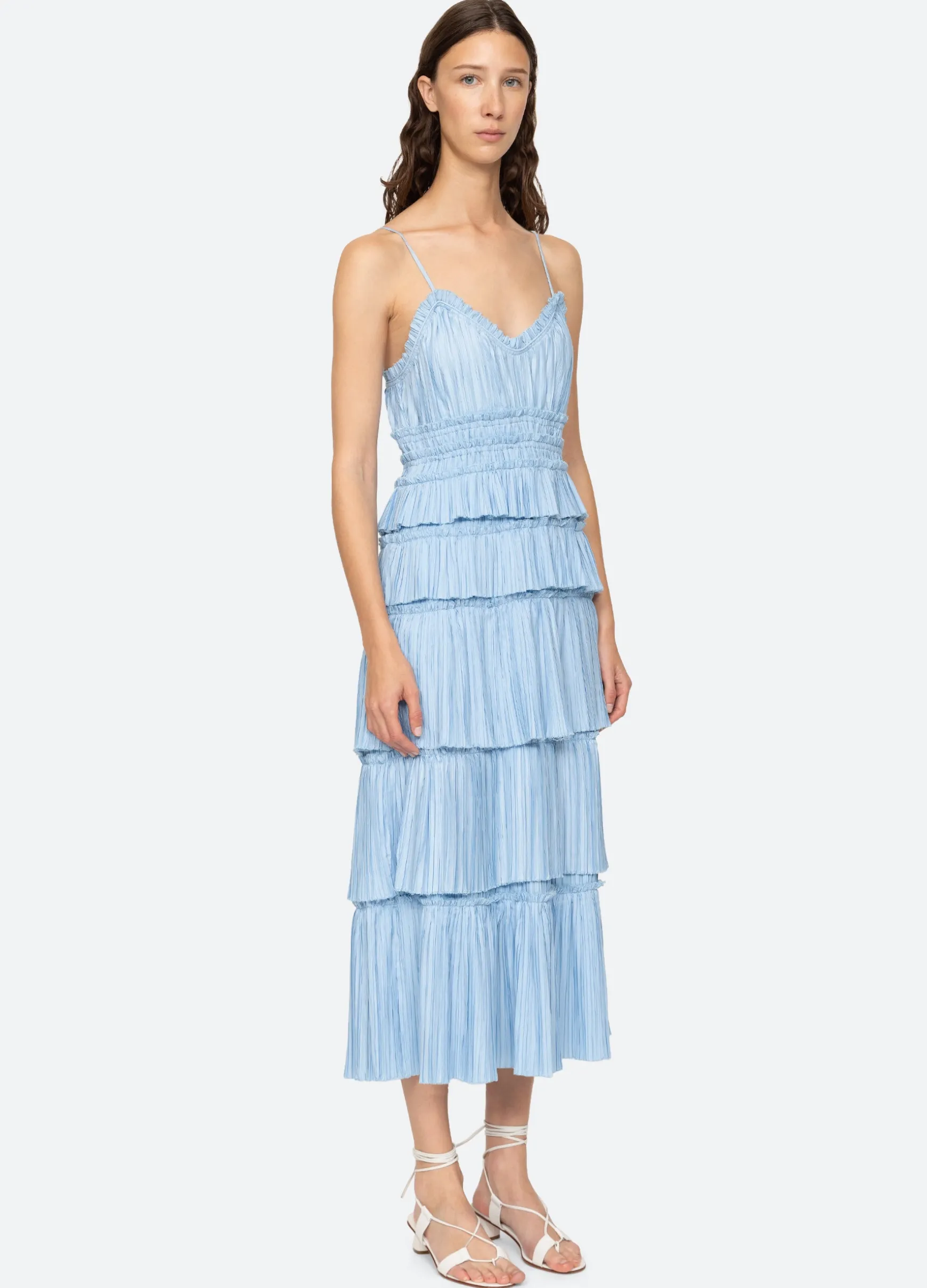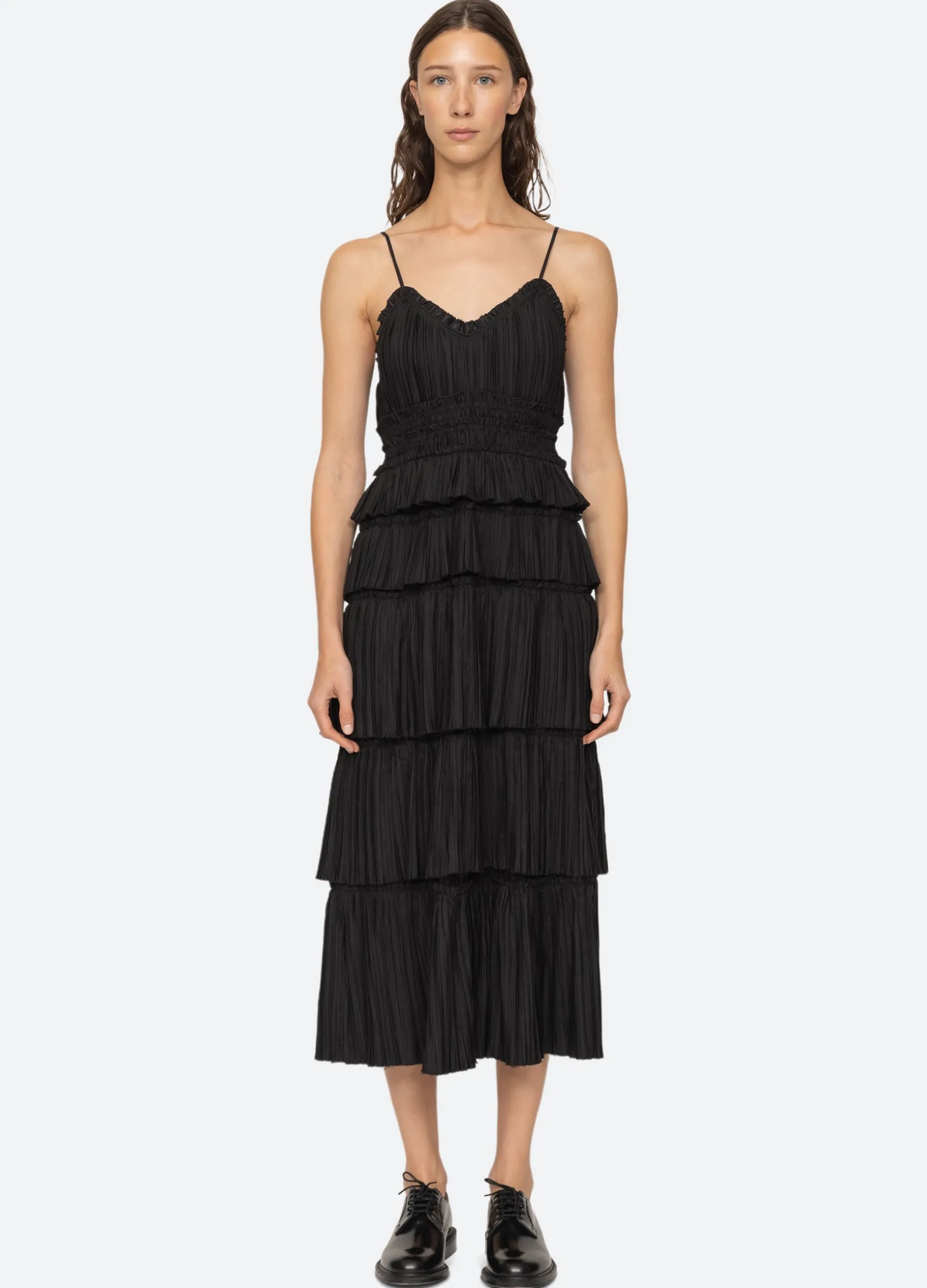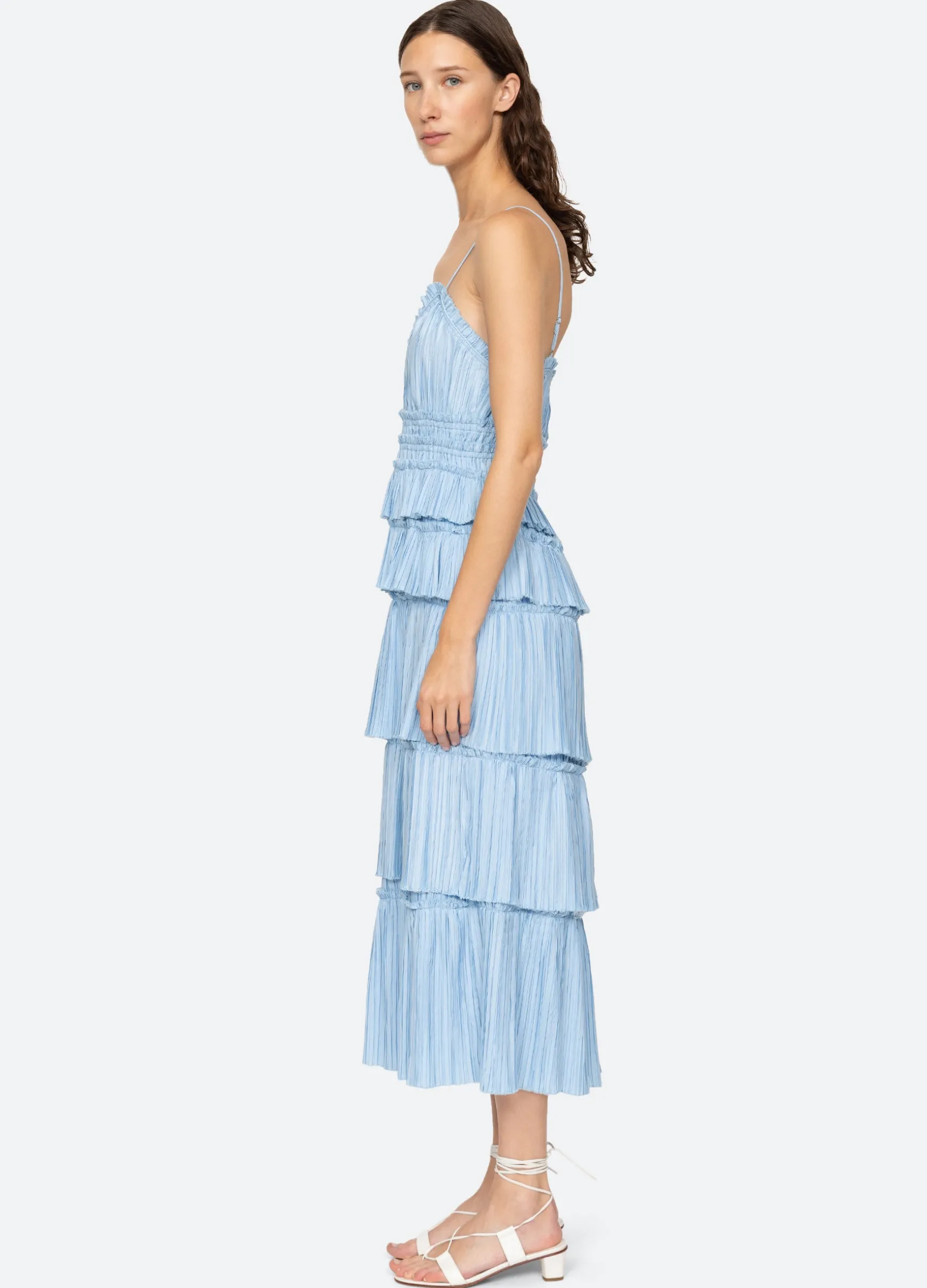The Parcie crinkle dress features ruffle trim, tiered skirt and raw edge detailing.