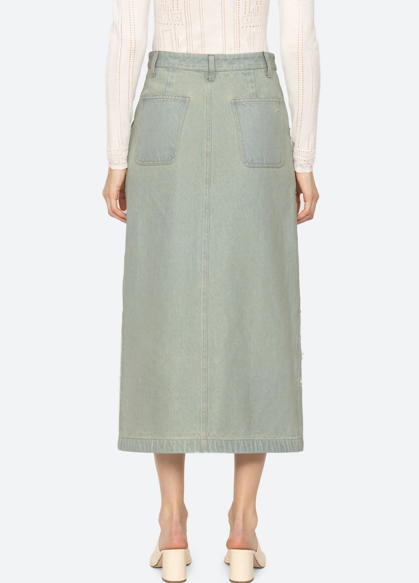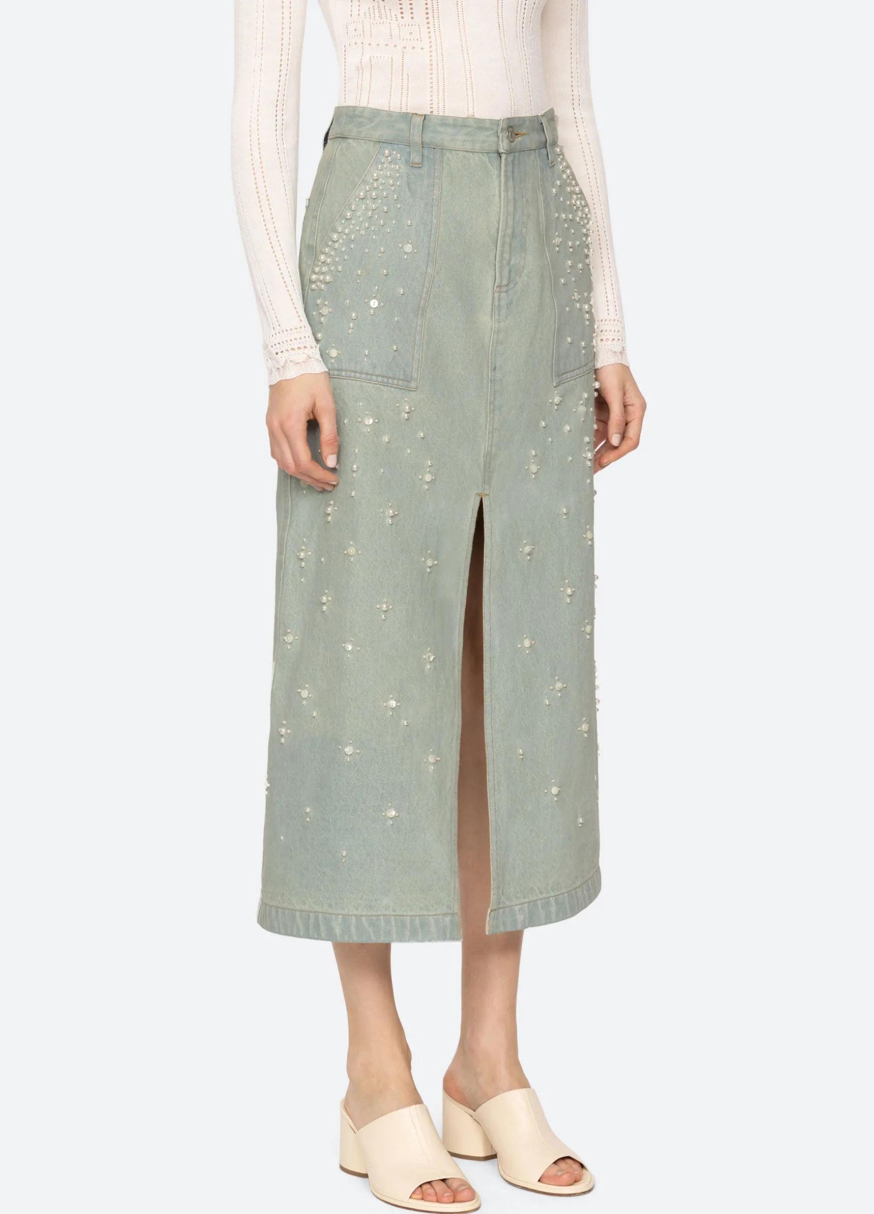 The Perlette denim skirt features a high rise waist, front slit, and is embellished with beads and pearl accents.