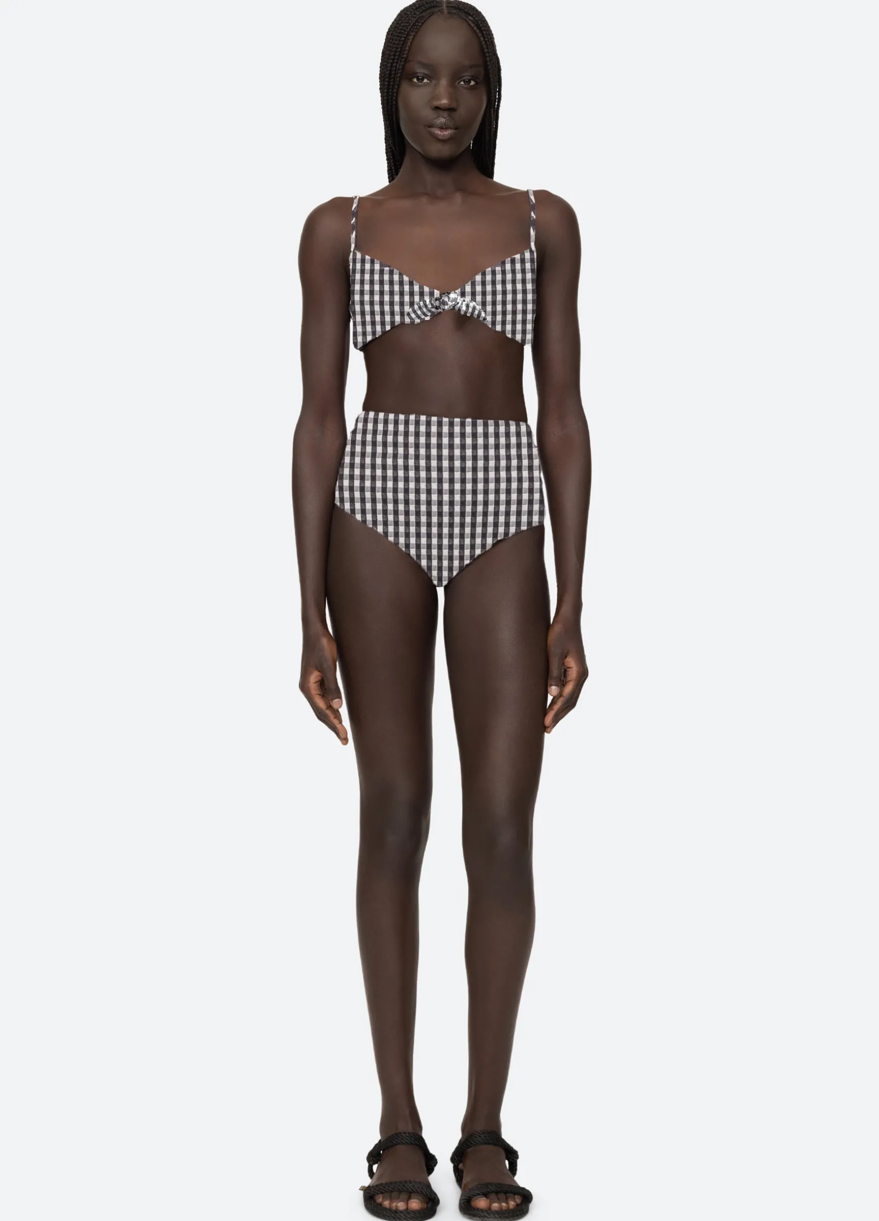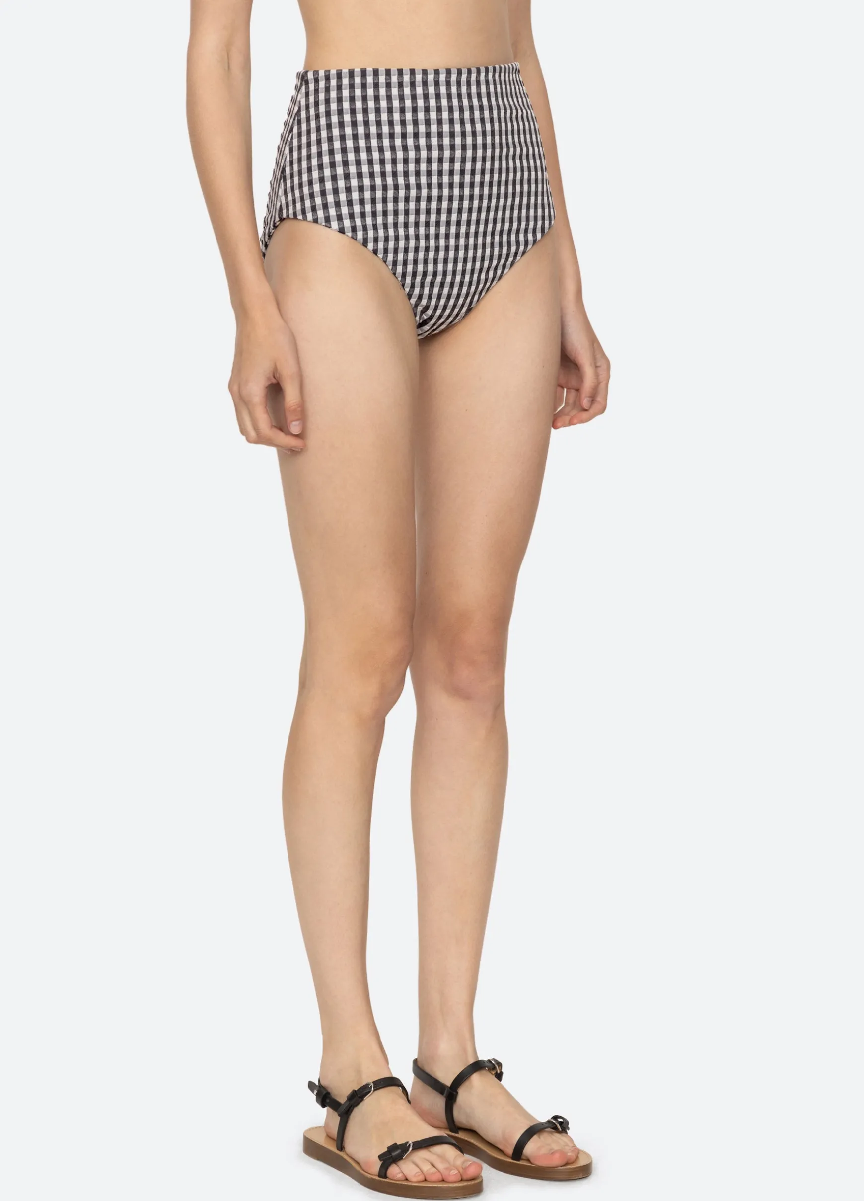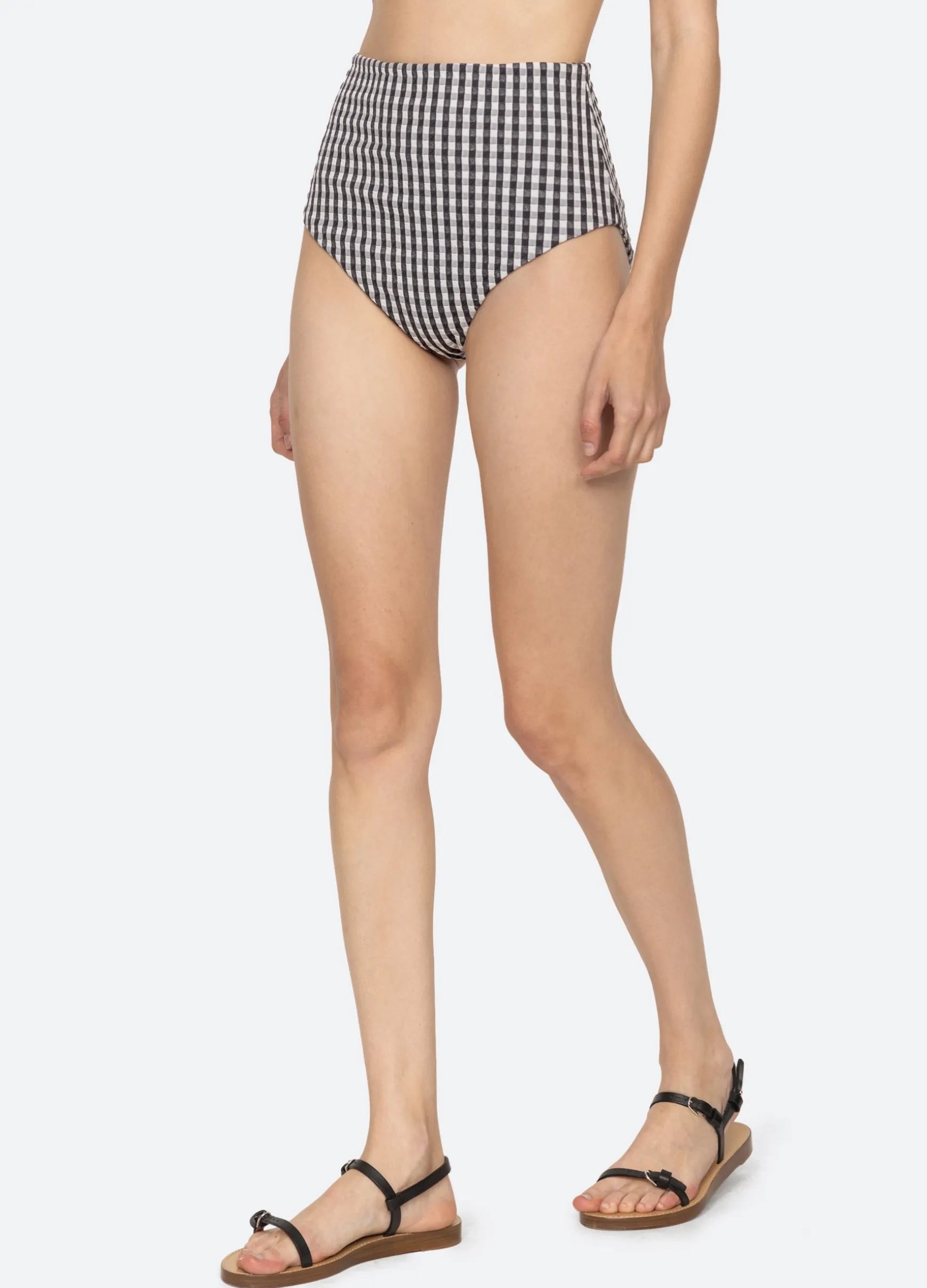 The Pucker gingham smocked bikini bottom features a high waisted silhouette, textured fabric and classic gingham print.