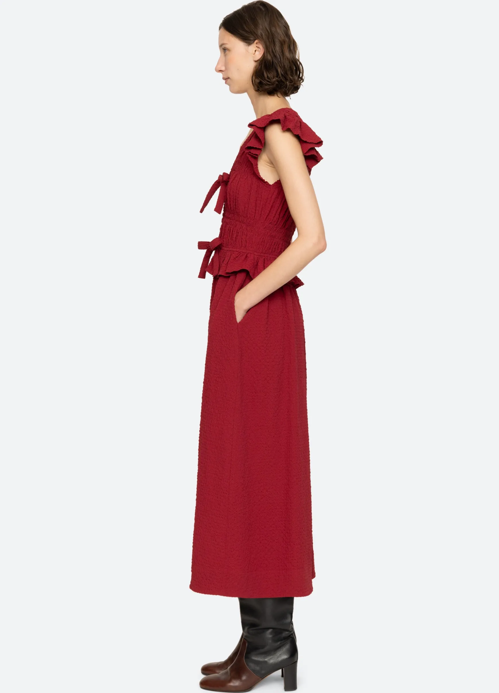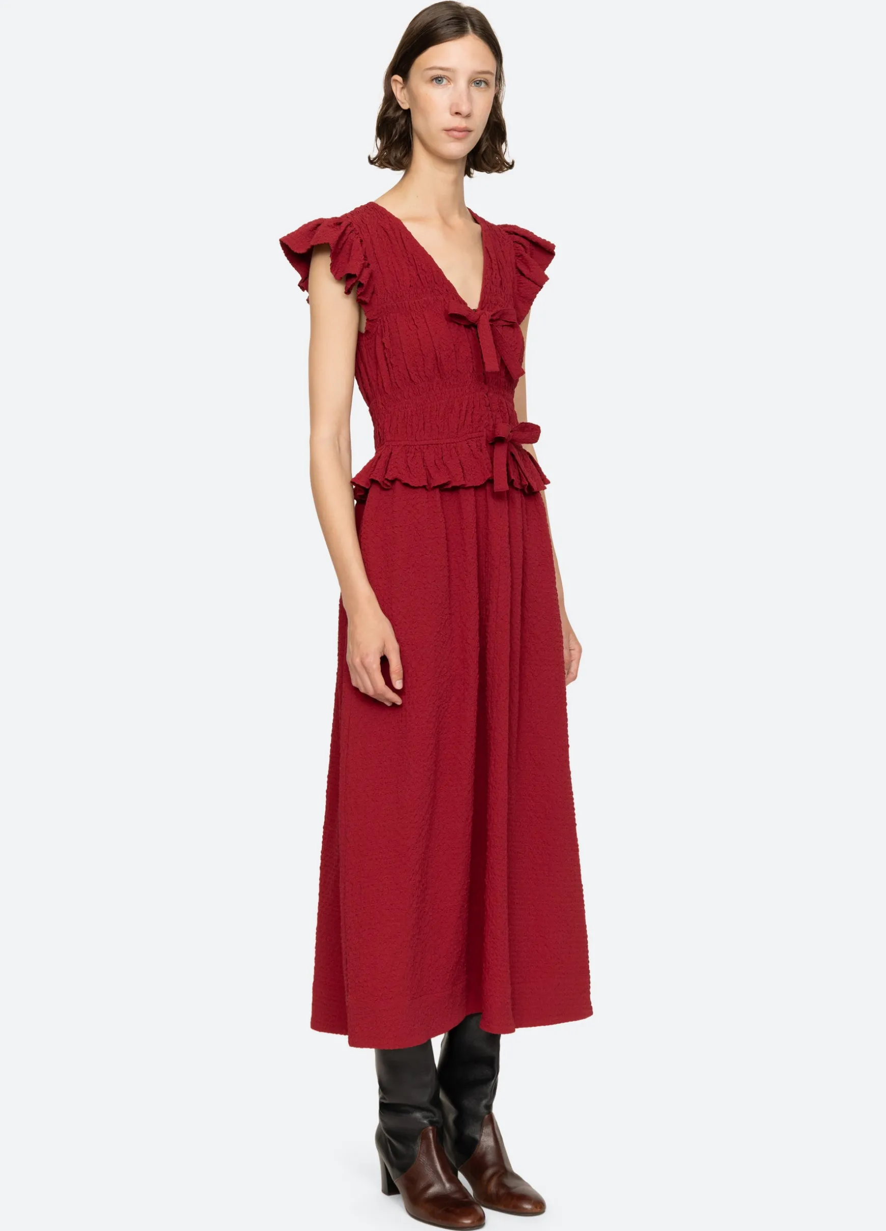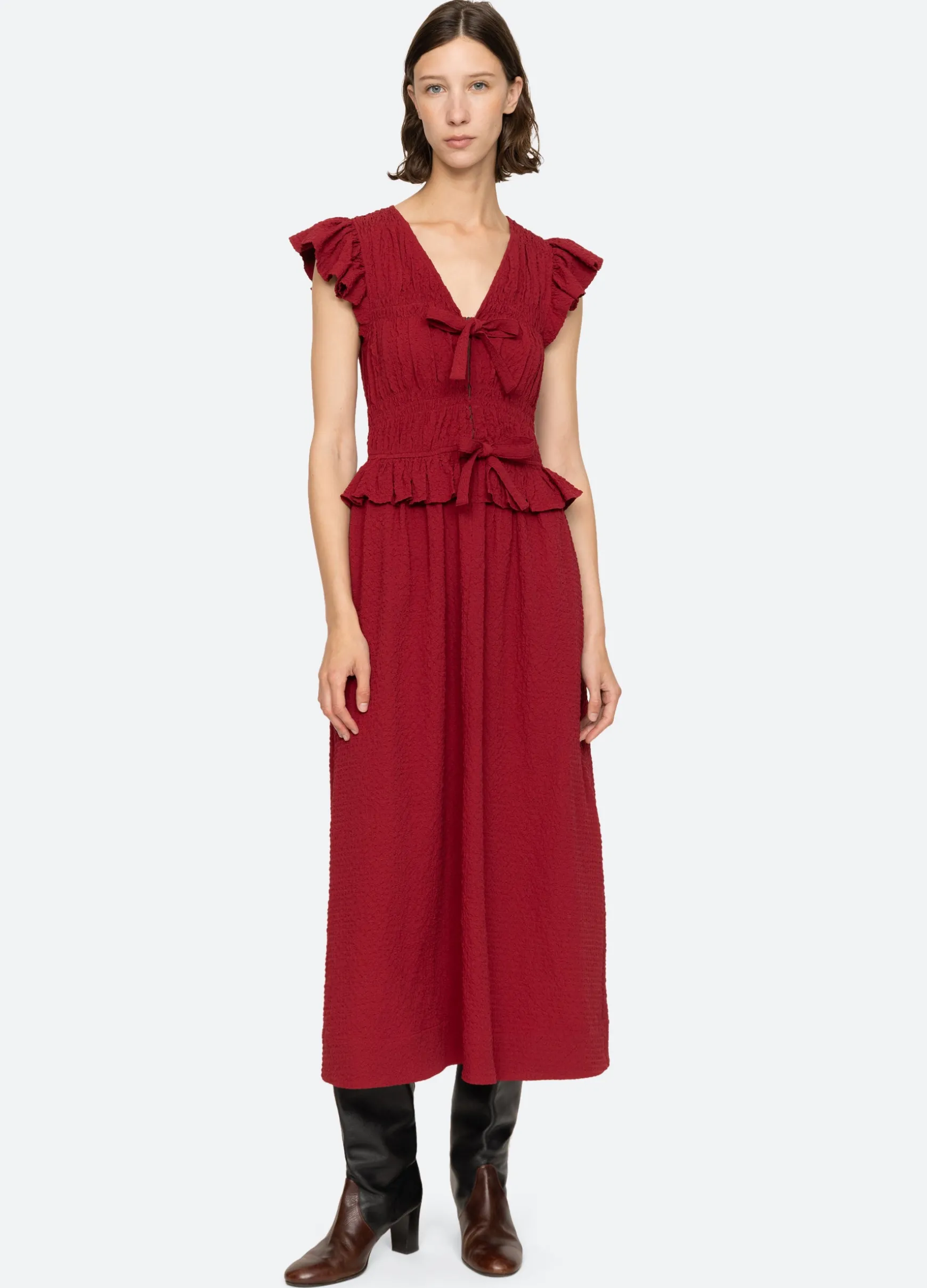The Regina seersucker dress features a v-neckline, flutter sleeves, ruffle detailing and front tie closures.