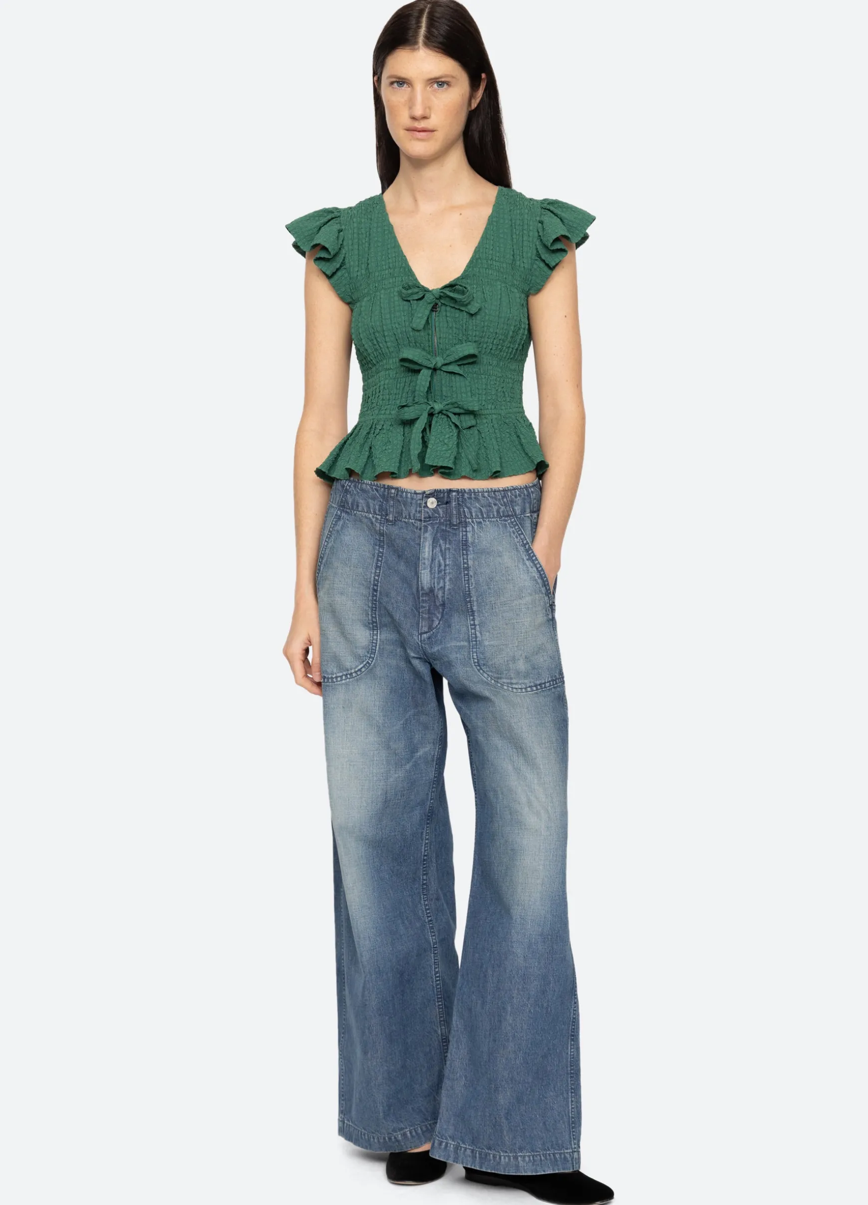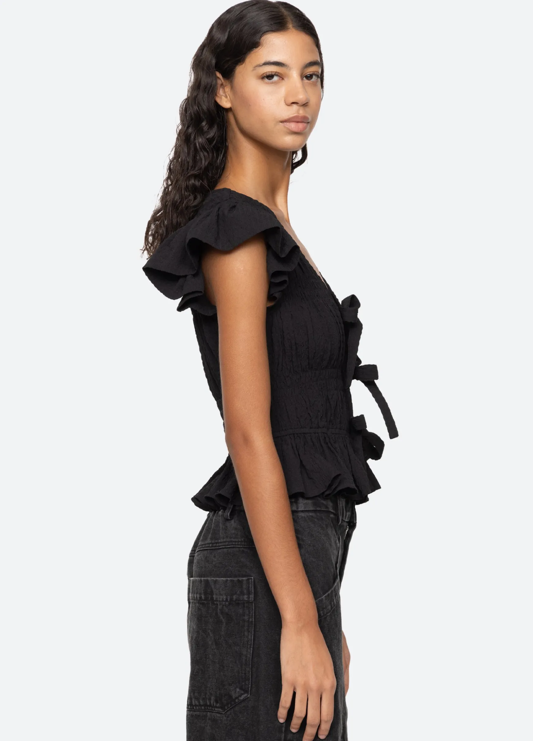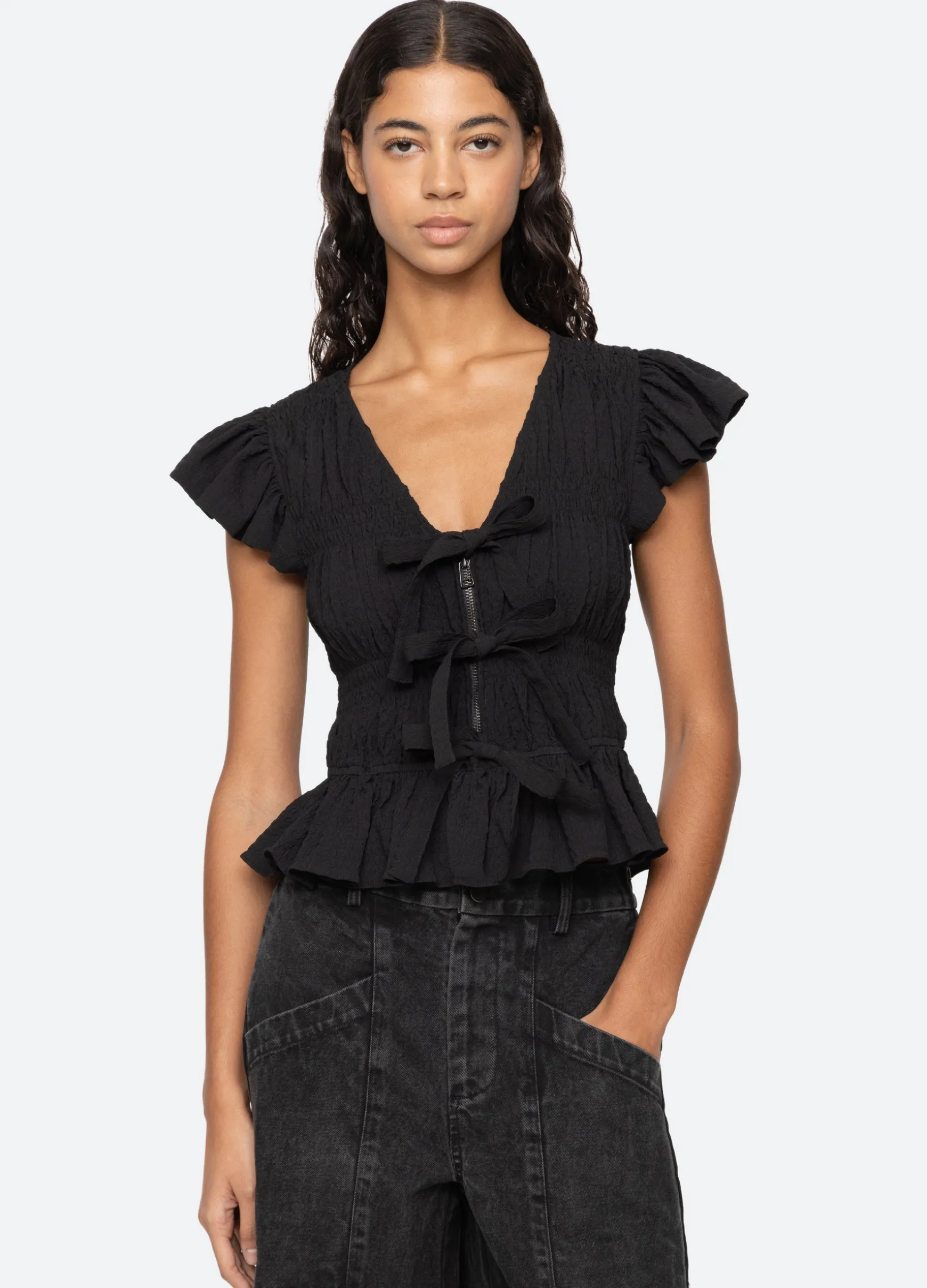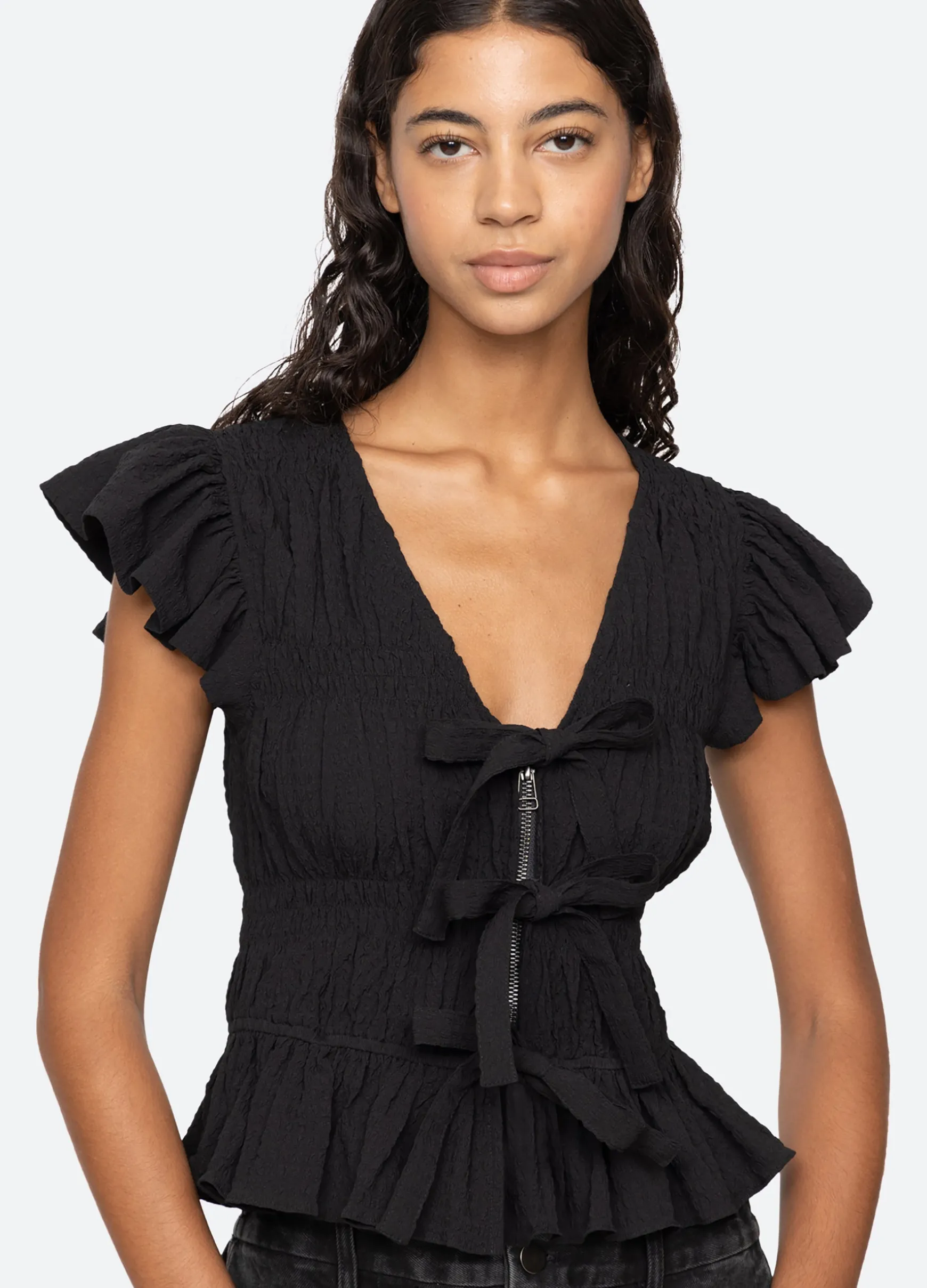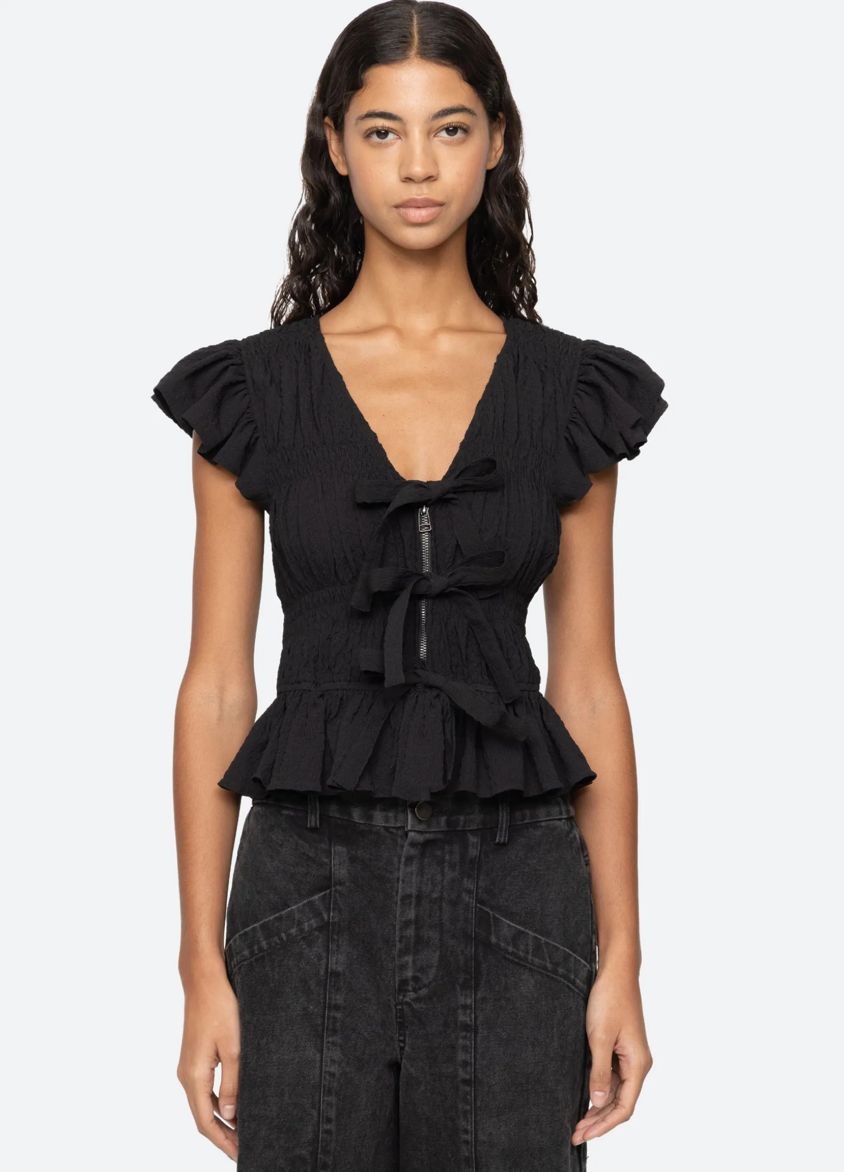 The Regina seersucker top features flutter sleeves and front tie front closures.