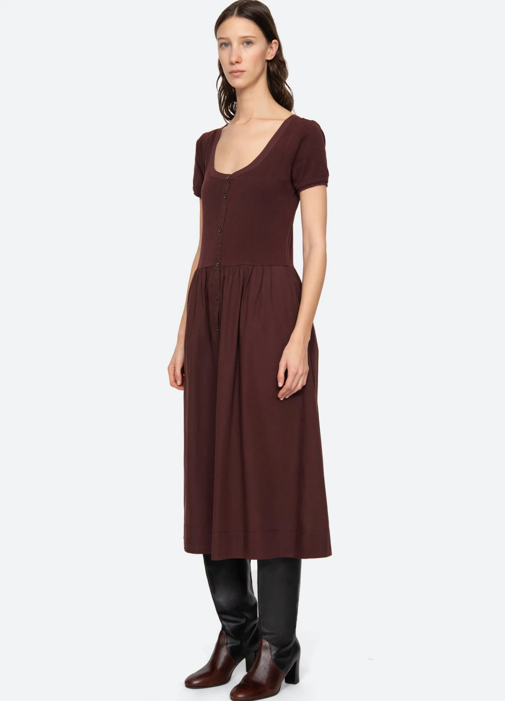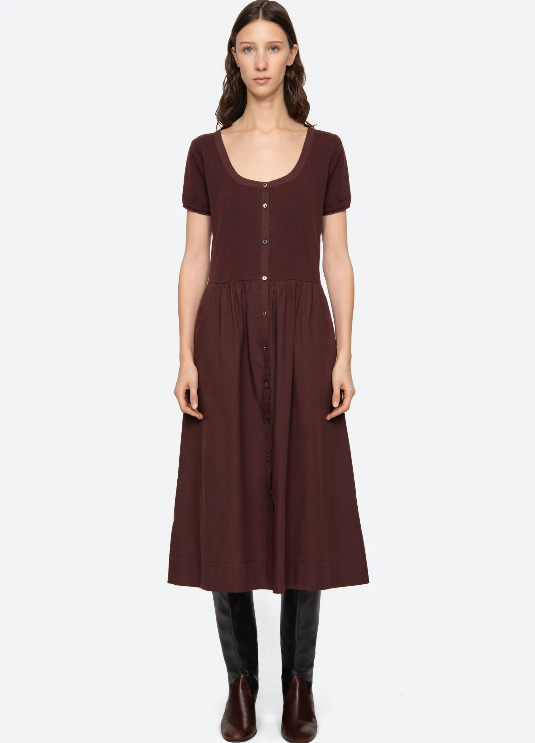 The Renata dress features short sleeves, ribbed bodice and button front closure.
