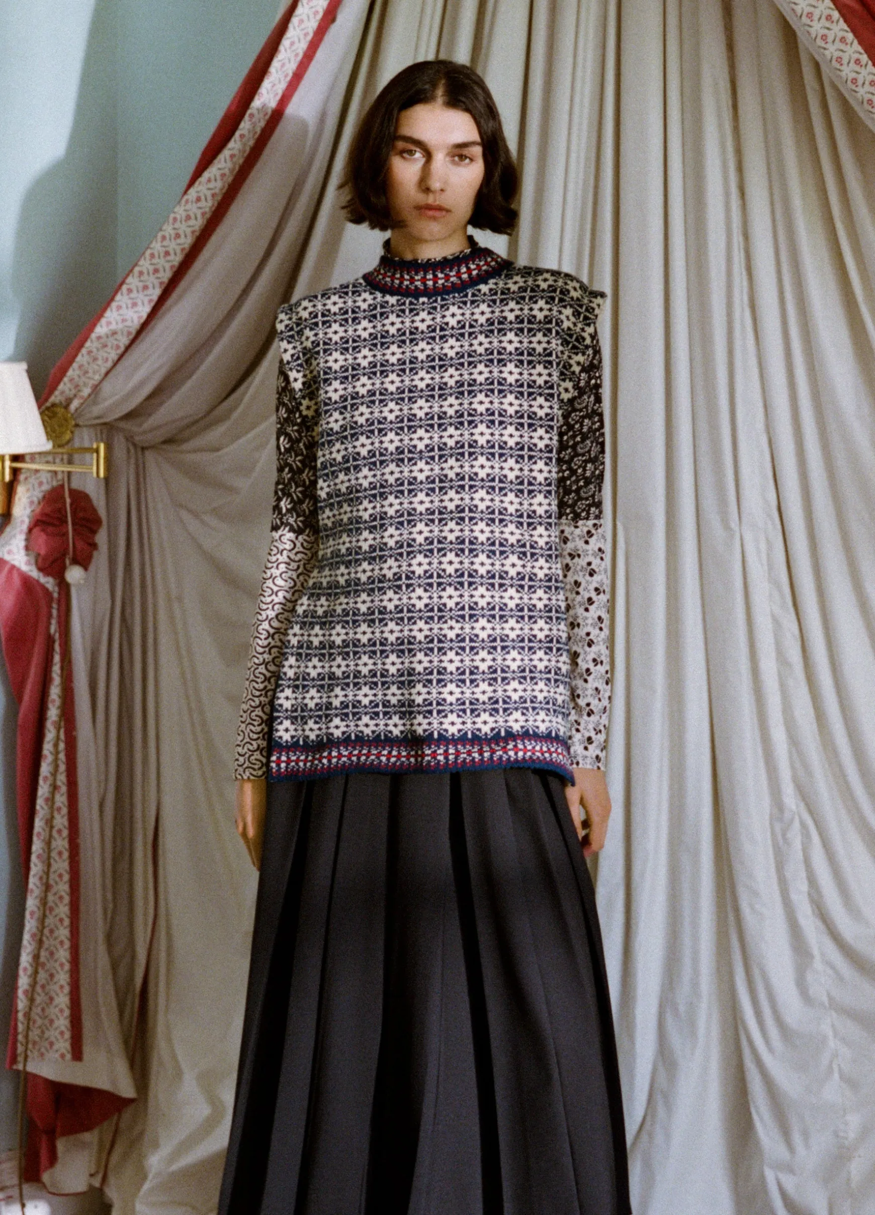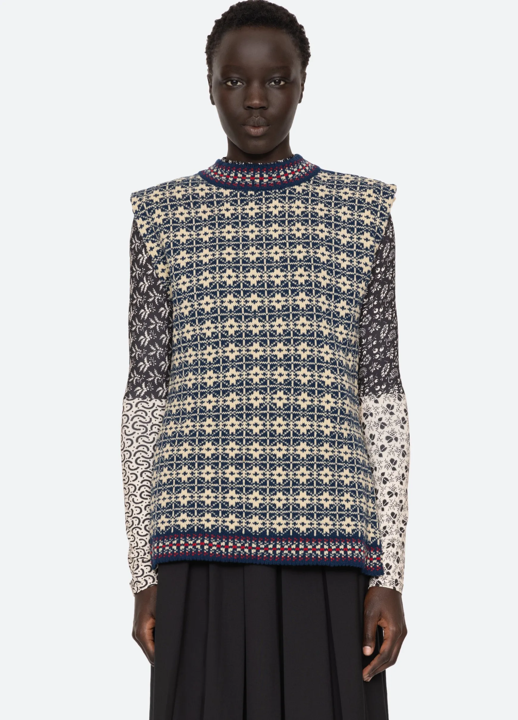 100% woolslip onmodel is 5’10” and wearing a size S/MThe Rory knit sweater vest features a fair isle pattern on the fro…