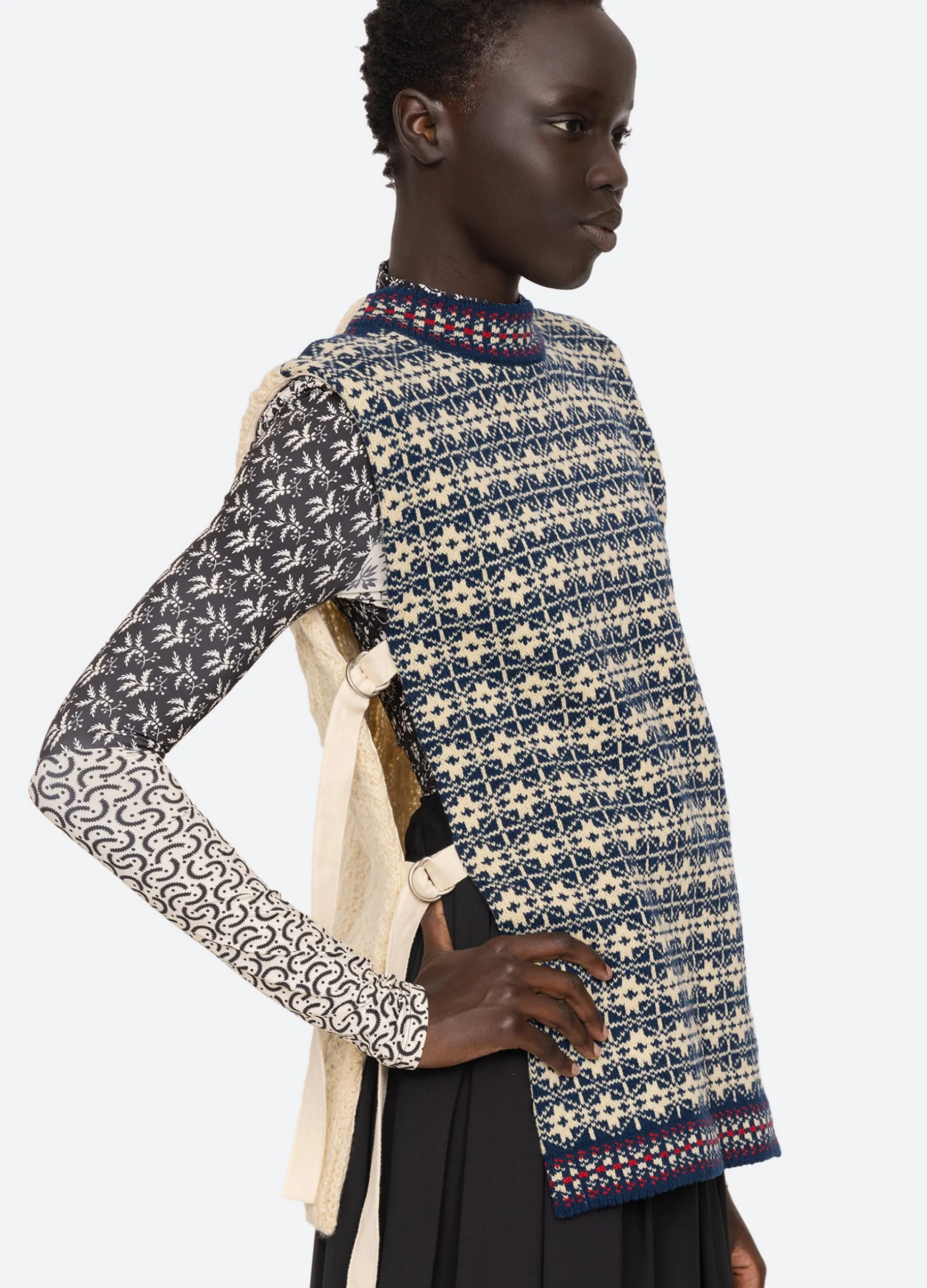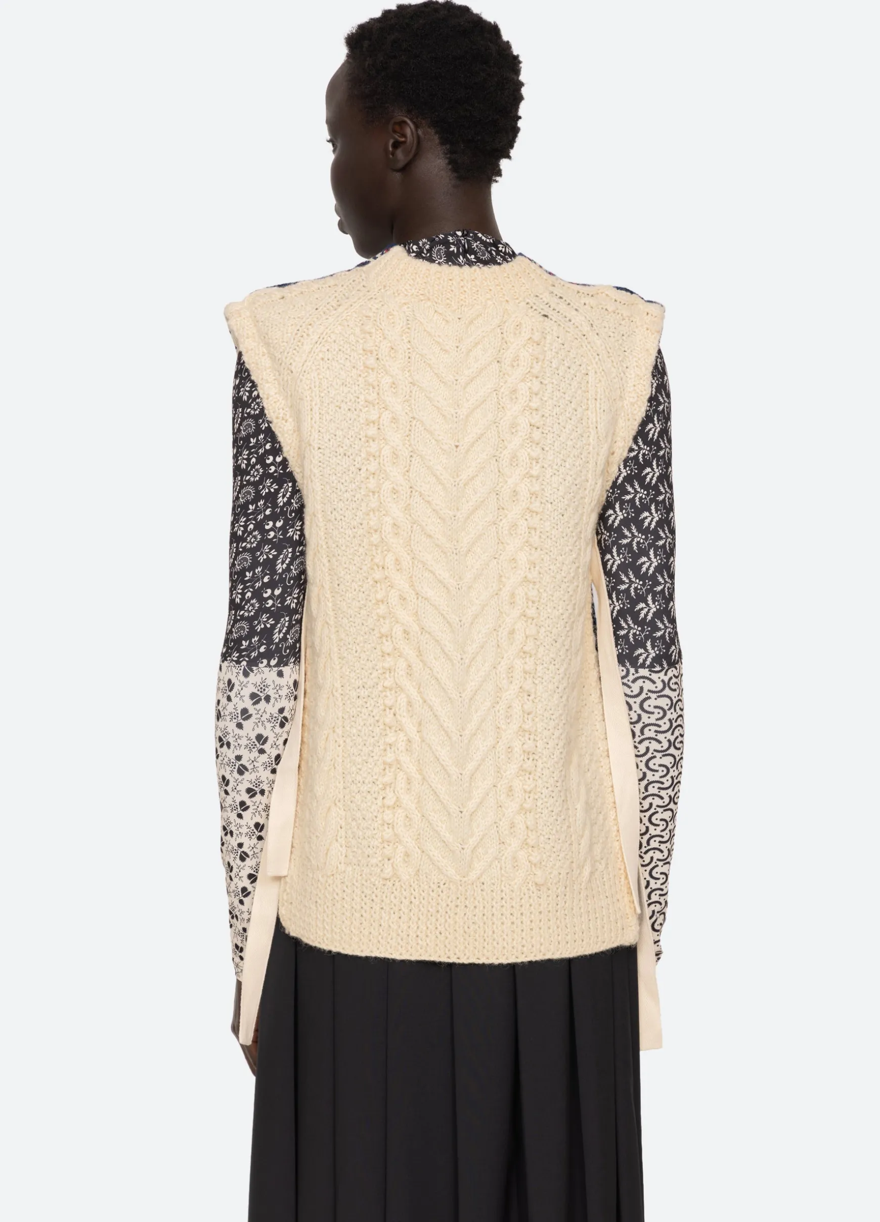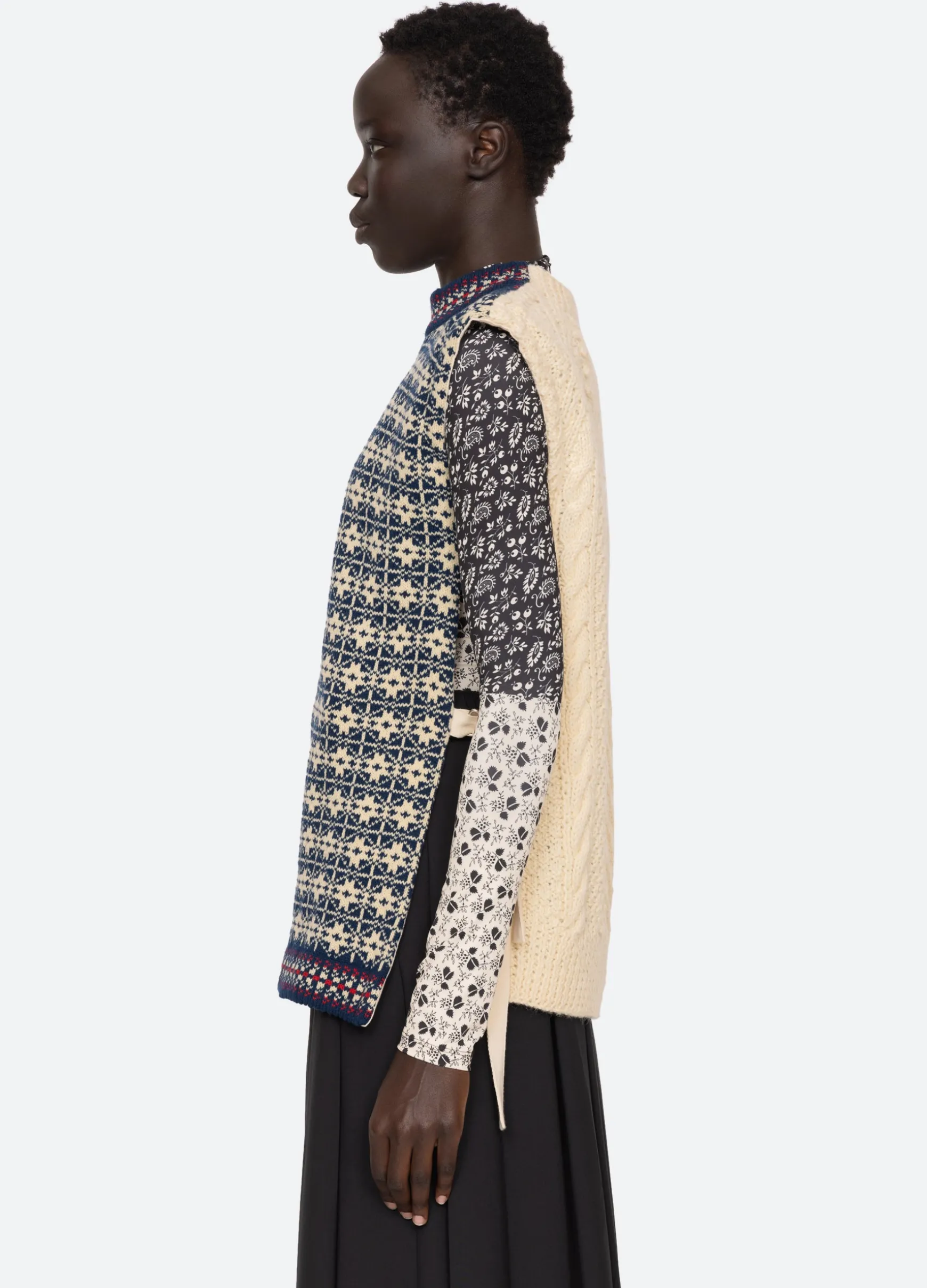 The Rory knit sweater vest features a fair isle pattern on the front, solid cable knit on the back, high neckline, and adjustable D-ring tabs.