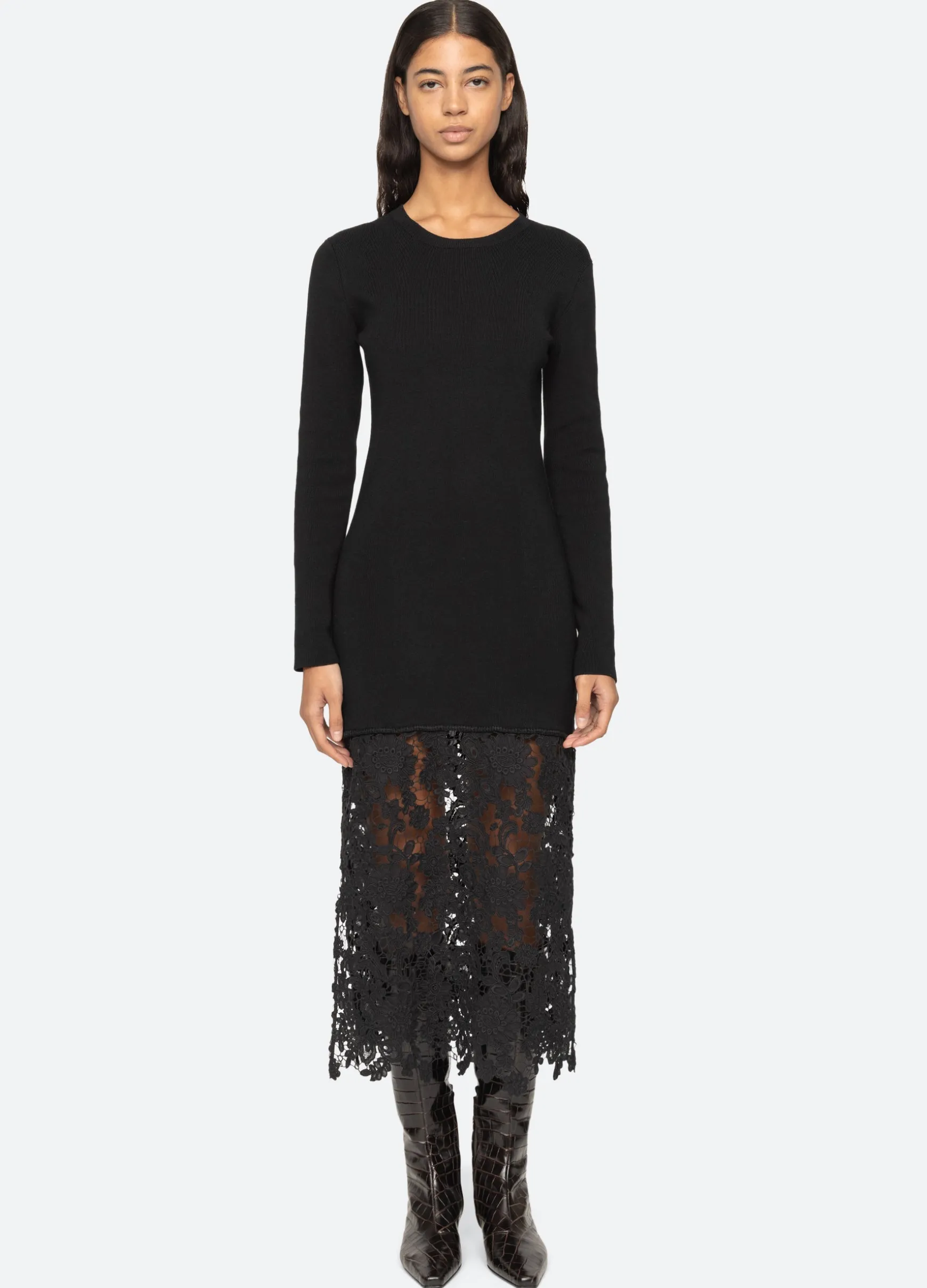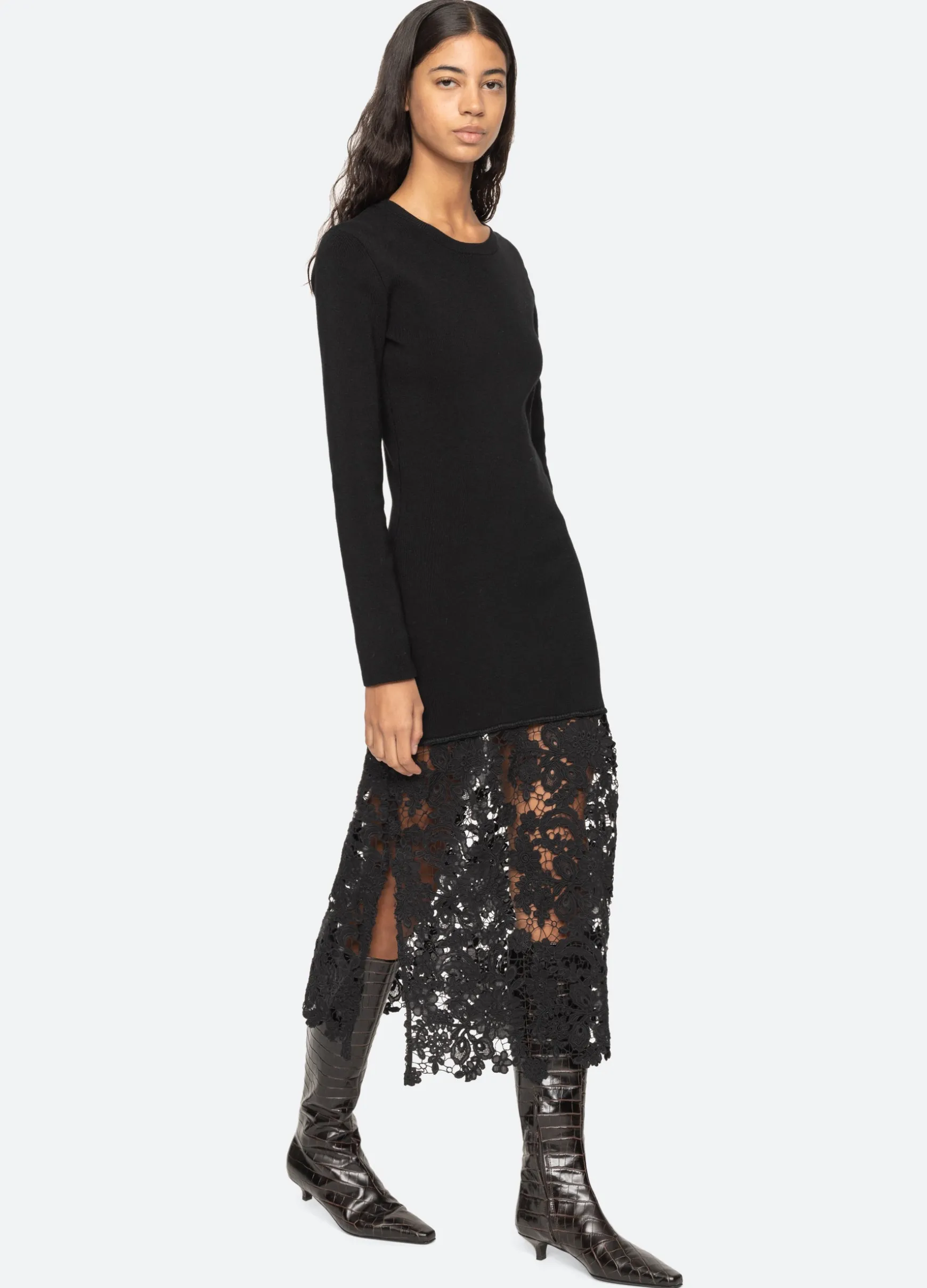 The Sabine embroidered lace combo dress features long sleeves and a sheer applique lace skirt.