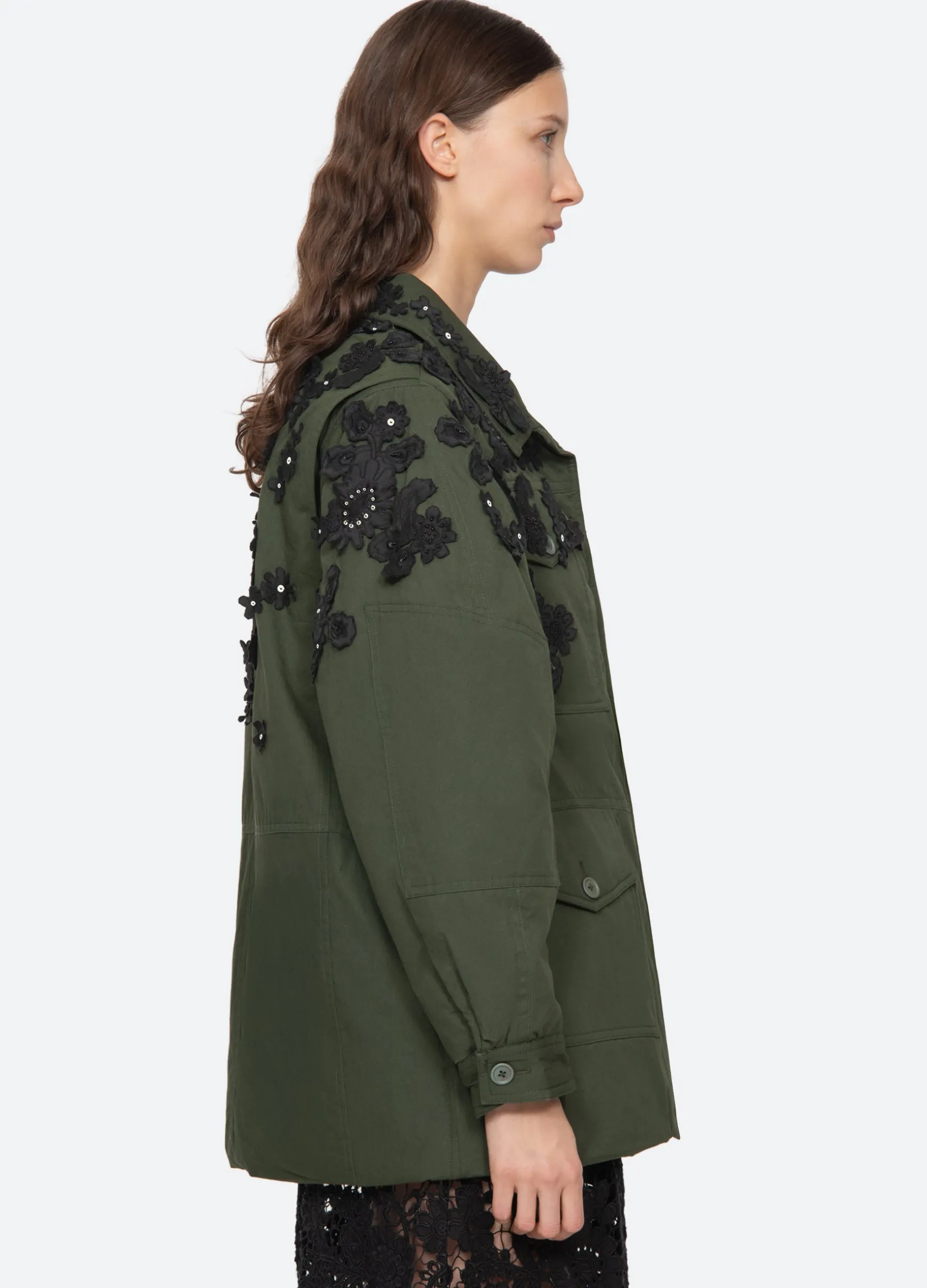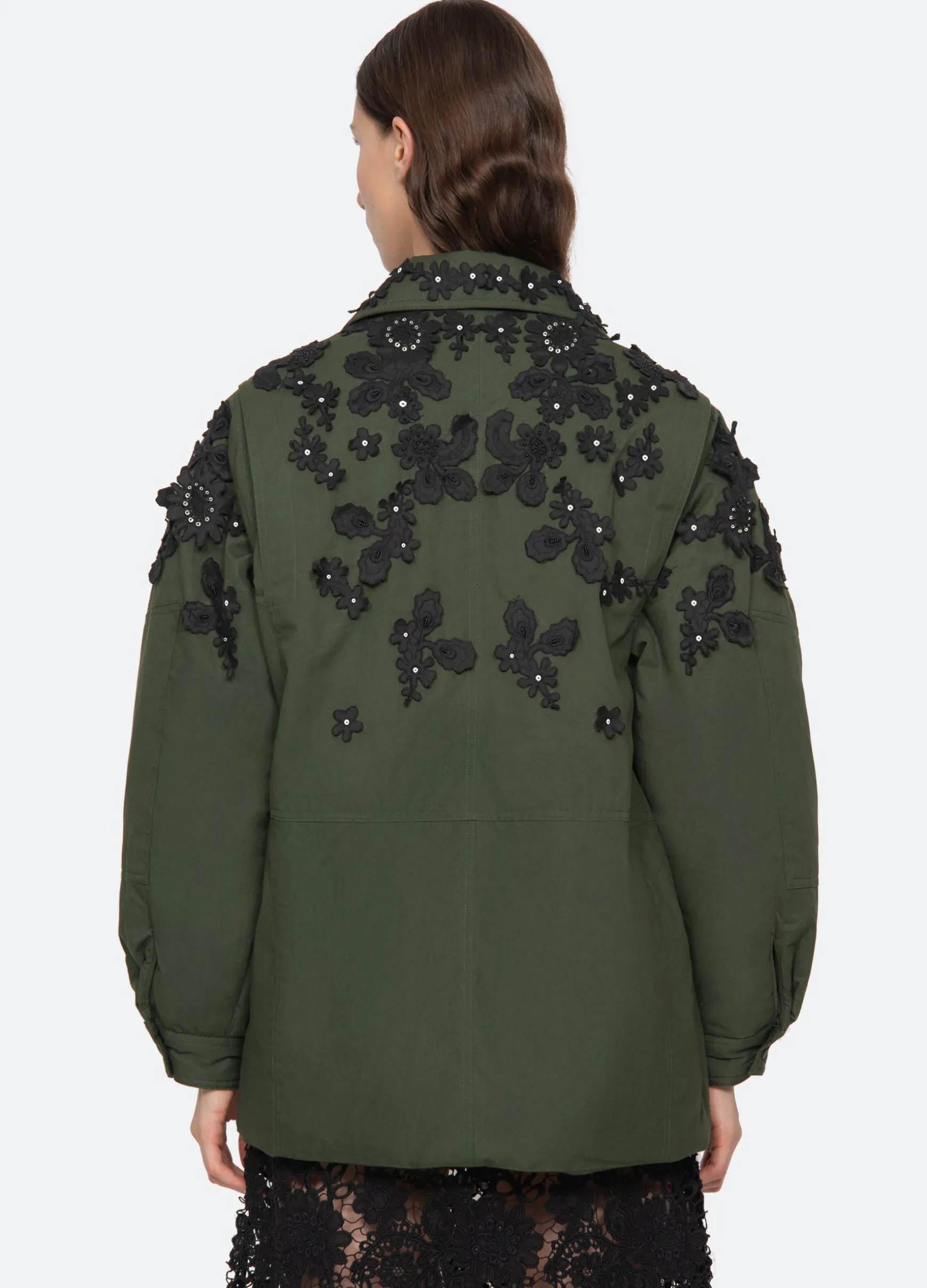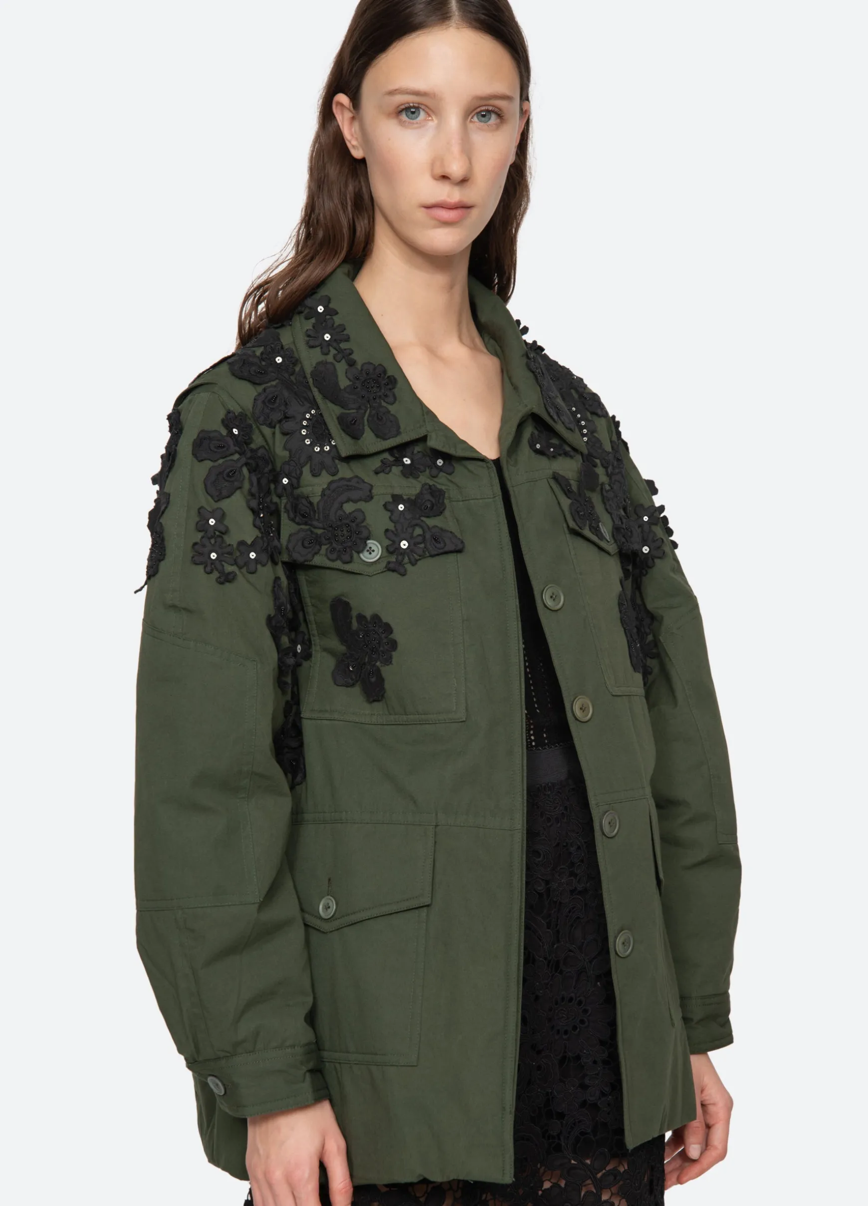 The Sabine embroidered jacket features lace appliqué embroidery throughout and beaded and sequin accents. Designed for an oversized, relaxed fit.