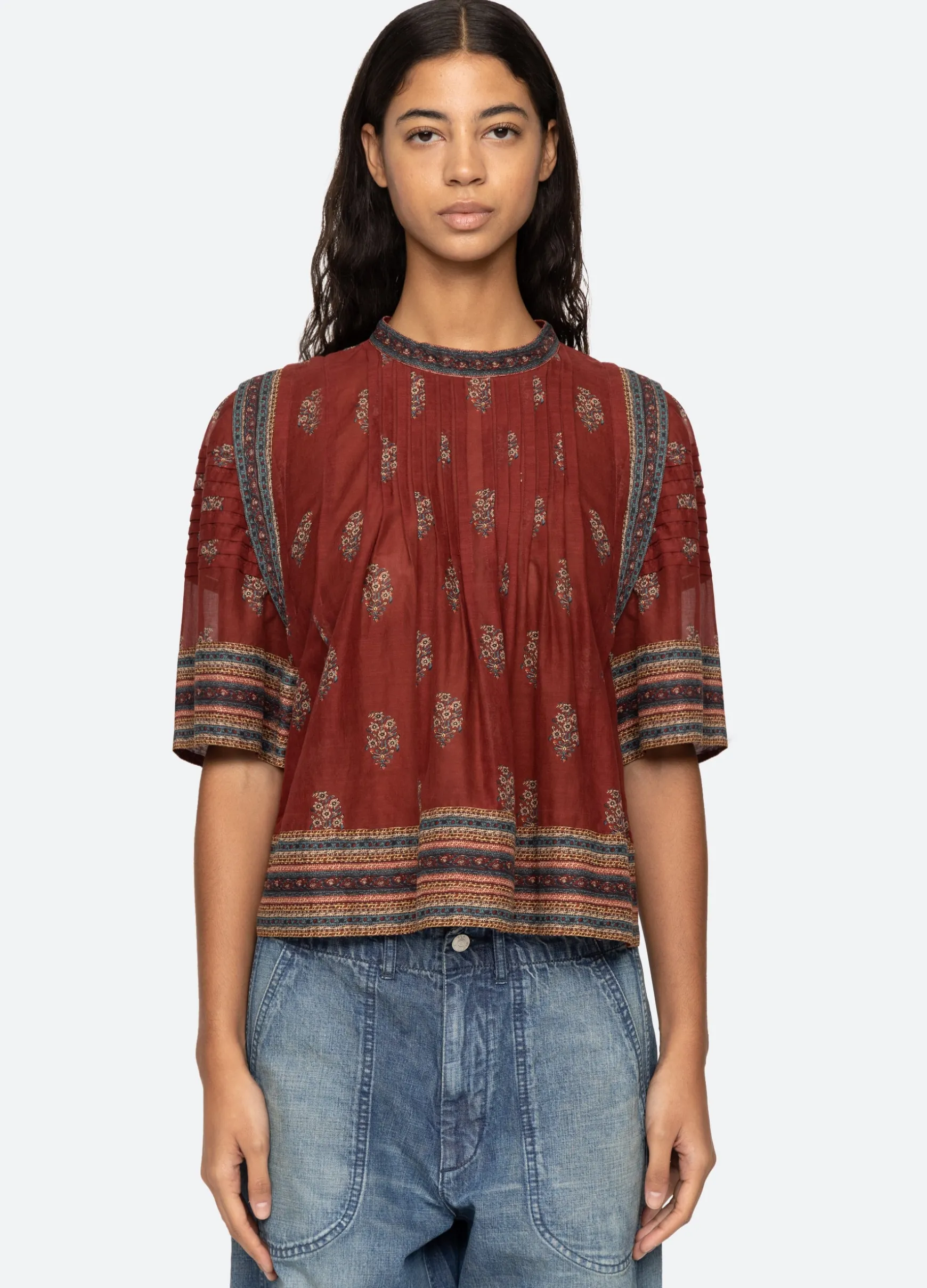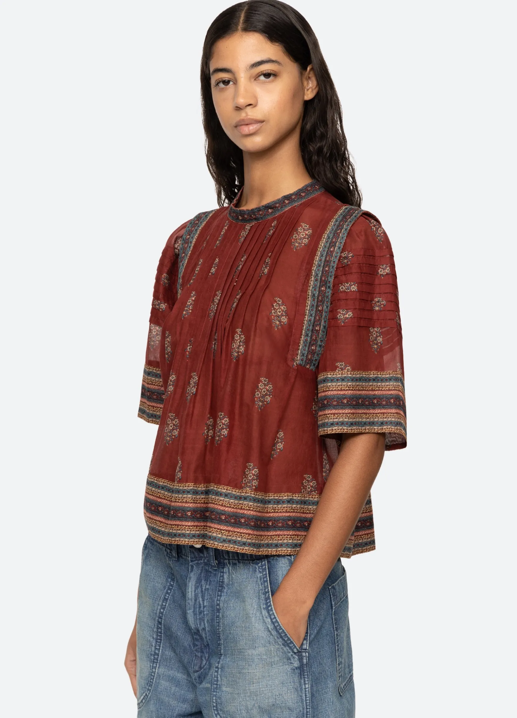 The Sierra floral print border top features pleated detailing, short sleeves and is designed for an easy, relaxed fit.