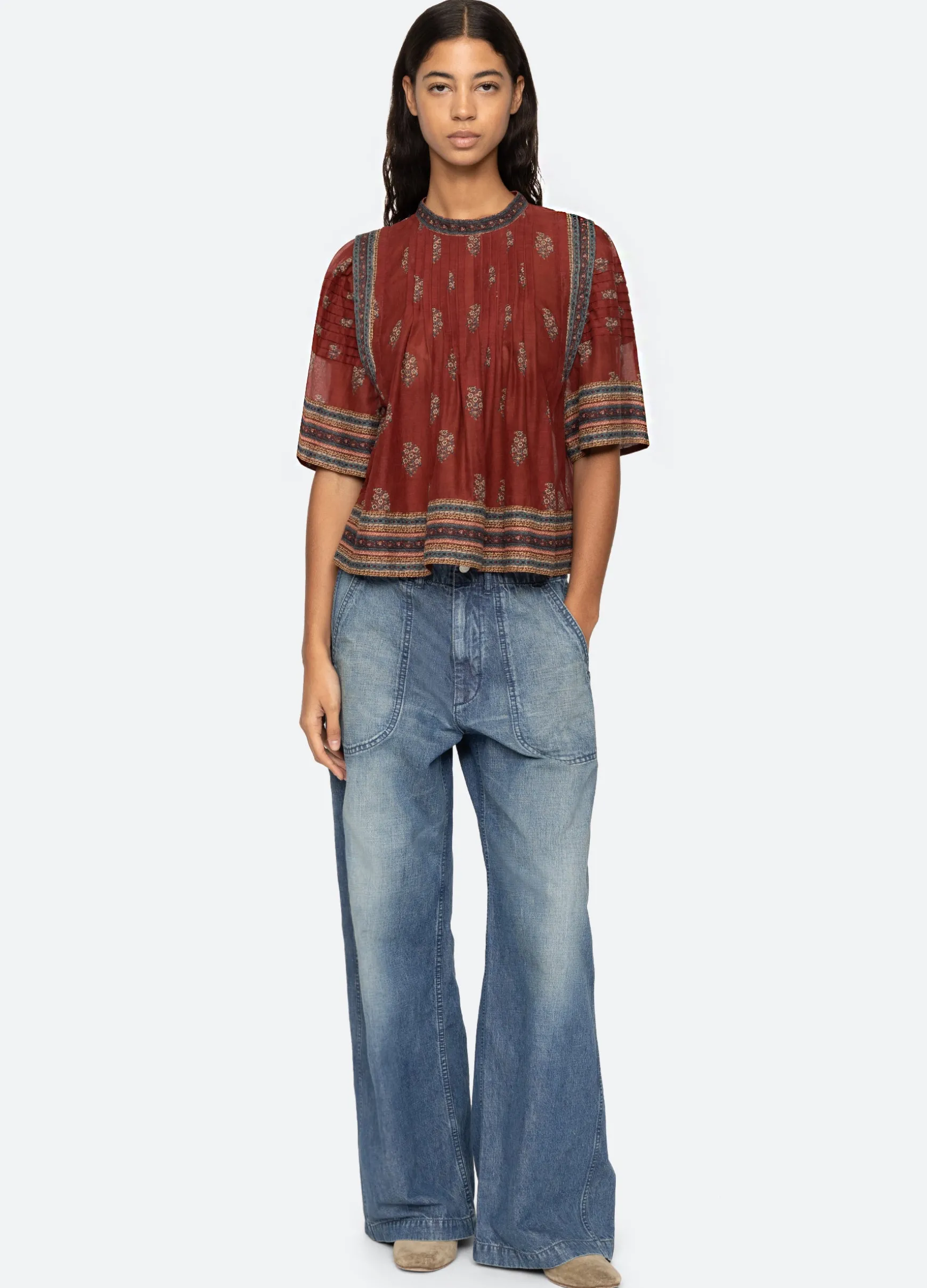 100% cottonbutton back closuredesigned for a relaxed fitmodel is 5’10” and wearing a size SThe Sierra floral print bord…