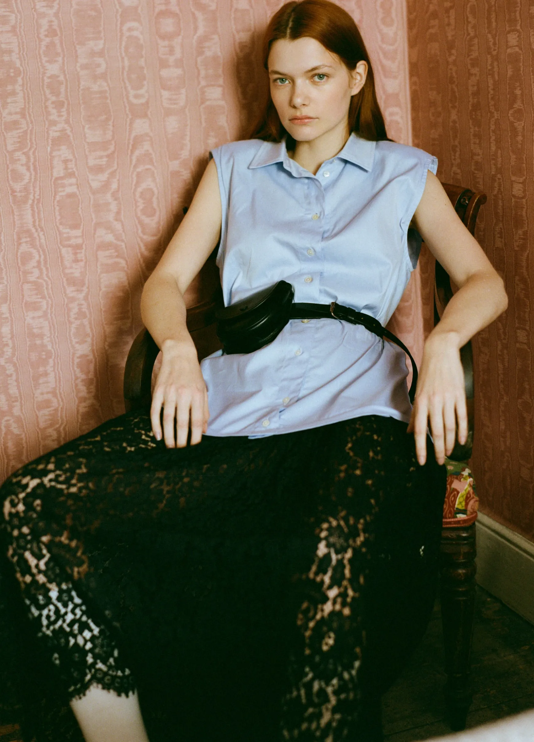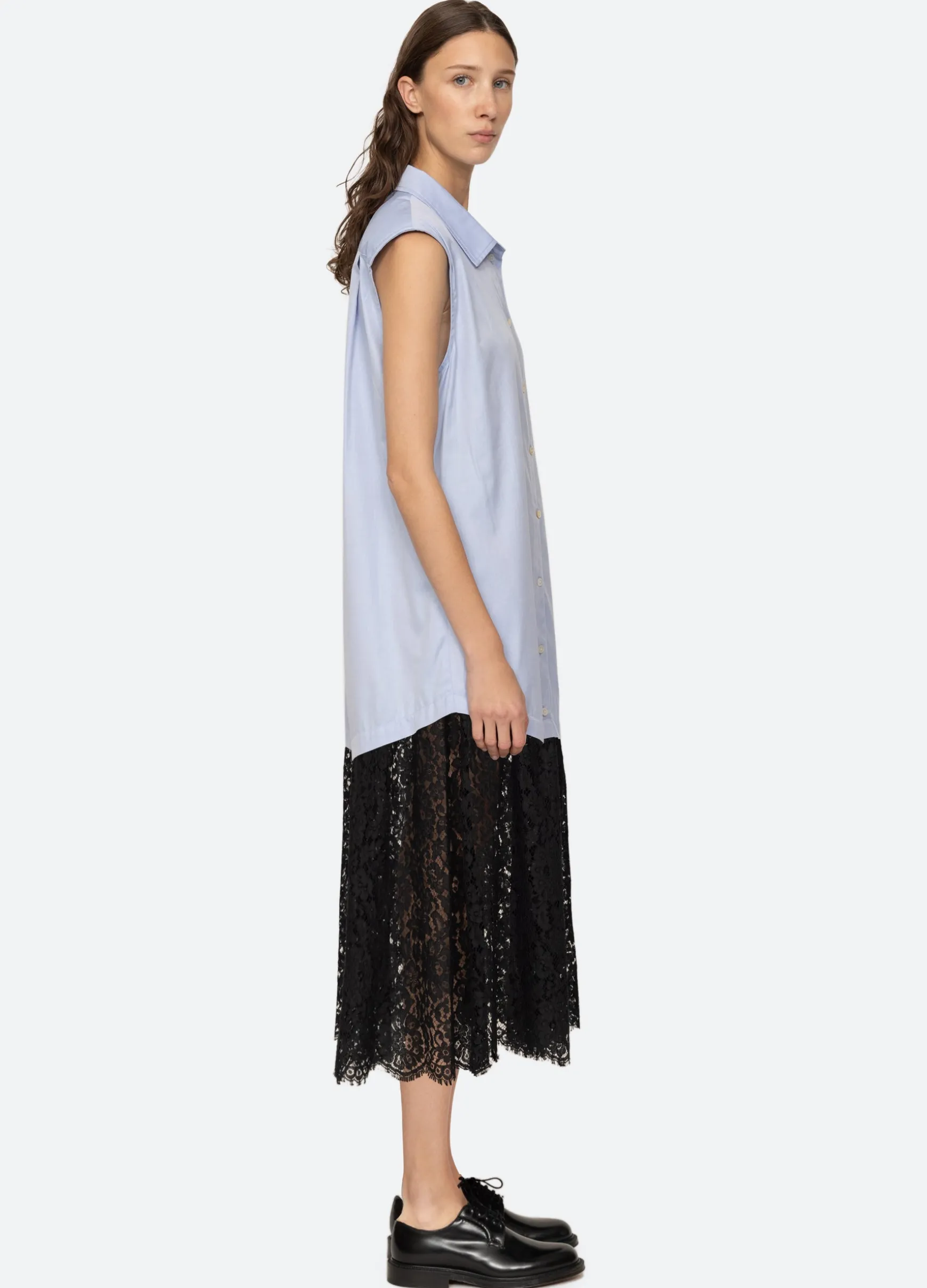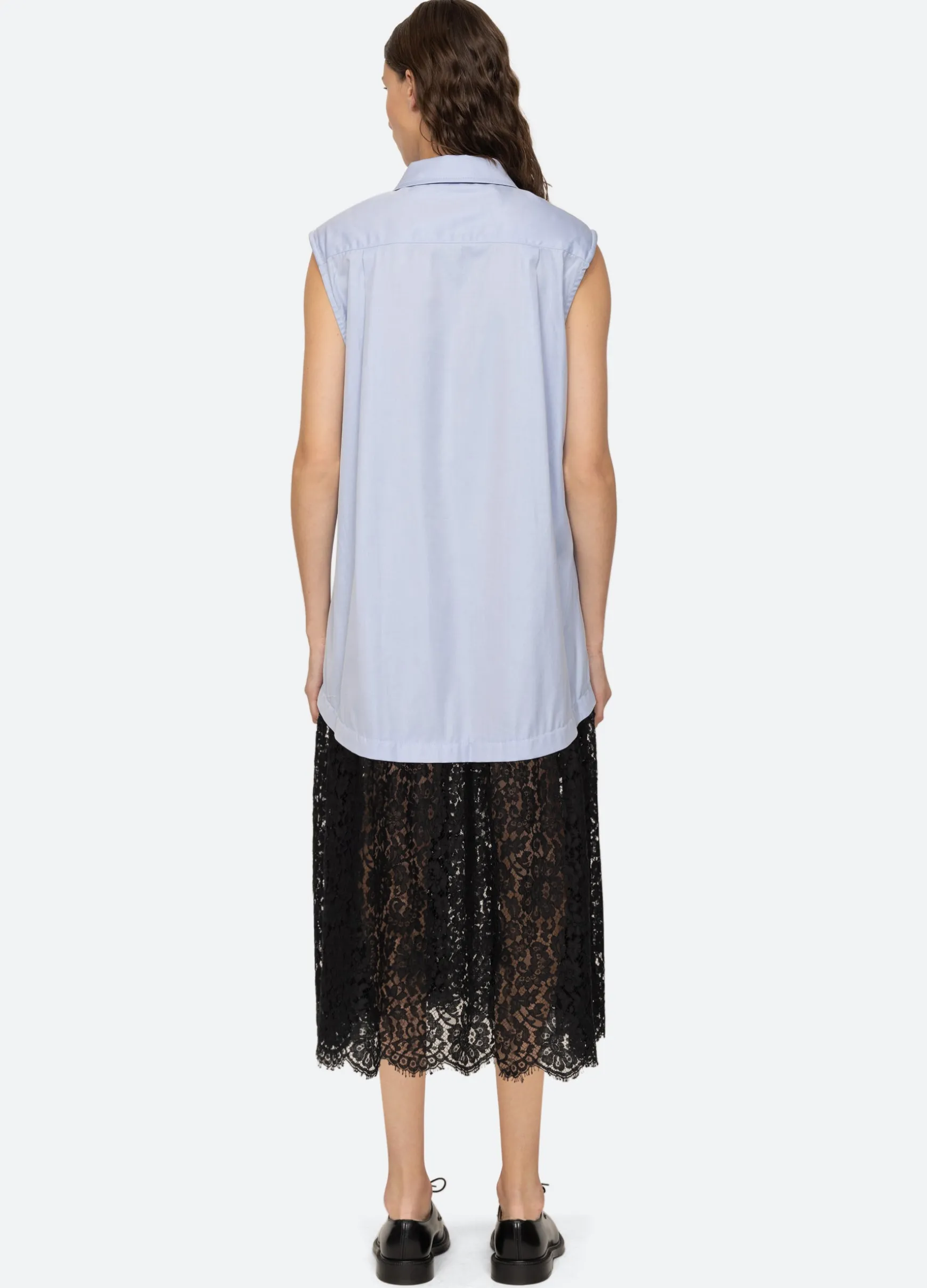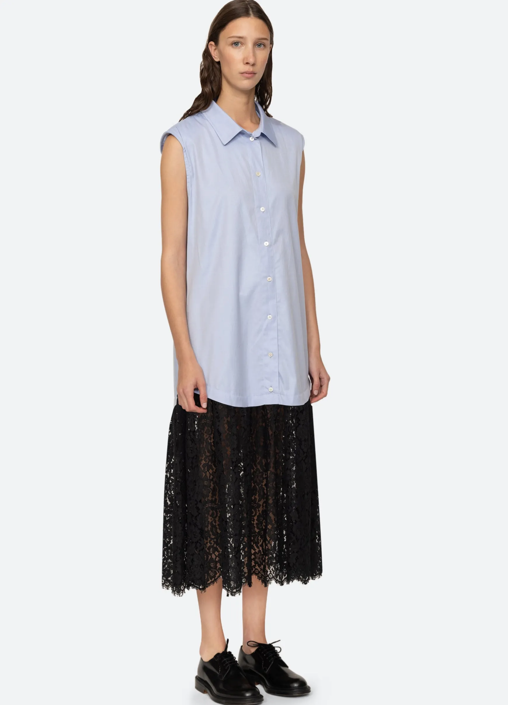 TheSuzy sleevelesscombo dress features a button down shirt attached to a sheer applique lace skirt. Designed for an easy, relaxed fit.