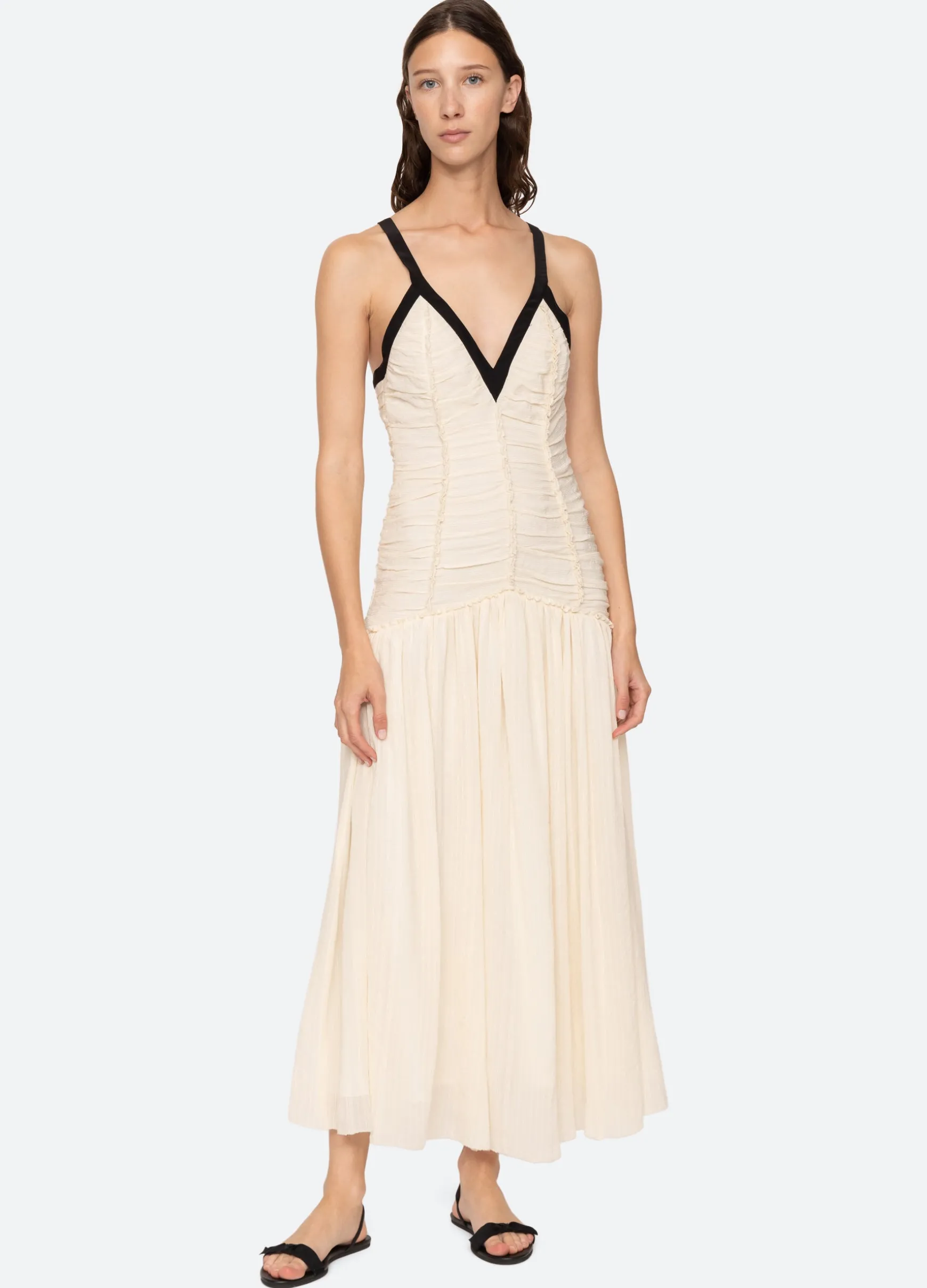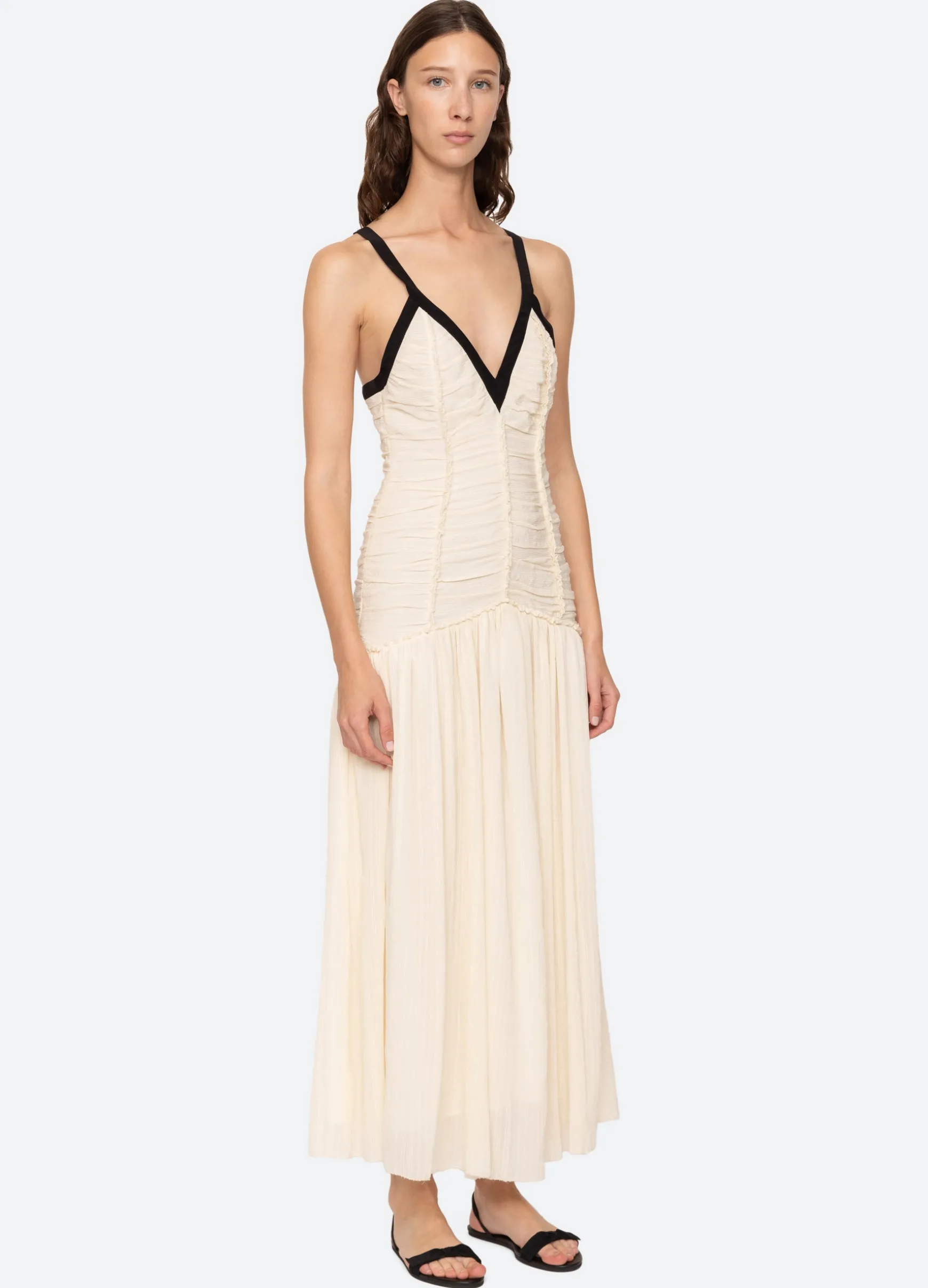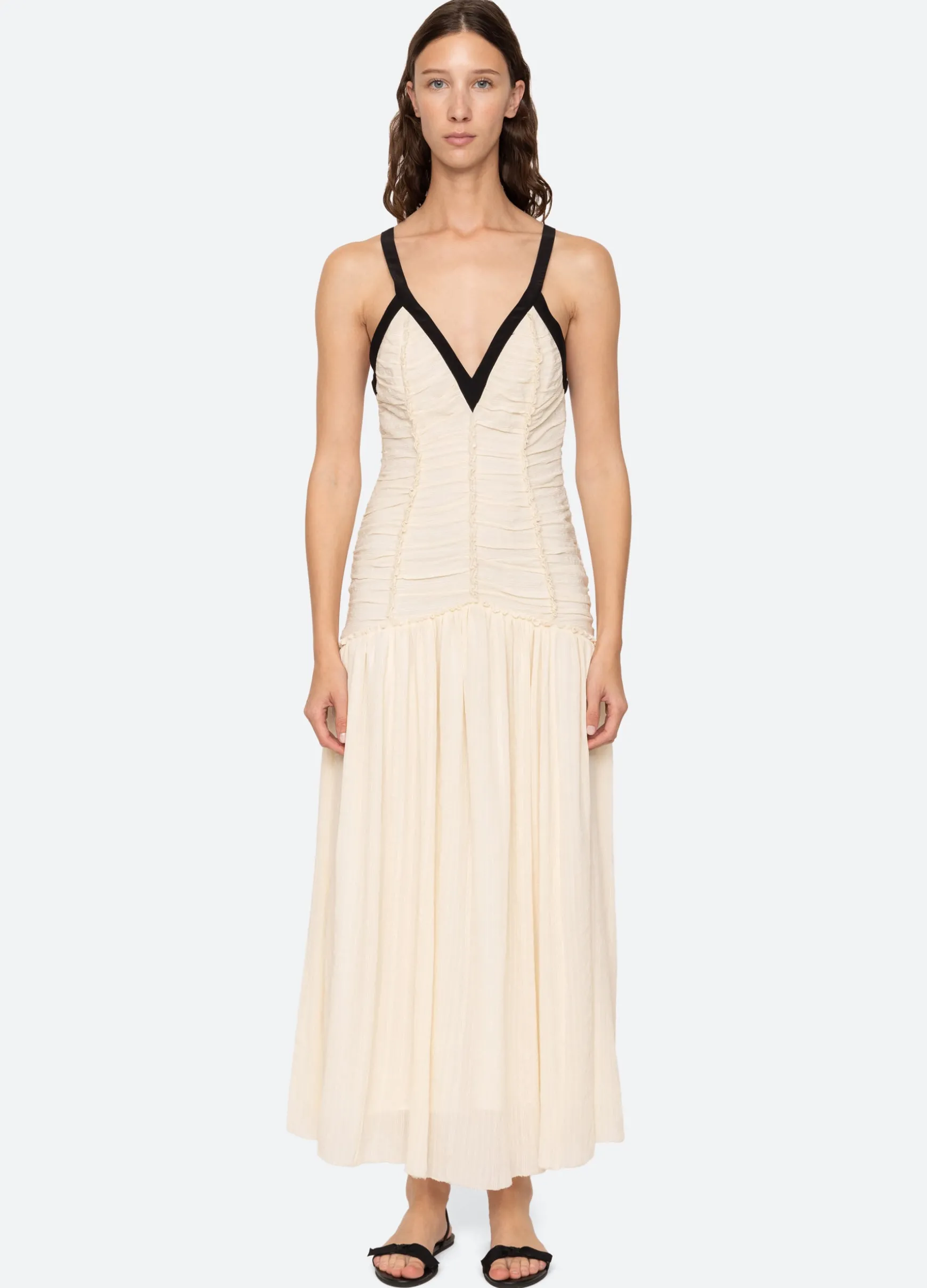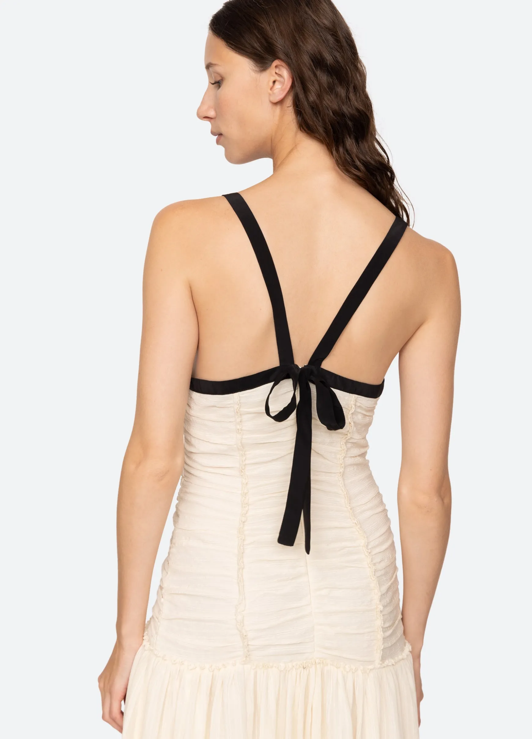 TheTatum dress features a v-neckline, ruchedbodicewithpleating and ruffle detailing.