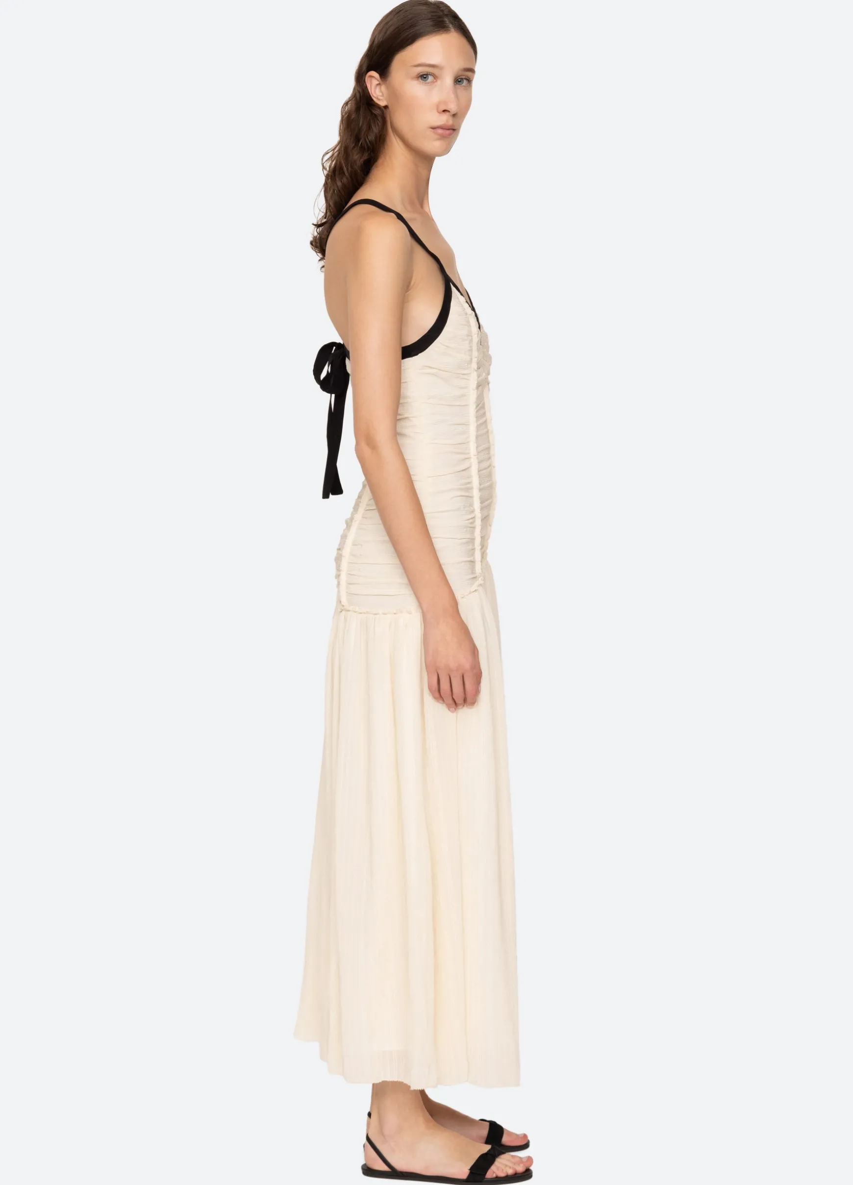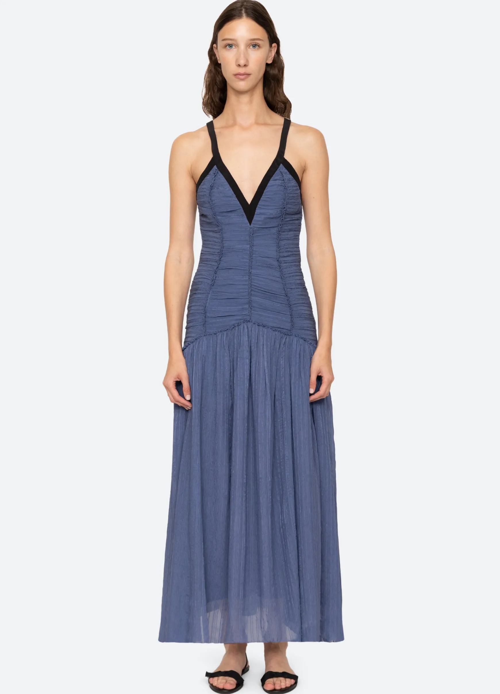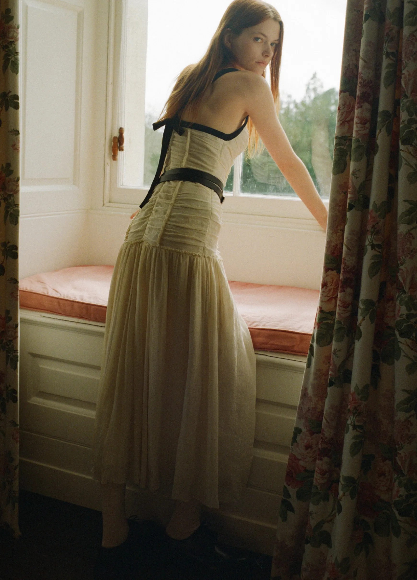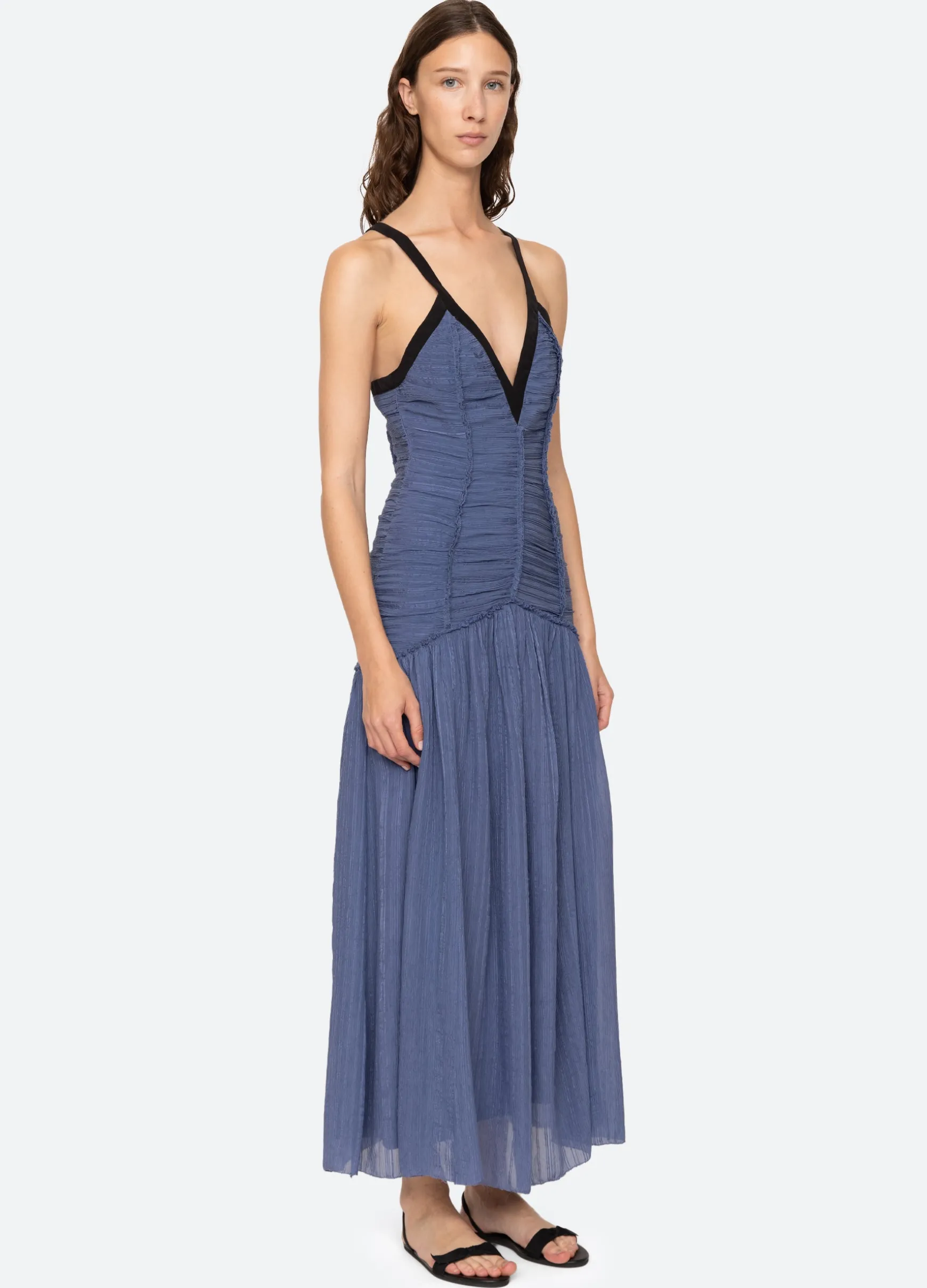 TheTatum dress features a v-neckline, ruchedbodicewithpleating and ruffle detailing.