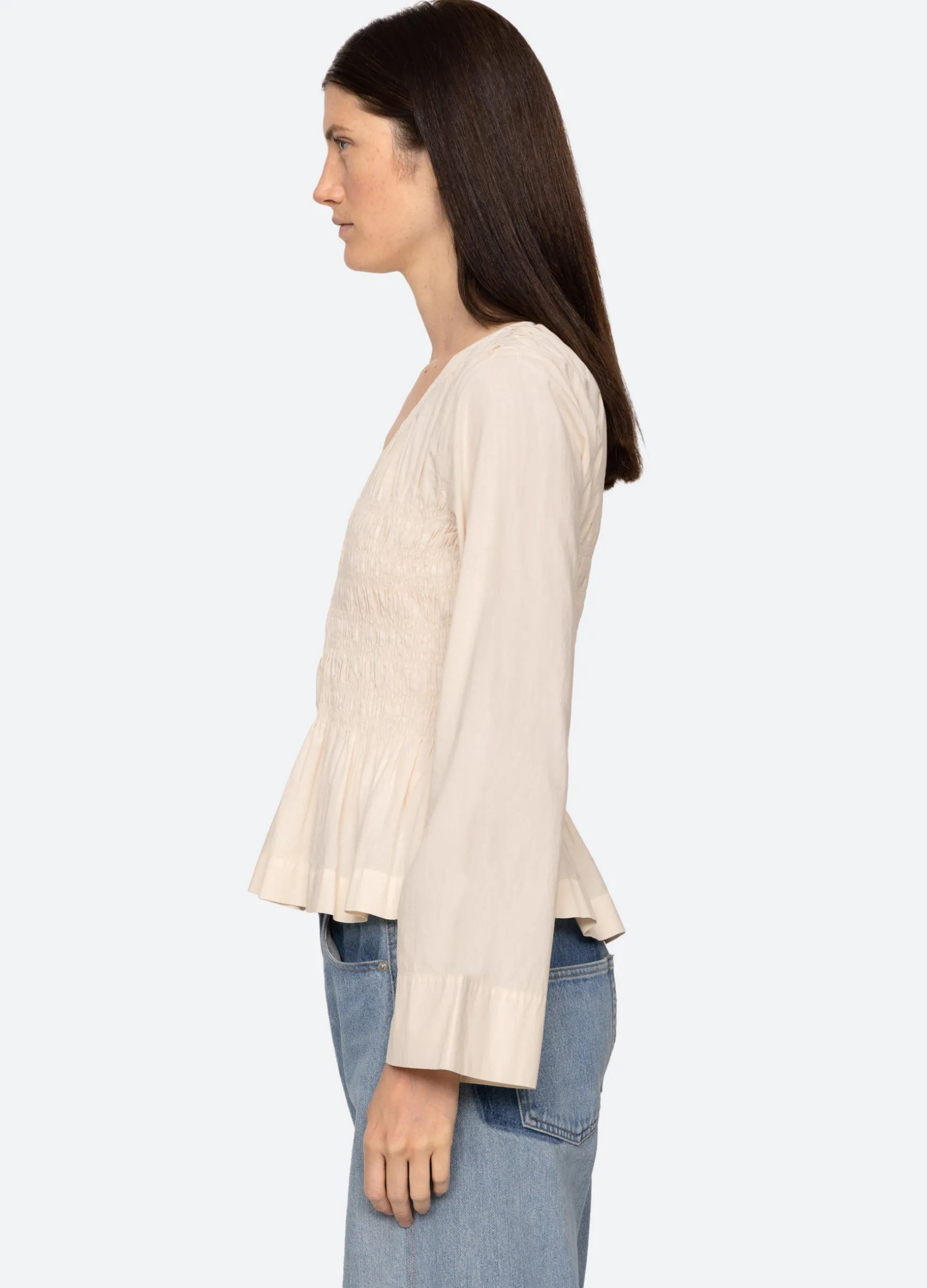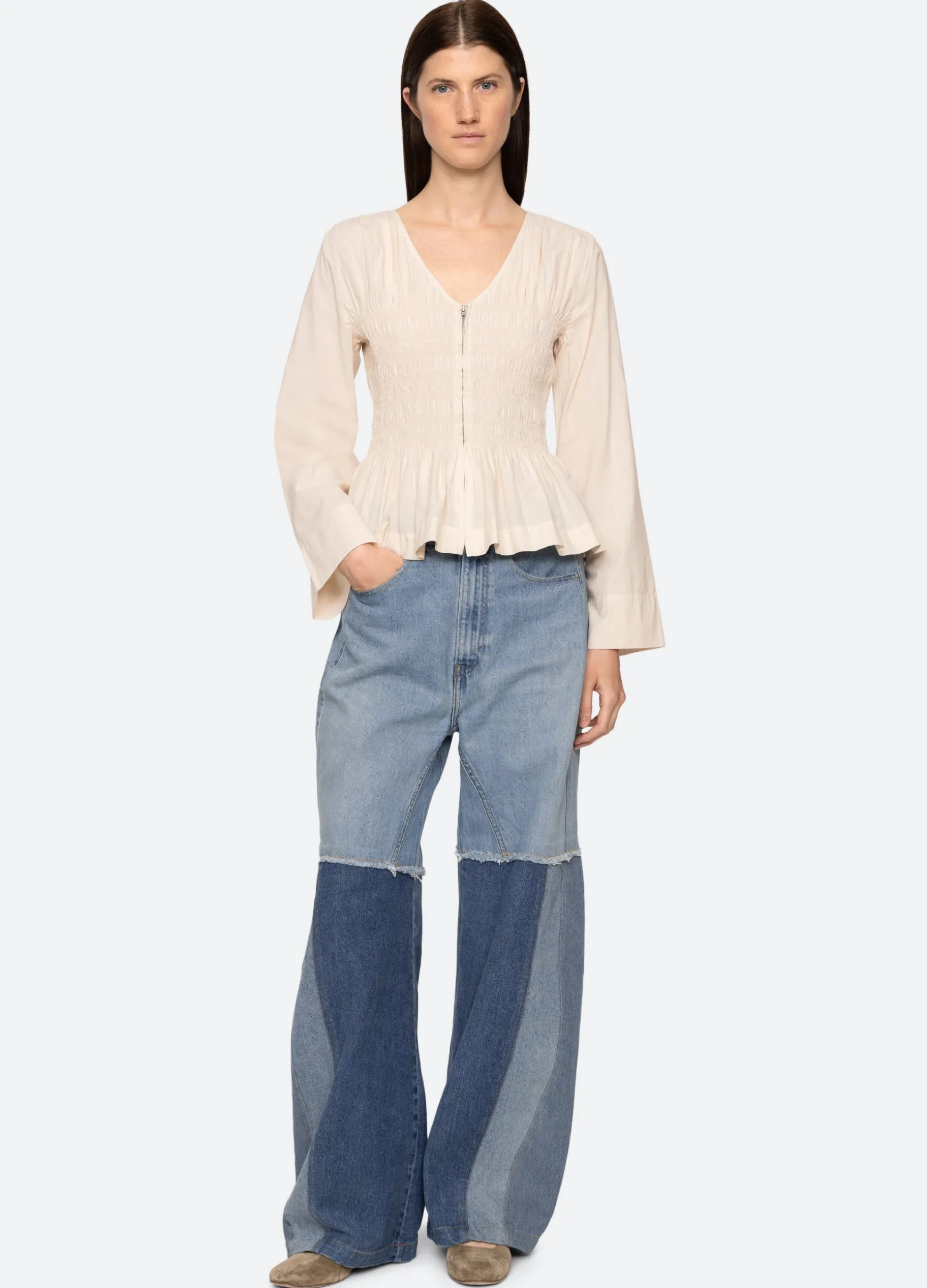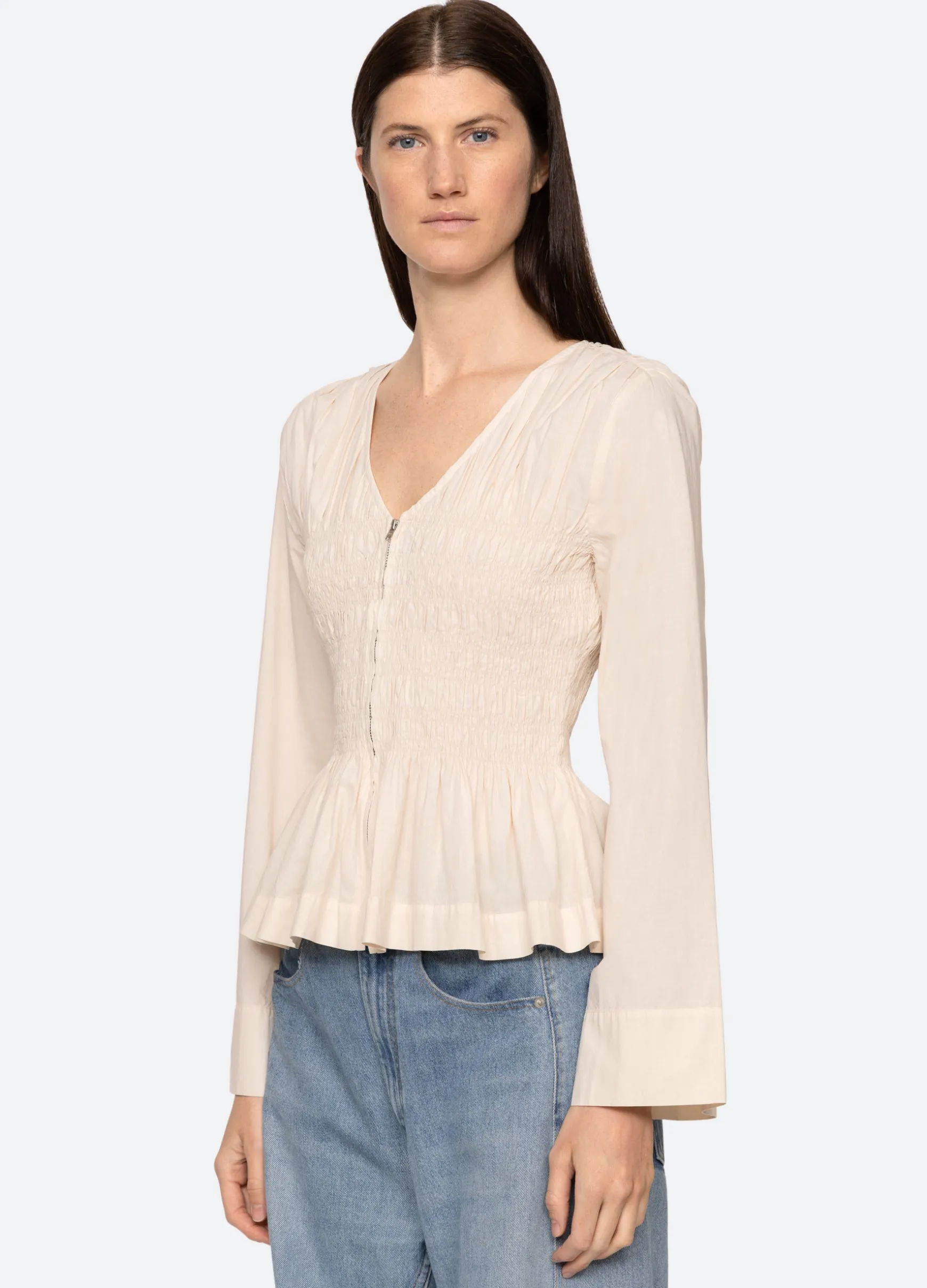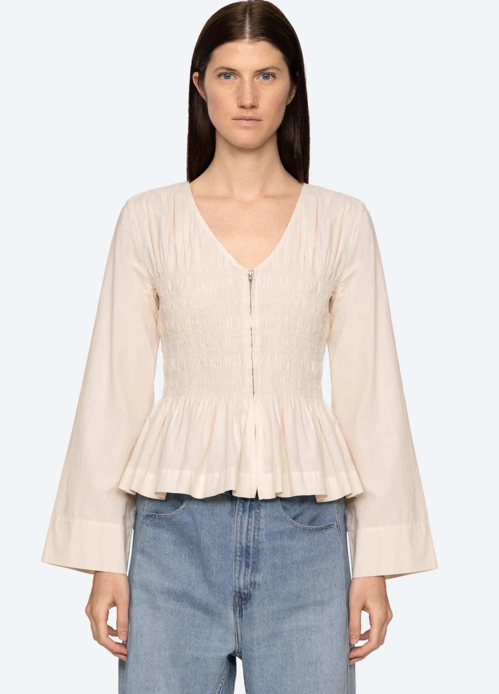 The Teri top features long voluminous sleeves, v-neckline, smocked bodice, exposed front zipper and peplum hem.