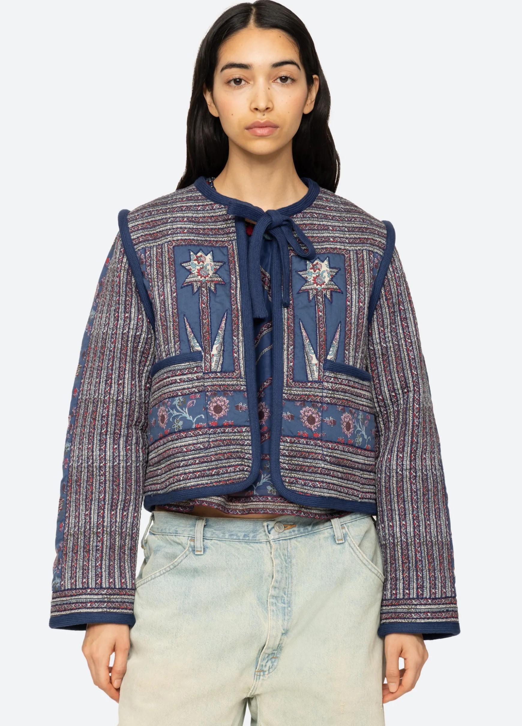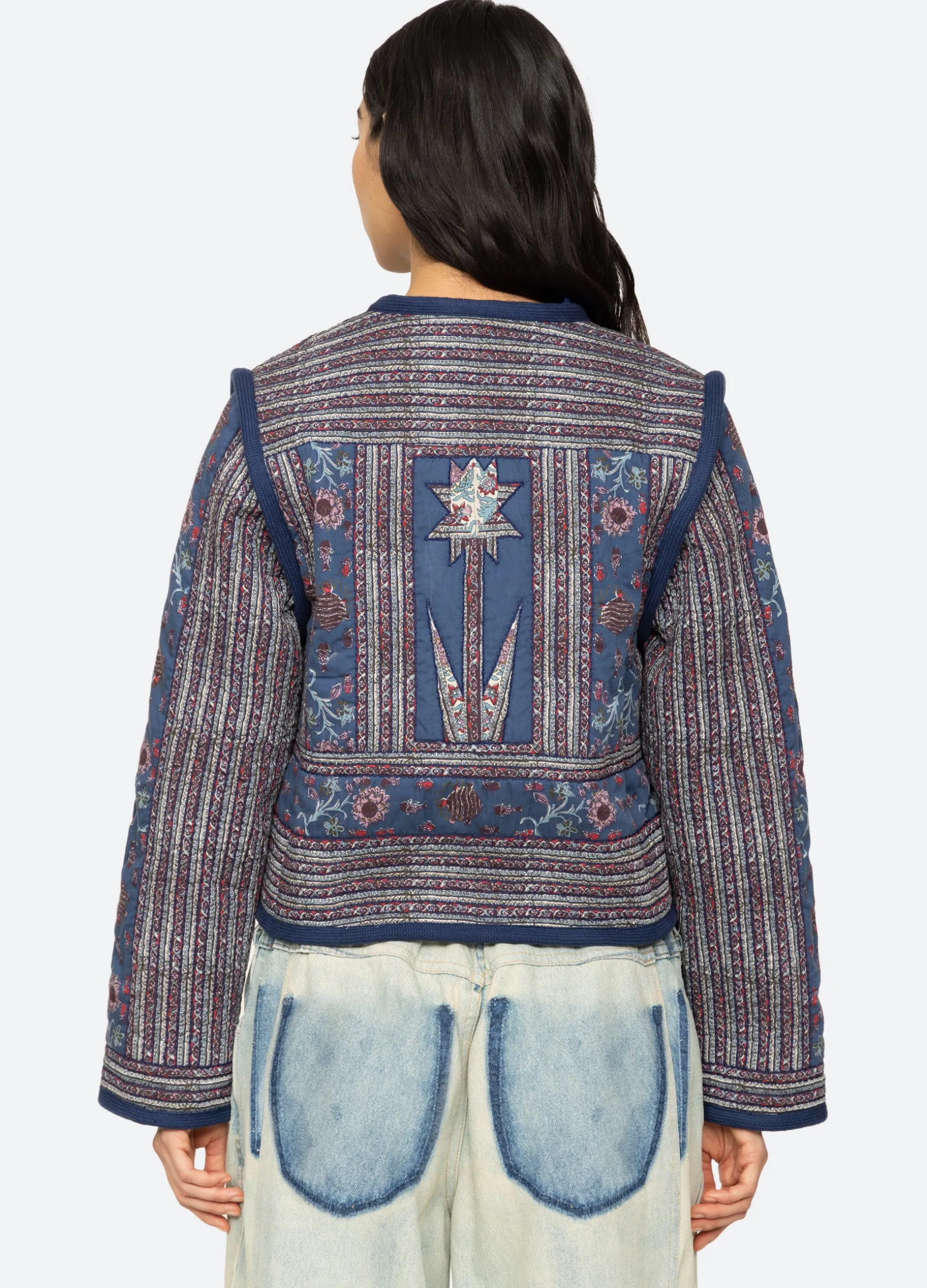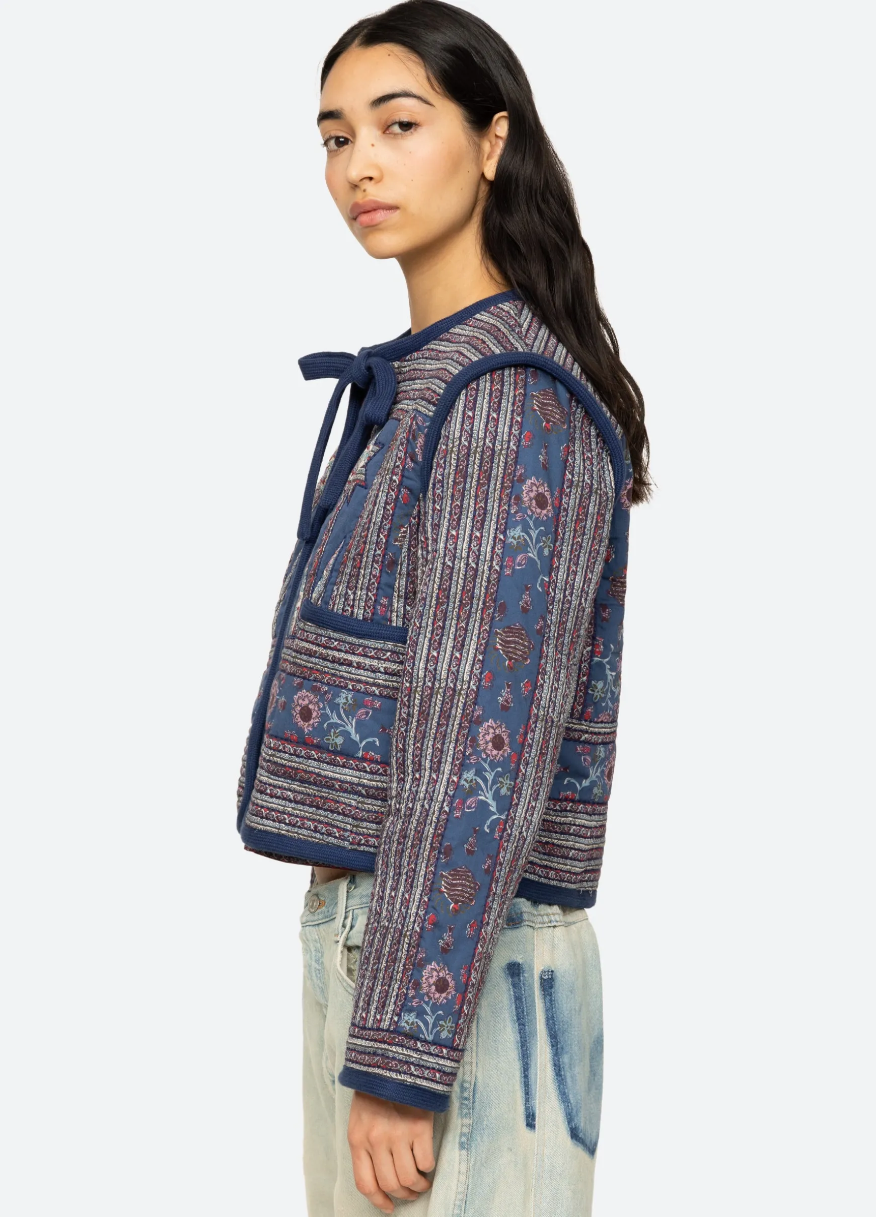 The Valeria floral print jacketfeatures quilted detailing and contrast trim accents.