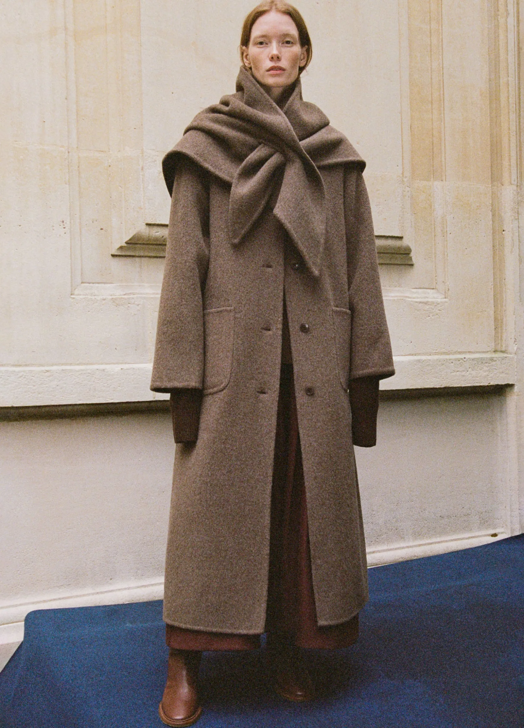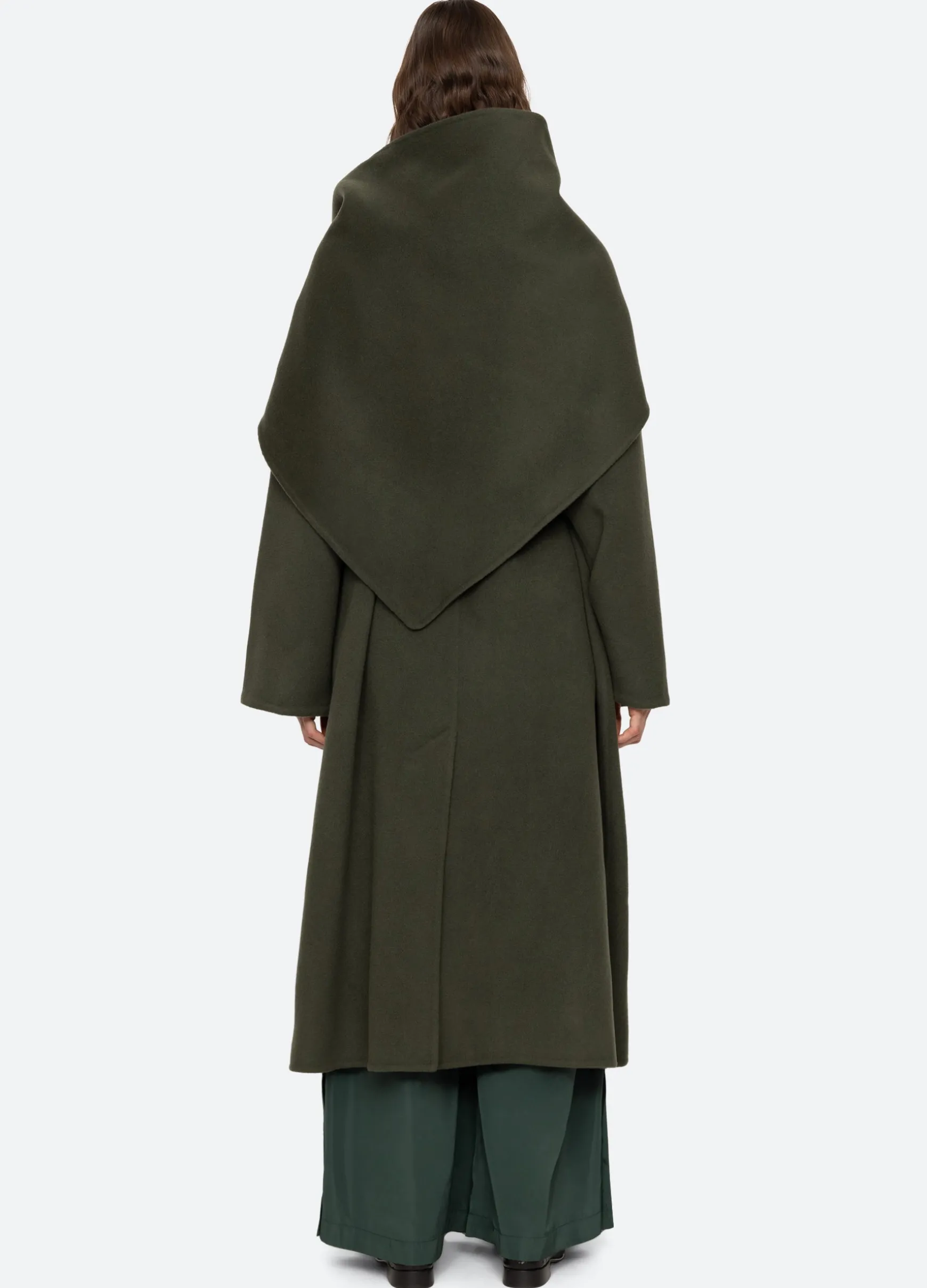 The Viv wool coat features an oversized detachable scarf and removable belt.