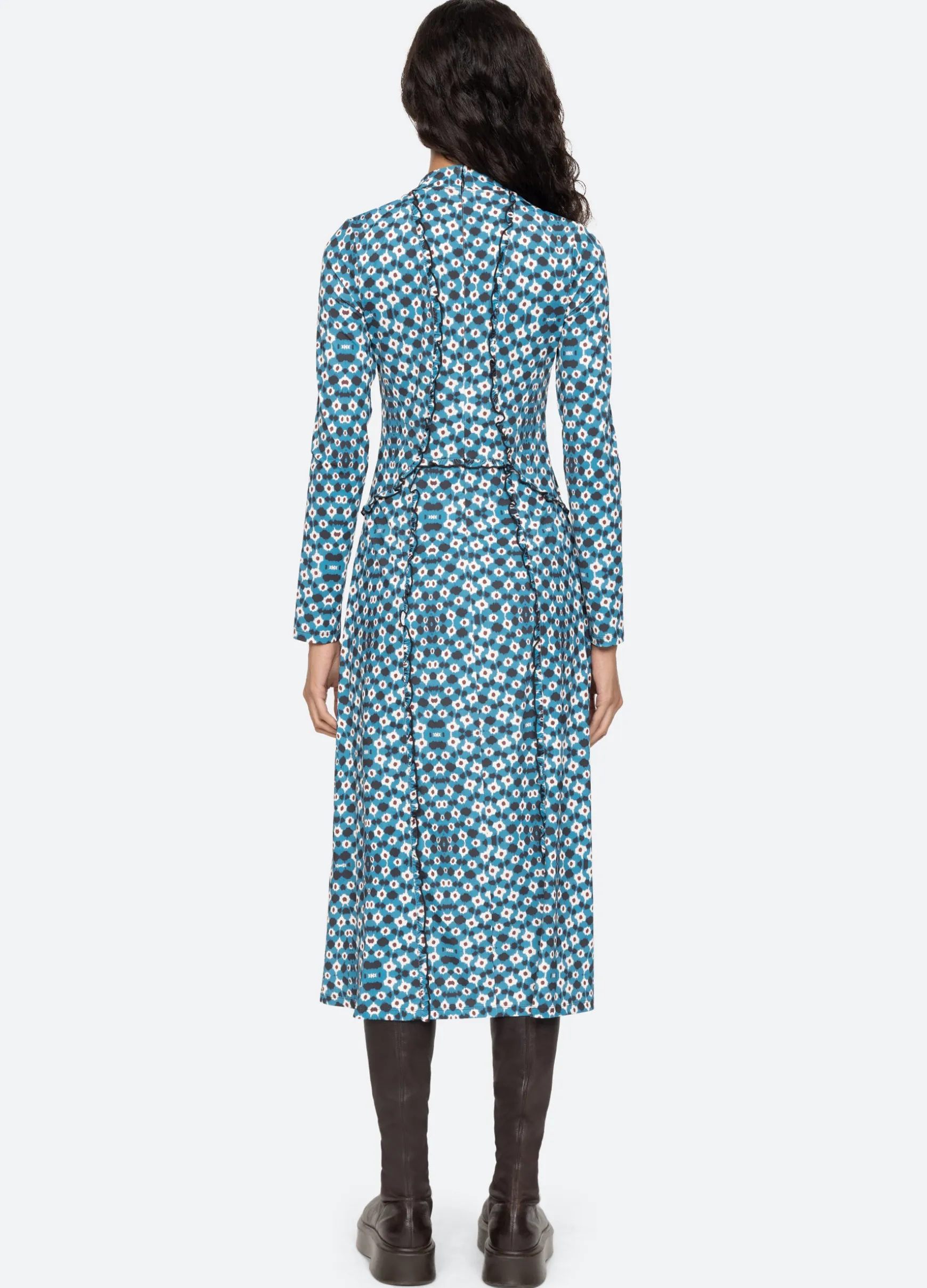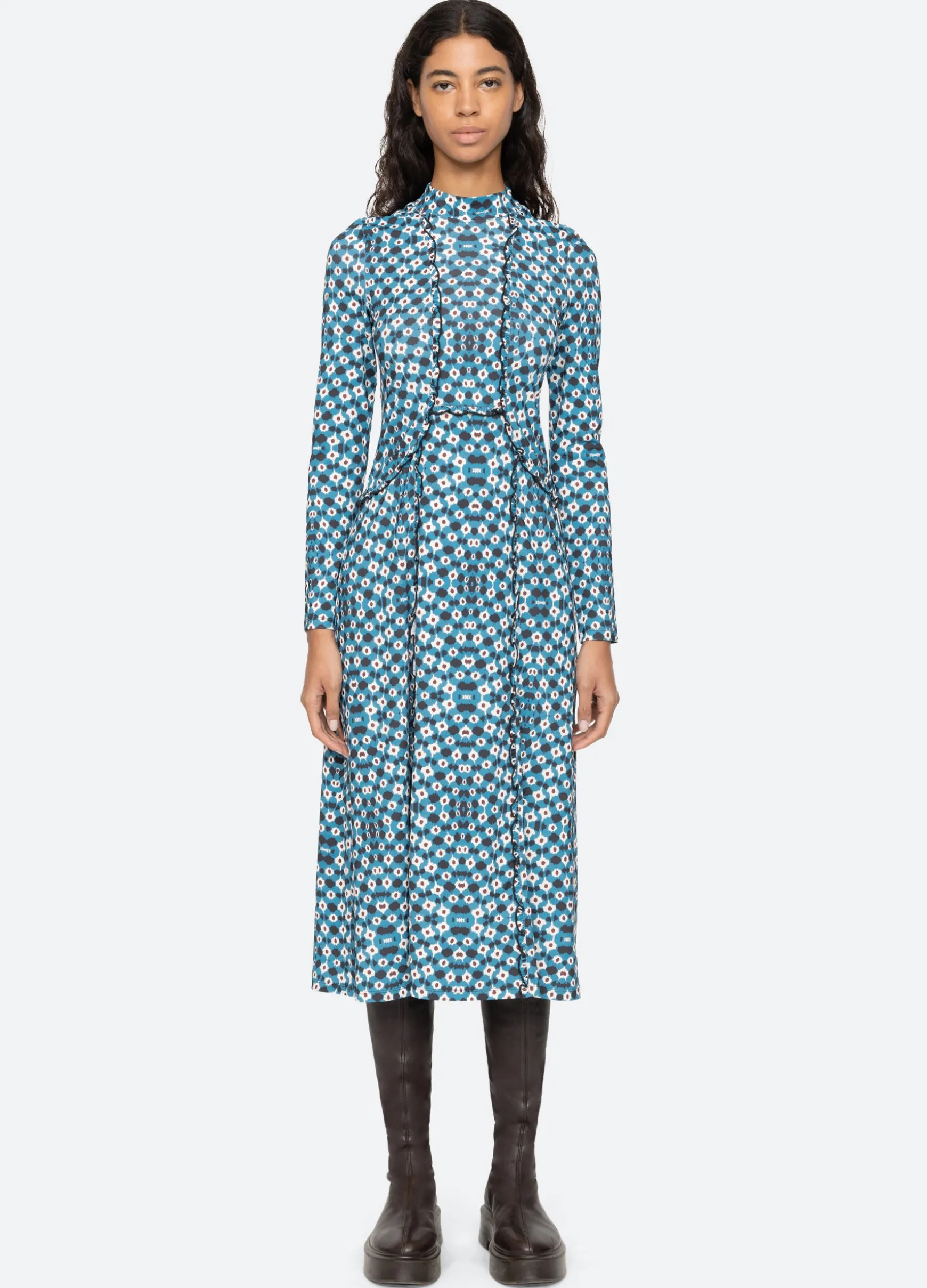 An online and in store exclusive. The Zina graphic print dress features ruffle detailing, long sleeves, turtleneck, and midi silhouette.
