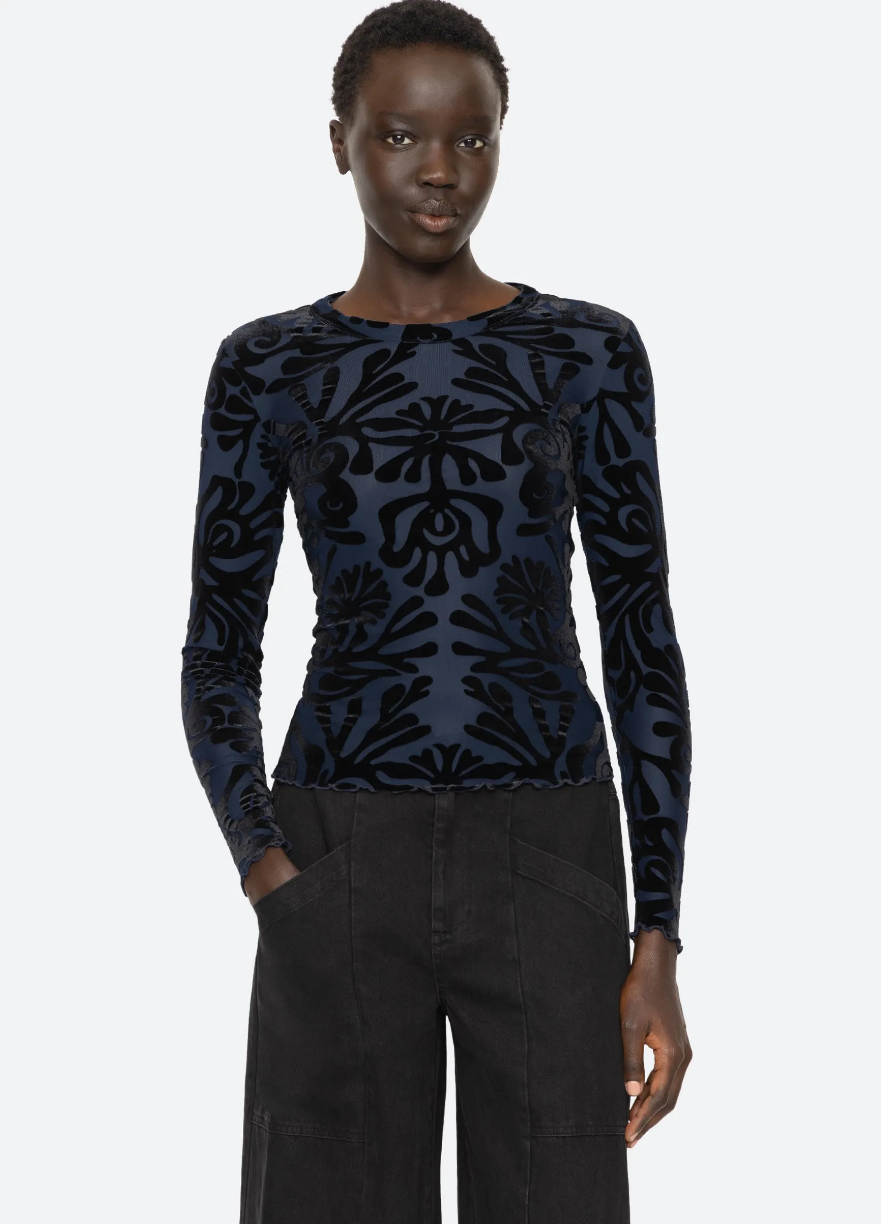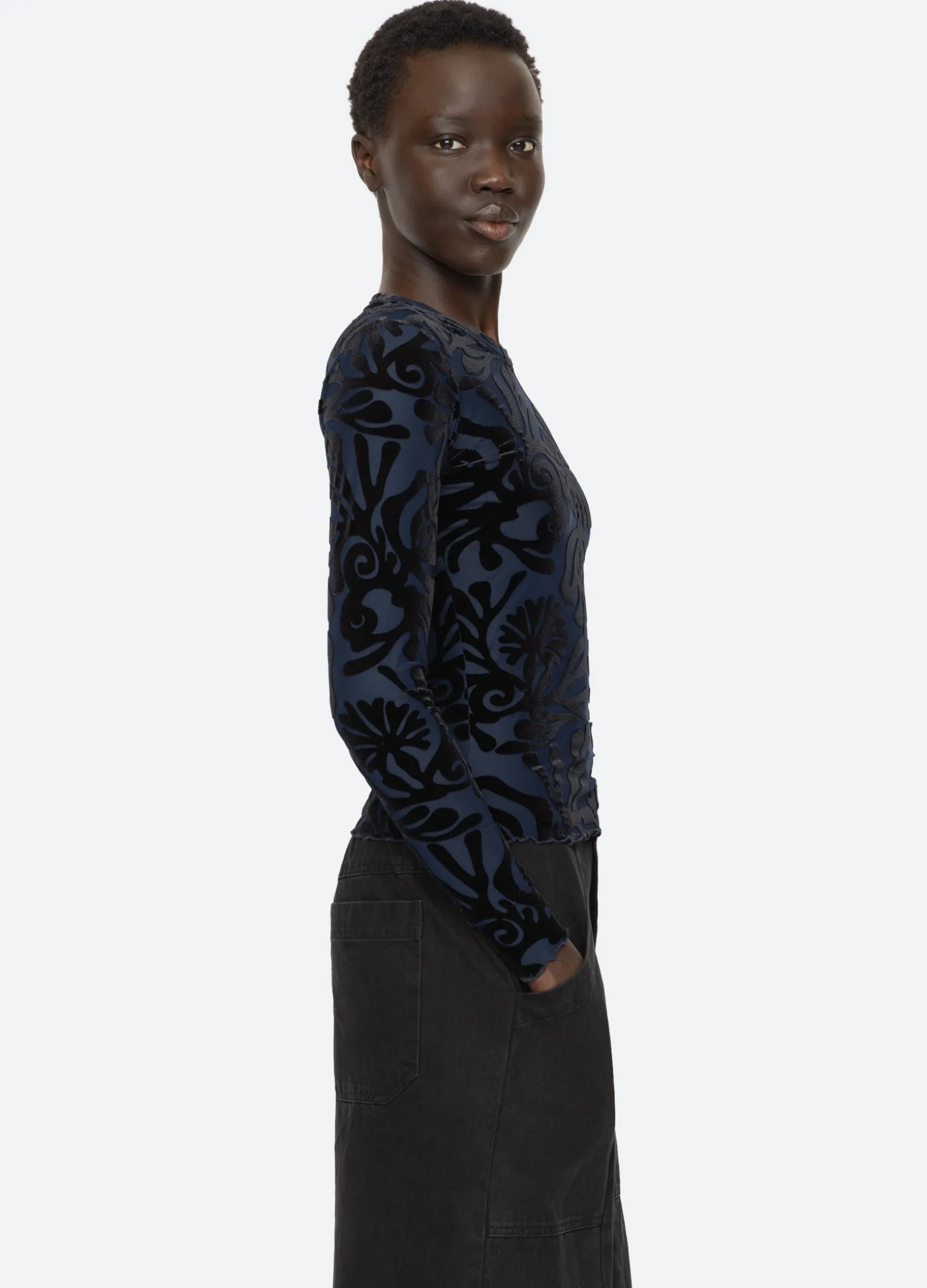 The Alia stretch velvet burnout long sleeve top features a slim fit and geometric design.