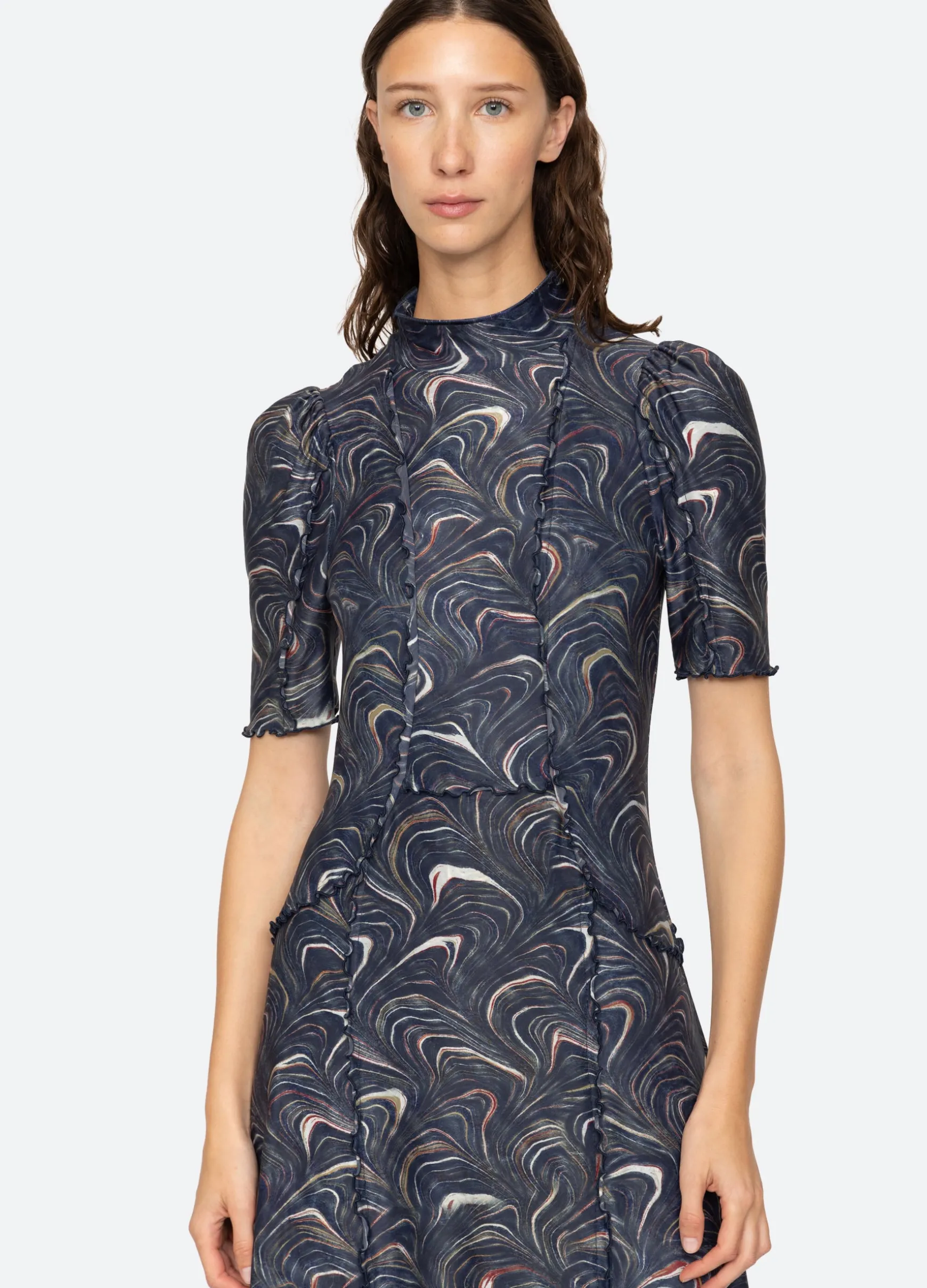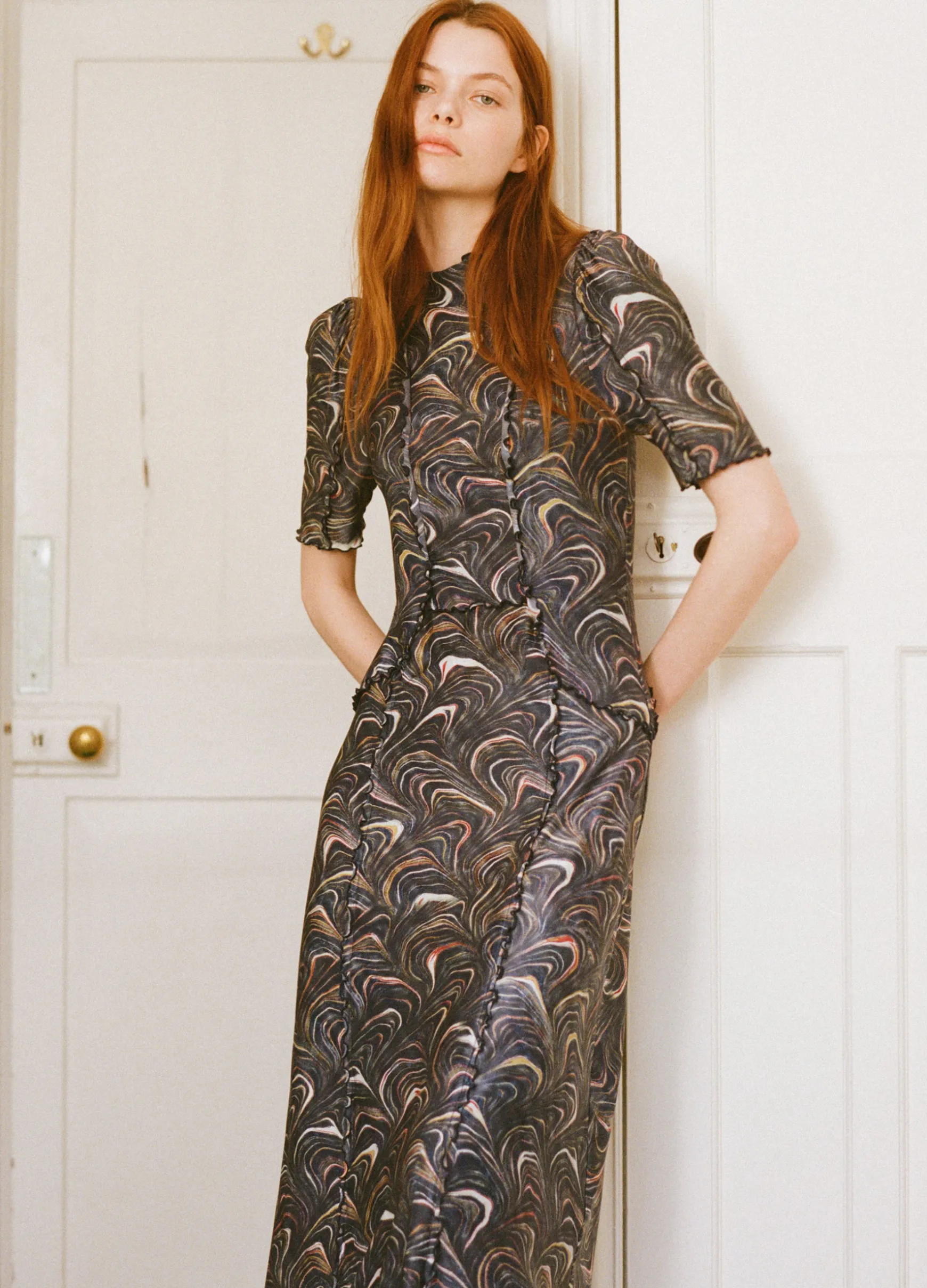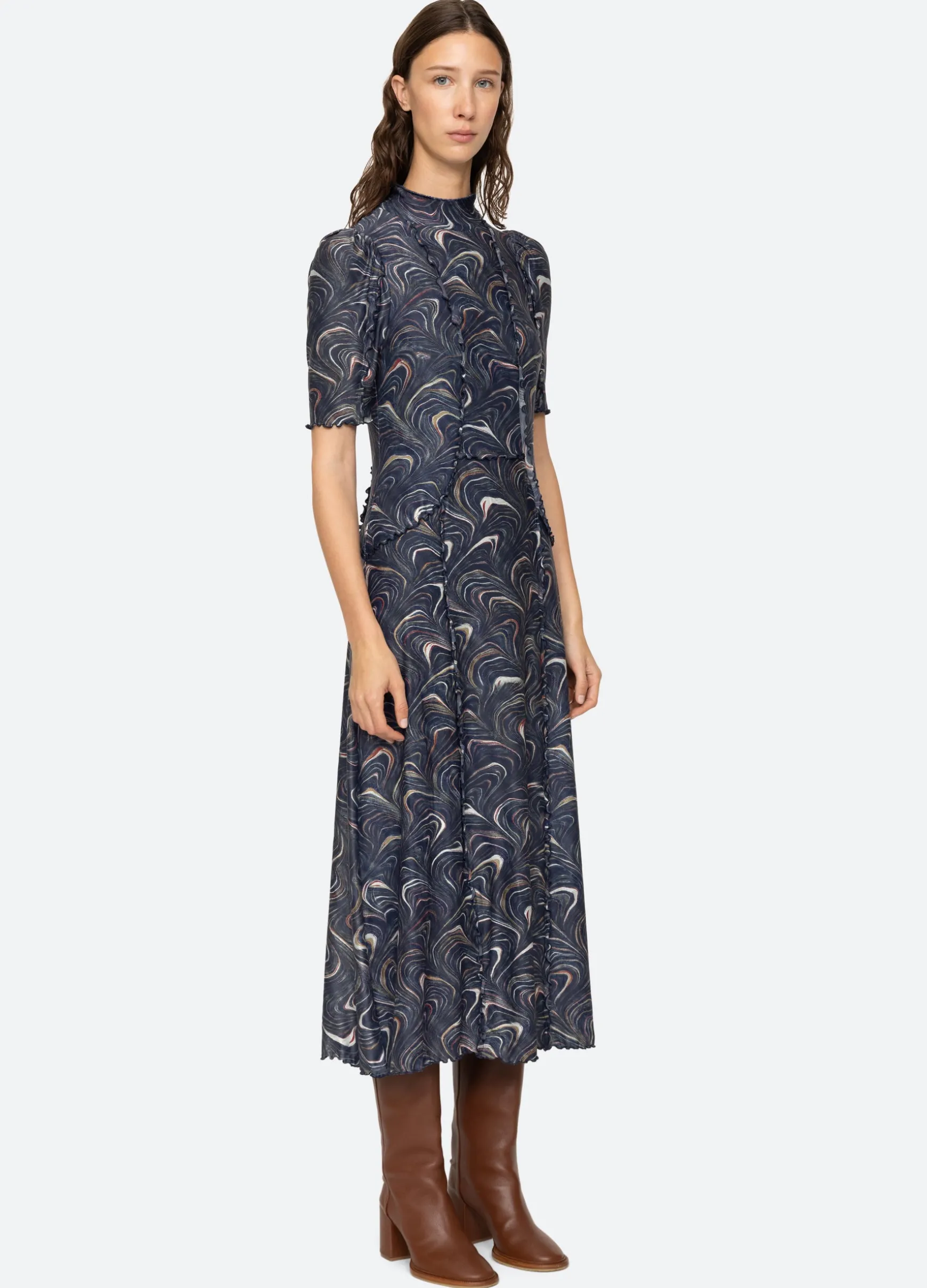 The Amara marble print short sleeve dress features ruffle detailing and midi silhouette.