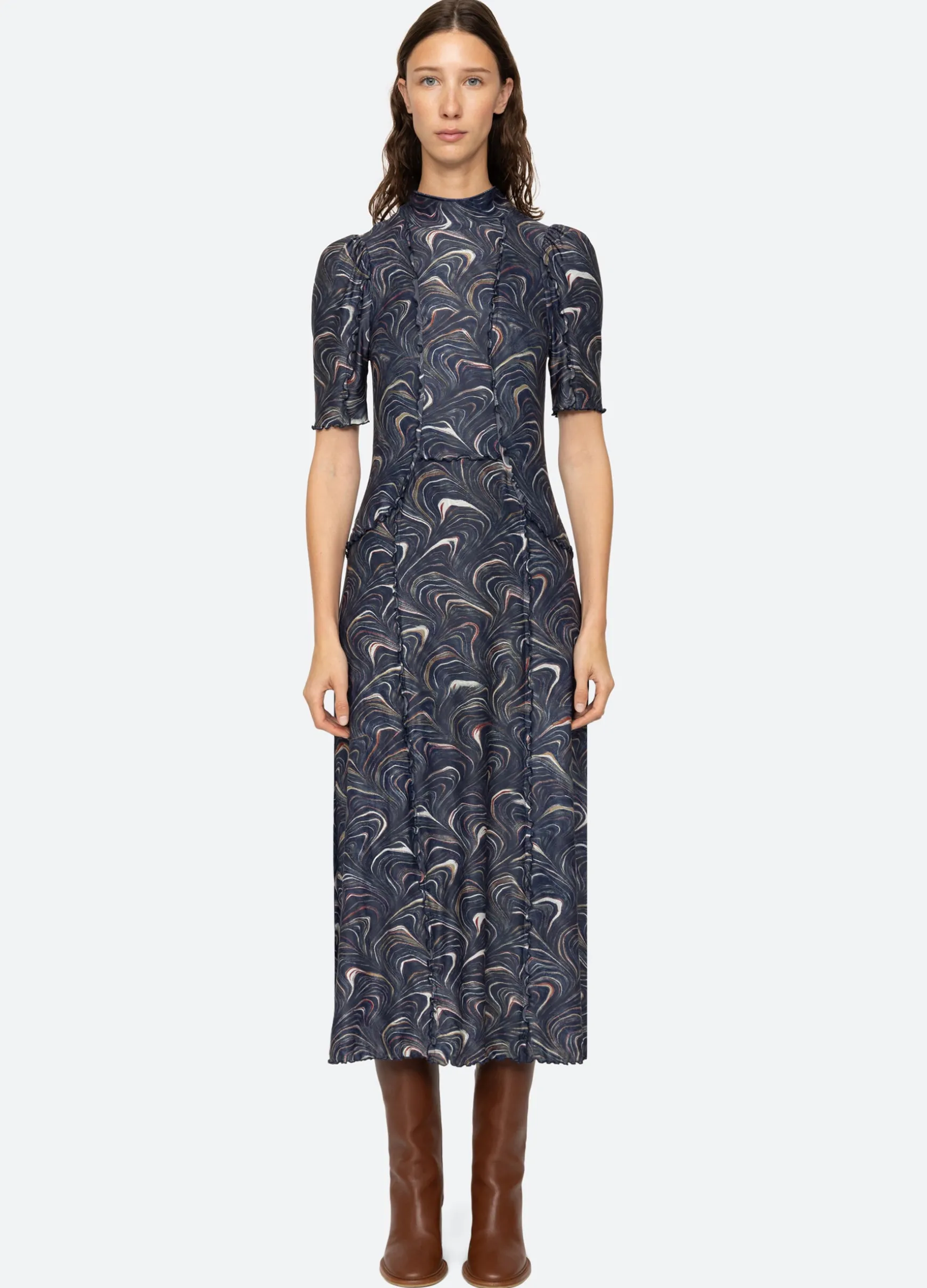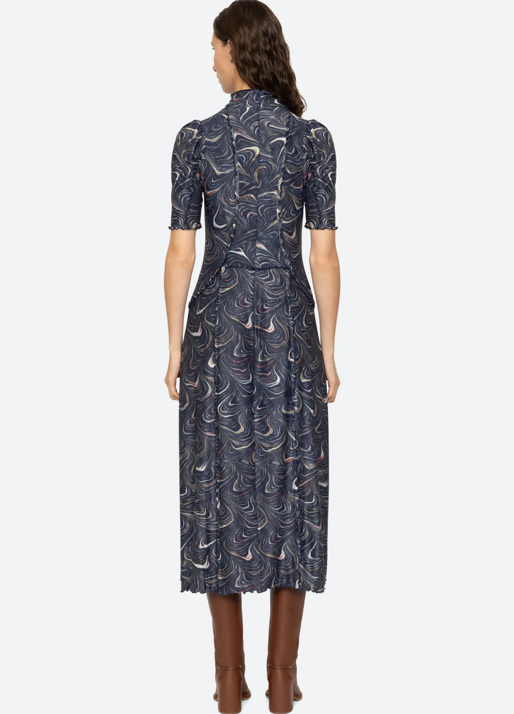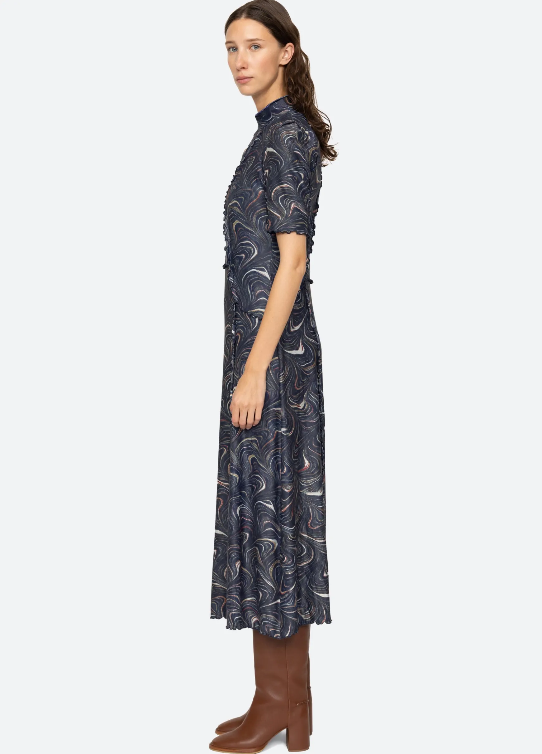 The Amara marble print short sleeve dress features ruffle detailing and midi silhouette.