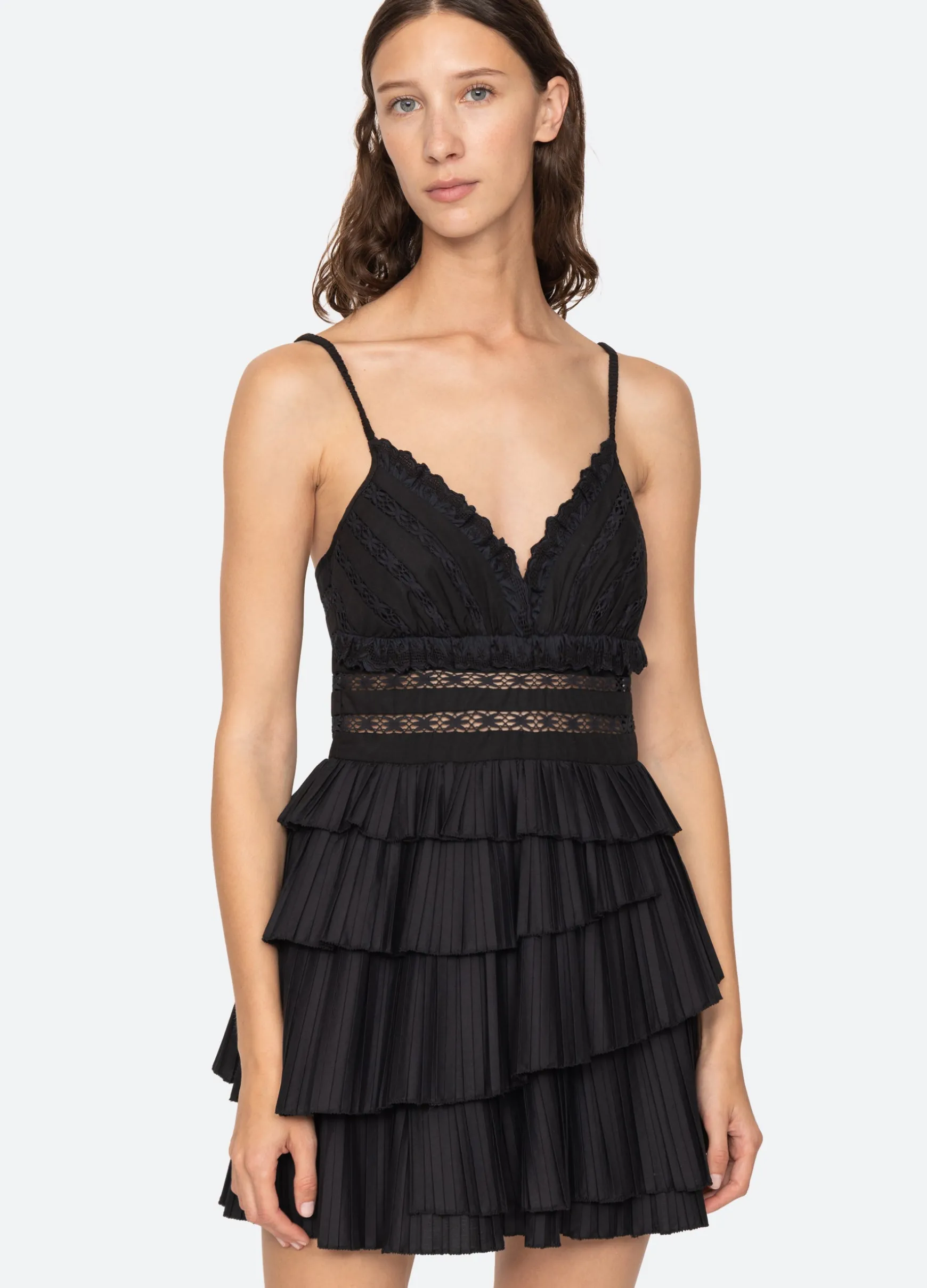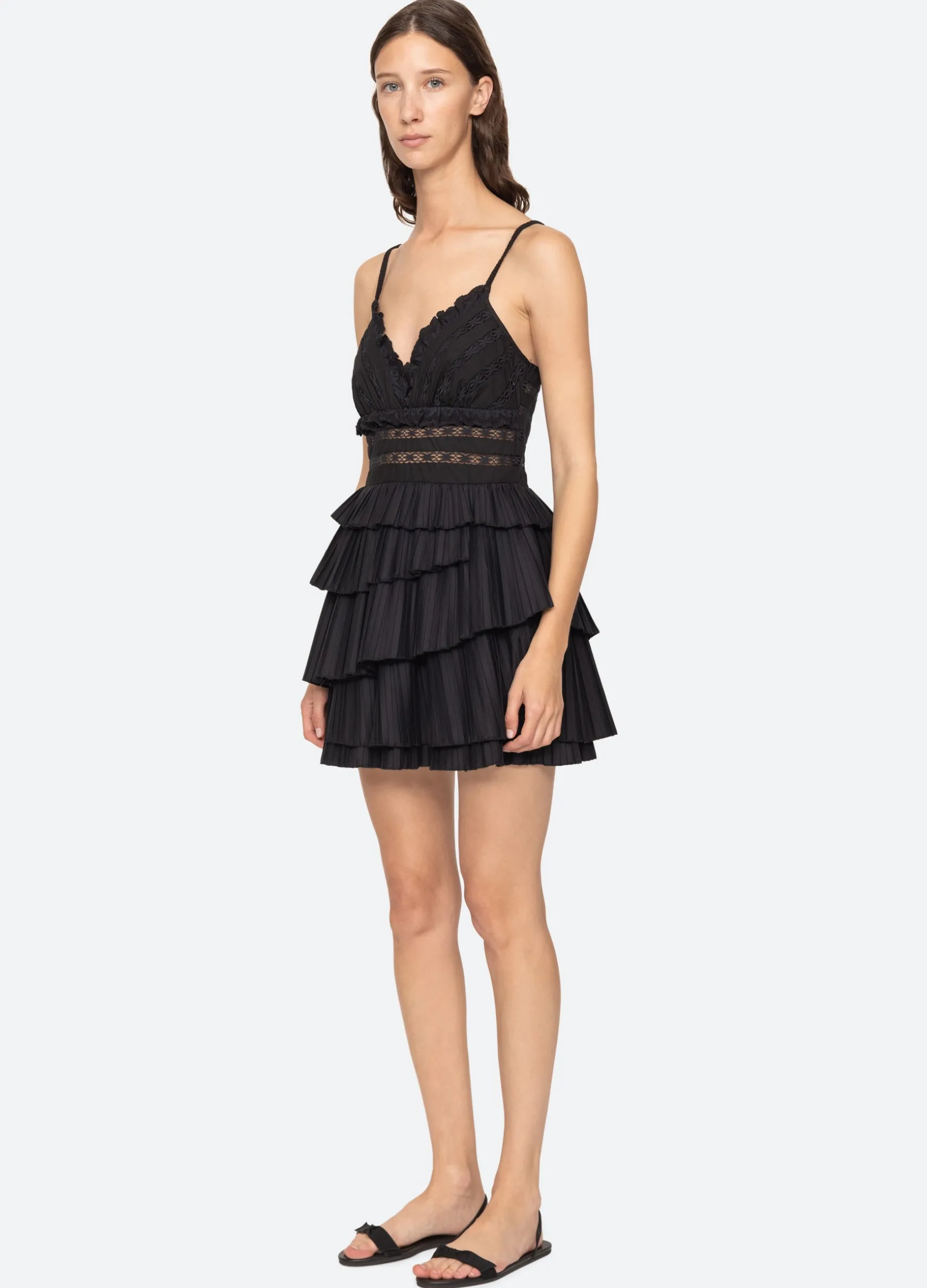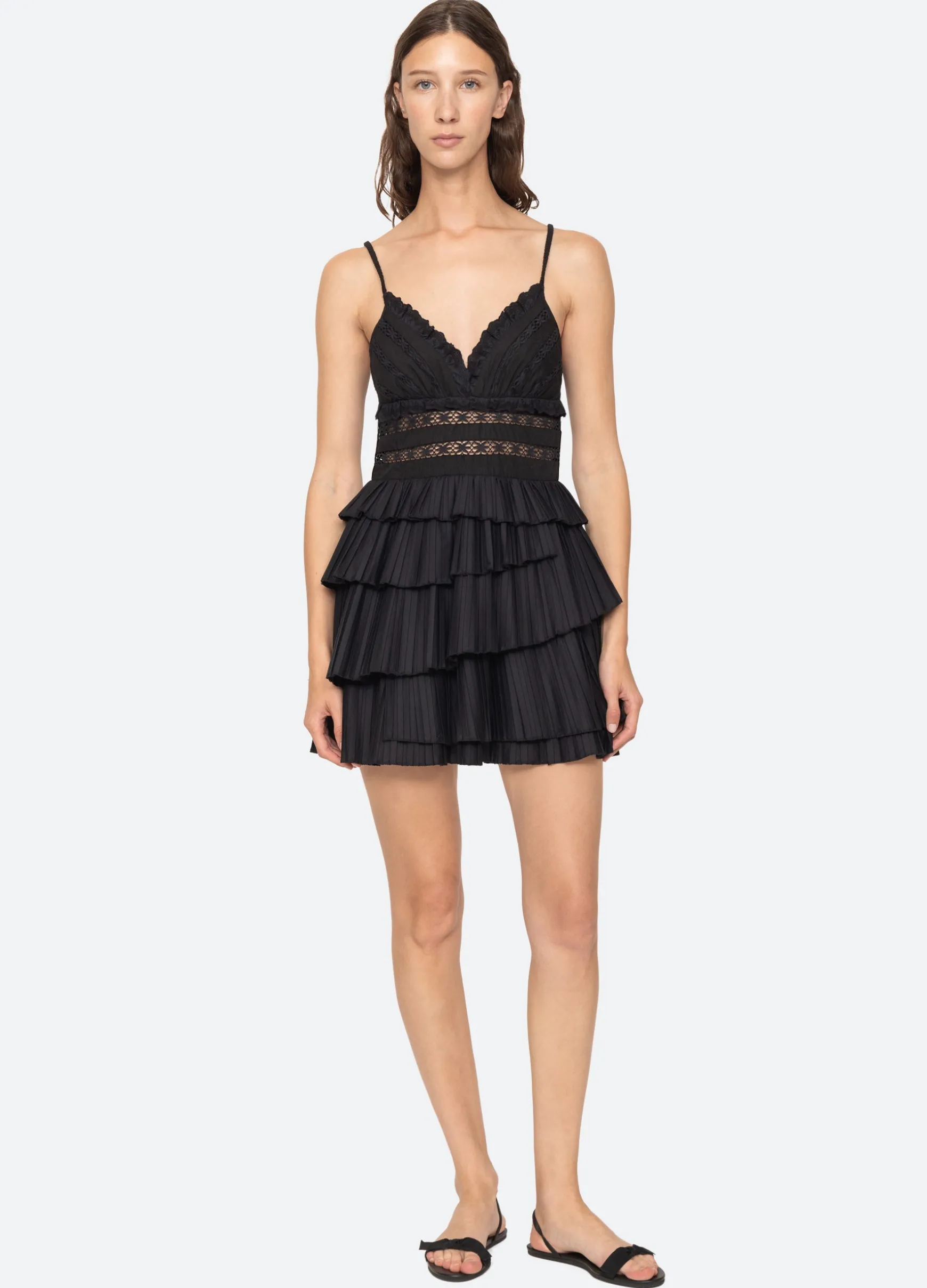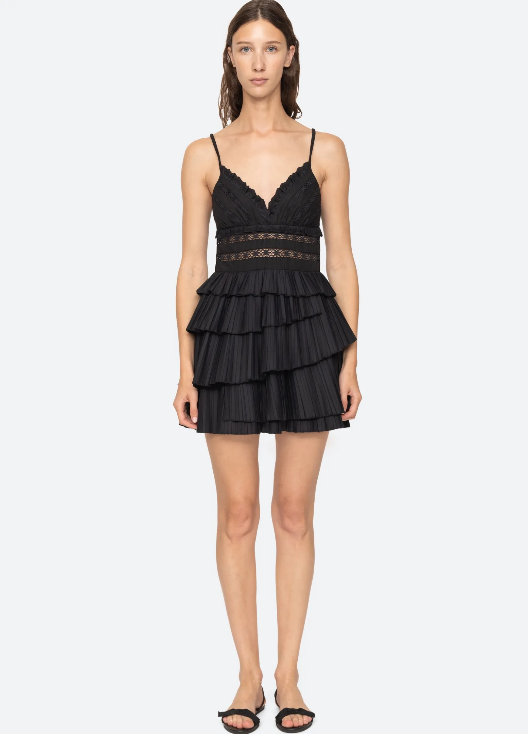 TheAntonina dress features a v-neckline, tiered pleated asymmetrical skirt, lace inserts and fitted waistline.