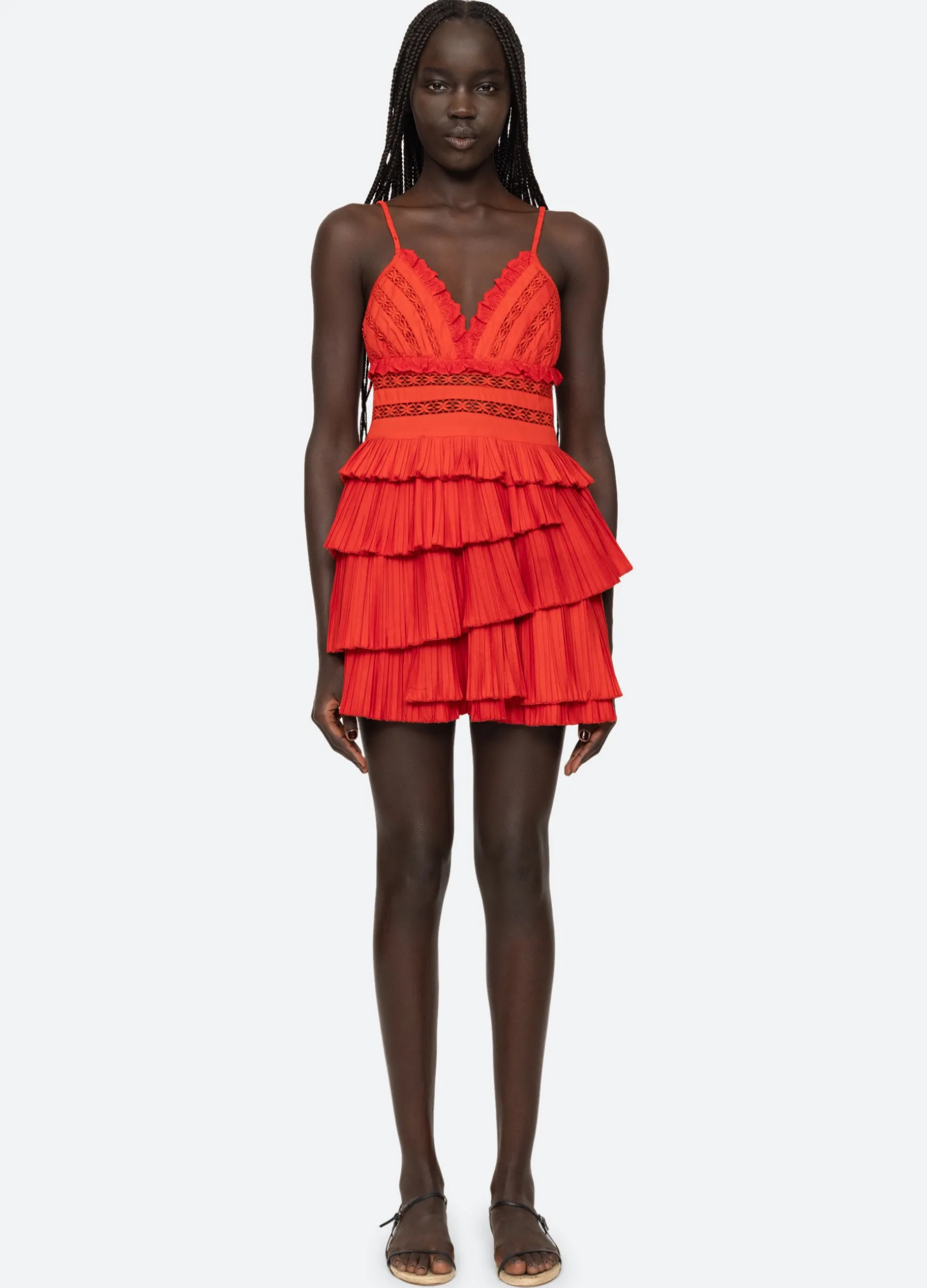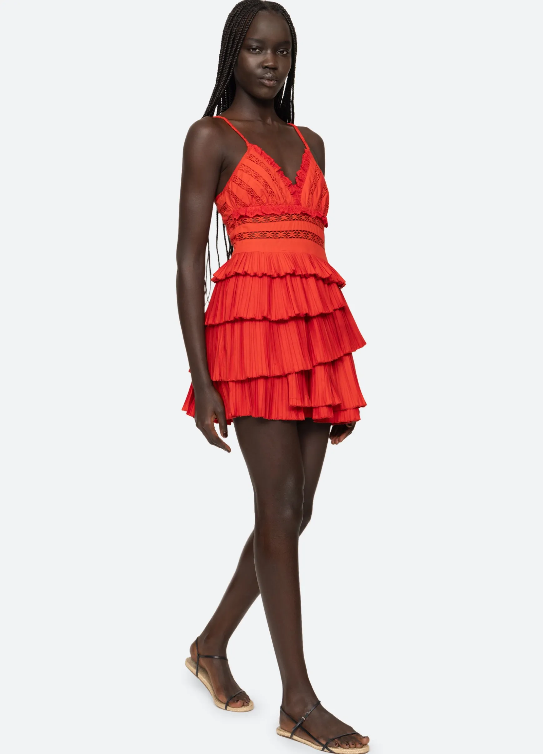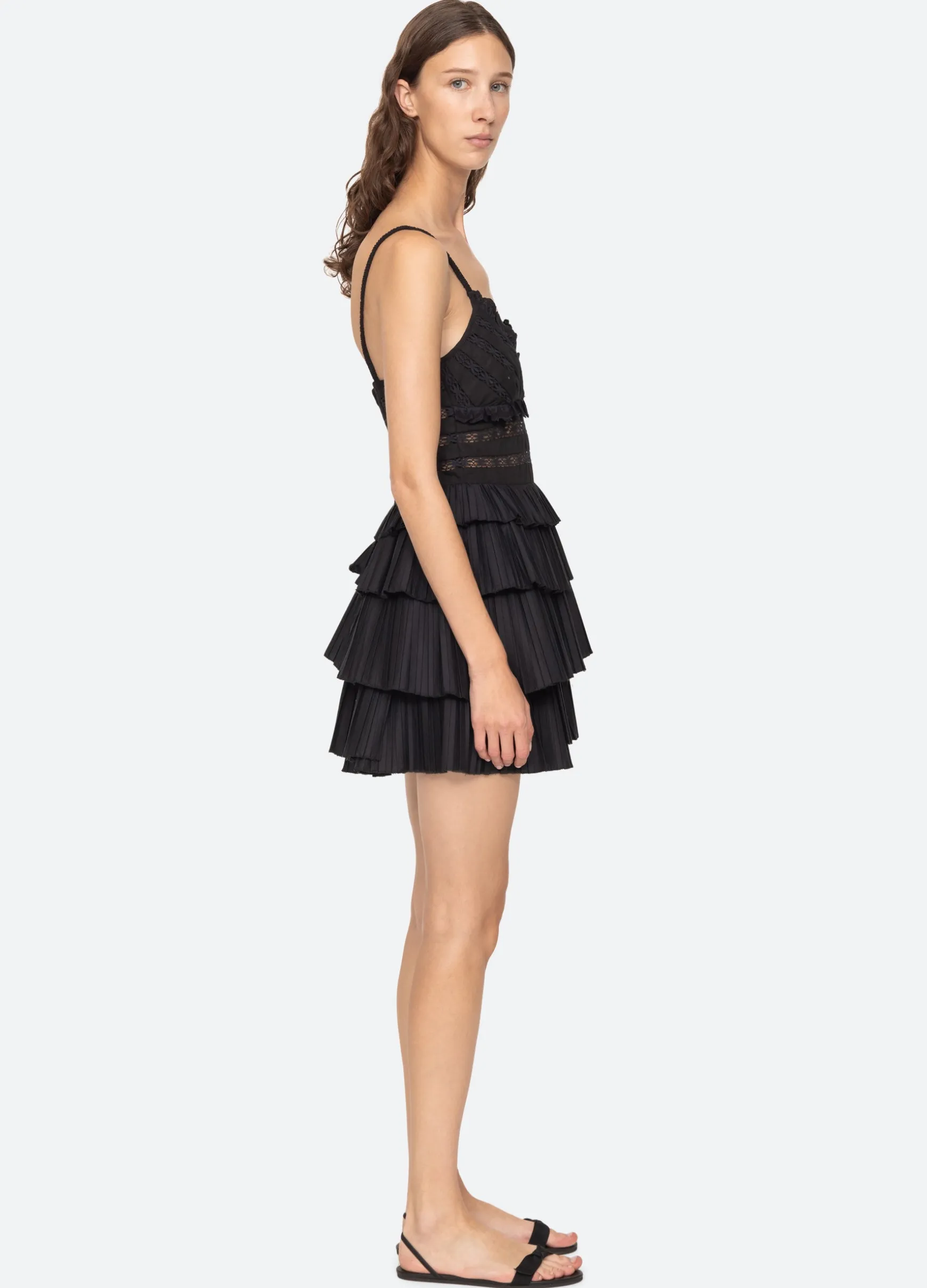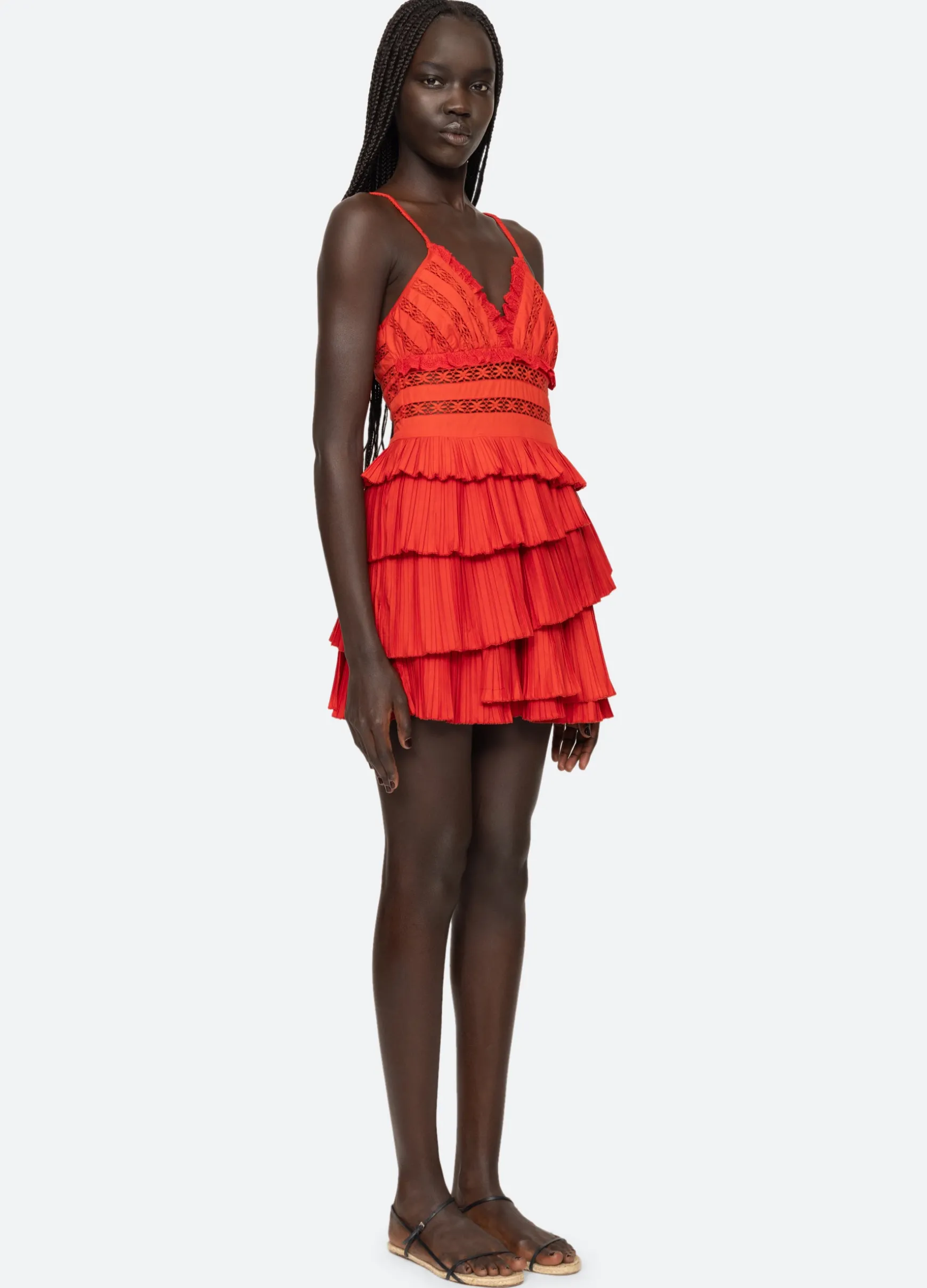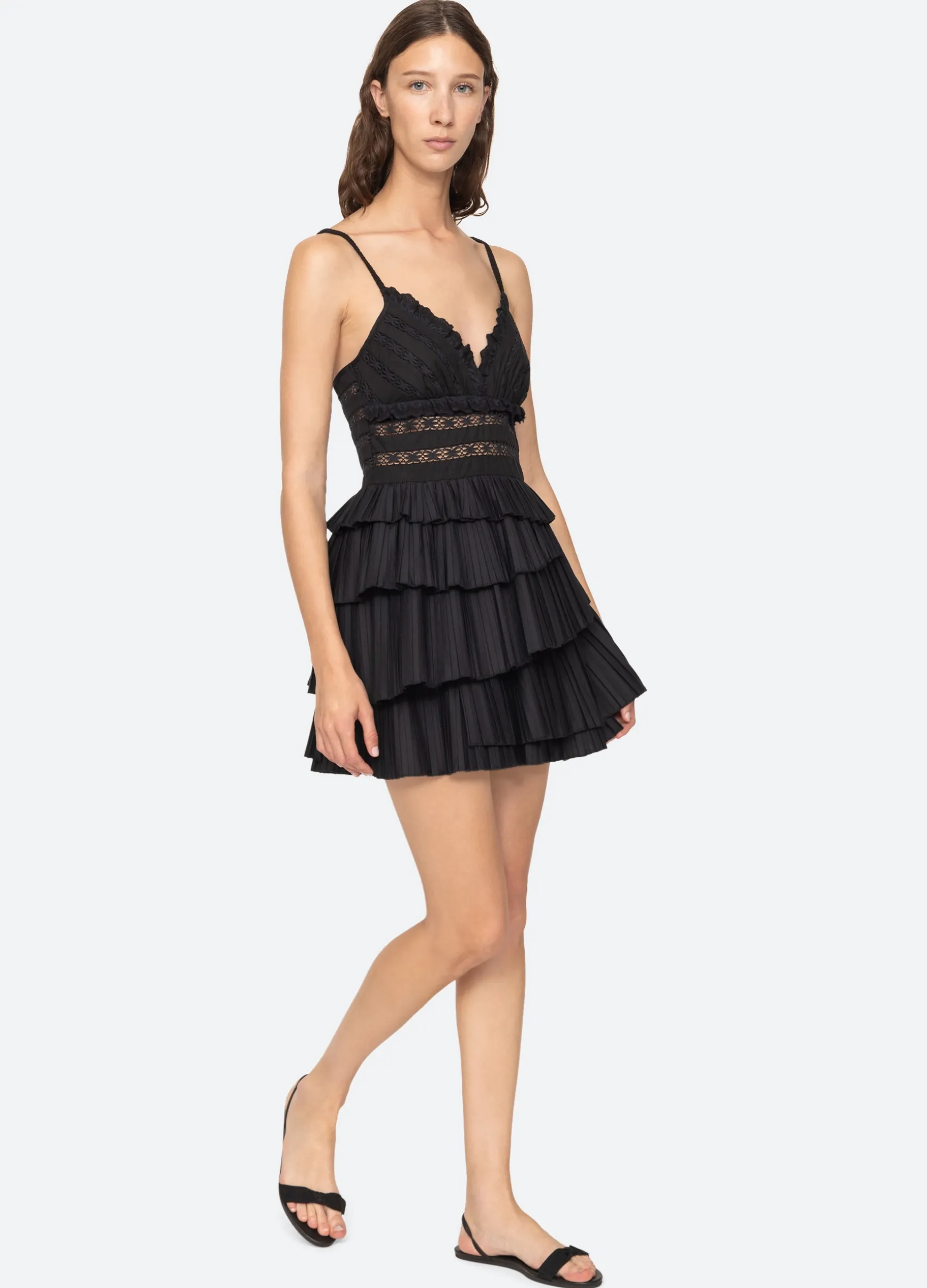 TheAntonina dress features a v-neckline, tiered pleated asymmetrical skirt, lace inserts and fitted waistline.