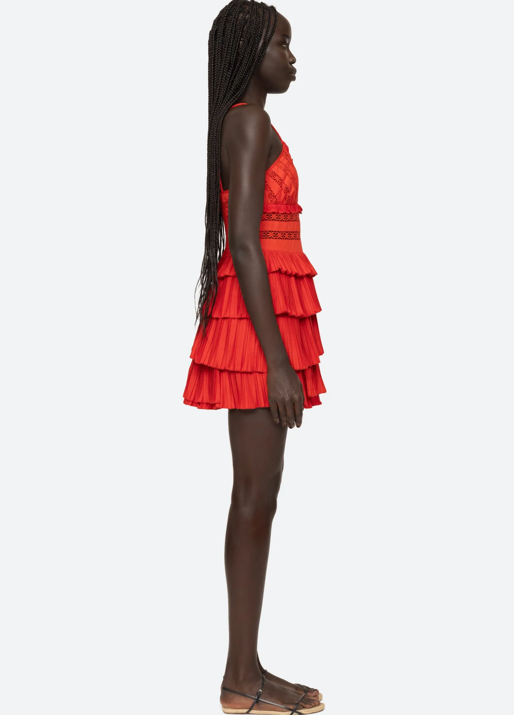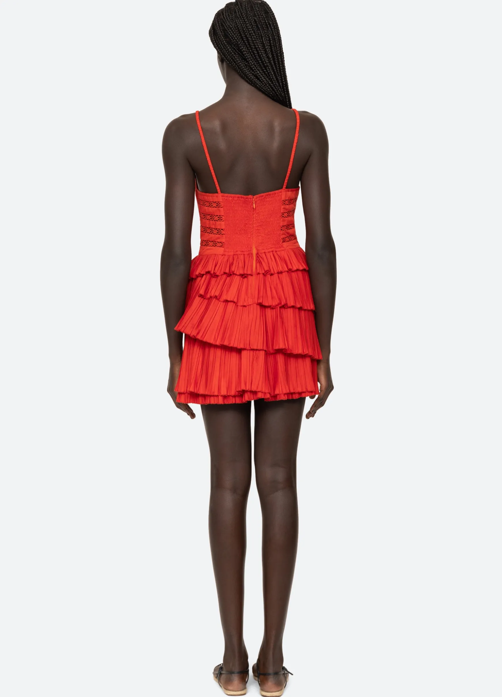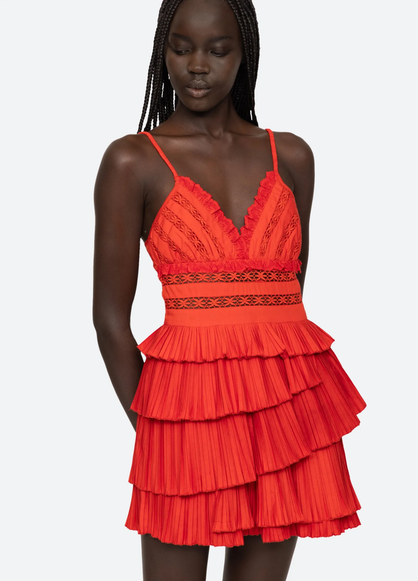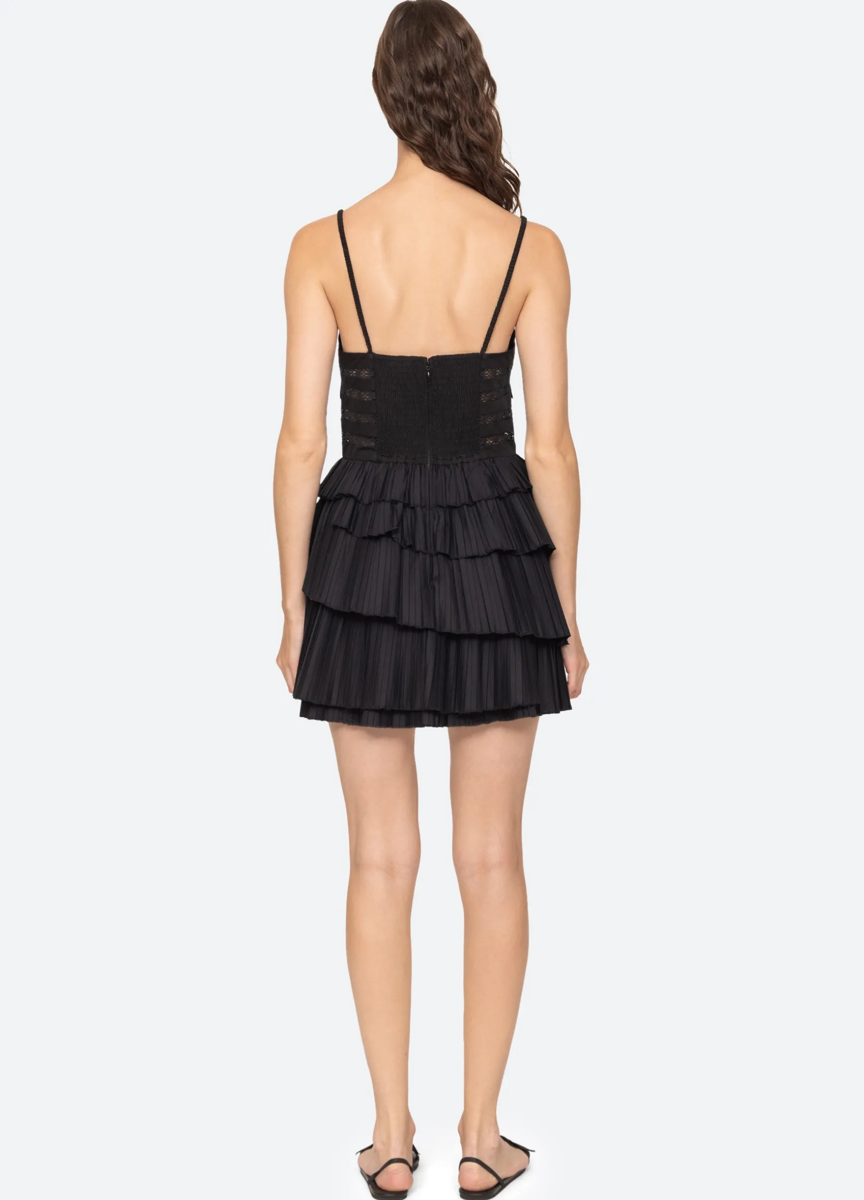 TheAntonina dress features a v-neckline, tiered pleated asymmetrical skirt, lace inserts and fitted waistline.