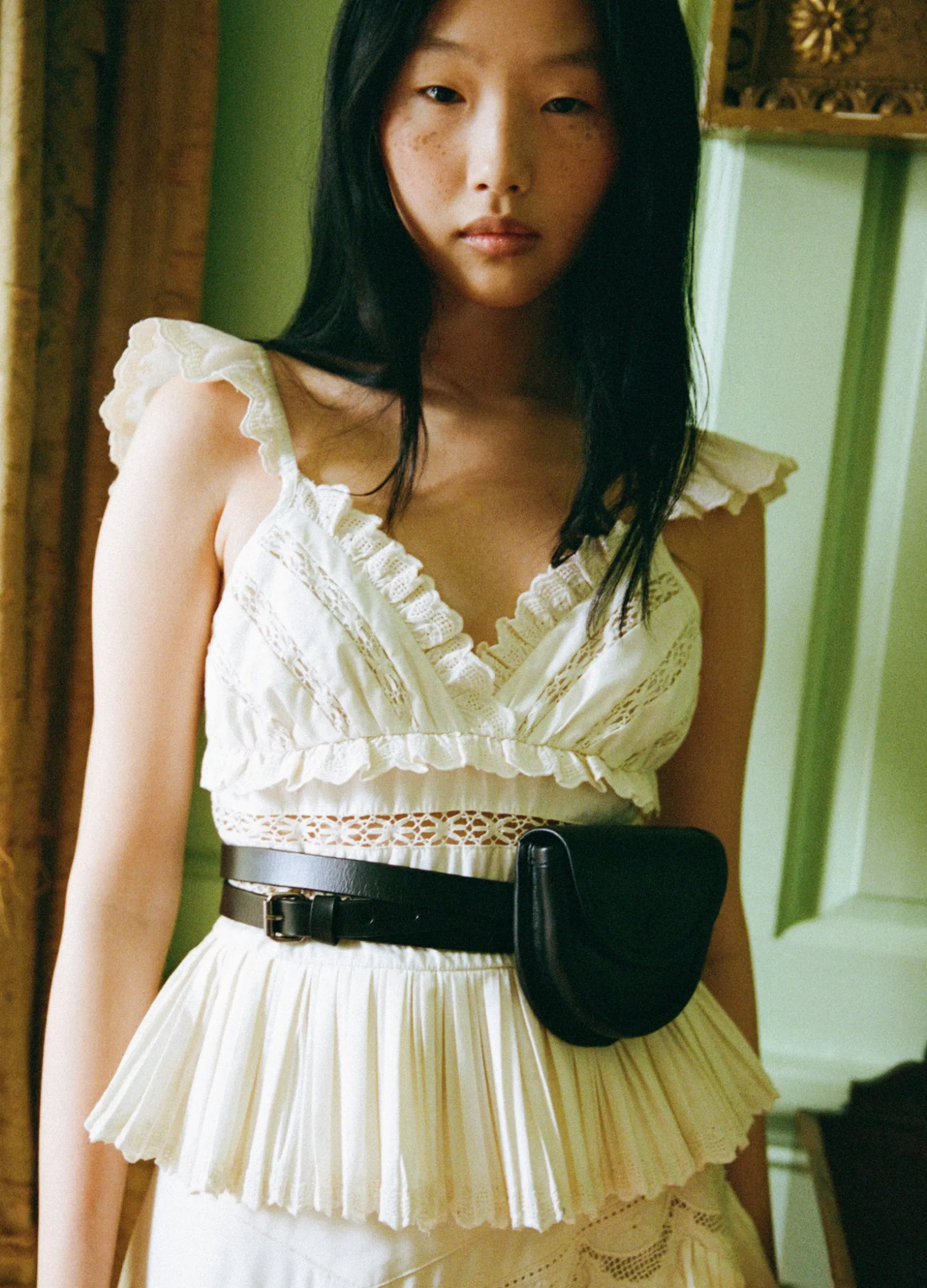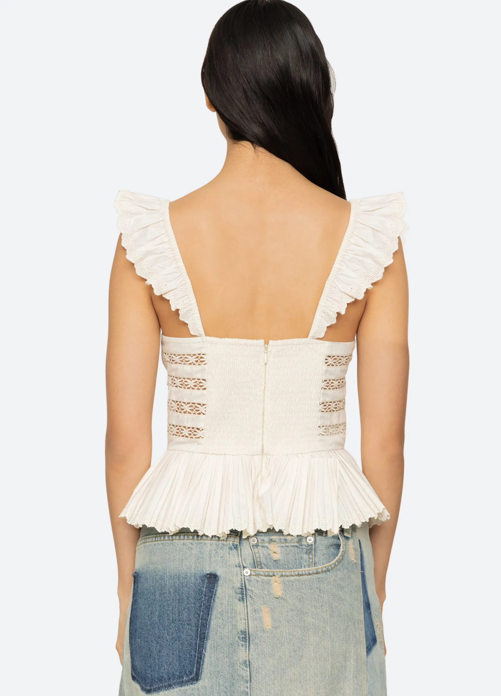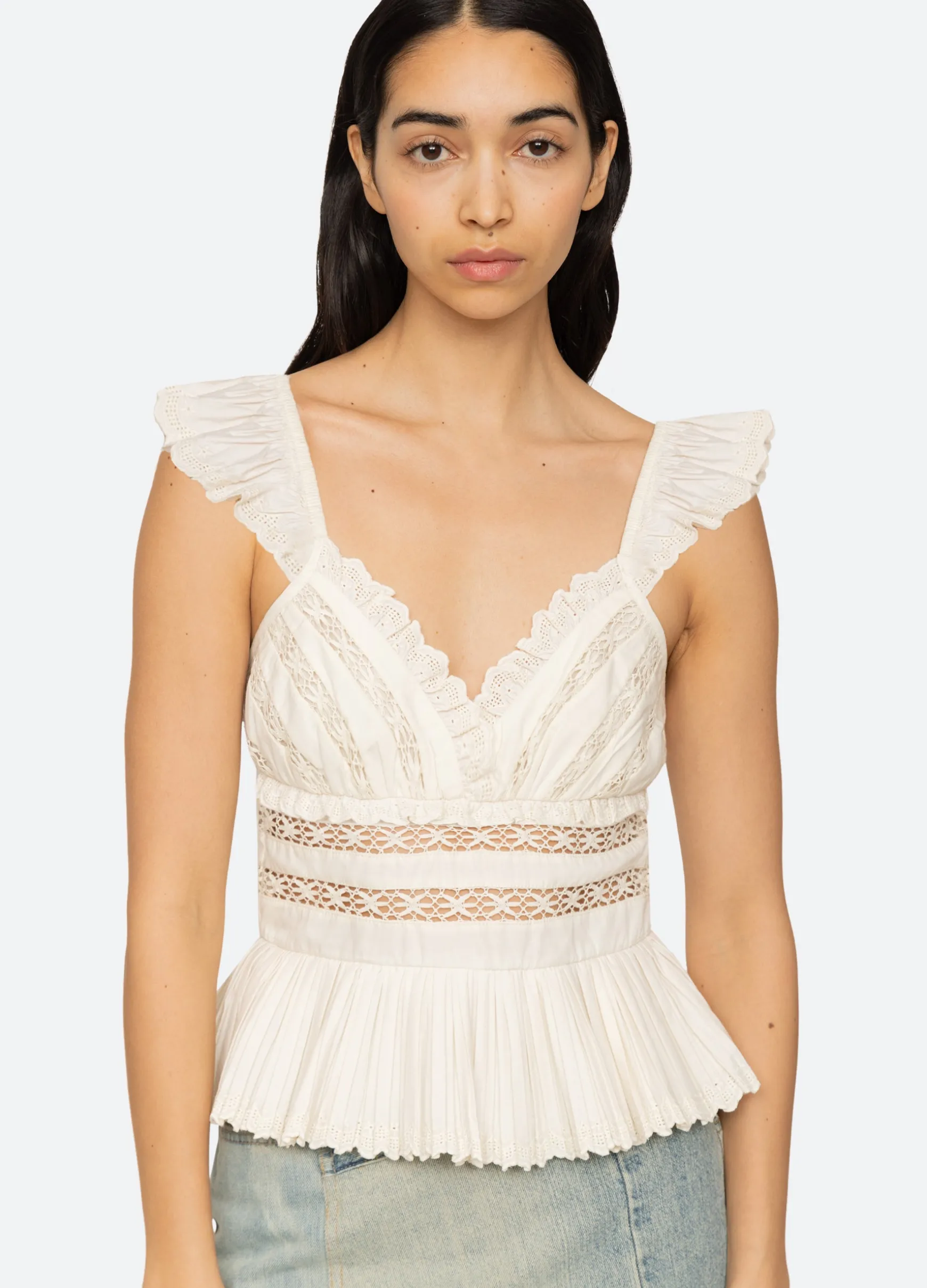 TheAntonina tank top features flutter sleeves, lace inserts, ruffle detailing and pleated trimhem.
