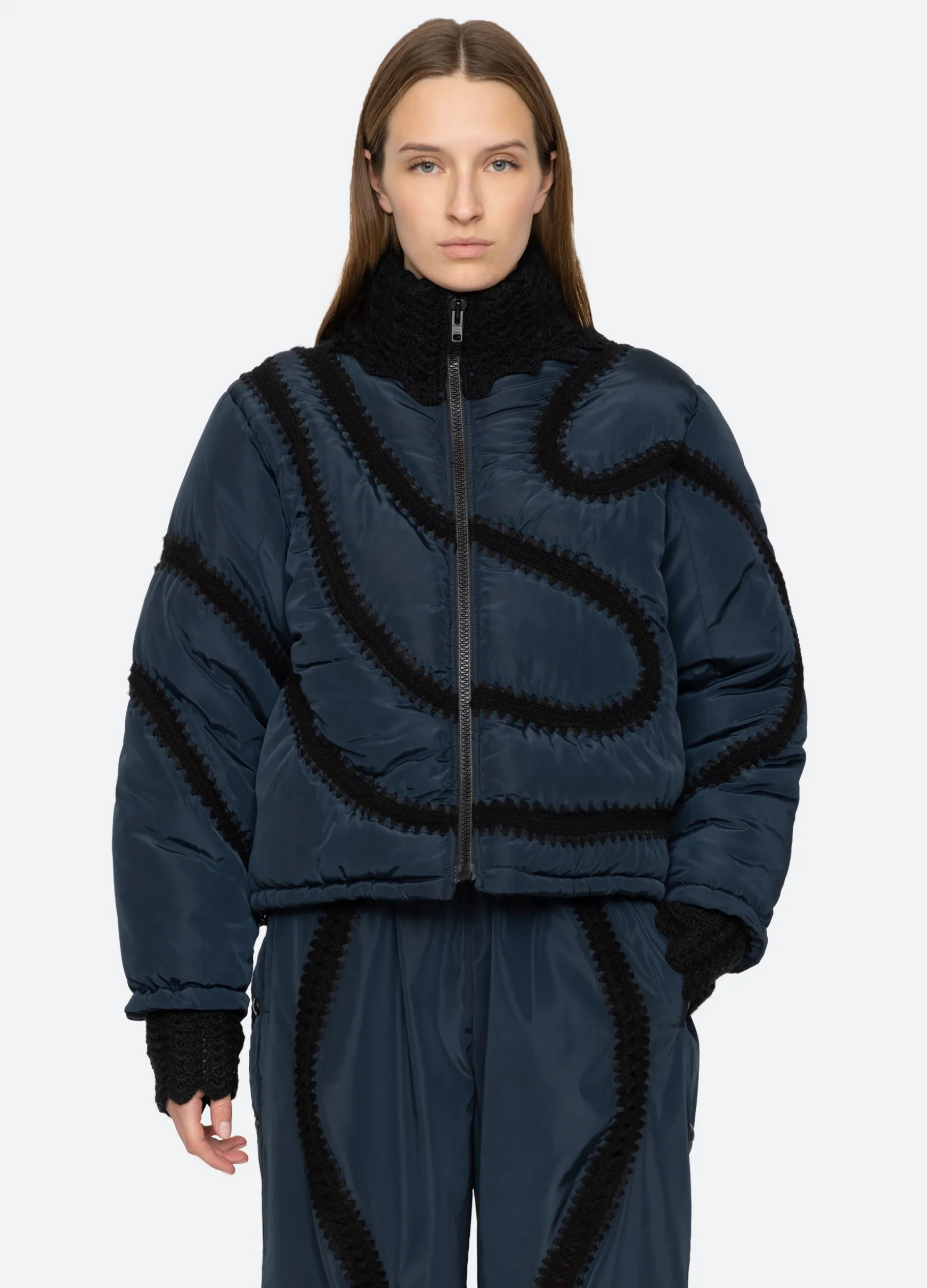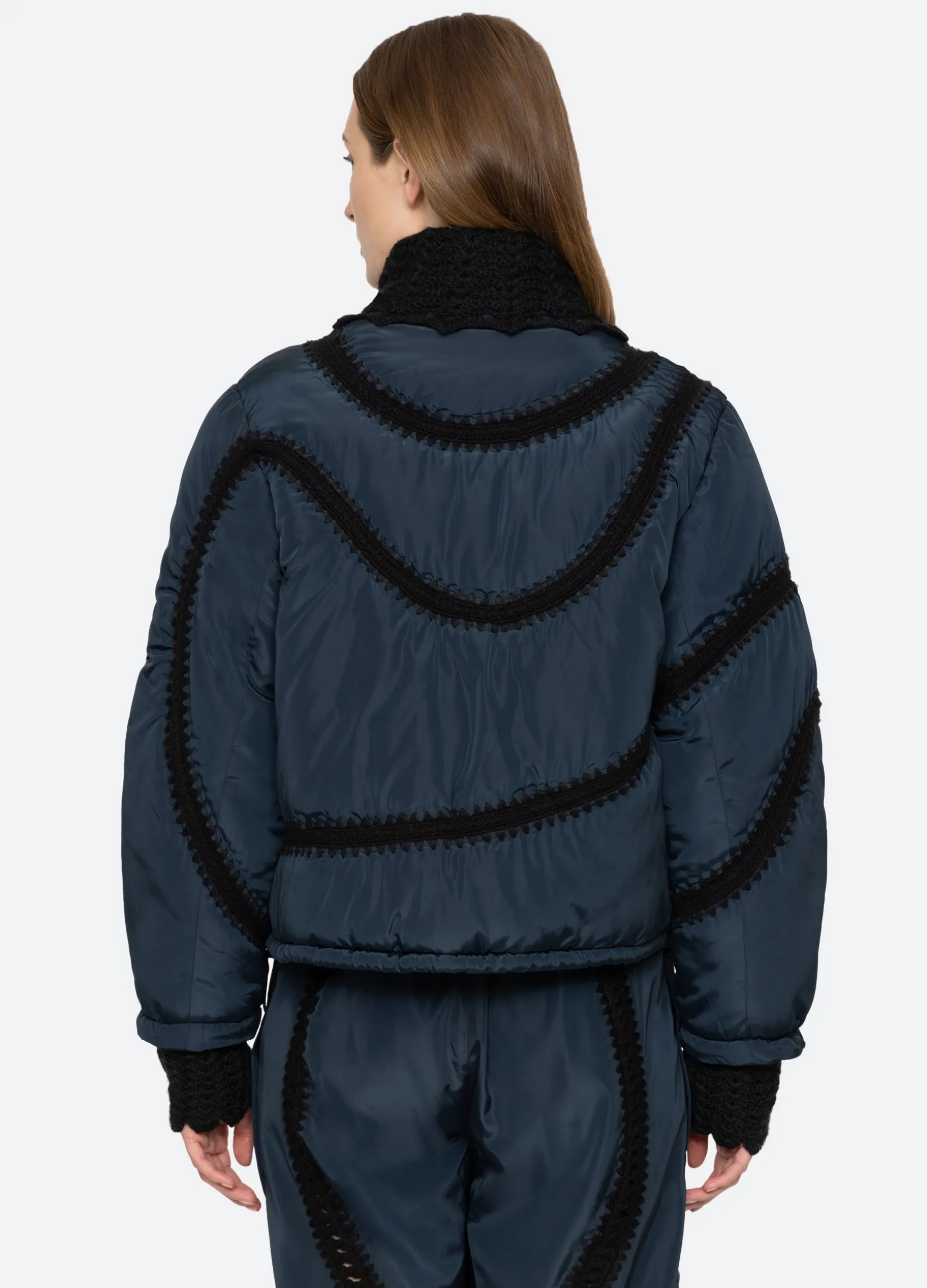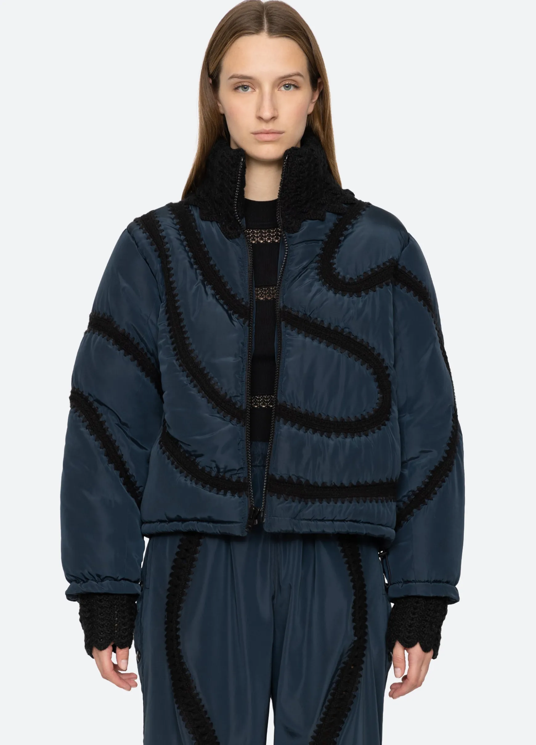 The Averie windbreaker puffer jacket features a high neckline and crochet detailing throughout.