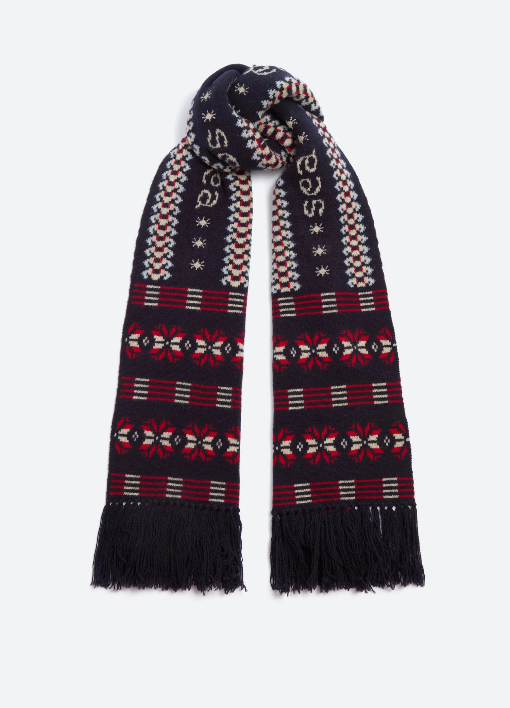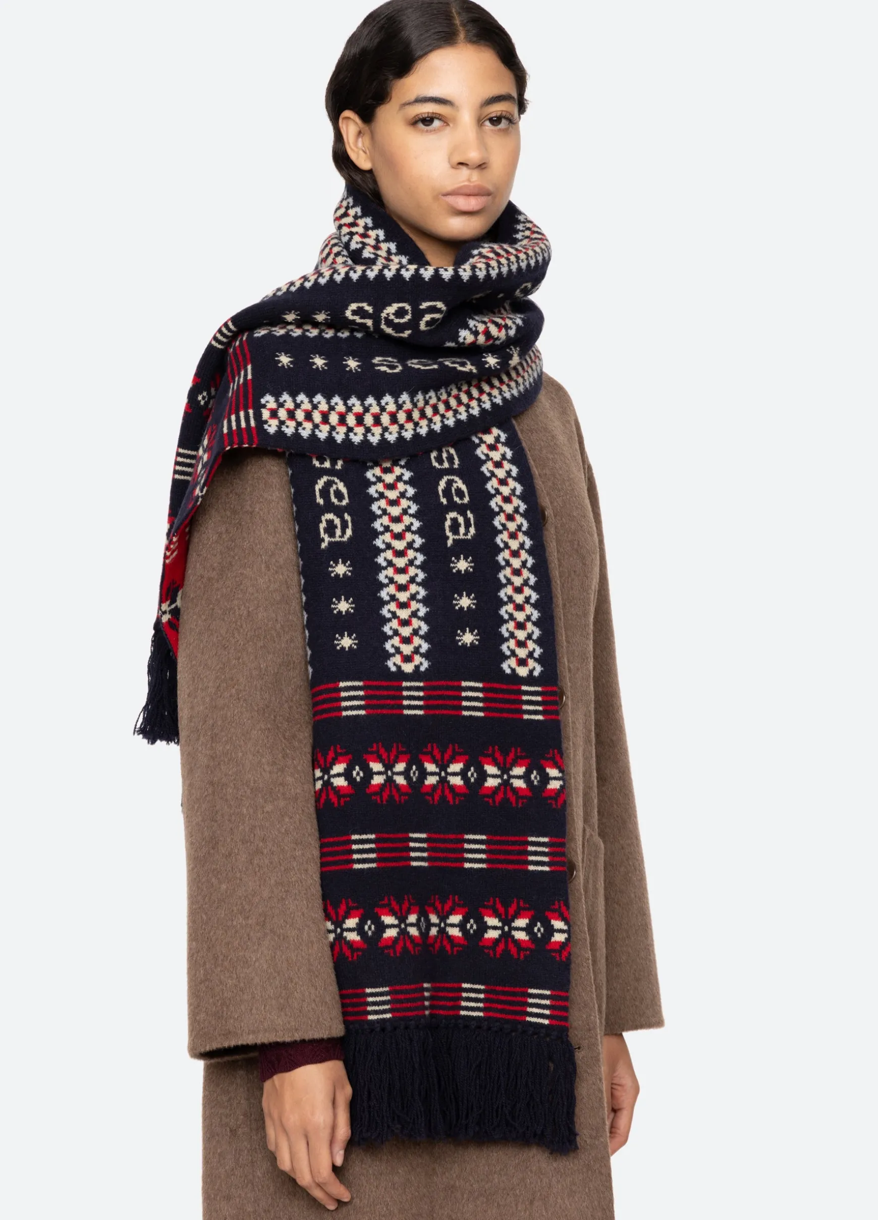 An online and in store exclusive. The Ayla scarf features a fair isle knit, fringe edges and ‘Sea’ logo.