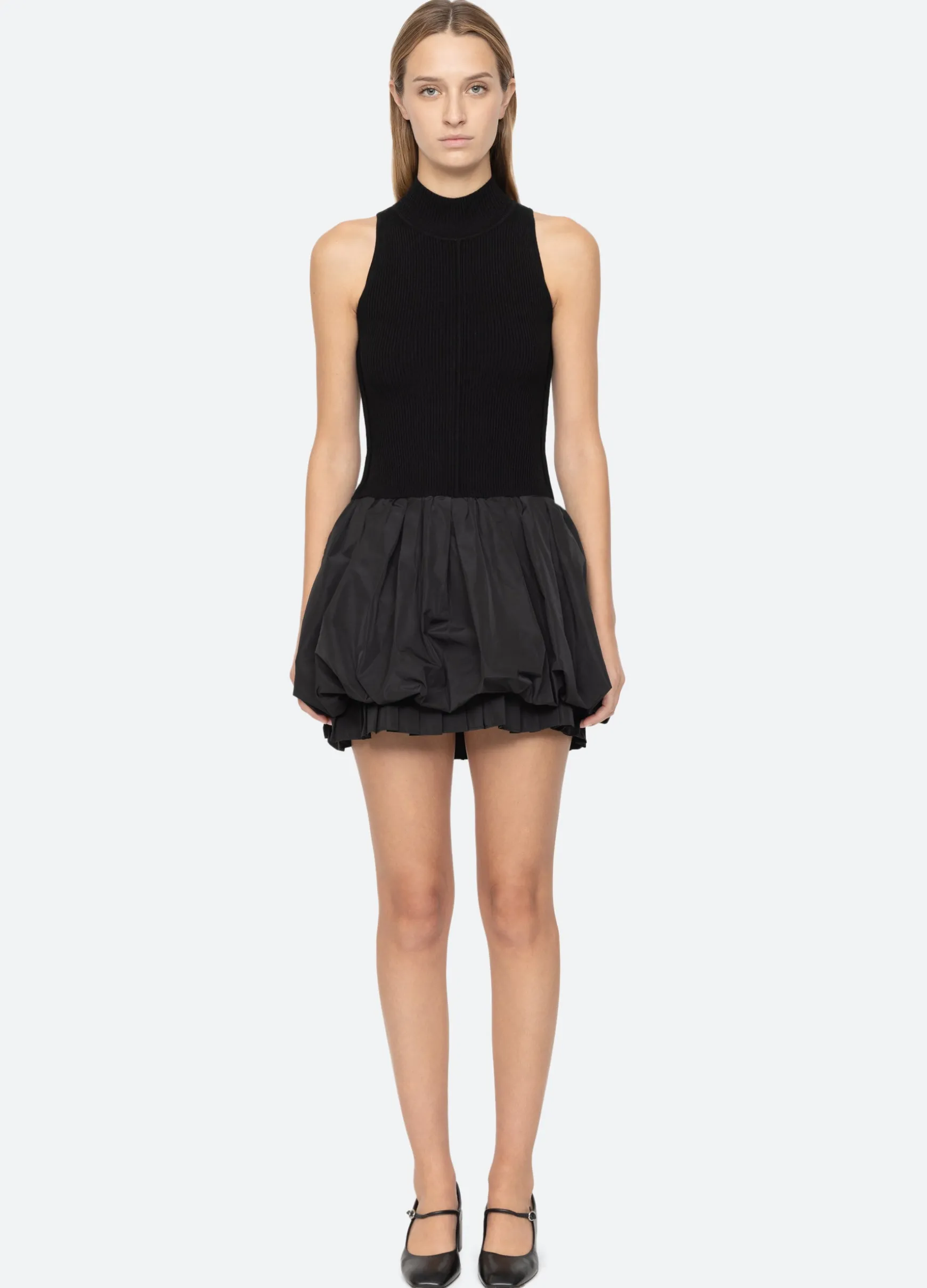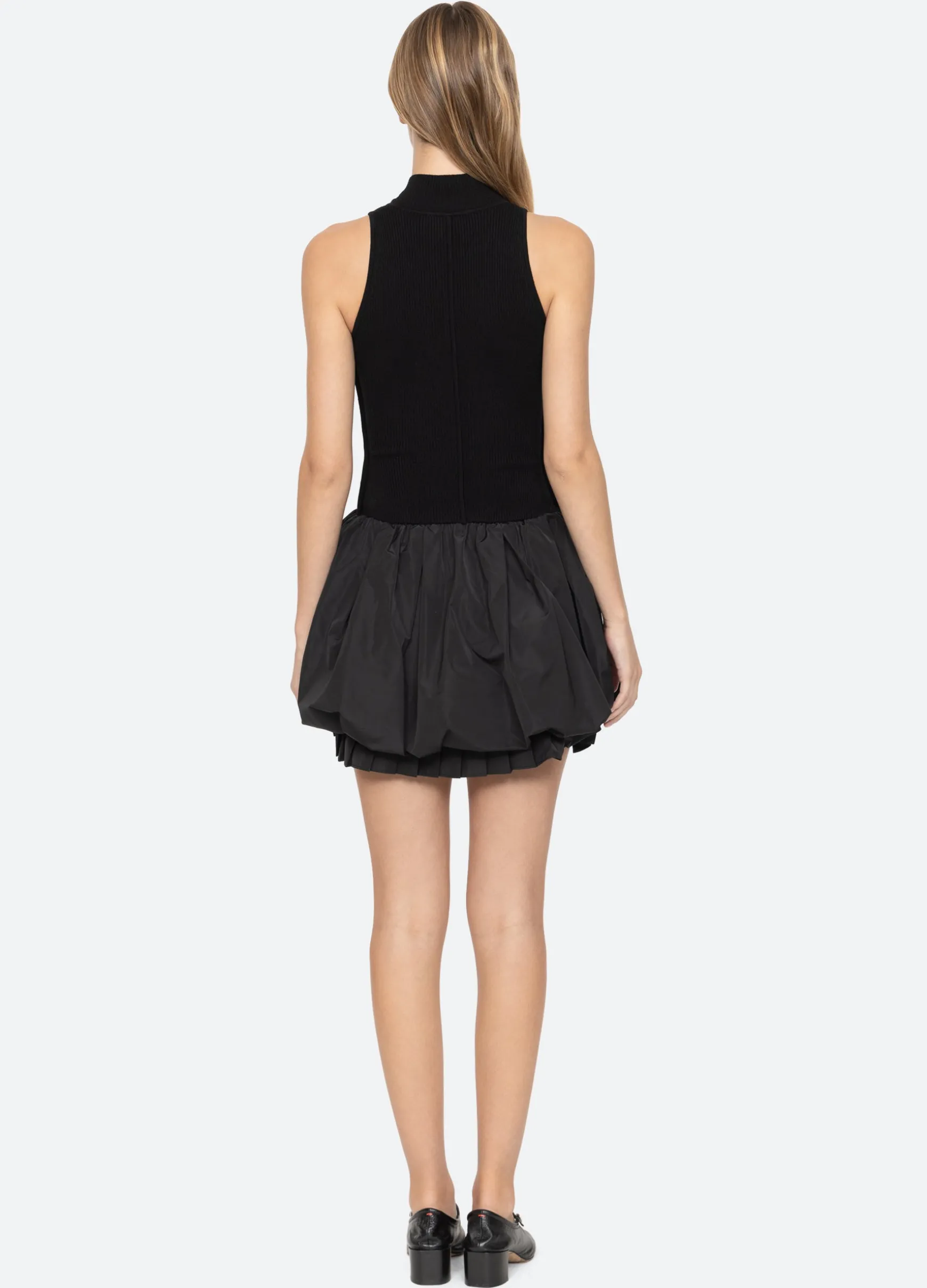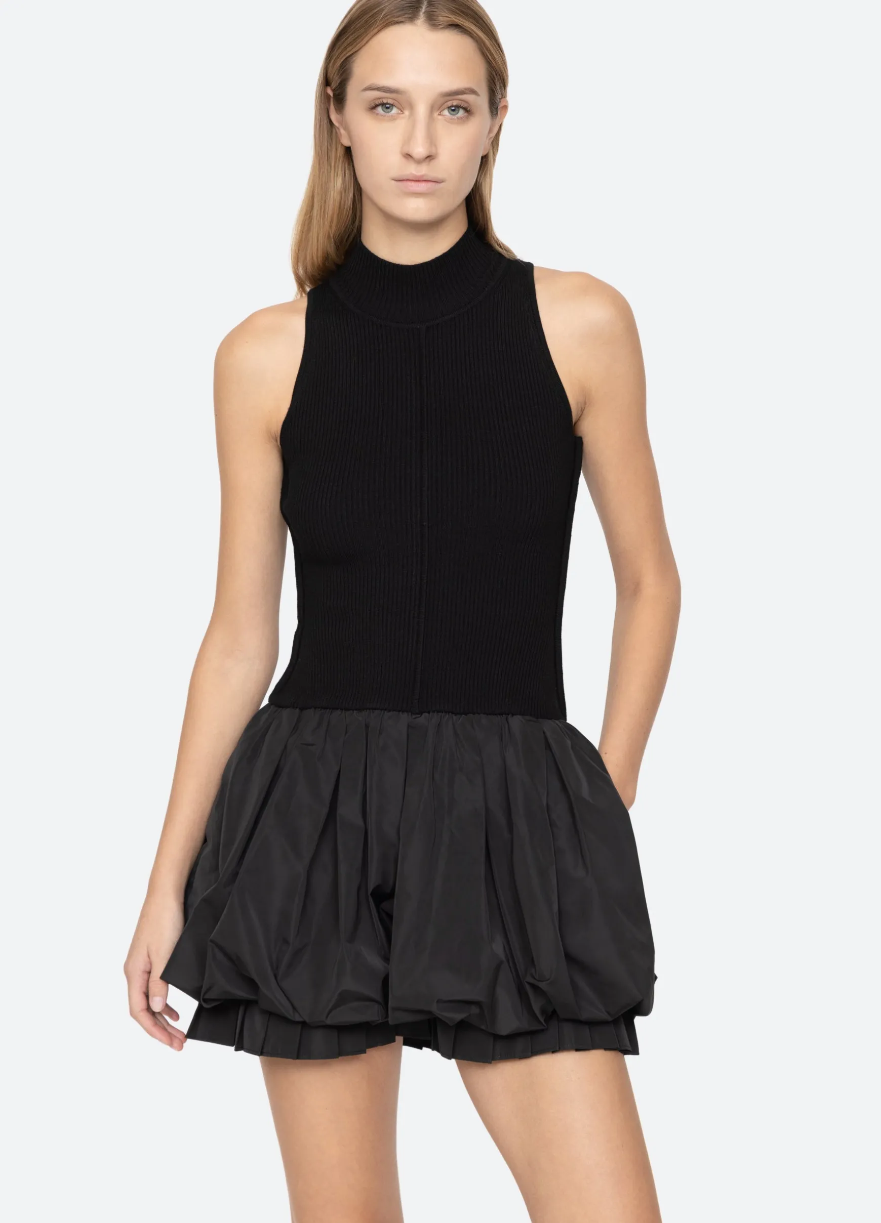 The Belen taffeta knit mini combo dress features a turtleneck and a bubble-hemline with ruffle detailing.