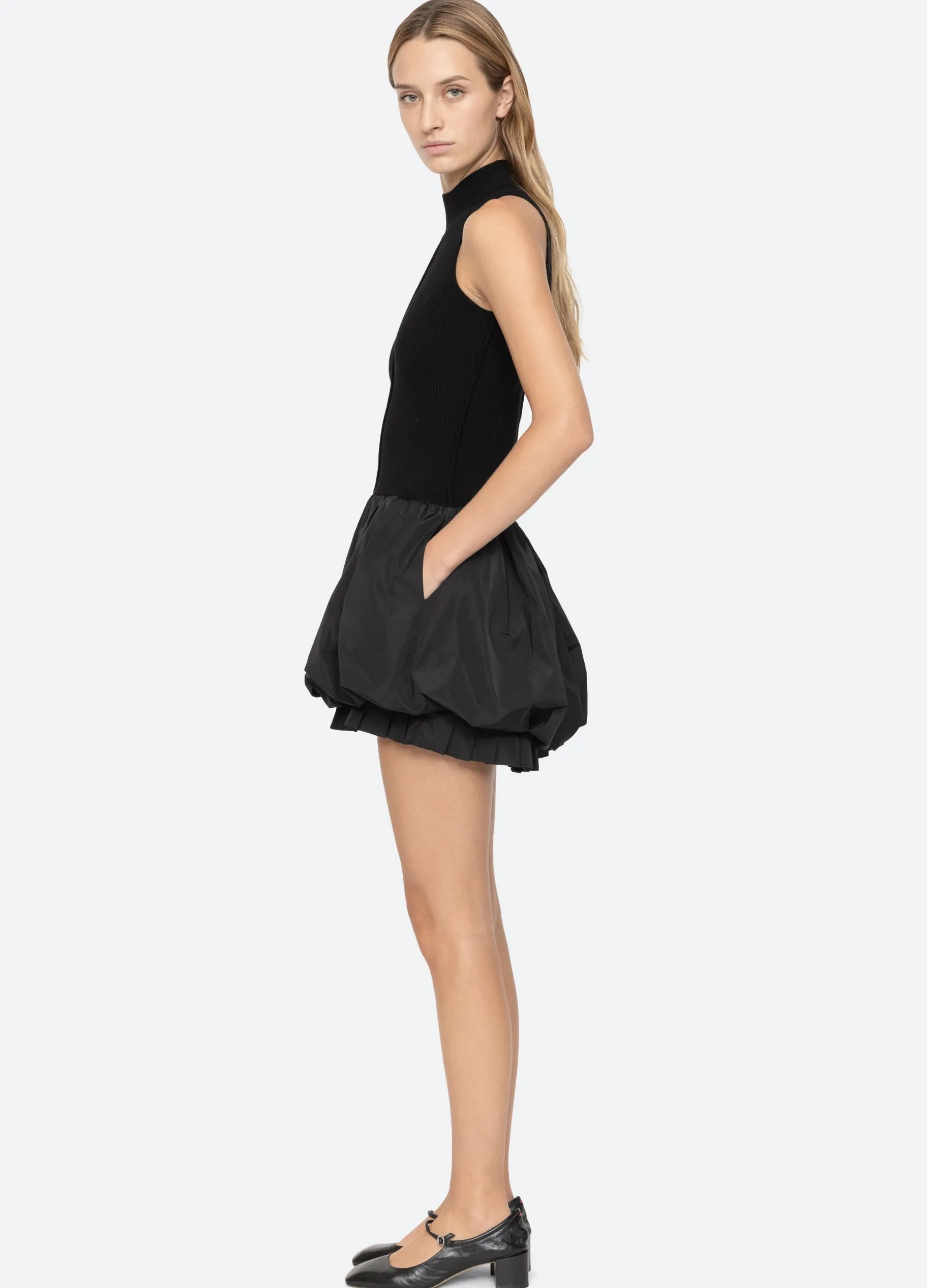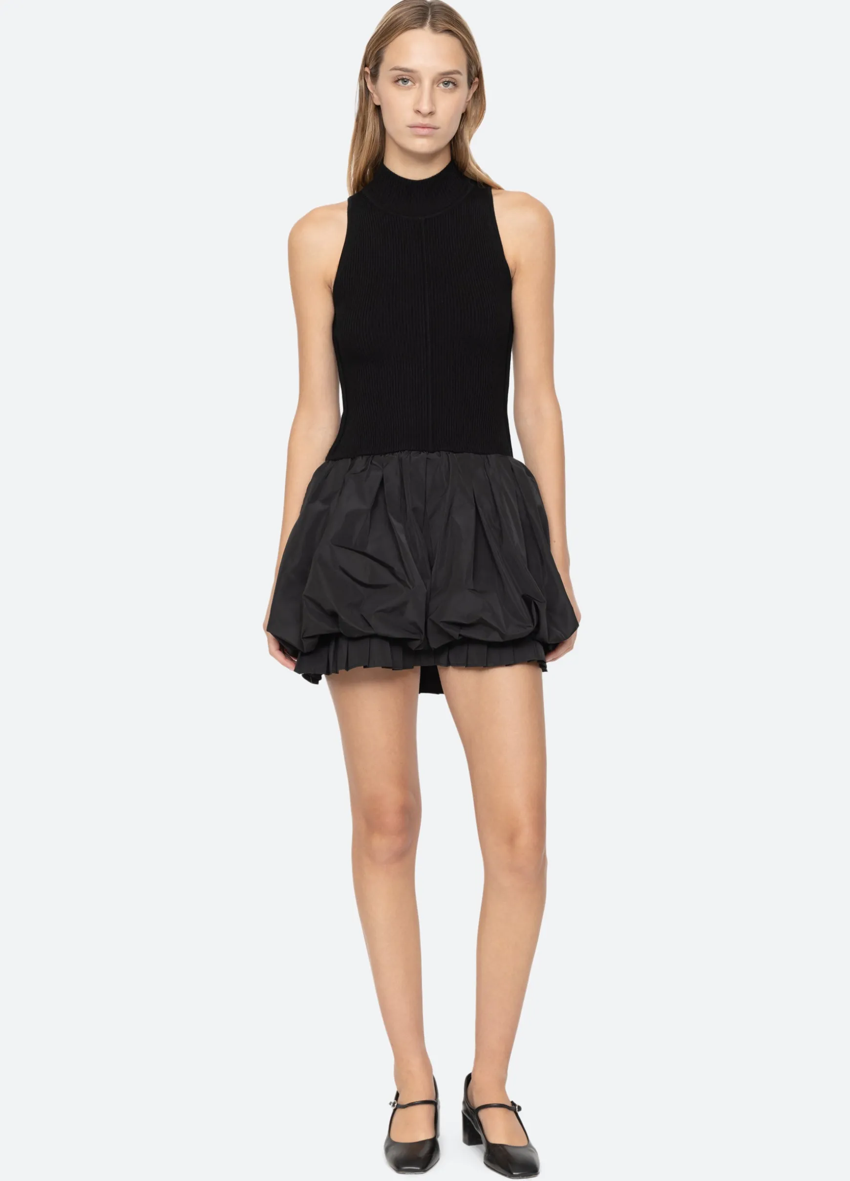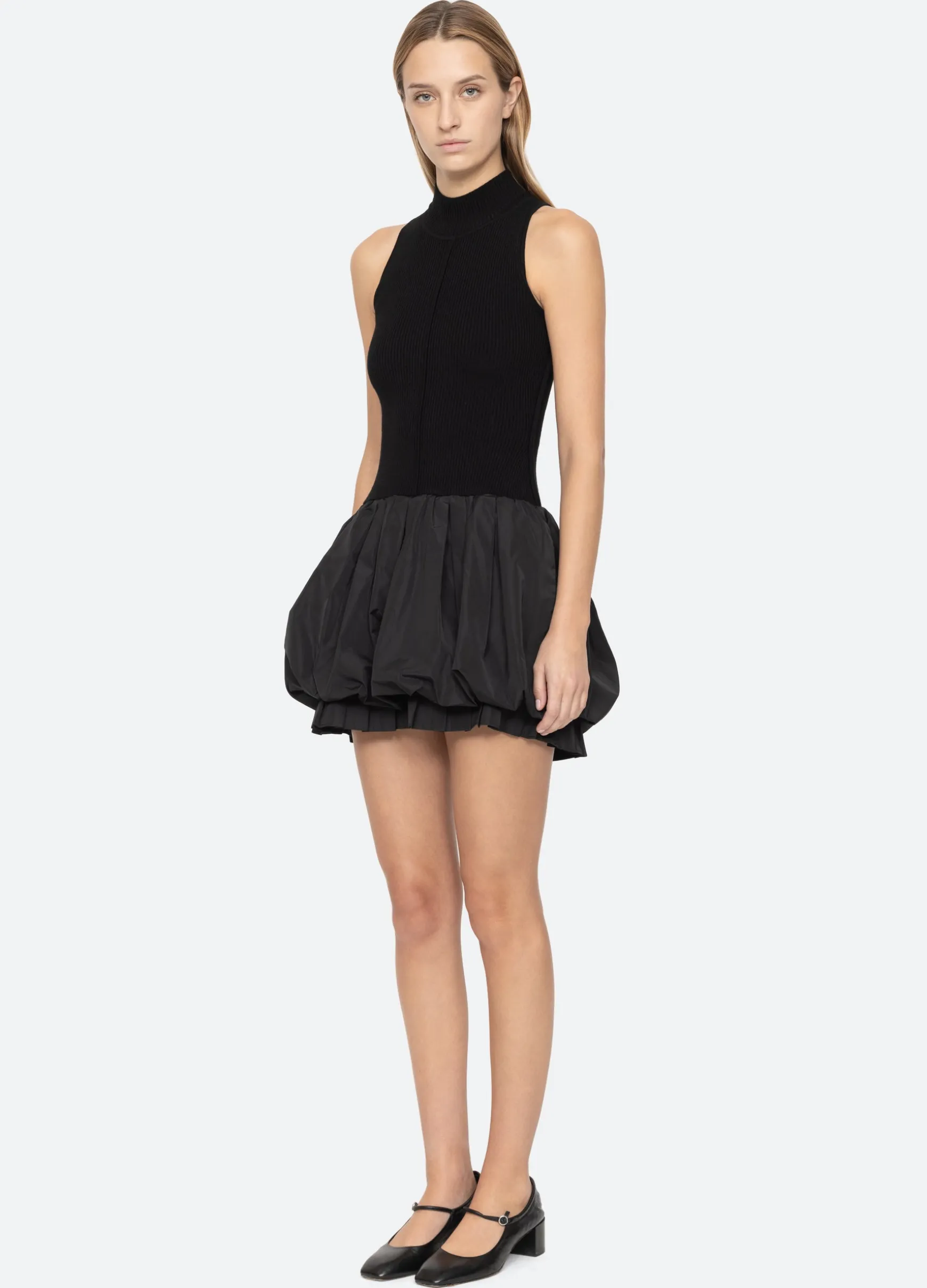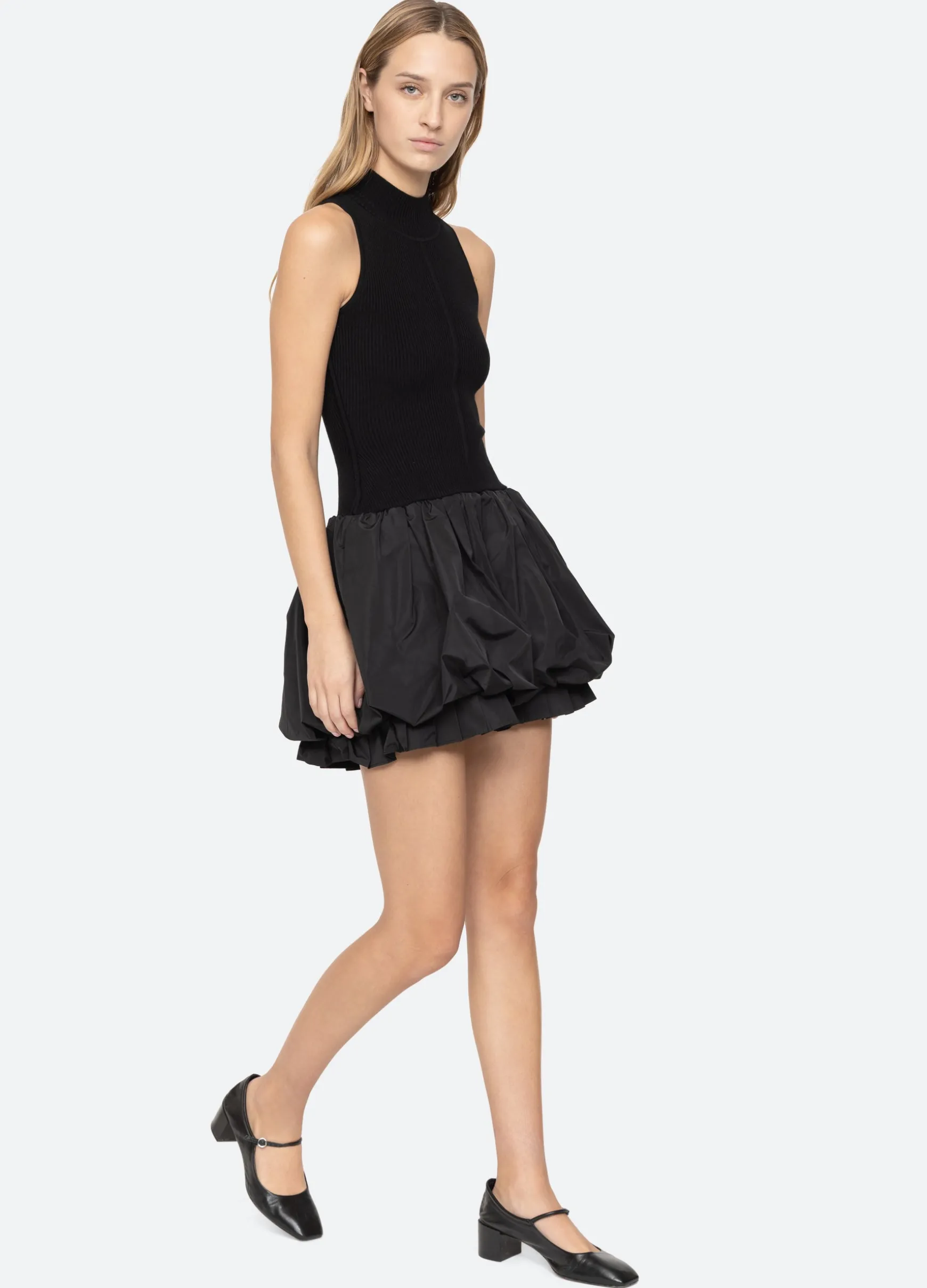 The Belen taffeta knit mini combo dress features a turtleneck and a bubble-hemline with ruffle detailing.