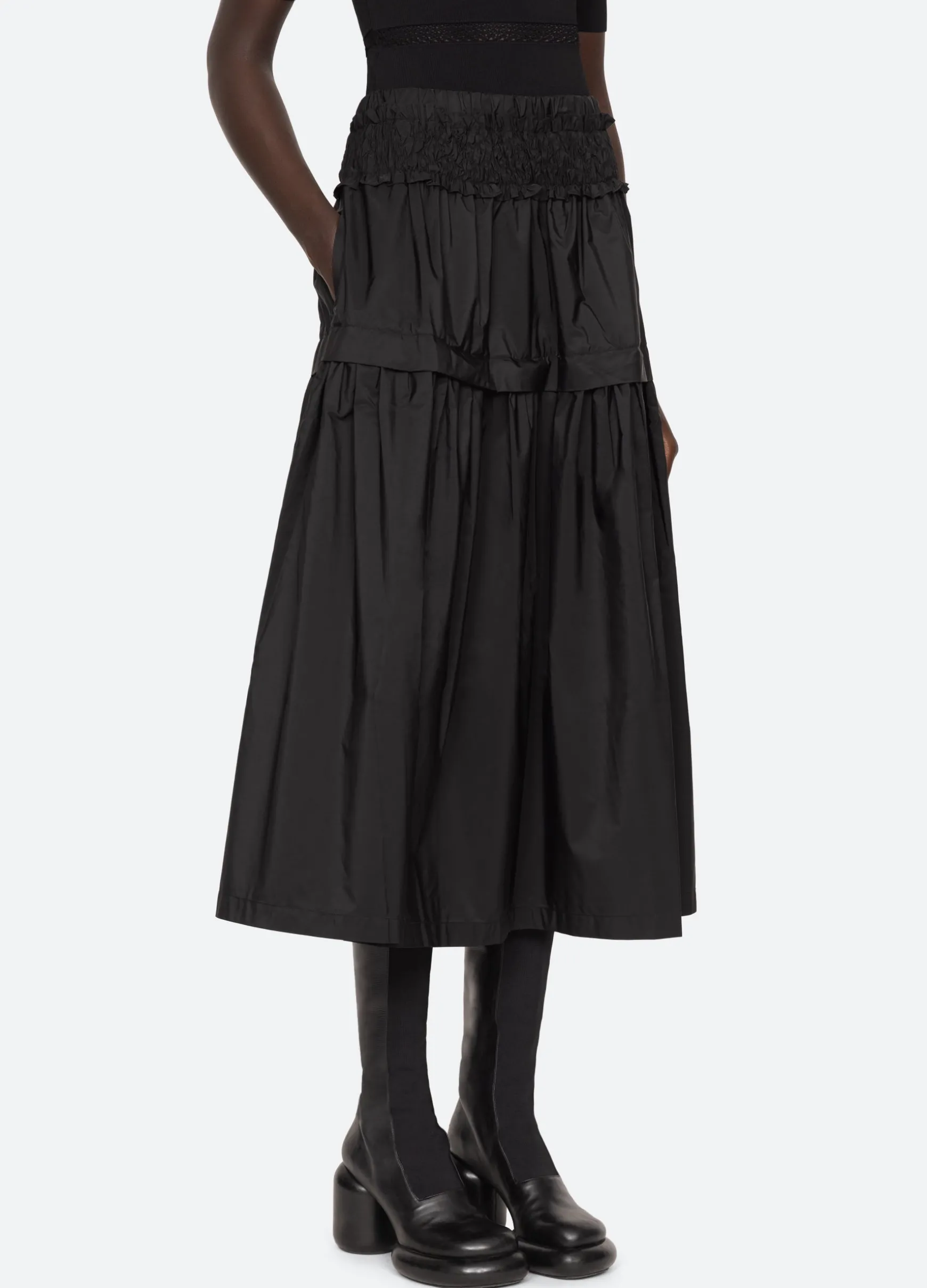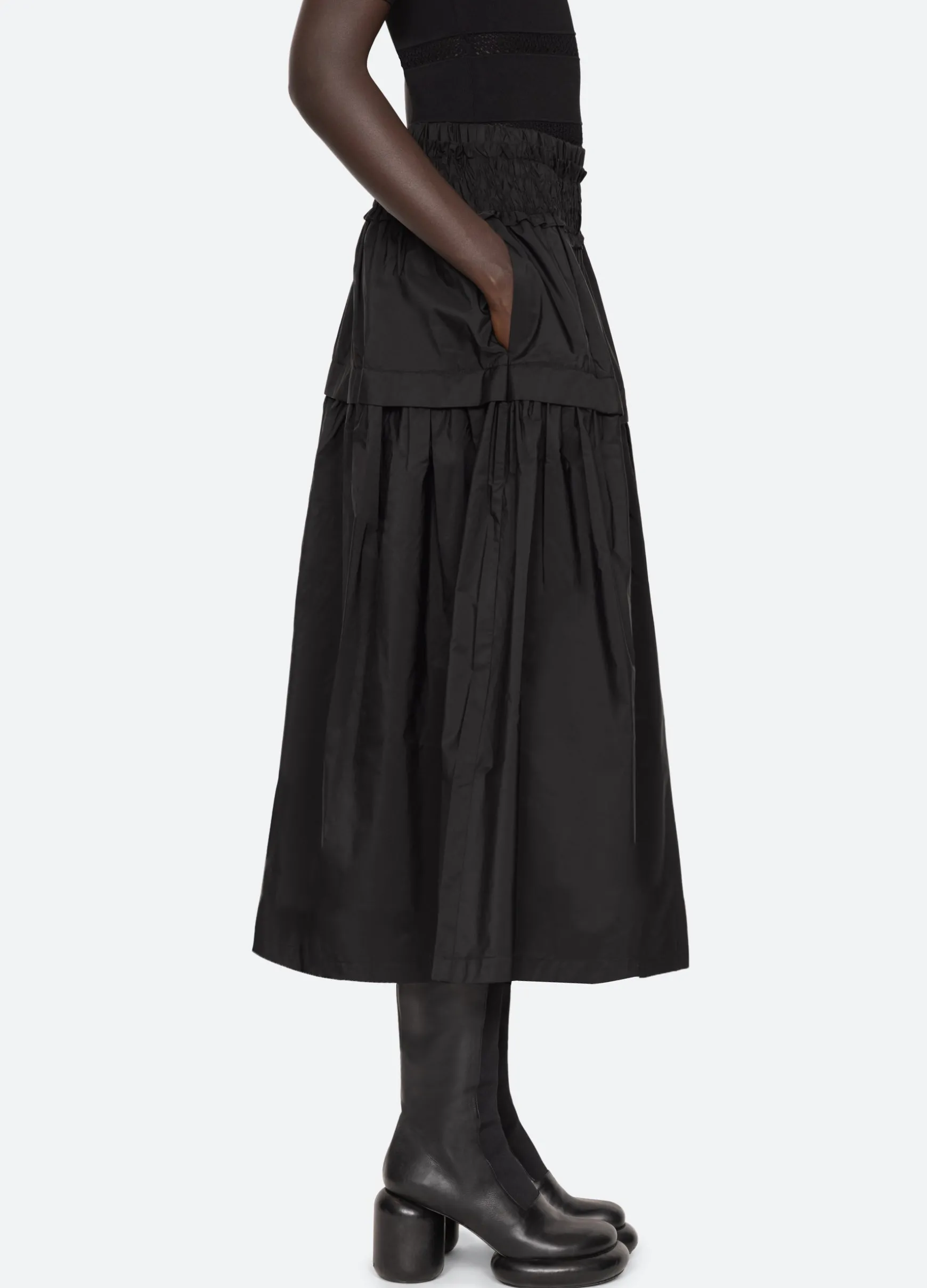 The Belen taffeta skirt features a smocked waistband and midi silhouette.