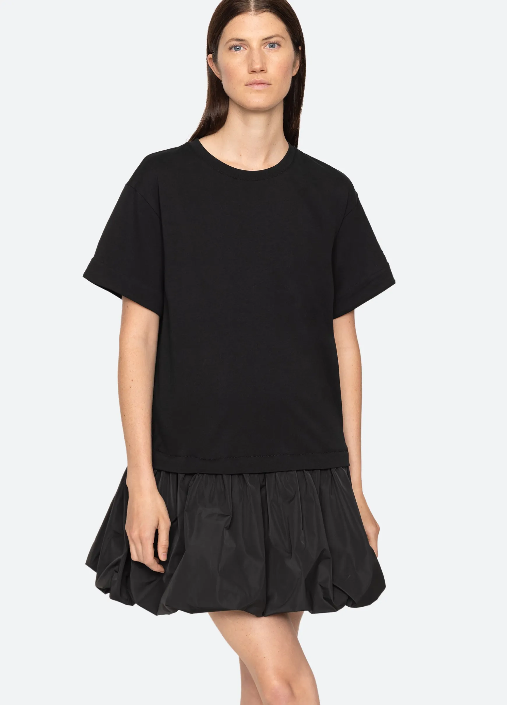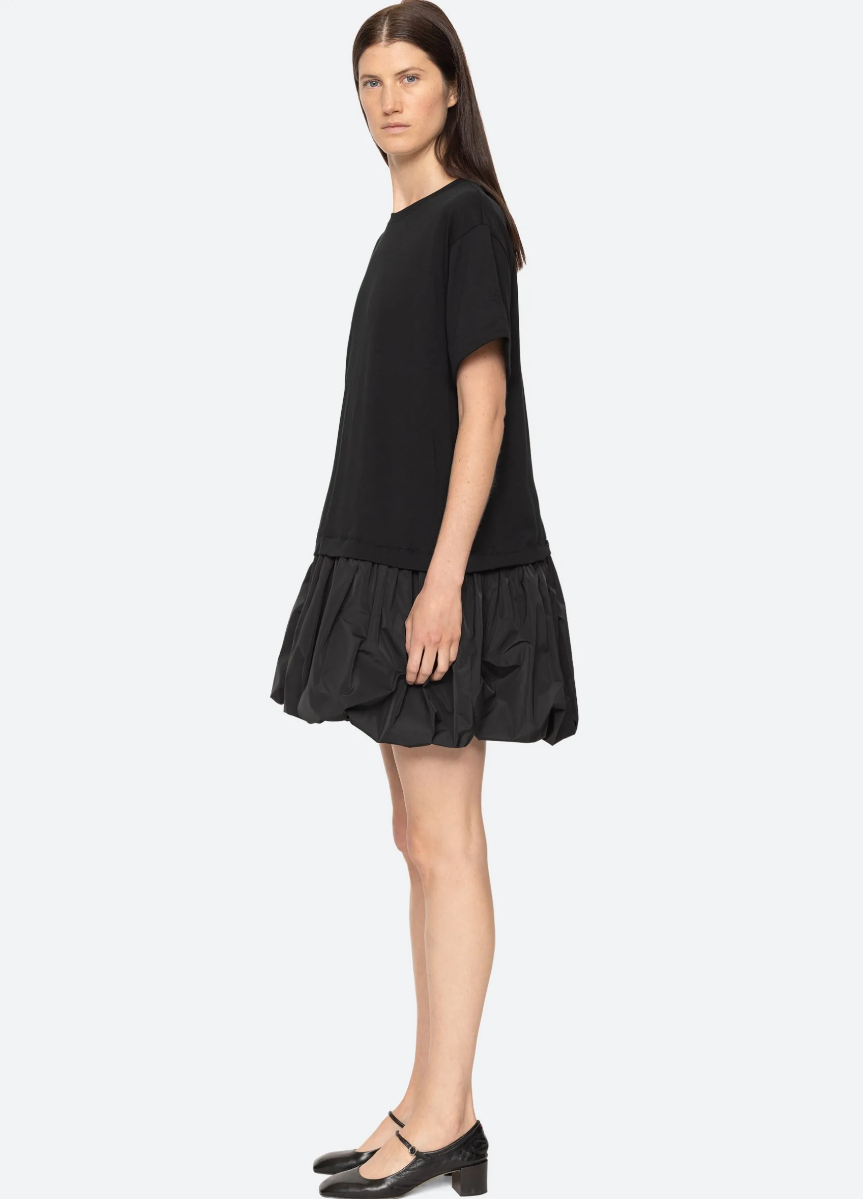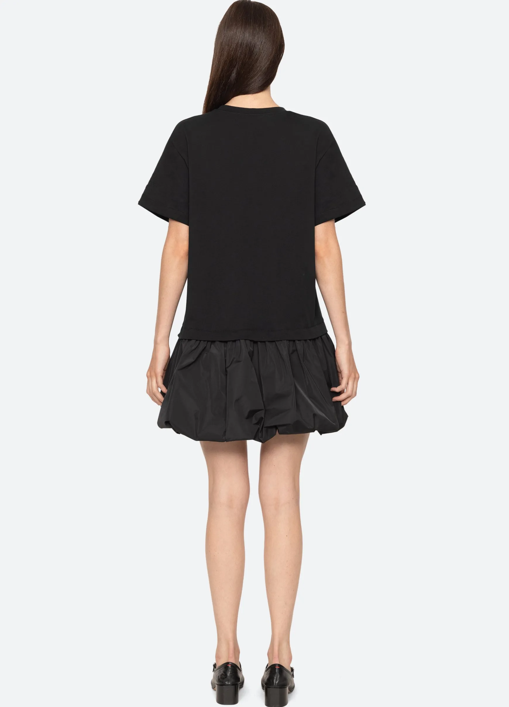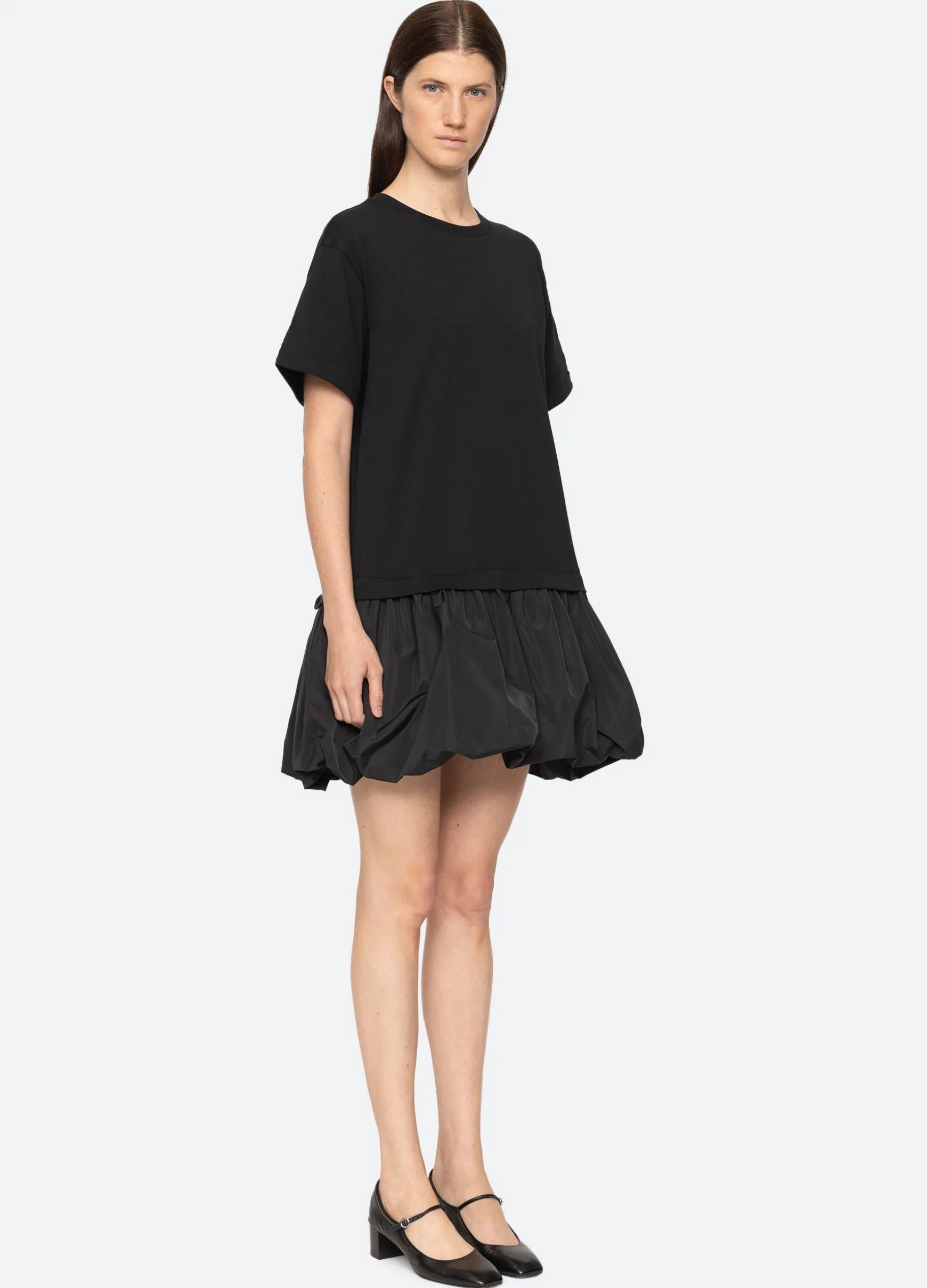 The Belen taffeta t-shirt dress features a combo black t-shirt top attached to avoluminous taffeta bubble skirt.