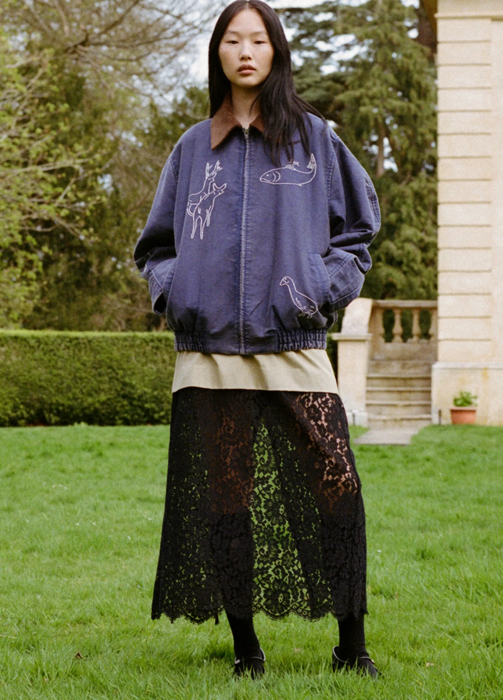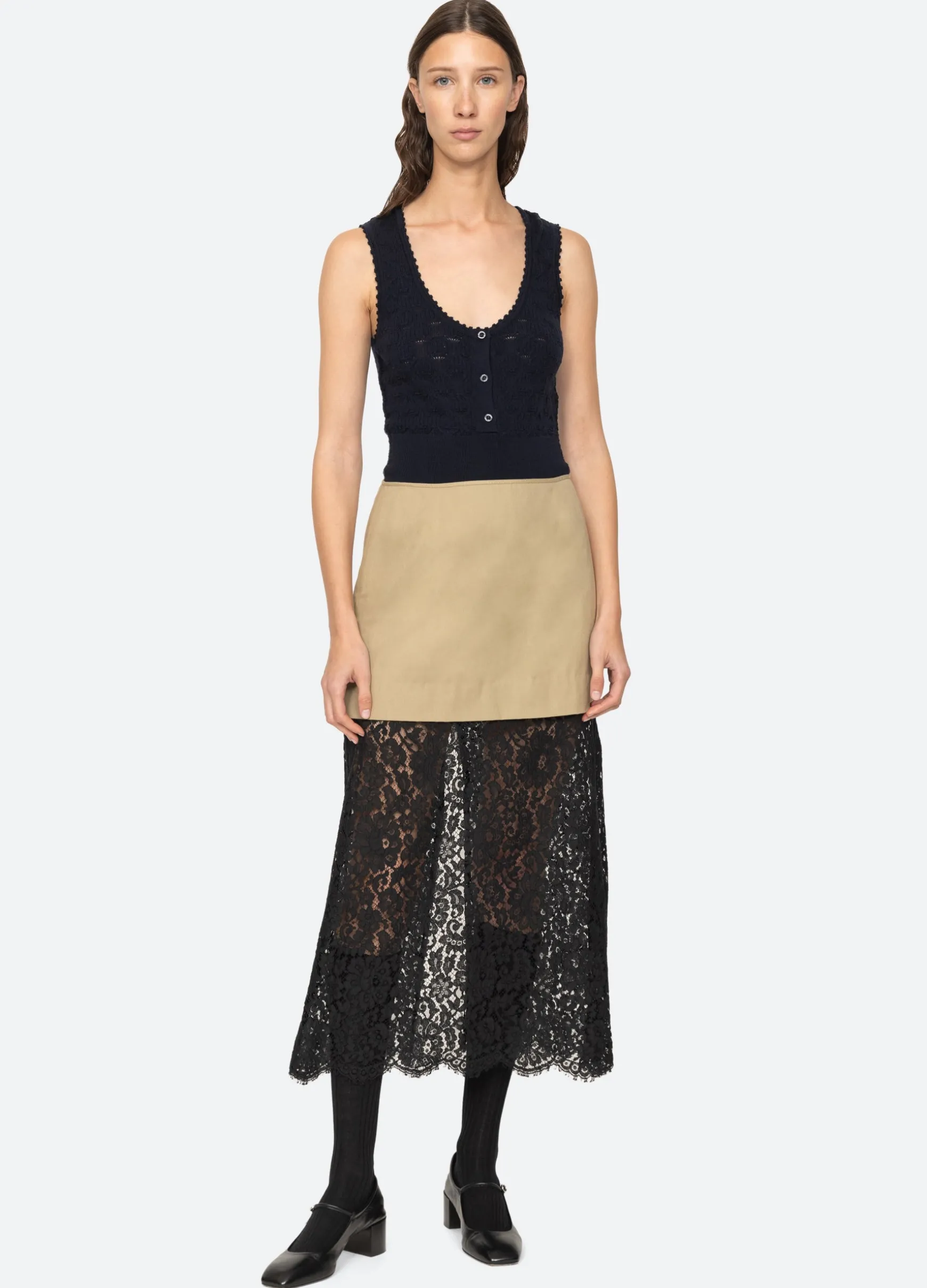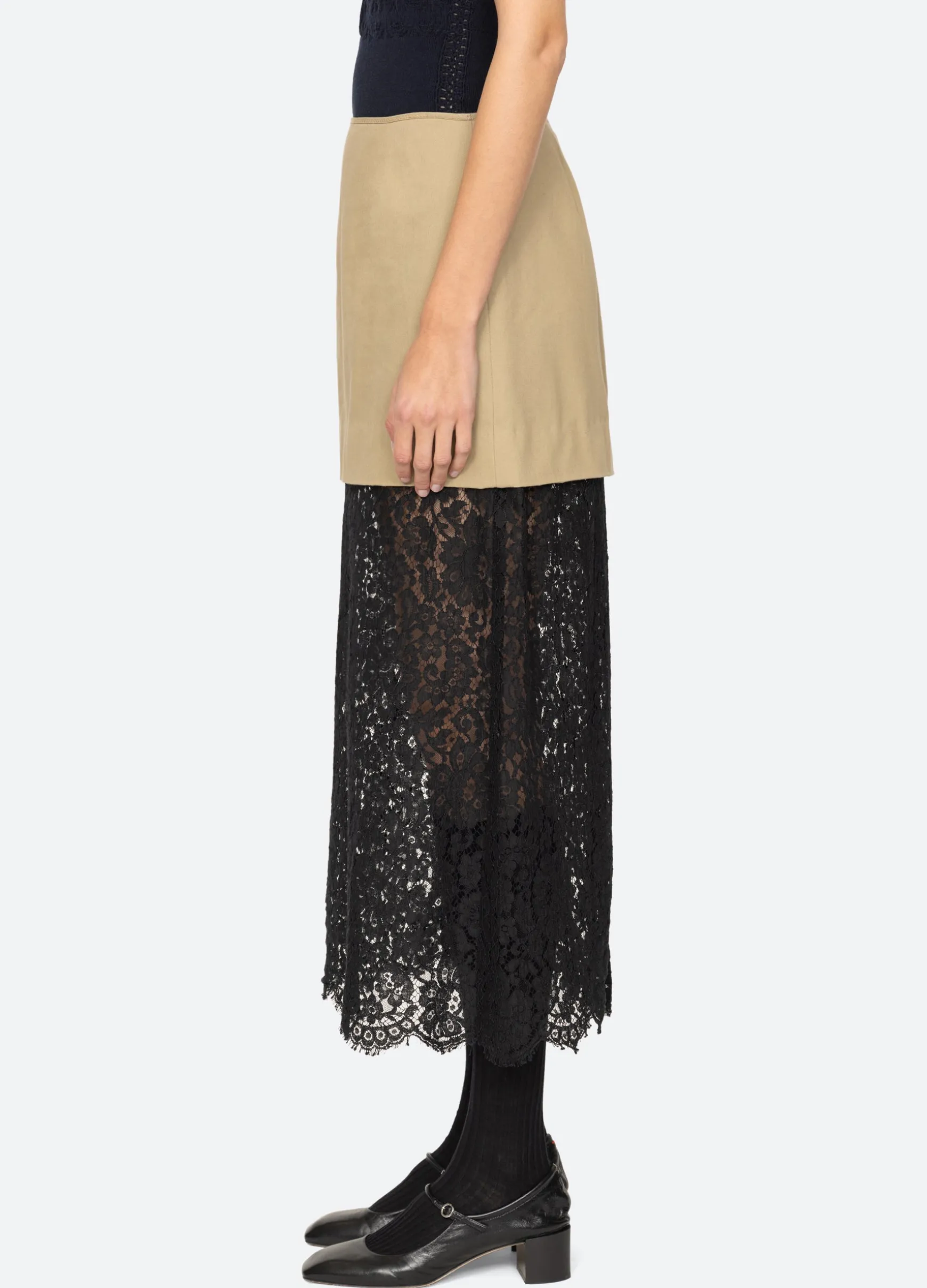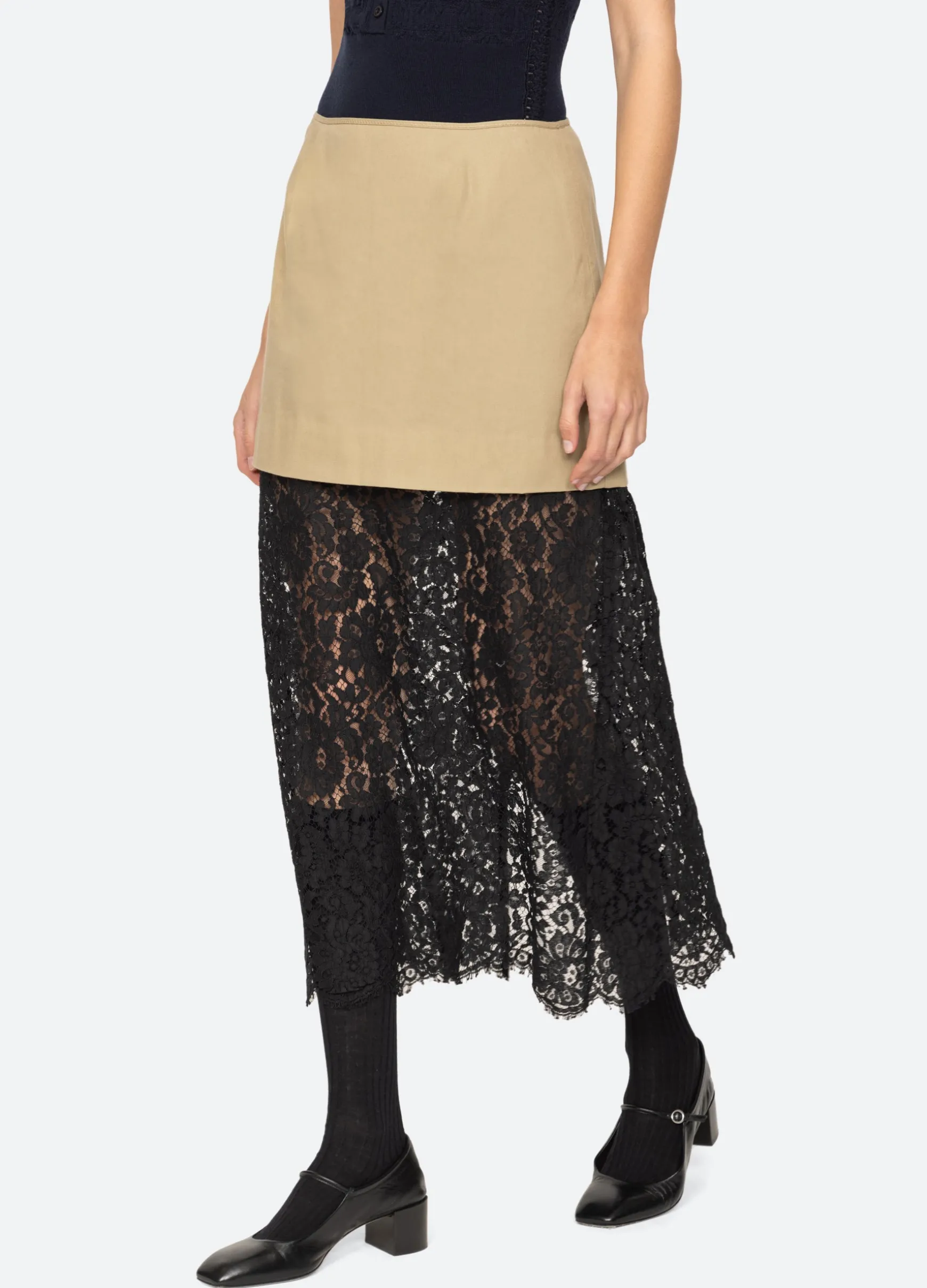 The Belle stone washed chino combo skirtfeatures a cotton mini skirt paired with sheer lace detailing.