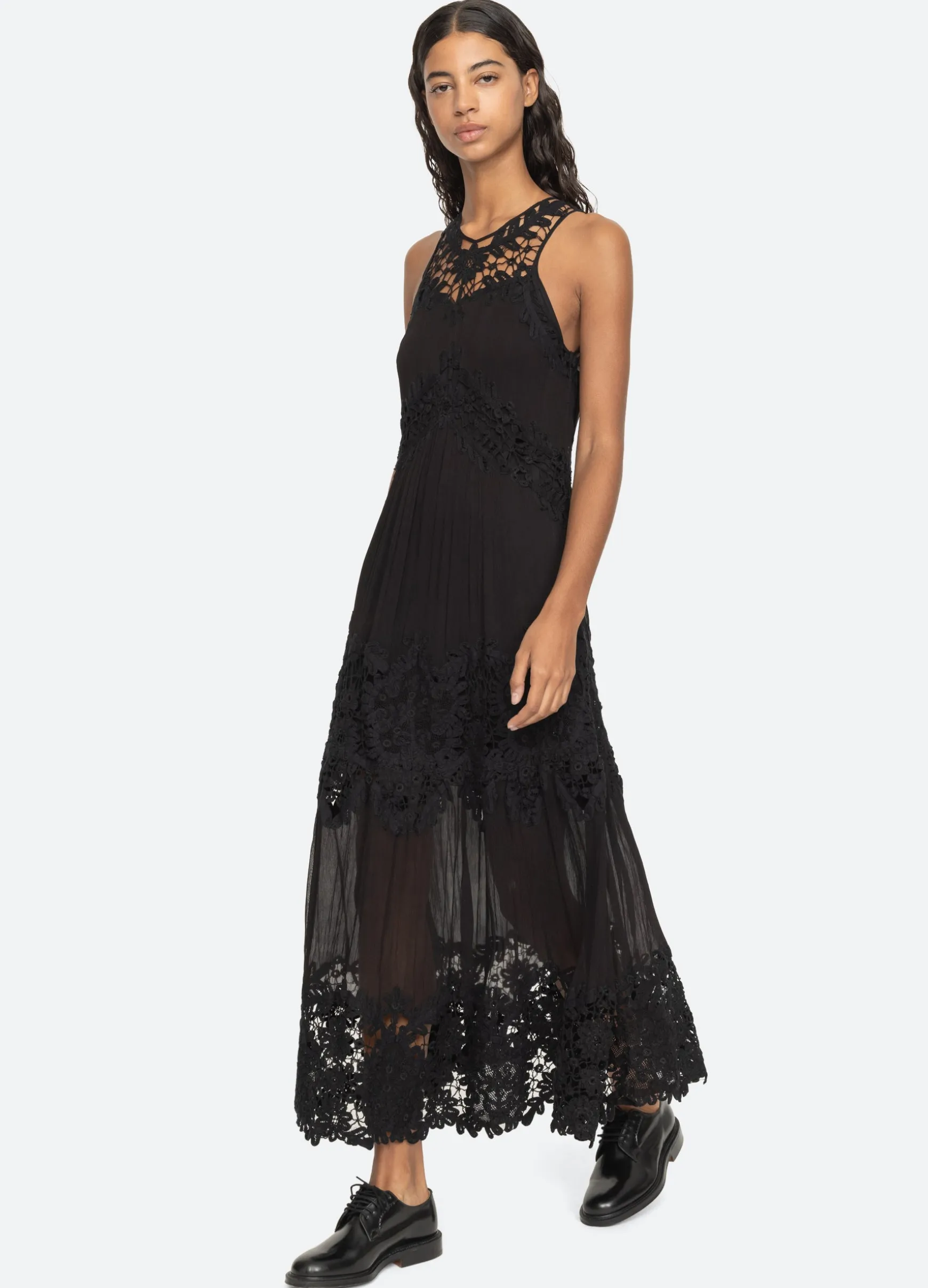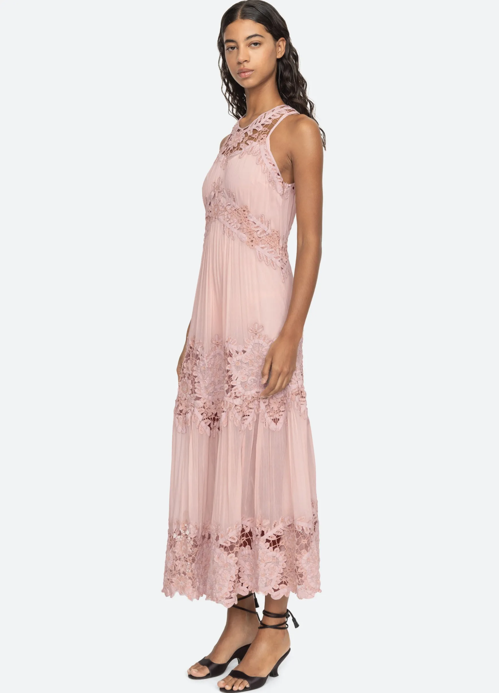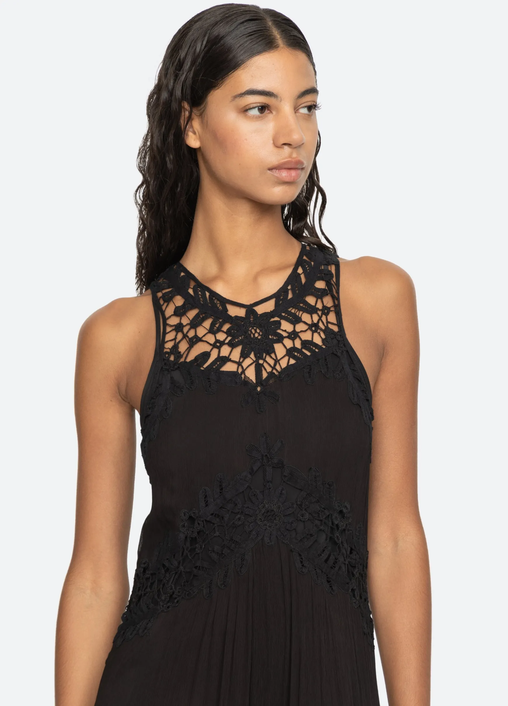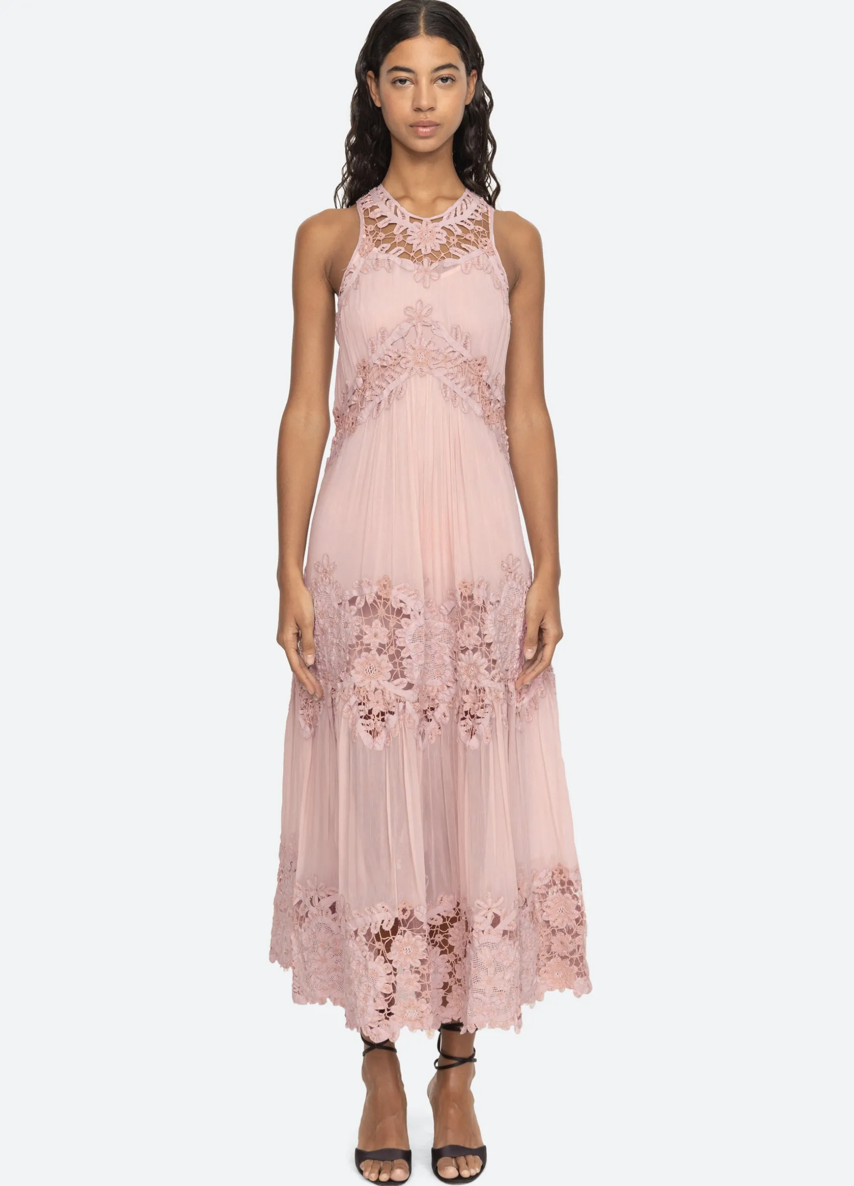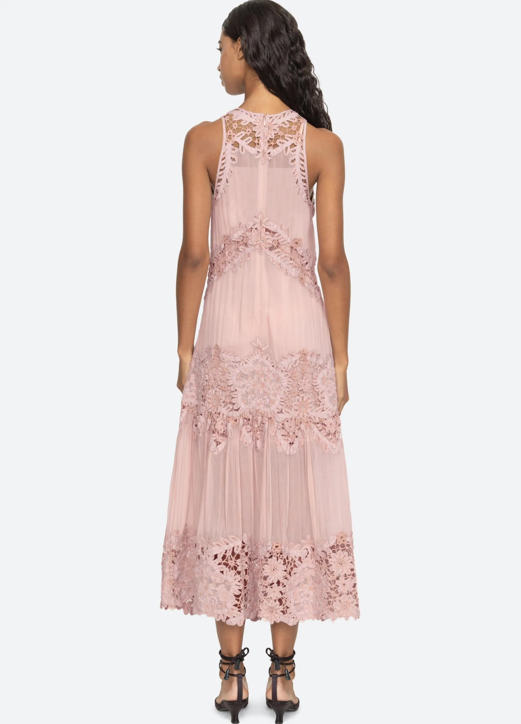 The Bente embroidered tank dress features intricate embroidered lace and sheer accents.