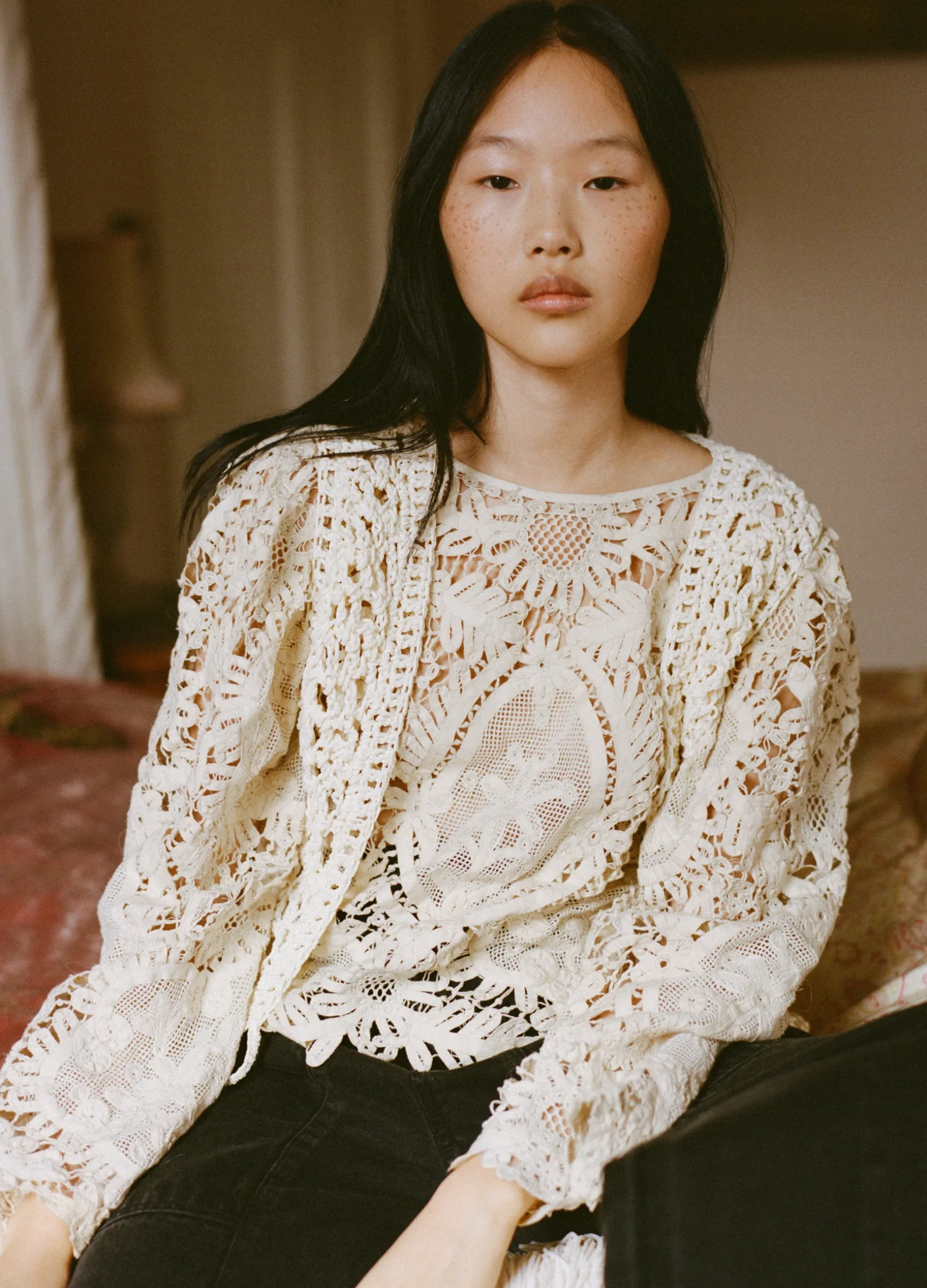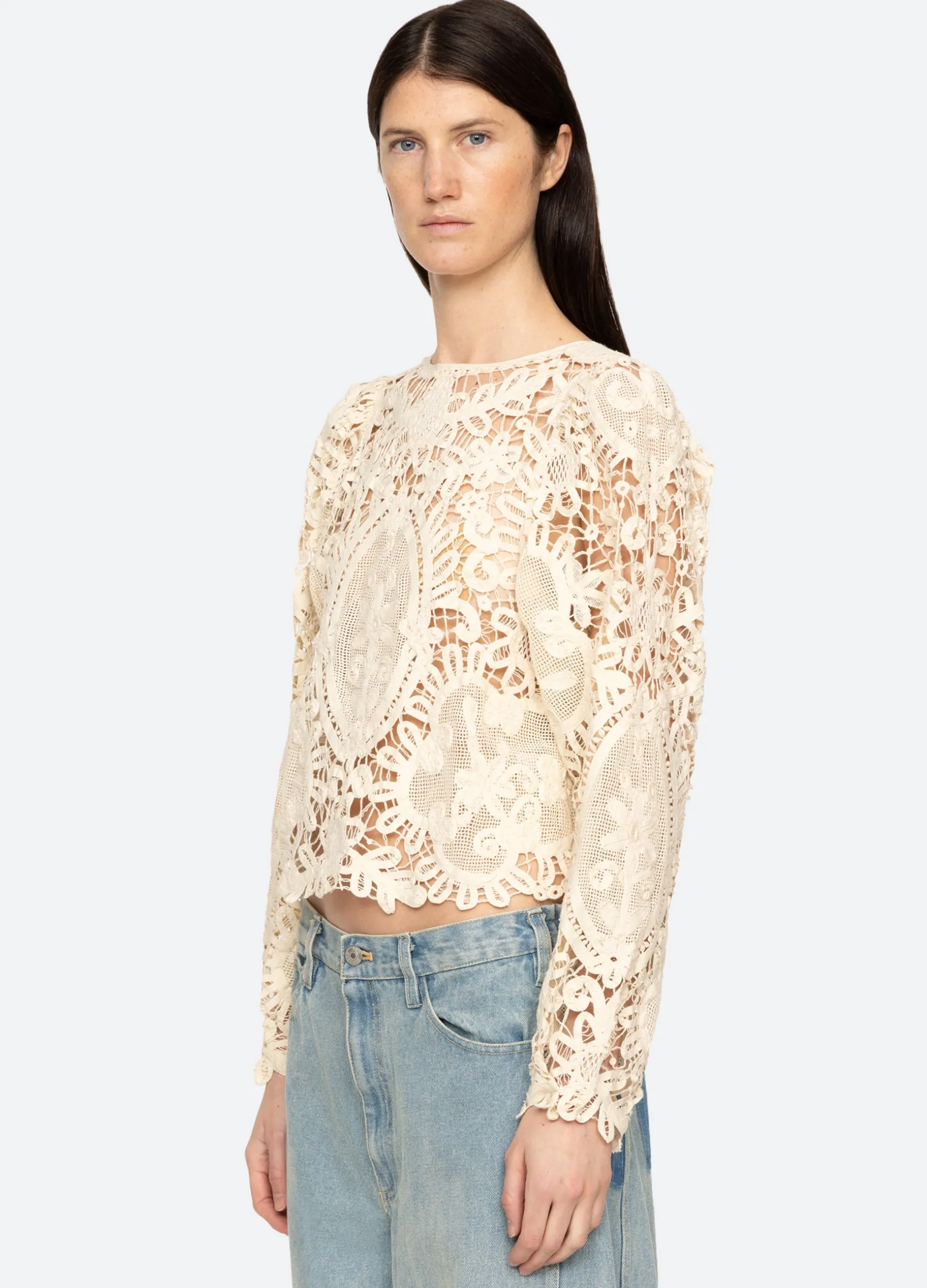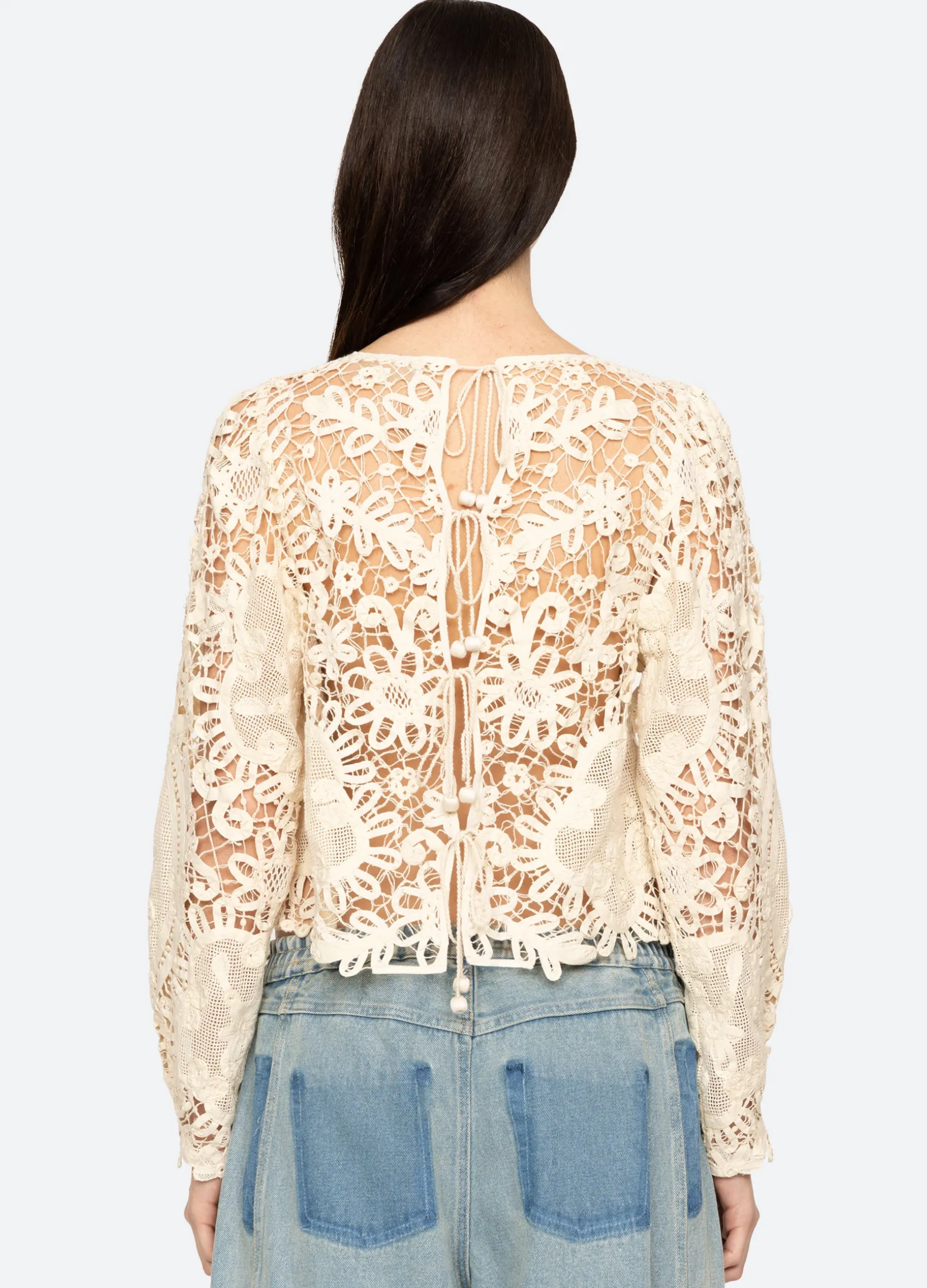 The Bente embroidered long sleeve top features intricate embroidered lace detailing throughout andtie fastening at back.