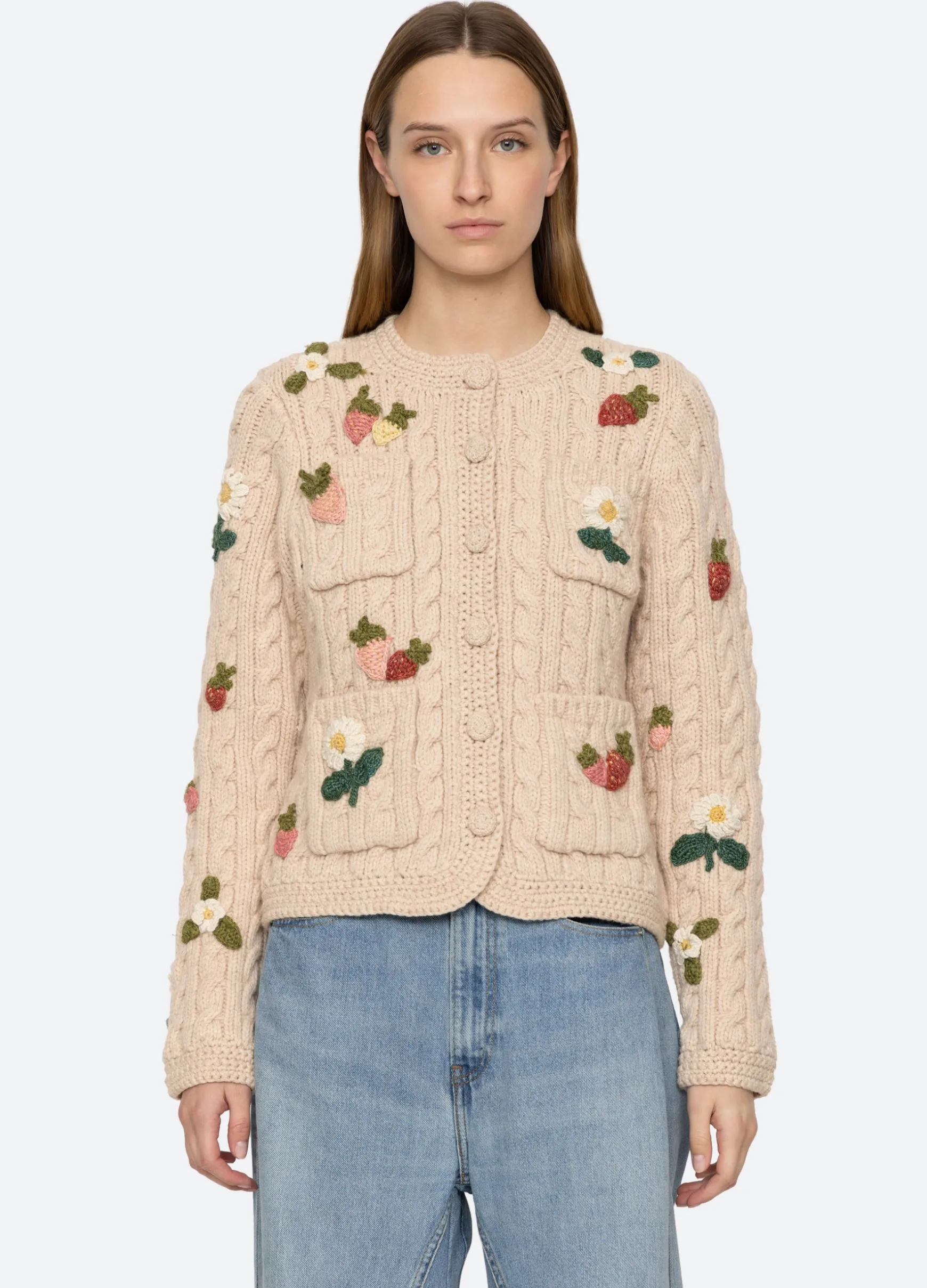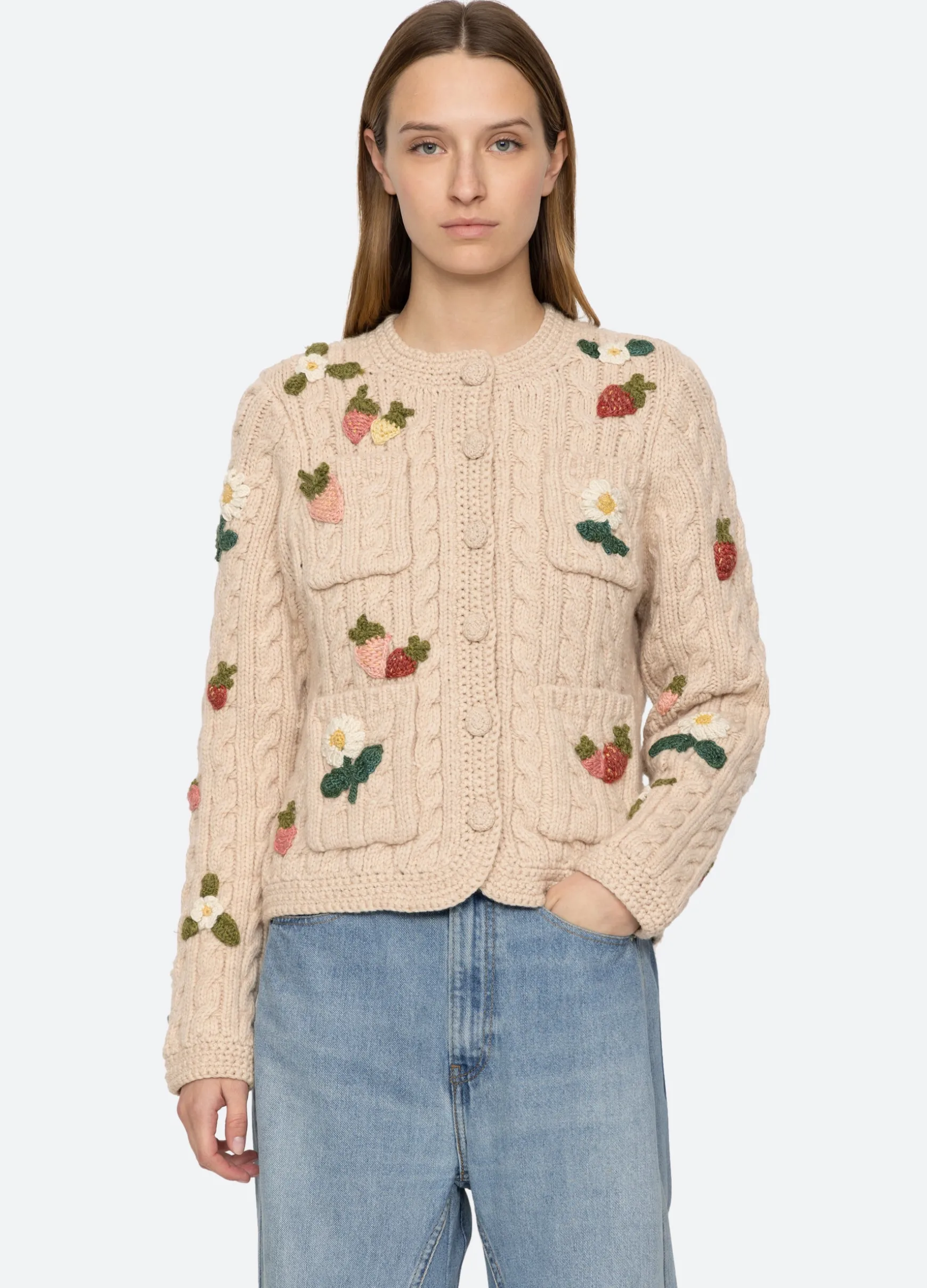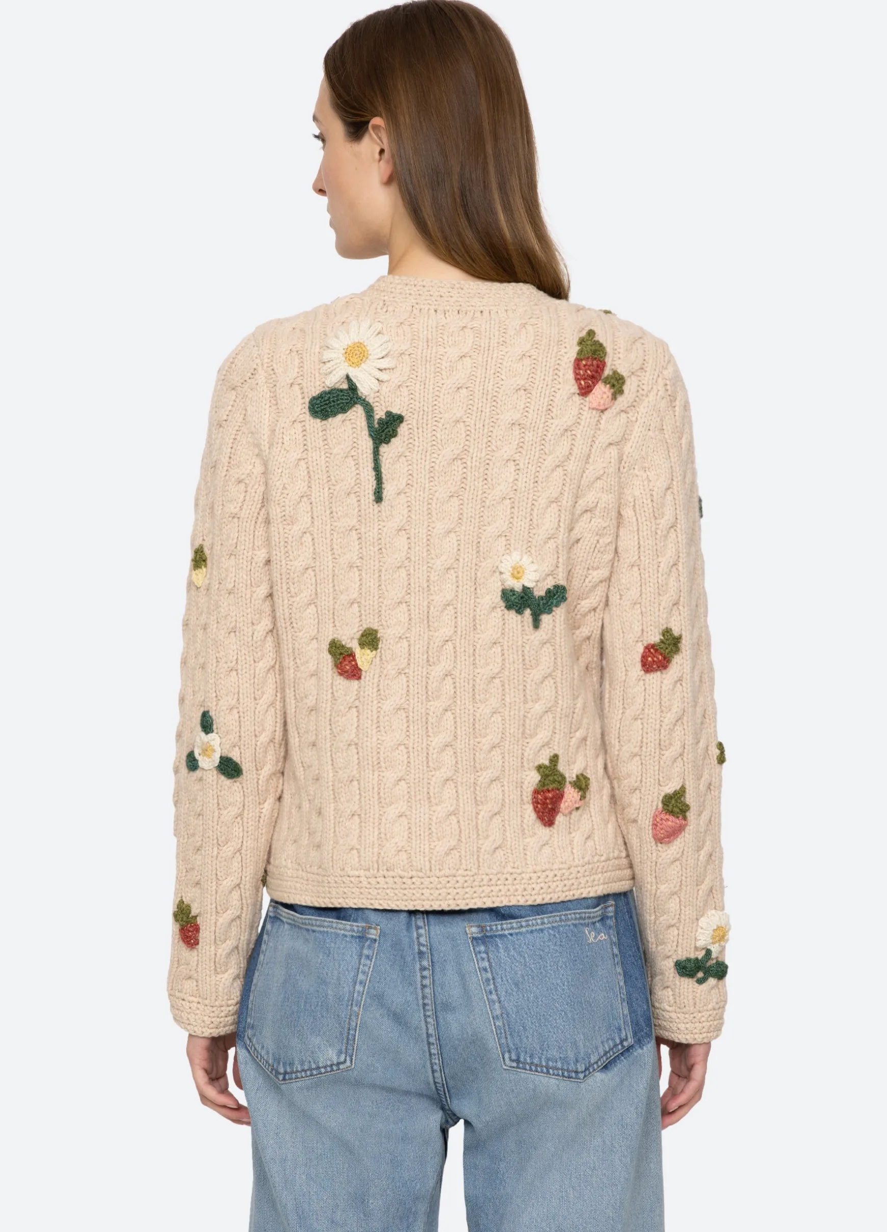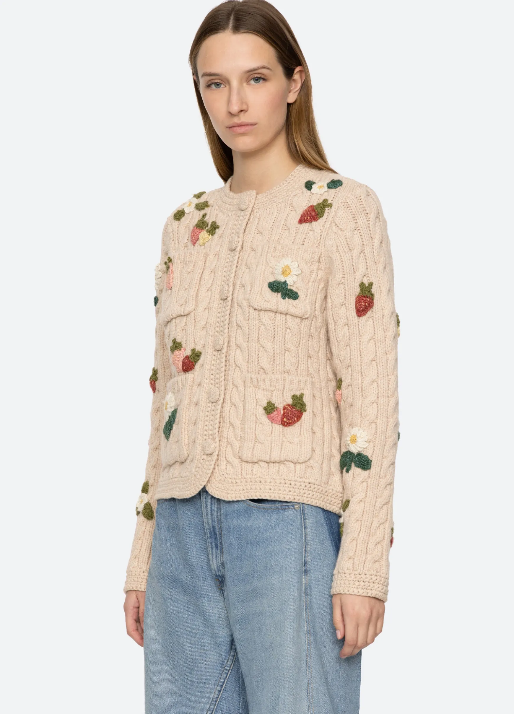 The Callie cardigan features fruit and floral crochet applique and cable knit detailing.