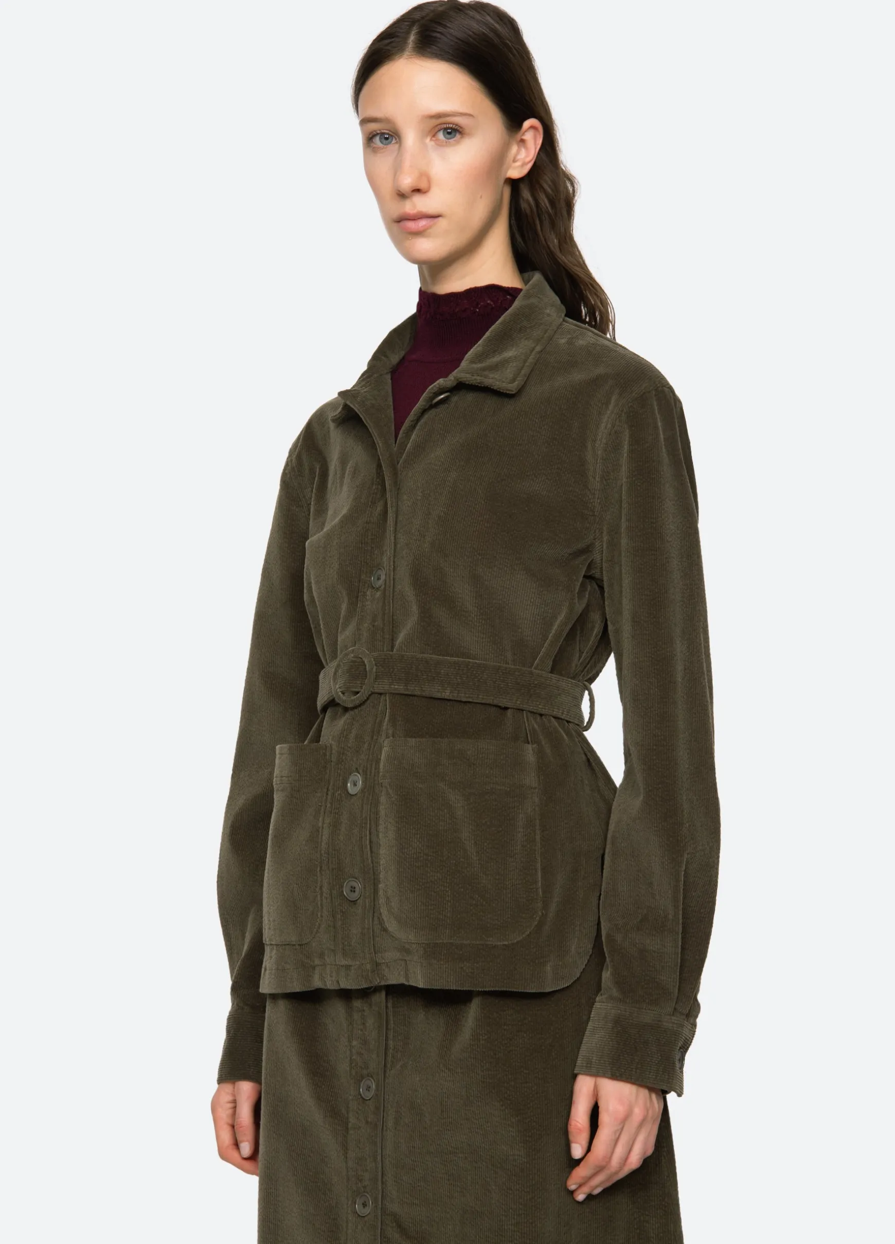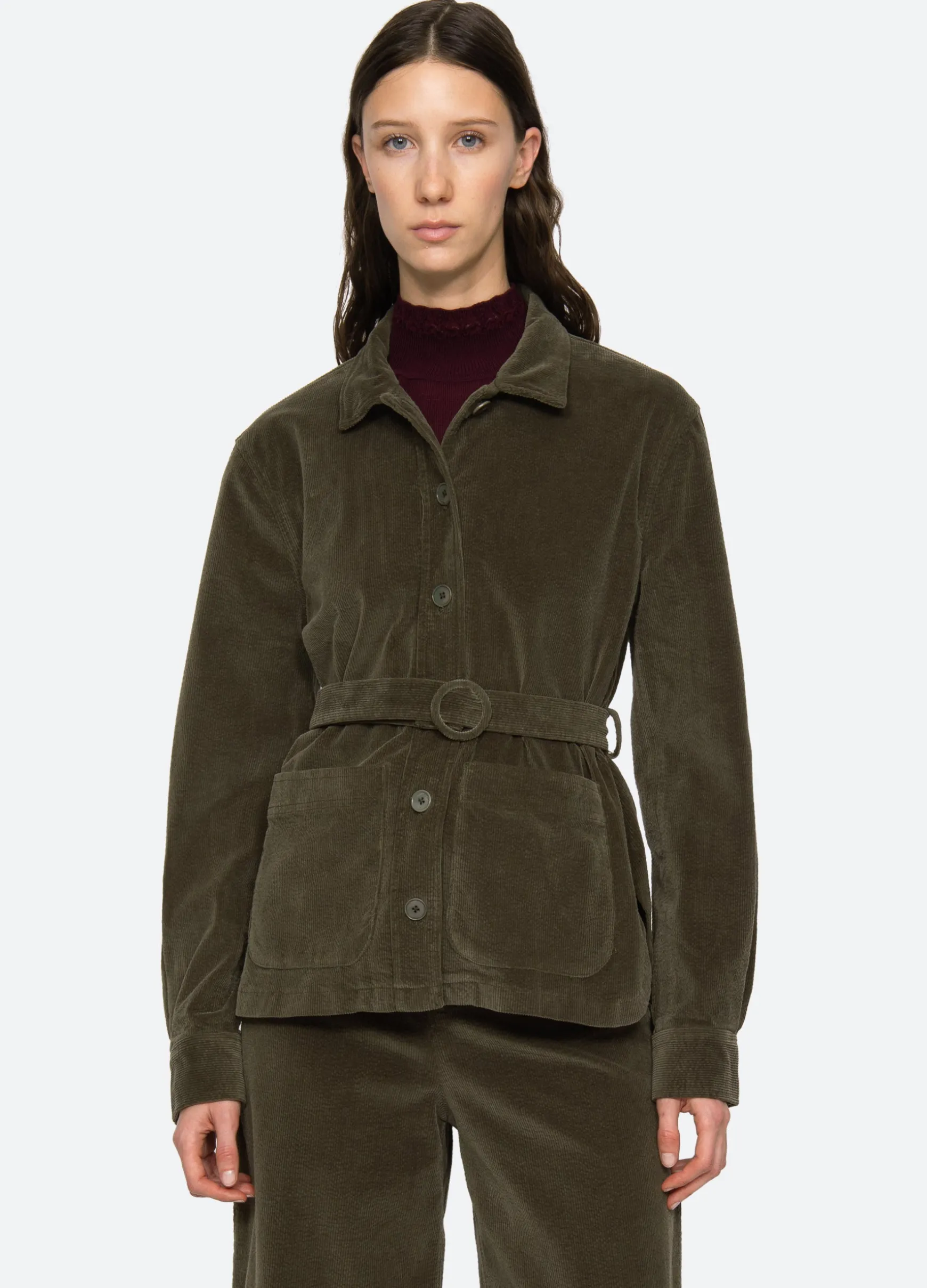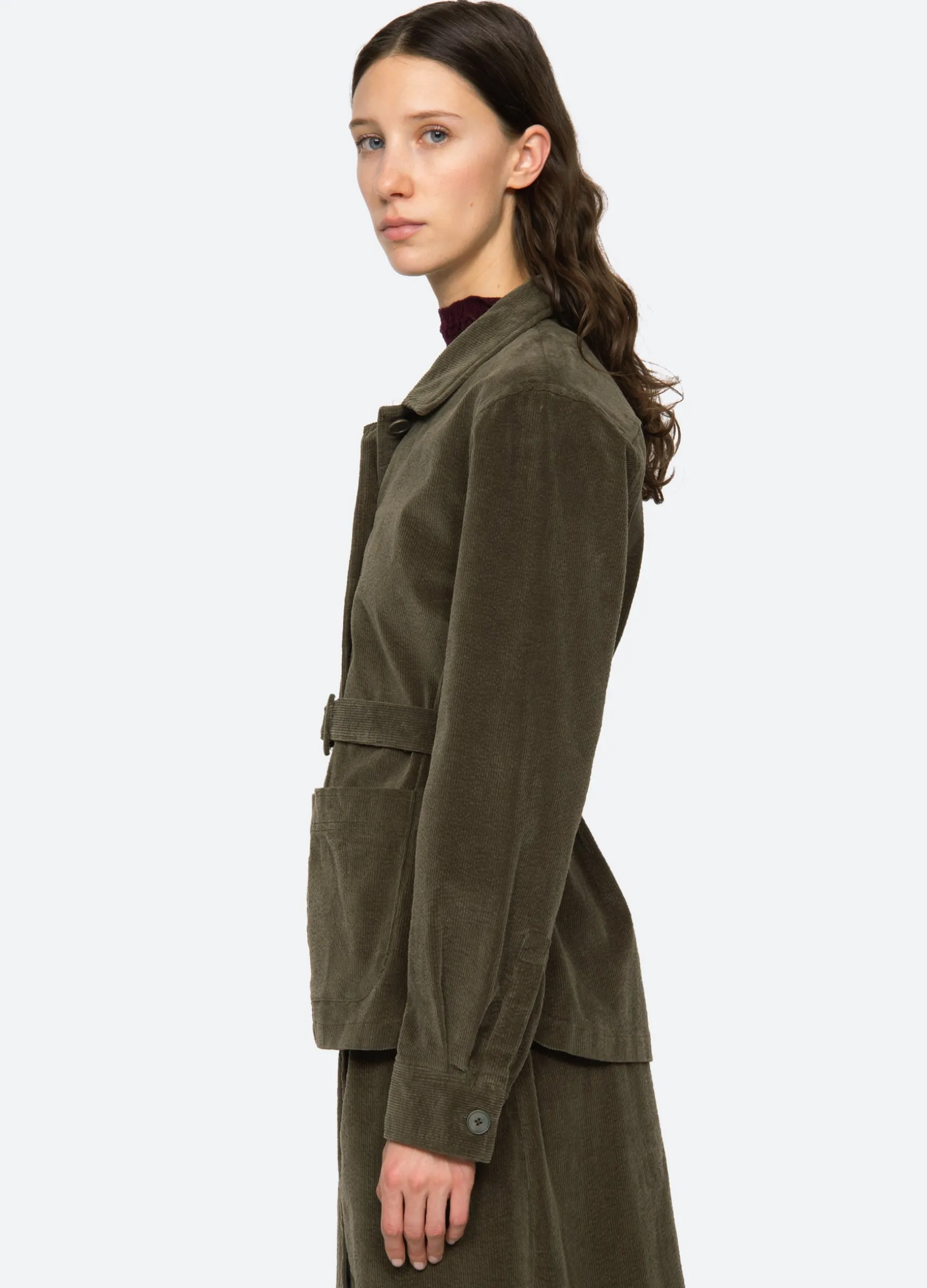 The Carine corduroy jacket features a removable belt and button front. Pairs perfectly with the Carine corduroy jeans.