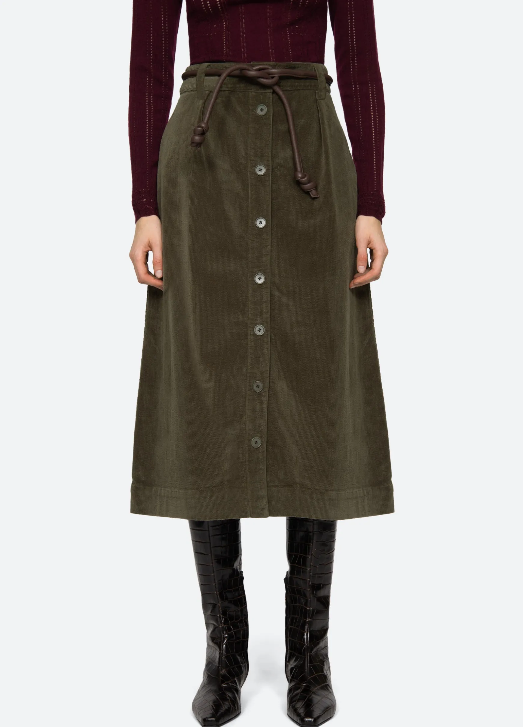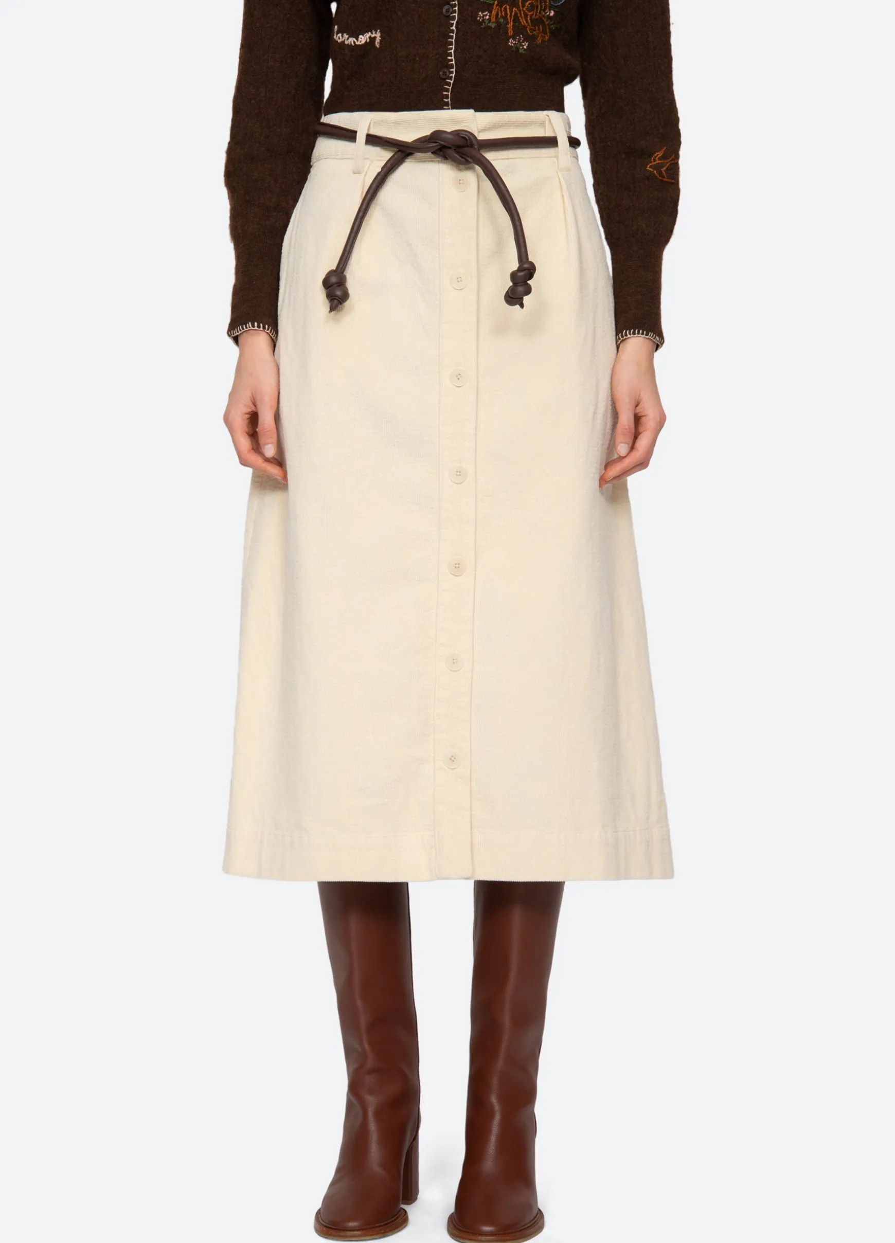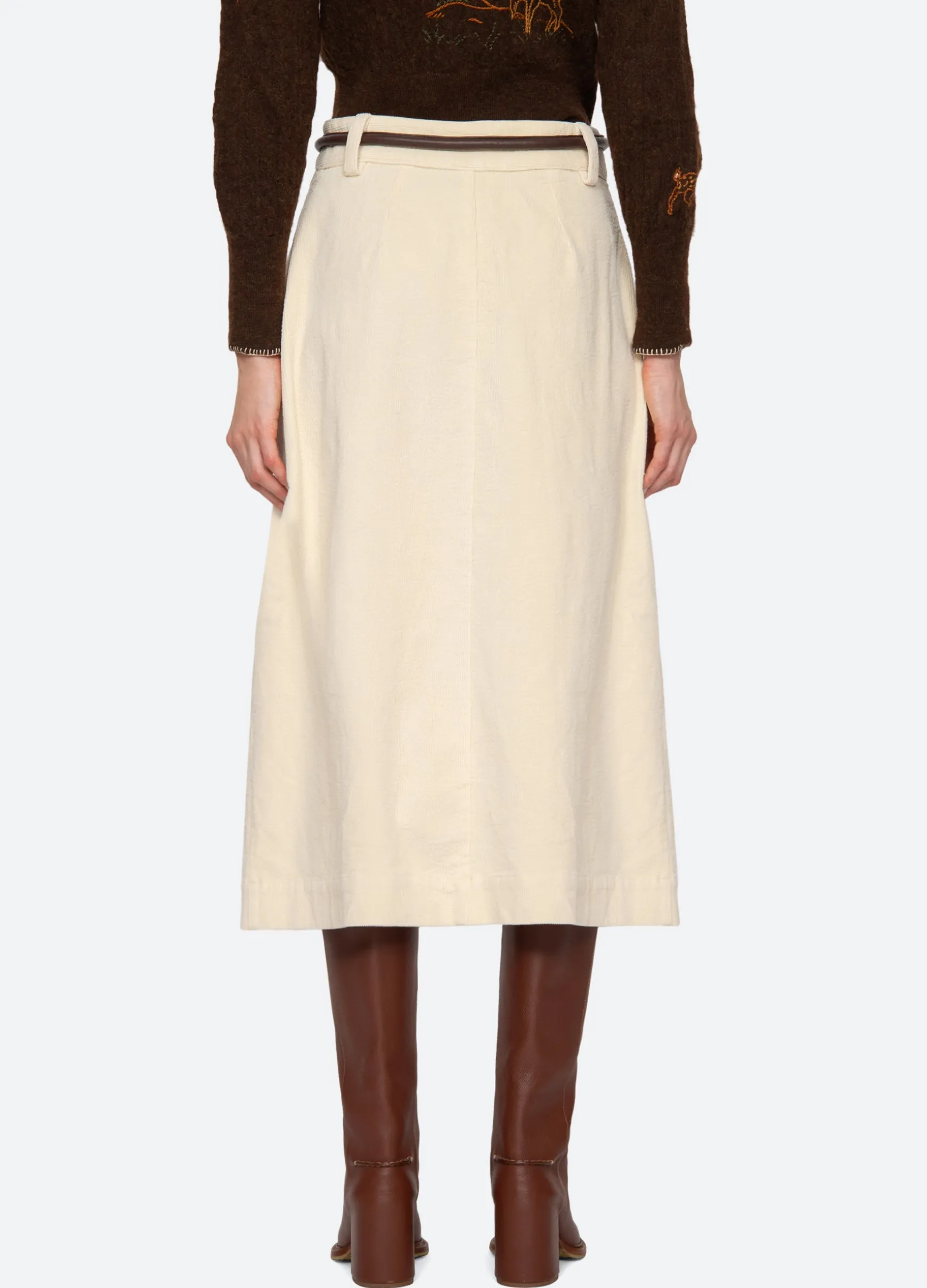 The Carine corduroy skirt features a high waisted and A-line silhouette and a removable belt.