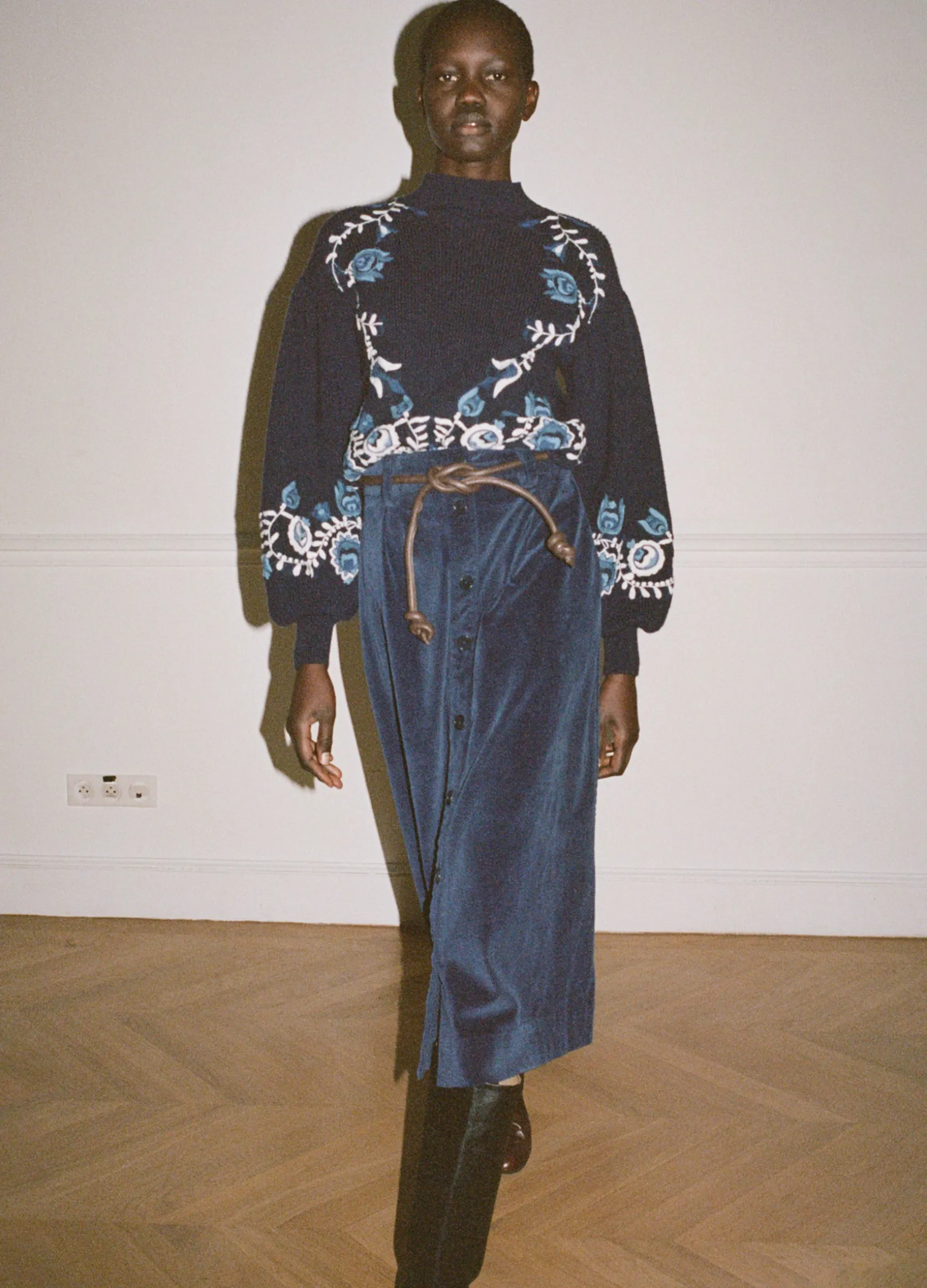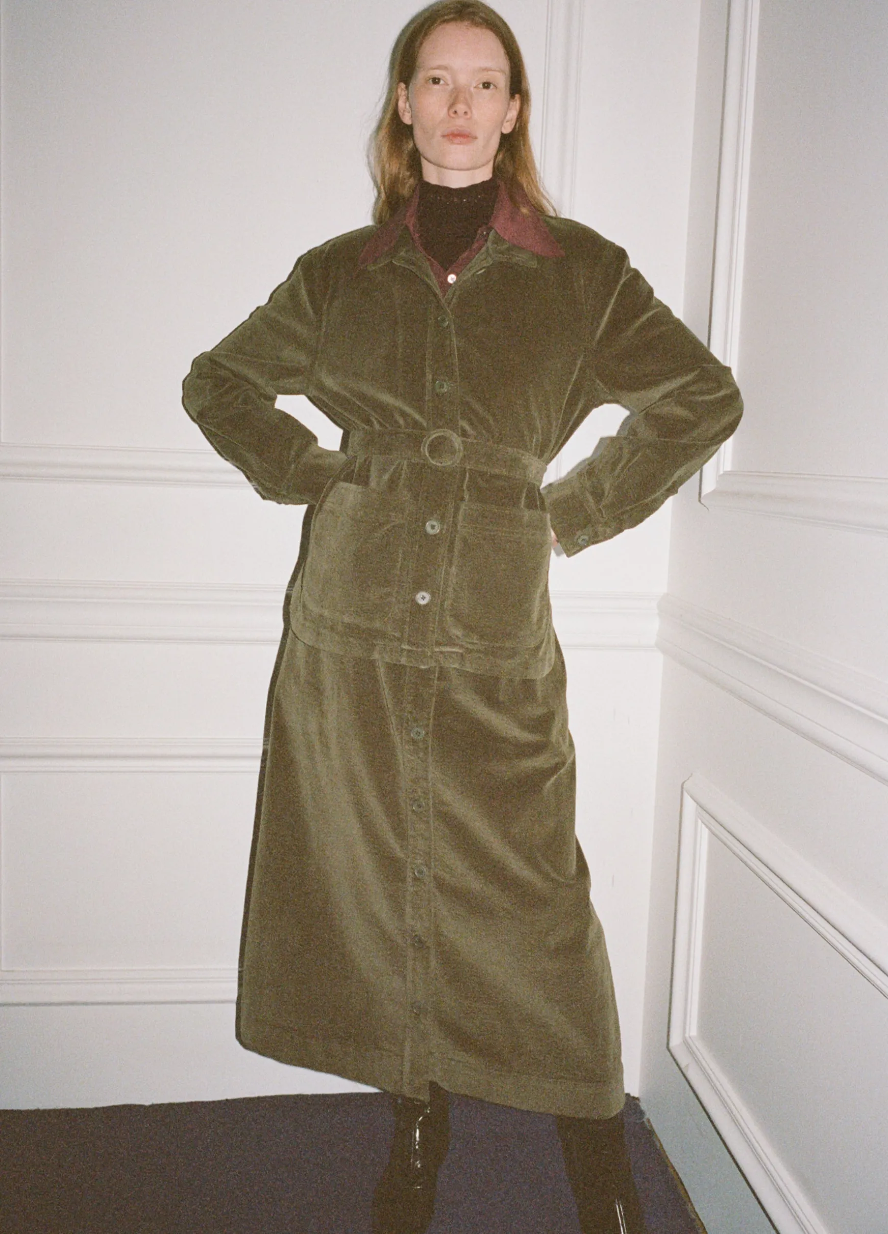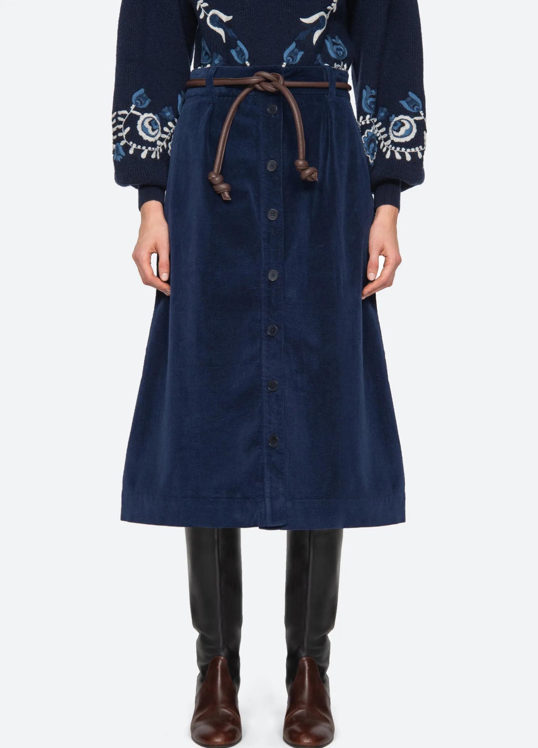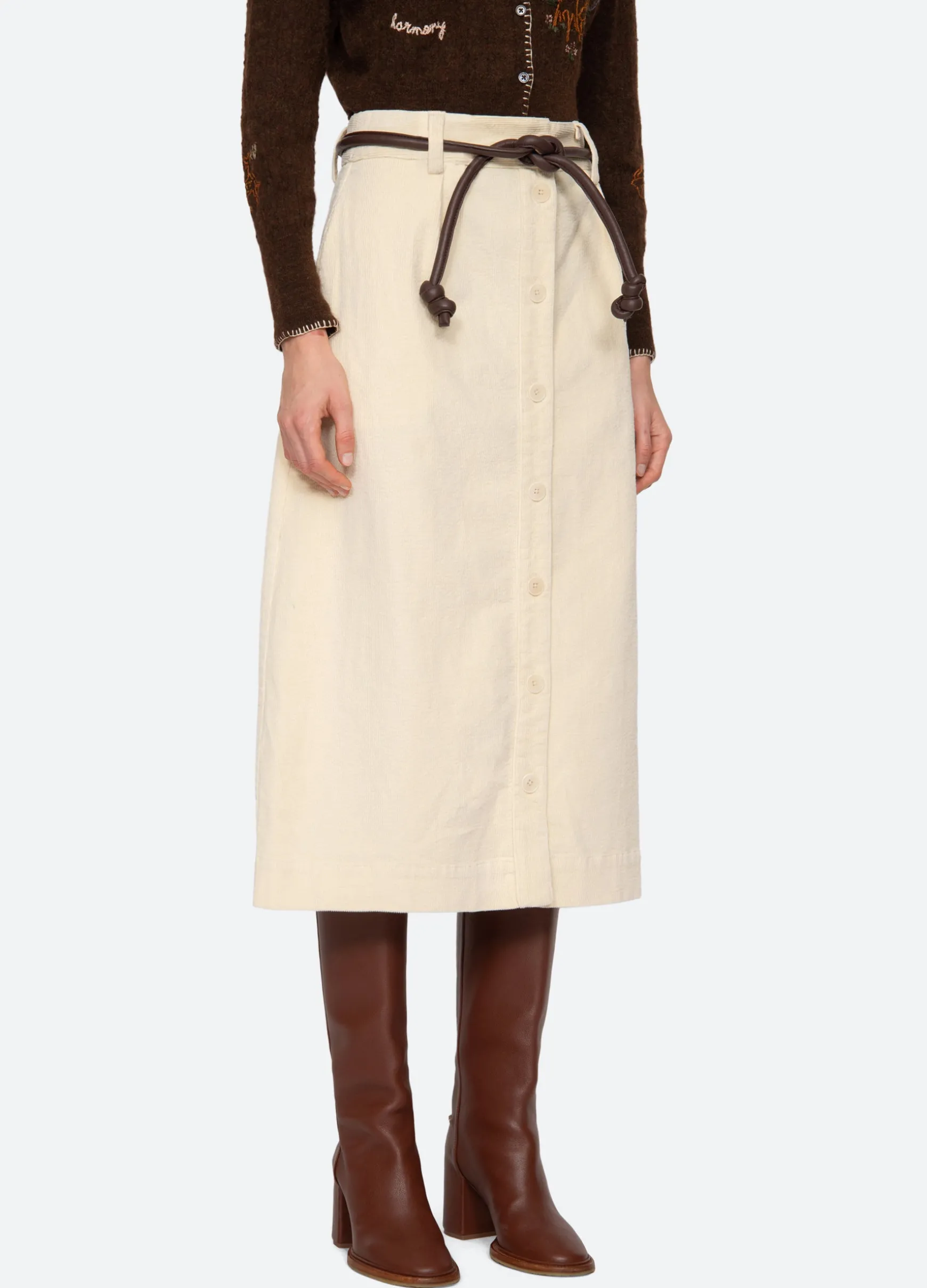 The Carine corduroy skirt features a high waisted and A-line silhouette and a removable belt.