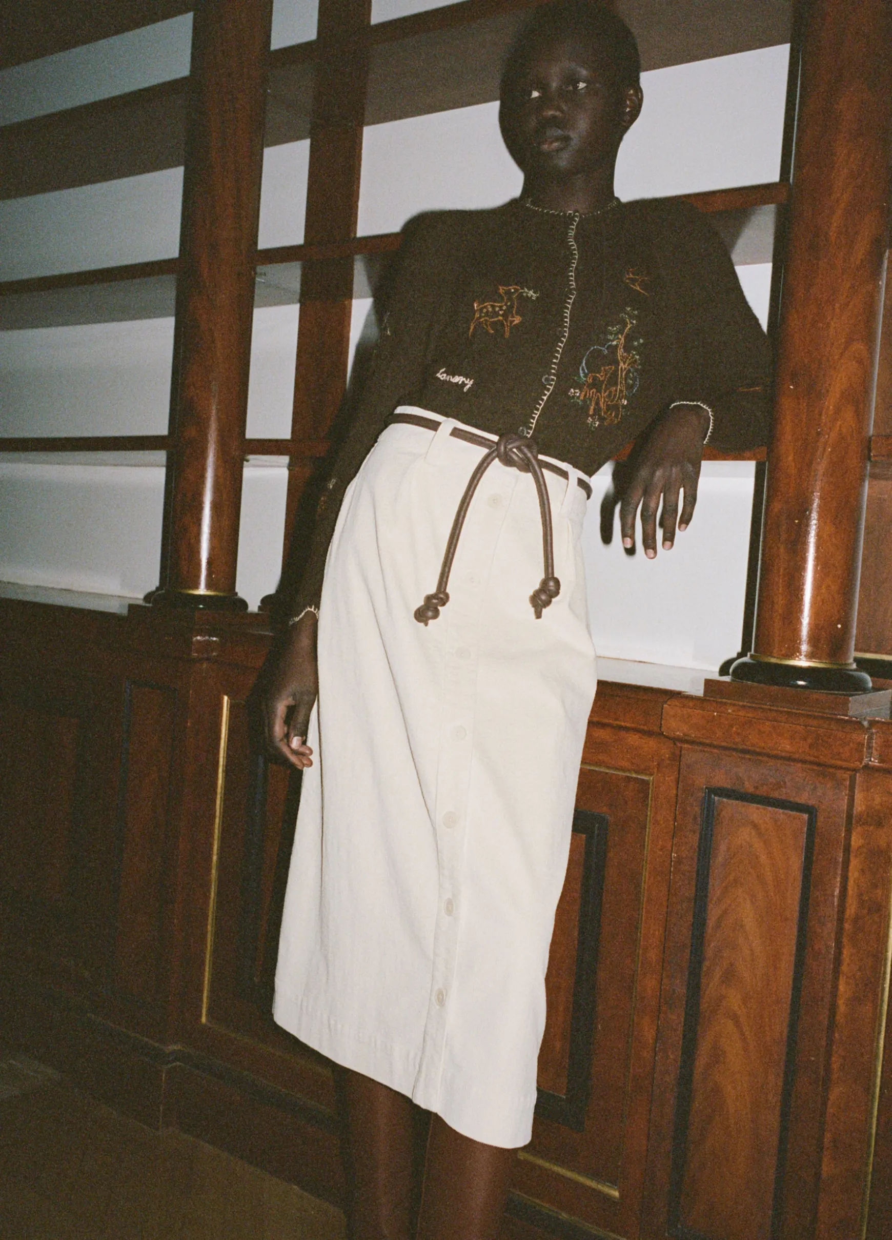 self-98% cotton, 2% spandexbelt-100% lamb leatherfront button closuremodel is 5’10” and wearing a size 4The Carine cord…