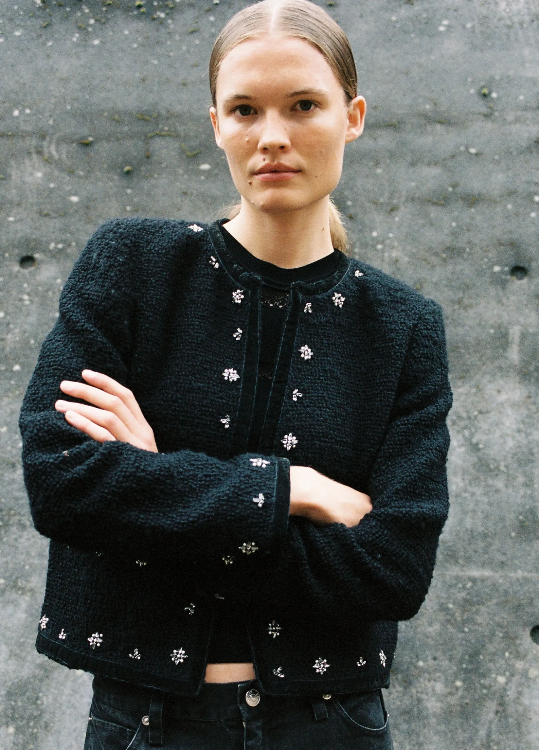 self-80% polyester, 20% wooldecoration-bead & pearlhook and eye front closuredesigned for a relaxed fitmodel is 5’10…