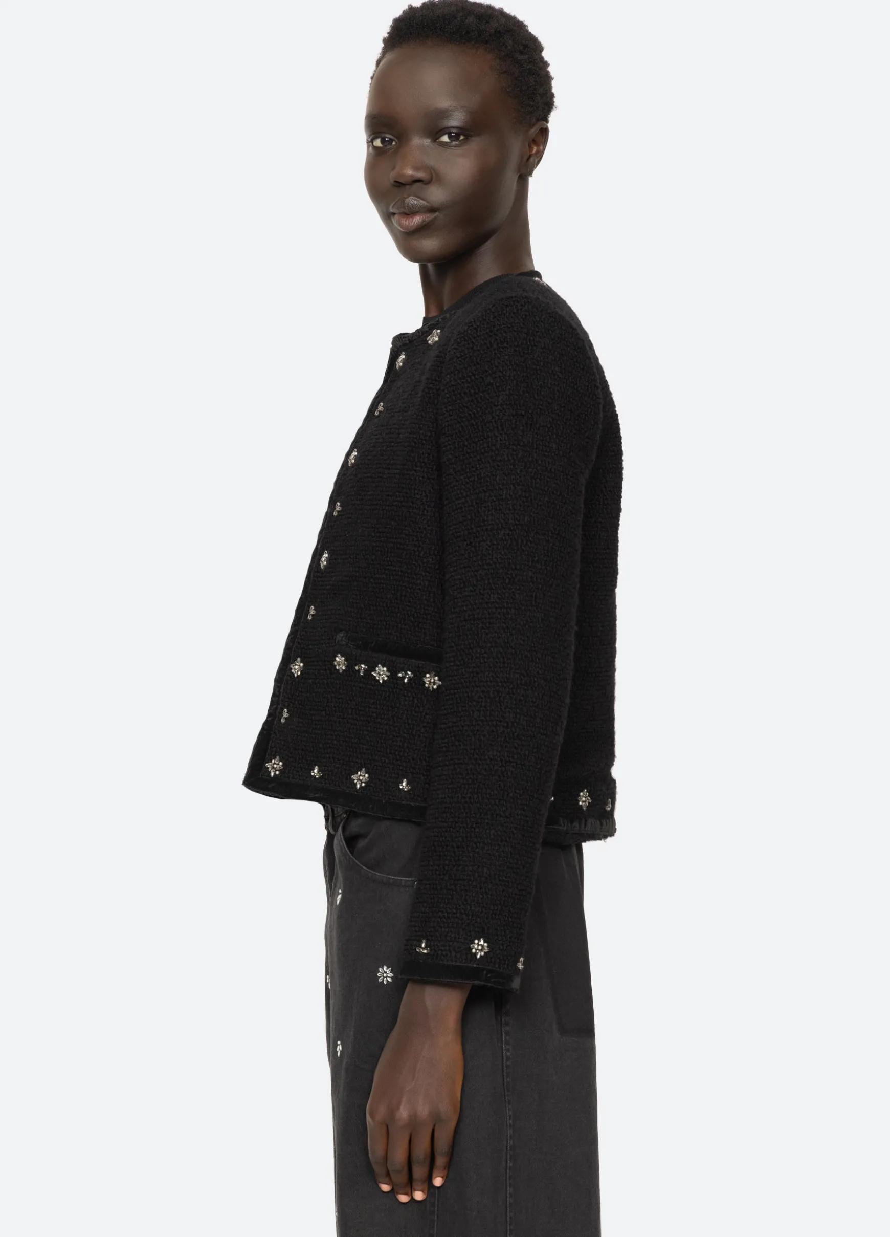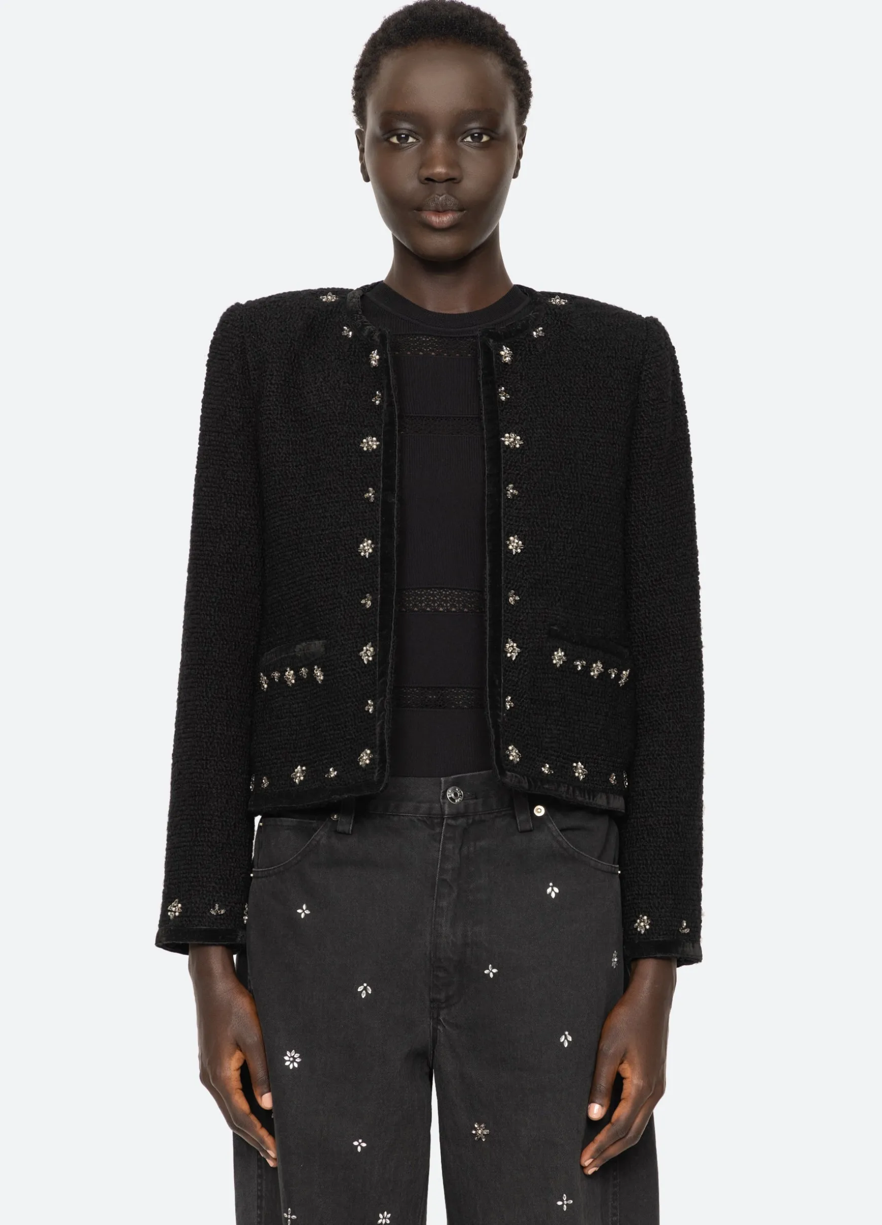 The Caryl beaded jacket is accented with rhinestones, pearls and velvet trim.