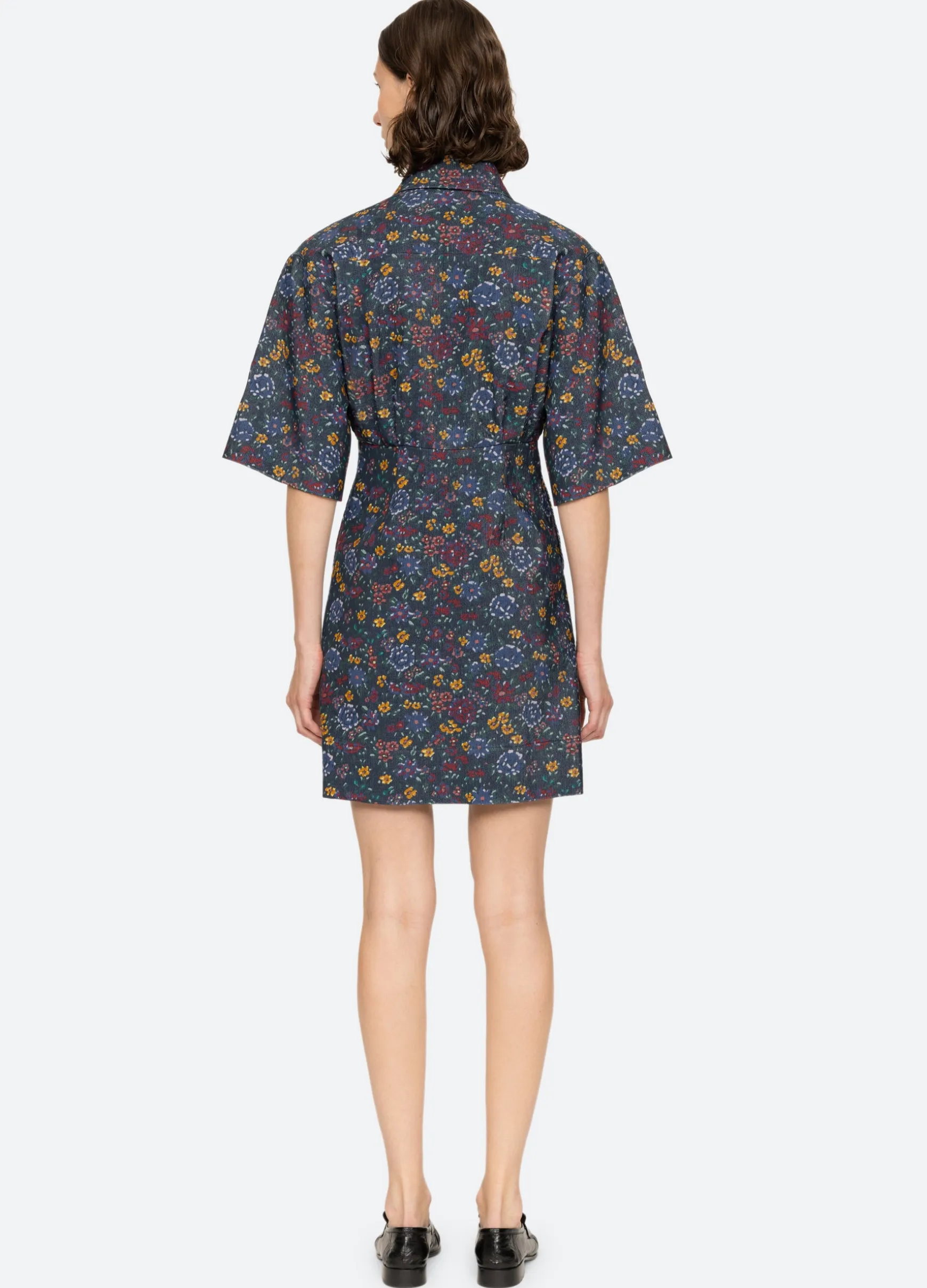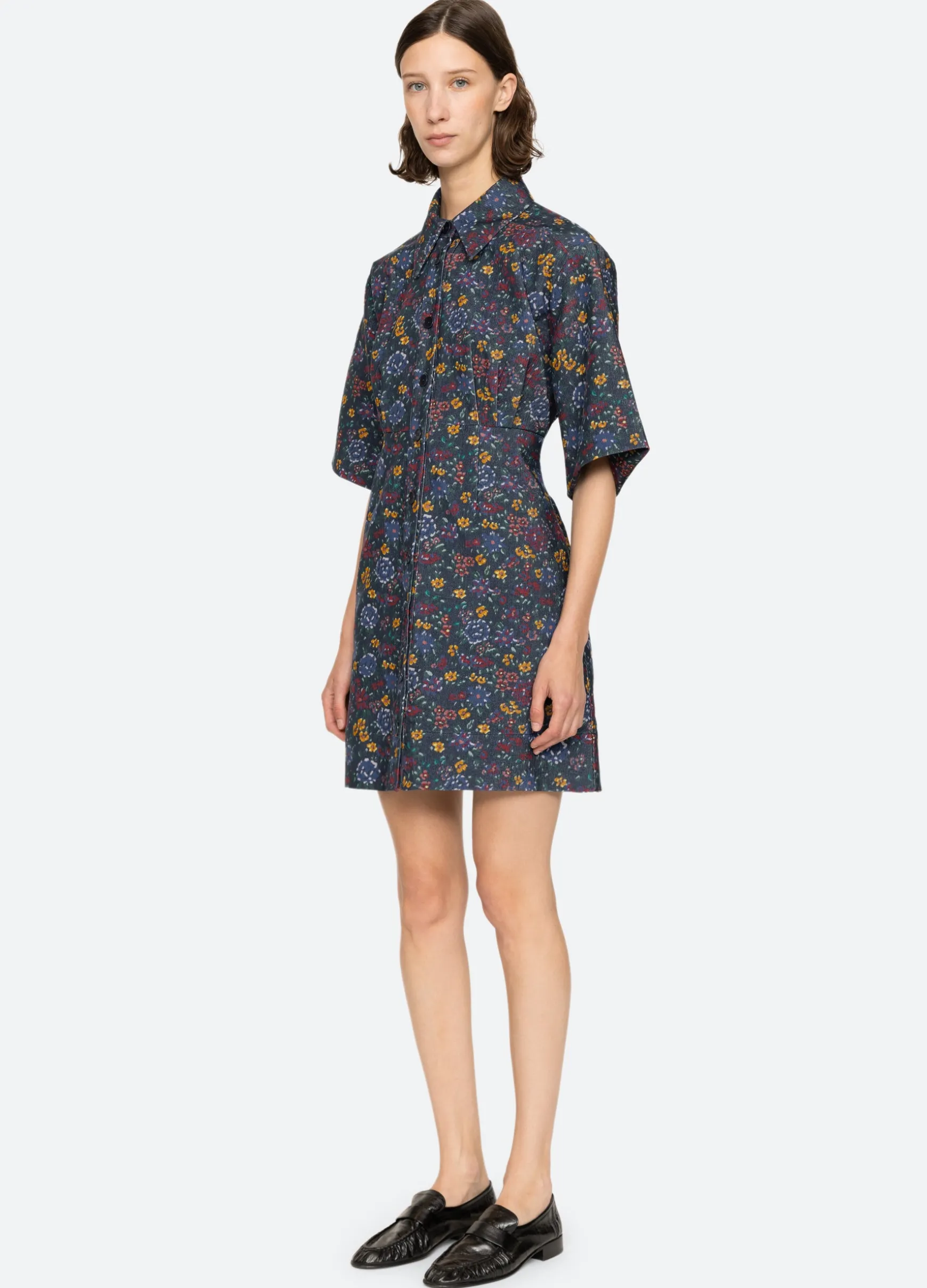 The Constance corduroy floral print dress features short sleeves, button front and mini silhouette.