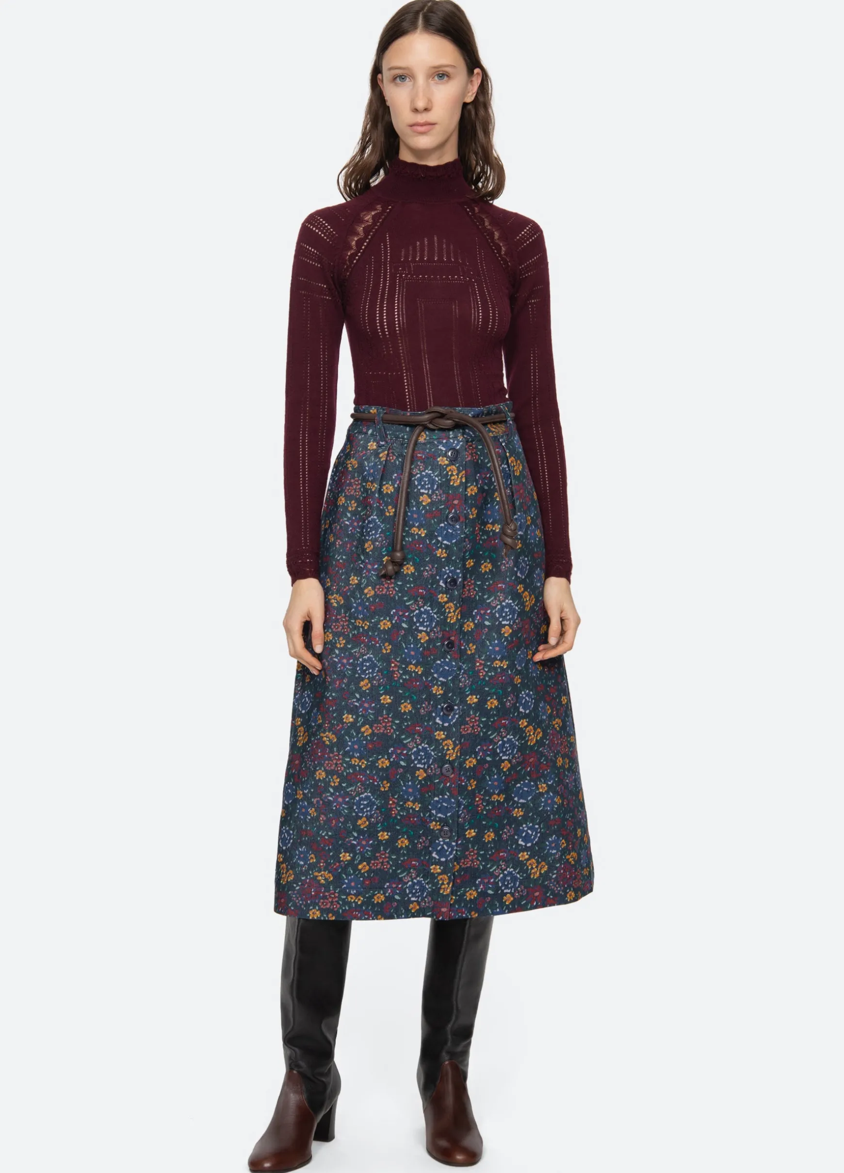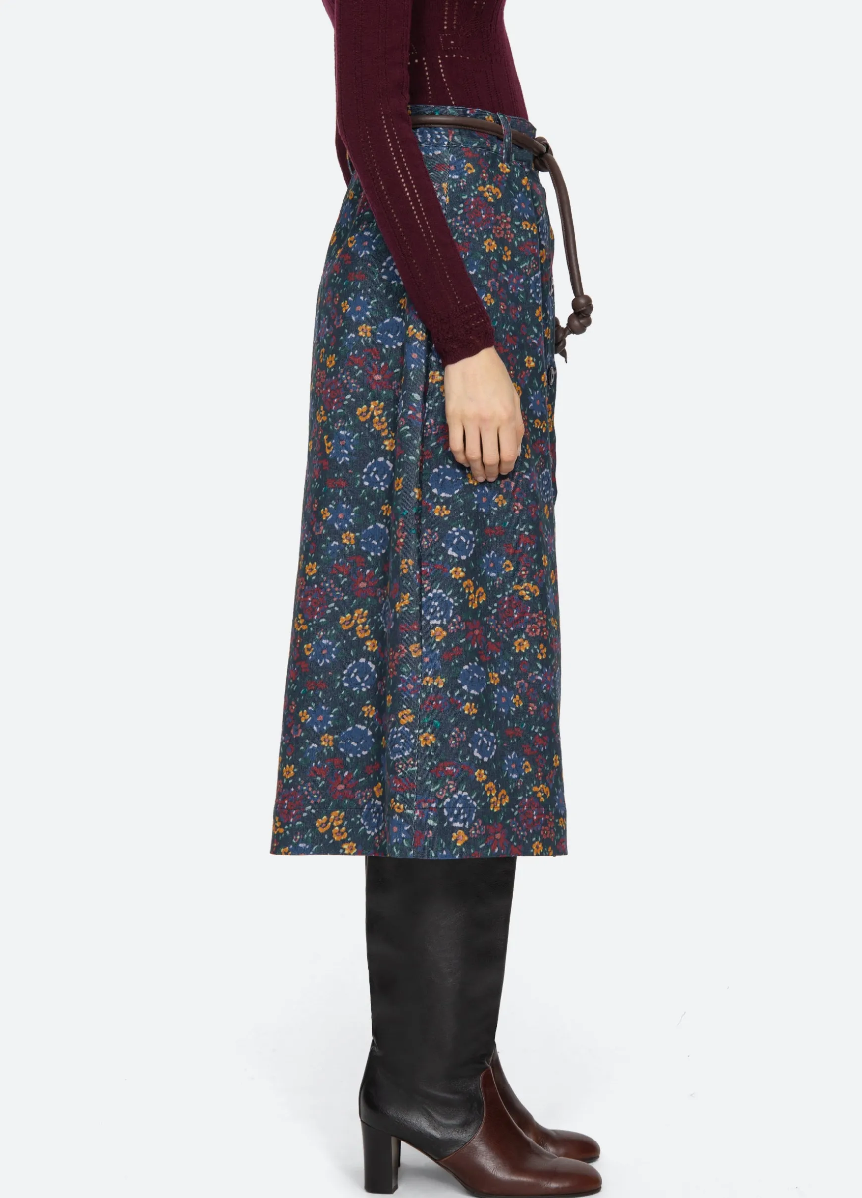 The Constance corduroy floral print skirt featuresan A-line silhouette, button front detailing and removable leather belt.
