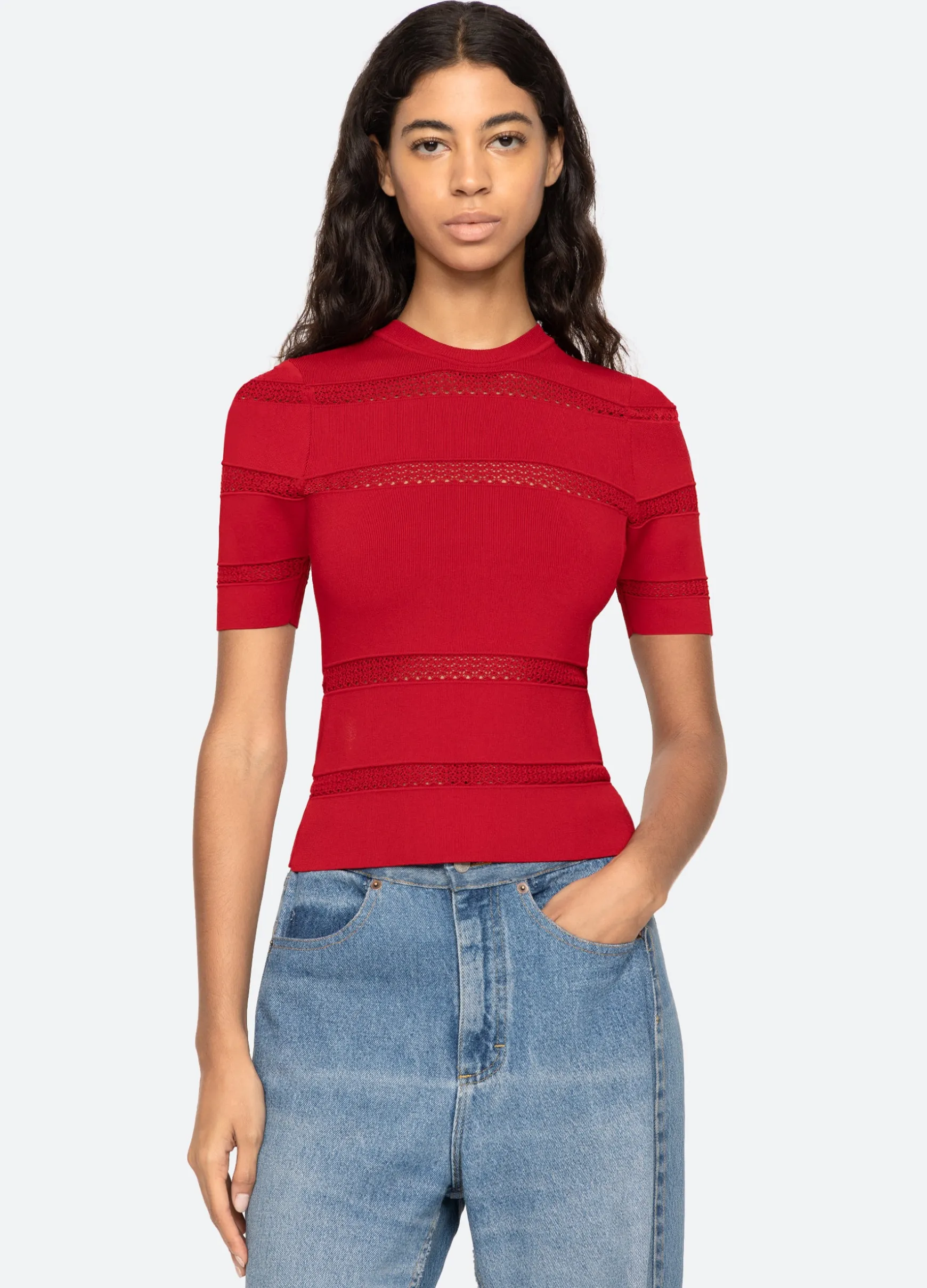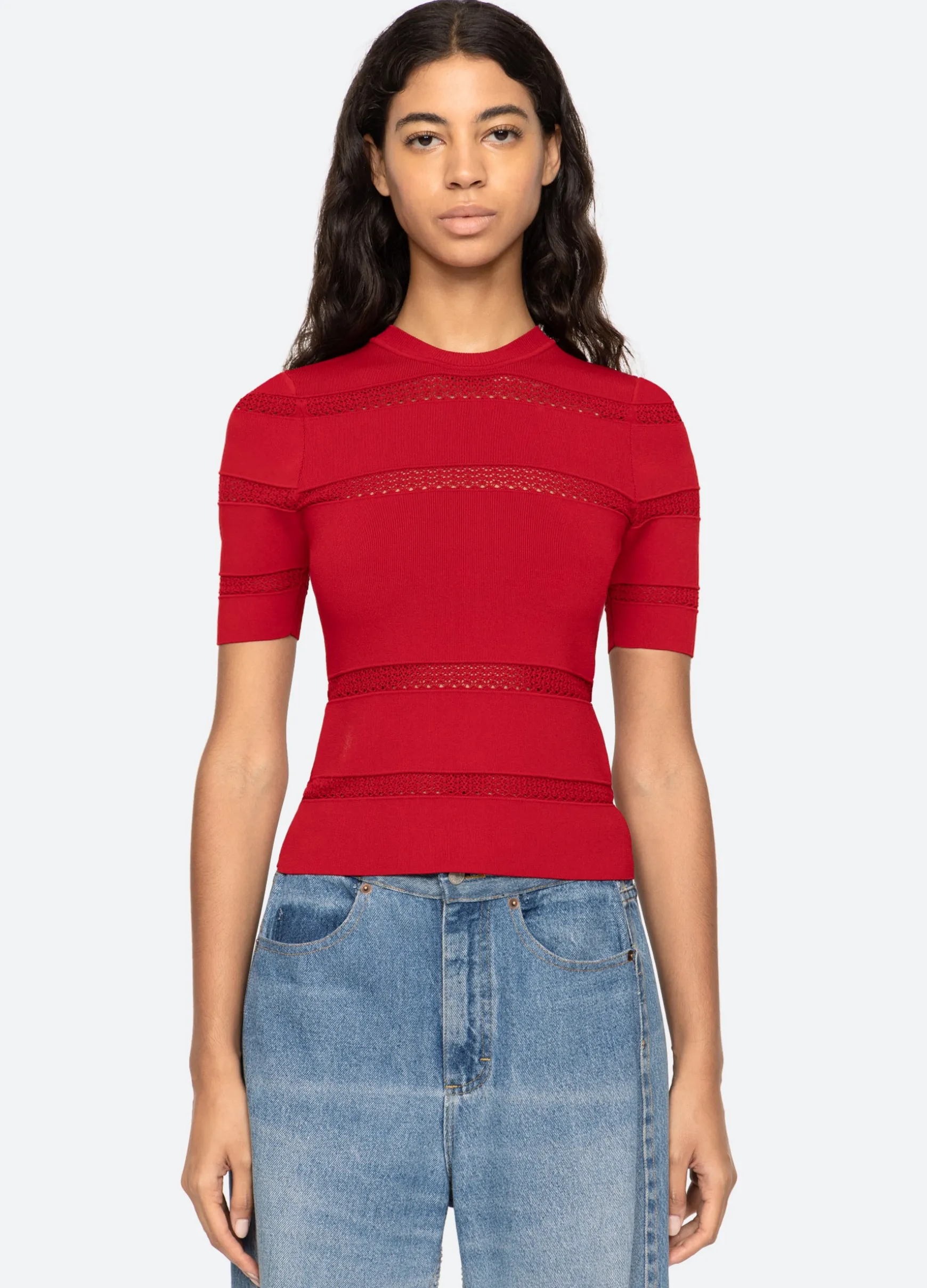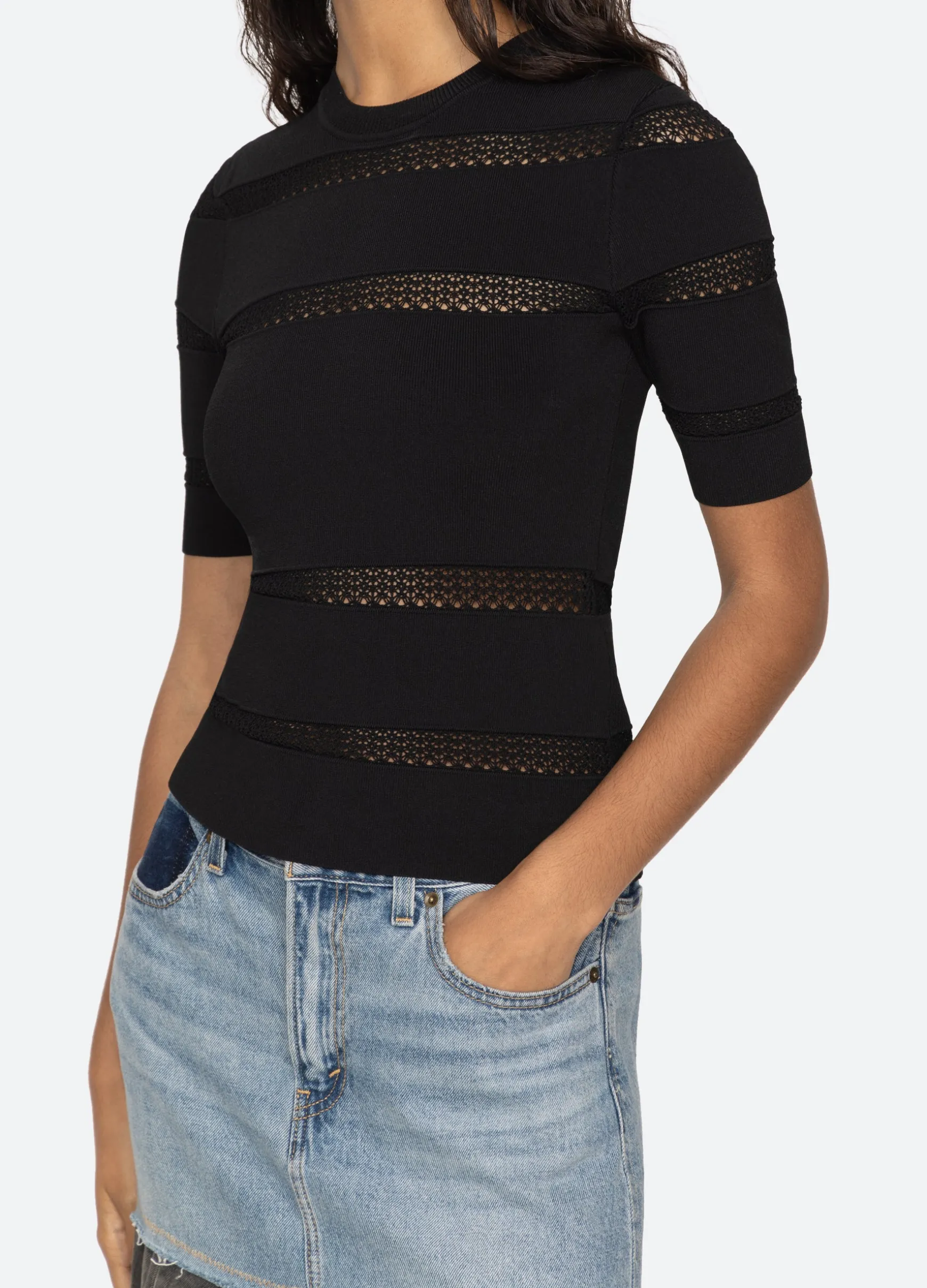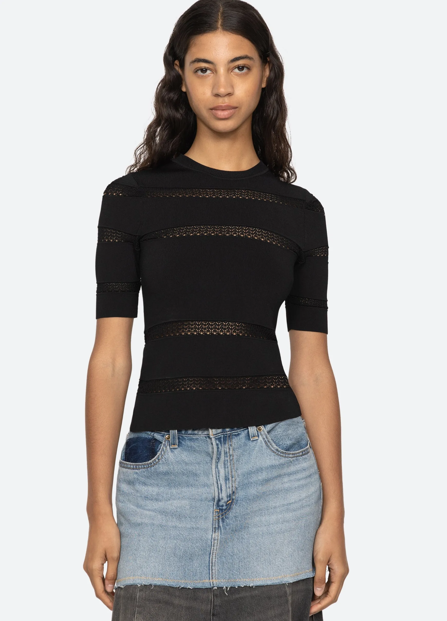 The Devon knit short sleeve top features sheer accents and is designed for a slim fit. The perfect layering piece.